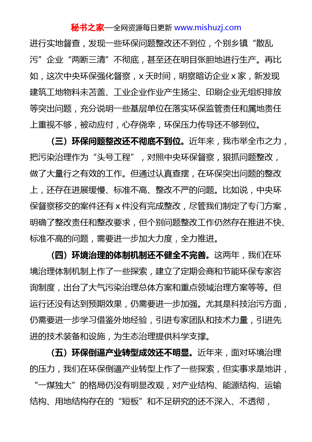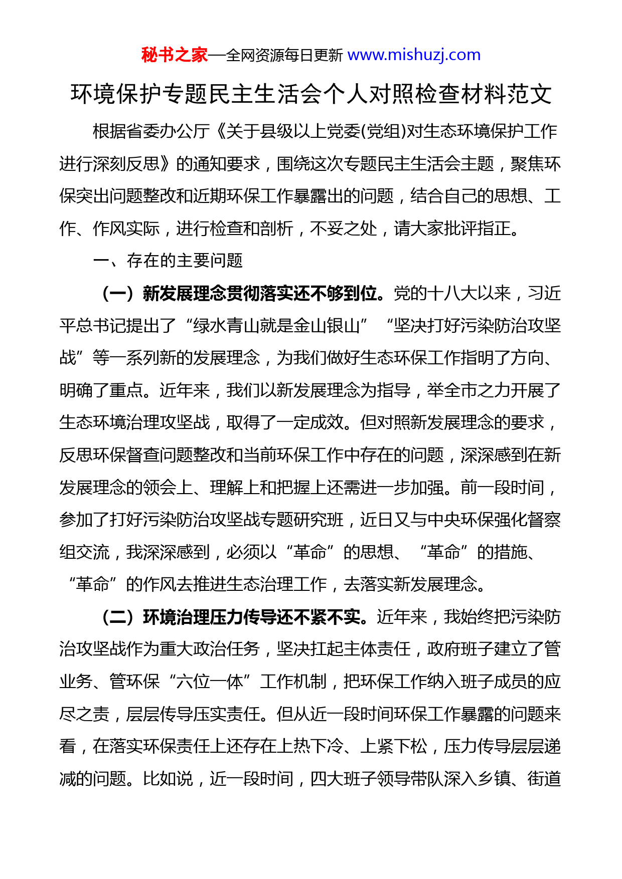秘书之家—全网资源每日更新www.mishuzj.com环境保护专题民主生活会个人对照检查材料范文根据省委办公厅《关于县级以上党委(党组)对生态环境保护工作进行深刻反思》的通知要求,围绕这次专题民主生活会主题,聚焦环保突出问题整改和近期环保工作暴露出的问题,结合自己的思想、工作、作风实际,进行检查和剖析,不妥之处,请大家批评指正。一、存在的主要问题(一)新发展理念贯彻落实还不够到位。党的十八大以来,习近平总书记提出了“绿水青山就是金山银山”“坚决打好污染防治攻坚战”等一系列新的发展理念,为我们做好生态环保工作指明了方向、明确了重点。近年来,我们以新发展理念为指导,举全市之力开展了生态环境治理攻坚战,取得了一定成效。但对照新发展理念的要求,反思环保督查问题整改和当前环保工作中存在的问题,深深感到在新发展理念的领会上、理解上和把握上还需进一步加强。前一段时间,参加了打好污染防治攻坚战专题研究班,近日又与中央环保强化督察组交流,我深深感到,必须以“革命”的思想、“革命”的措施、“革命”的作风去推进生态治理工作,去落实新发展理念。(二)环境治理压力传导还不紧不实。近年来,我始终把污染防治攻坚战作为重大政治任务,坚决扛起主体责任,政府班子建立了管业务、管环保“六位一体”工作机制,把环保工作纳入班子成员的应尽之责,层层传导压实责任。但从近一段时间环保工作暴露的问题来看,在落实环保责任上还存在上热下冷、上紧下松,压力传导层层递减的问题。比如说,近一段时间,四大班子领导带队深入乡镇、街道秘书之家—全网资源每日更新www.mishuzj.com进行实地督查,发现一些环保问题整改还不到位,个别乡镇“散乱污”企业“两断三清”不彻底,甚至还在明目张胆地进行生产。再比如,这次中央环保强化督察,x天时间,明察暗访企业x家,新发现建筑工地物料未苫盖、工业企业作业产生扬尘、印刷企业无组织排放等突出问题,充分说明一些基层单位在落实环保监管责任和属地责任上重视不够,被动应付,心存侥幸,环保压力传导还不够到位。(三)环保问题整改还不彻底不到位。近年来,我市举全市之力,把污染治理作为“头号工程”,对照中央环保督察,狠抓问题整改,做了大量行之有效的工作。但通过认真查摆,在环保突出问题的整改上,还存在进展缓慢、标准不高、整改不严的问题。比如说,中央环保督察移交的案件还有x件没有完成整改,尽管我们制定了专门方案,明确了整改责任和整改要求,但个别问题整改工作仍然存在推进不快、标准不高的问题,需要进一步加大力度,全力推进。(四)环境治理的体制机制还不健全不完善。这两年,我们在环境治理体制机制上作了一些探索,建立了定期会商和节能环保专家咨询制度,出台了大气污染治理总体方案和重点领域治理方案等等。但运行还没有达到预期效果,仍需要进一步加强。尤其是科技治污方面,仍需要进一步学习借鉴外地经验,引进专家团队和技术力量,引进先进的技术装备和设施,为生态治理提供科学支撑。(五)环保倒逼产业转型成效还不明显。近年来,面对环境治理的压力,我们在环保倒逼产业转型上作了一些探索,但实事求是地讲,“一煤独大”的格局仍没有明显改观,对产业结构、能源结构、运输结构、用地结构存在的“短板”和不足研究的还不深入、不透彻,秘书之家—全网资源每日更新www.mishuzj.com“转”的步子仍不够快,“治”的成效还不明显,与上级要求和群众期盼还有一定差距。(六)环保工作跟进督办力度不够大。面对环境治理的重大压力,自己把大部分时间和精力都投入到抓环保工作上,但面对环保工作的严峻形势和环保督察的沉重压力,在工作推进中仍然存在跟进不够、督促不够和创新不够等问题。比如,中央环保督察交办的x个重点案件,对其中x件没有整改完成的进行了现场督导,限期进行整改,但对其他已整改的x件还没有进行“回头看”,整改如何心里没底。二、问题产生的原因认真反思剖析问题产生的原因,主要有以下几个方面:一是学用结合不够紧。习近平总书记关于生态文明的论述展现出对生态环境保护的高度重视和深切关怀,是新时代推进生态文明建设的根本遵循,是新发展理念的核心要义。一直以来,我都把学习习近平生态文明思想和新发展理念放在重中之重的位置,加强理论武装,指导工作实践。分析环境治理工作中存在的这样那样的问题,通过认真查摆,特别是参加专题研究班后,我清醒地认识到,自己对新发展理念的认识还不够全面、不够系统,对习总书记生态文明建设思想、“两山”理论,理解的还不深不透,尤其是在学用转化上做得还不够,学用结合不够紧,学用转化不够快,谋划推动新发展理念的思路还不够新、办法还不够多、举措还不够实。二是工作要求不够严。这两年来,在环保治理攻坚中,自己多次与班子成员一起,对全市环保工作进行“四不两直”严格督查督导。但是,随着环保工作的持续高压态势,自己总认为基层一线的干部秘书之家—全网资源每日更新www.mishuzj.com“5+2”、“白加黑”,工作非常辛苦,所以下基层督促检查更多的是给基层的同志们“提个醒”,紧紧思想和工作的“发条”,催一催工作的进度,解决工作中存在的一些困难和问题,但对发现的问题大都以批评教育收场,没