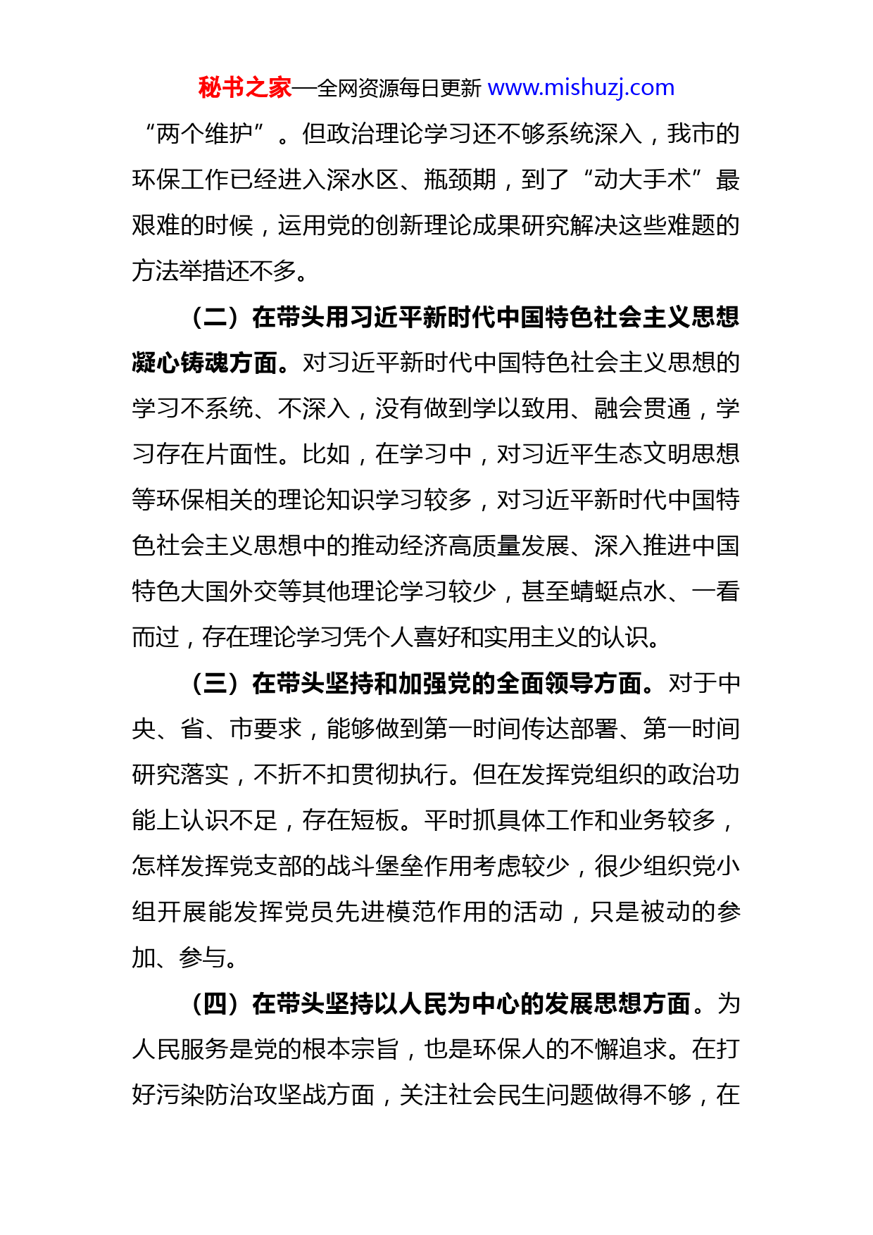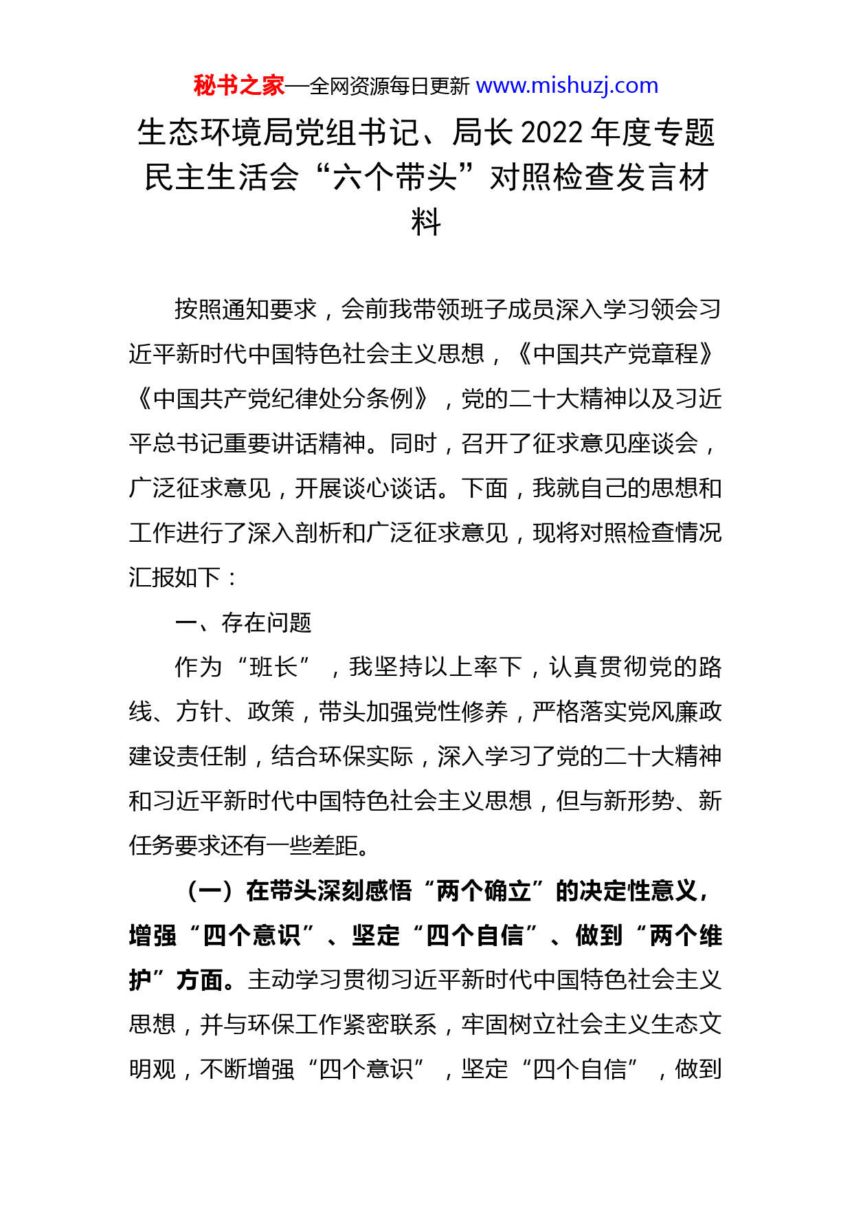 秘书之家—全网资源每日更新www.mishuzj.com生态环境局党组书记、局长2022年度专题民主生活会“六个带头”对照检查发言材料按照通知要求,会前我带领班子成员深入学习领会习近平新时代中国特色社会主义思想,《中国共产党章程》《中国共产党纪律处分条例》,党的二十大精神以及习近平总书记重要讲话精神。同时,召开了征求意见座谈会,广泛征求意见,开展谈心谈话。下面,我就自己的思想和工作进行了深入剖析和广泛征求意见,现将对照检查情况汇报如下:一、存在问题作为“班长”,我坚持以上率下,认真贯彻党的路线、方针、政策,带头加强党性修养,严格落实党风廉政建设责任制,结合环保实际,深入学习了党的二十大精神和习近平新时代中国特色社会主义思想,但与新形势、新任务要求还有一些差距。(一)在带头深刻感悟“两个确立”的决定性意义,增强“四个意识”、坚定“四个自信”、做到“两个维护”方面。主动学习贯彻习近平新时代中国特色社会主义思想,并与环保工作紧密联系,牢固树立社会主义生态文明观,不断增强“四个意识”,坚定“四个自信”,做到秘书之家—全网资源每日更新www.mishuzj.com“两个维护”。但政治理论学习还不够系统深入,我市的环保工作已经进入深水区、瓶颈期,到了“动大手术”最艰难的时候,运用党的创新理论成果研究解决这些难题的方法举措还不多。(二)在带头用习近平新时代中国特色社会主义思想凝心铸魂方面。对习近平新时代中国特色社会主义思想的学习不系统、不深入,没有做到学以致用、融会贯通,学习存在片面性。比如,在学习中,对习近平生态文明思想等环保相关的理论知识学习较多,对习近平新时代中国特色社会主义思想中的推动经济高质量发展、深入推进中国特色大国外交等其他理论学习较少,甚至蜻蜓点水、一看而过,存在理论学习凭个人喜好和实用主义的认识。(三)在带头坚持和加强党的全面领导方面。对于中央、省、市要求,能够做到第一时间传达部署、第一时间研究落实,不折不扣贯彻执行。但在发挥党组织的政治功能上认识不足,存在短板。平时抓具体工作和业务较多,怎样发挥党支部的战斗堡垒作用考虑较少,很少组织党小组开展能发挥党员先进模范作用的活动,只是被动的参加、参与。(四)在带头坚持以人民为中心的发展思想方面。为人民服务是党的根本宗旨,也是环保人的不懈追求。在打好污染防治攻坚战方面,关注社会民生问题做得不够,在秘书之家—全网资源每日更新www.mishuzj.com环保服务社会、服务人民群众层面上存在问题,虽然主观上把切实改善生态环境质量,不断满足人民群众对美好生活的向往作为第一要务,但面对工作事务和部门影响力,存在畏难思想和创新能力不足问题,而且联系服务群众的主动性和自觉性还不够强。(五)在带头发扬斗争精神方面。始终坚持以改善全市环境质量为己任,主动担当,积极作为,带领全市环保系统形成了“较真碰硬、敢于担当、争先创优”的环保精神,实施了一批重大环境治理工程。但我市环境质量基础差、污染重、治理难,面对工作中一些急难险重的任务时,在超前预判和强力攻坚方面还有待进一步加强。(六)在带头落实全面从严治党政治责任方面。始终把纪律规矩挺在前面,严格执行党风廉政建设各项规定,始终保持清正廉洁的政治本色。但在党风廉政建设和反腐败工作上,定制度多、接地气少,提要求多、抓督办少,抓机关多、抓基层少,抓群众反映问题多、主动摸排少。二、根源剖析出现以上问题,尽管有工作忙、任务重等客观因素,但从根源上讲还是自己的主观世界改造不够。主要有以下几方面:(一)理论学习还不够。自己平时很注重学习,但由于环保工作任务重、压力大,身体、头脑一直超负荷运秘书之家—全网资源每日更新www.mishuzj.com行,将全部精力倾注在抓环境质量改善上,对学习抓得不够紧,学习的广度和深度不够。通过深刻剖析,自己更加清醒地认识到,工作再忙也要强筋骨,必须把学习作为常态来抓,尤其是面对当前严峻的环境保护形势,不仅要多学、勤学,更要学深、学透。(二)党性修养还不够。作为党员干部,尤其是在领导岗位,我应始终带着崇高的责任感、使命感,自觉把加强党性修养作为终身的必修课,长期修、经常修,以坚强的党性作为克服“四风”的利剑。但在平时工作中,常把工作当成硬任务,把党性锻炼当成软任务,还没有真正从政治上看待问题,从思想上武装头脑,导致在一些工作面前畏难怕乱,自我要求标准低,工作激情、奋斗意识时常出现下降。(三)宗旨意识有待进一步加强。自己出身农民家庭,从基层成长起来,对人民群众、对农民兄弟、对基层工作,始终深怀特殊感情。虽然主观上有深入群众、亲近群众的强烈愿望,但真正做起来确实不那么容易。客观上是环境治理任务艰巨、形势严峻,没有时间和精力下基层调查、接触群众,根子上是没有把党的根本宗旨内化为意志上的坚守、行动上的坚持、责任上的担当。(四)对全面从严治党的理解还不够深。学习习近平总书记关于全面从严治党的重要论述还不够深刻,从严管秘书之家—全网资源每日更新www.mishuzj.com理干部落实还不到位。比如对严格落实中央八项规定精神重视不够,思想麻痹大意,没有形成良好的遵章守纪的良好氛围;对环保工作业务抓得多、