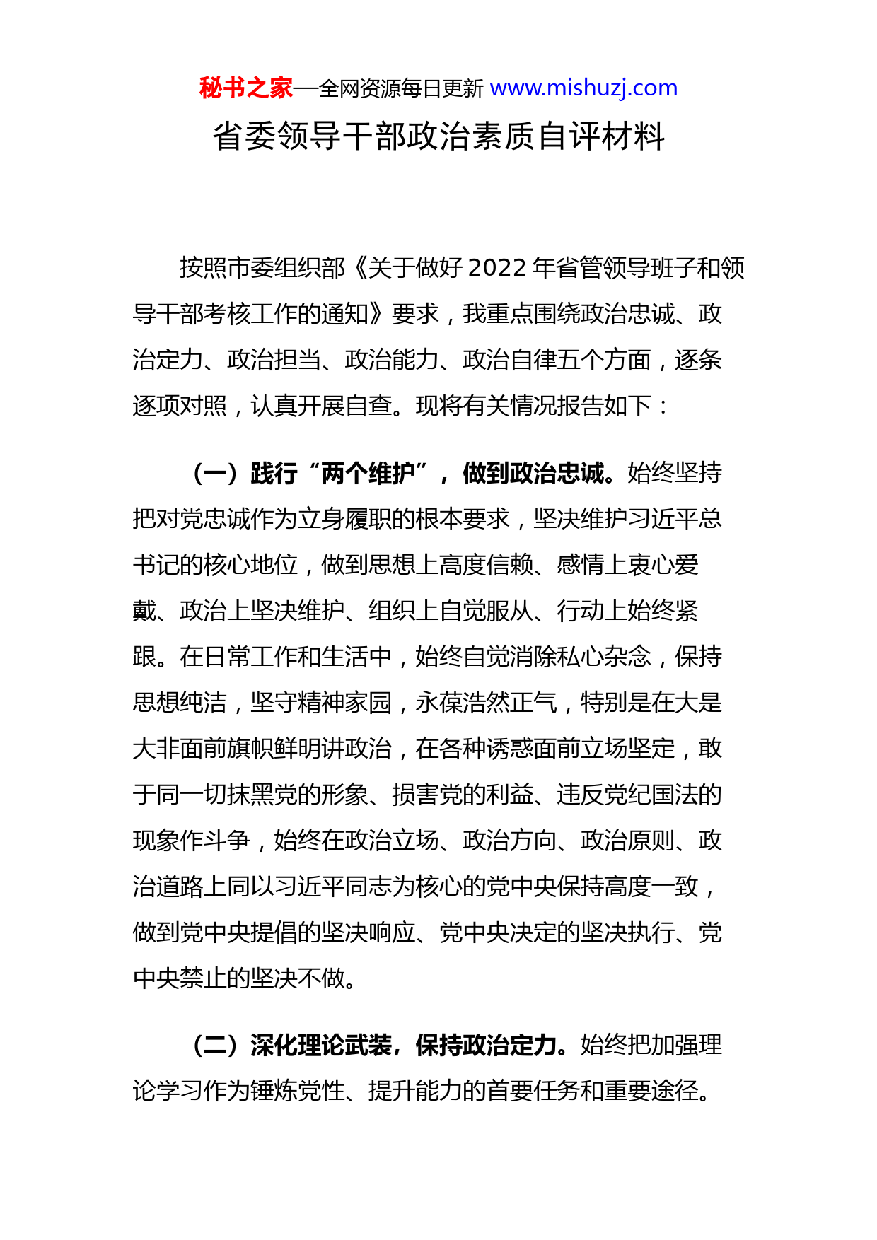 秘书之家—全网资源每日更新www.mishuzj.com省委领导干部政治素质自评材料按照市委组织部《关于做好2022年省管领导班子和领导干部考核工作的通知》要求,我重点围绕政治忠诚、政治定力、政治担当、政治能力、政治自律五个方面,逐条逐项对照,认真开展自查。现将有关情况报告如下:(一)践行“两个维护”,做到政治忠诚。始终坚持把对党忠诚作为立身履职的根本要求,坚决维护习近平总书记的核心地位,做到思想上高度信赖、感情上衷心爱戴、政治上坚决维护、组织上自觉服从、行动上始终紧跟。在日常工作和生活中,始终自觉消除私心杂念,保持思想纯洁,坚守精神家园,永葆浩然正气,特别是在大是大非面前旗帜鲜明讲政治,在各种诱惑面前立场坚定,敢于同一切抹黑党的形象、损害党的利益、违反党纪国法的现象作斗争,始终在政治立场、政治方向、政治原则、政治道路上同以习近平同志为核心的党中央保持高度一致,做到党中央提倡的坚决响应、党中央决定的坚决执行、党中央禁止的坚决不做。(二)深化理论武装,保持政治定力。始终把加强理论学习作为锤炼党性、提升能力的首要任务和重要途径。秘书之家—全网资源每日更新www.mishuzj.com坚持读原著学原文悟原理,深研细读《习近平谈治国理政》第四卷、党的二十大报告,以及习近平总书记关于加强和改进人民政协工作重要思想及《中国共产党政治协商工作条例》《统战工作条例》《政协章程》等,进一步加深了对党的大政方针的理解,增强了贯彻落实的自觉性和坚定性,把牢了理想信念这个“总开关”,保持了政治上的清醒和坚定,切实做到了政治信仰不变、政治立场不移、政治方向不偏、政治责任不松。积极参加市政协党组理论中心组和集体学习,并结合学习主题开展研讨交流。同时,坚持从铸就人格力量中涵养政治定力,自觉培养健康高雅的生活情趣,追求积极向上的生活方式,正确选择个人爱好,自觉脱离低级趣味,严家教、正家风,做到欲望上知足、奉献上不知足、境界上知不足,努力做到以德修身、以德立威、以德服人、以德化人。(三)认真履职尽责,坚守政治担当。始终以坚定的政治担当、责任担当,在其位、谋其政、干其事、求实效。牢固树立岗位就是使命、责任就是担当的意识,涵养担当作为的底气和勇气,坚决贯彻落实中央、省委、市委和市政协党组重大决策部署,严守政治规矩和政治纪律,确保各项工作有力有效落实到位。带头执行党组工作规则,坚决执行民主集中制原则,做到集思广益解决问题,秘书之家—全网资源每日更新www.mishuzj.com民主集中科学决策。自觉服从党组工作安排,切实履行全面从严管党治党政治责任和“一岗双责”,带头严肃党内政治生活,带头开展批评和自我批评,自觉接受党内监督,始终保持强烈的事业心和高度的责任感,较好地完成了各项本职工作和主席会议交办的各项任务。(四)强化大局意识,提升政治能力。坚持在履行工作职责中提升政治能力,自觉在服务工作大局下想问题、做工作,不断增强政治执行力。特别是带头贯彻执行民主集中制,重点工作、重大事项、重点信息及时请示汇报,与班子其他成员团结协作,密切配合,塑造了良好的形象。同时,注重调查研究,一切从实际出发,不断增强工作的前瞻性和预见性。今年参与民主监督、视察和提案督办活动3次,开展走访调研慰问3次,组织界别委员积极反映社情民意,主动建言,取得了丰富成效。(五)严守党纪法规,强化政治自律。严格遵守党的政治纪律和政治规矩,始终尊崇党章、贯彻党章、遵循党章。带头贯彻执行中央八项规定及其实施细则精神,认真践行“三严三实”要求,严守党的“六大纪律”,坚持各项工作按原则办、按程序办、按规矩办。坚决反对“四风”,时刻以《准则》《条例》从严要求自己,规范自身行为,守纪律、讲规矩,自觉做政治上的明白人、老实秘书之家—全网资源每日更新www.mishuzj.com人。公车使用、办公用房、公务接待严格按照标准和规定执行;外出学习考察主动请示报备;按要求如实填报领导干部个人有关事项报告;对家属子女和身边工作人员从严要求,严格执行廉洁纪律;没有利用职权谋取不正当利益和为家人谋利;没有出入私人会所行为;没有接受有价证券、礼金等问题;没有其他非法收入和不明经济来源;没有从事经商办企业和参与炒股等行为;未持有会员卡。一年来,本人虽然能够坚持党的领导,强化政治意识,严守政治纪律,但对照党规党纪,对照初心使命,仍存在一些问题。一是自学不够经常、不够全面,跟进学习党的最新理论成果,侧重于学原文、读原著,在悟原理上做得不够。二是党性锤炼不够经常,经常性对照党章、党规、党纪衡量检查言行,审视思想和改进工作做得不够,在党性修养和自我修养方面坚持的不够。三是思想还不够解放,贯彻新发展理念与指导实际工作结合得不够紧密,认识站位还不够高,缺少锐意进取、永不懈怠的精神状态。在今后工作中,我将重点从以下几方面努力加以整改提高。一是加强理论学习,提高政治站位。牢固树立终身学习的理念,采取多种方式,学深悟透习近平新时代中国特色社会主义思想和党的二十大精神,做到在理论上融会秘书之家—全网资源每日更新www.mishuzj.com贯通、思想上清楚明白、行动上落细落实,进一步提高运用党的创新理论指