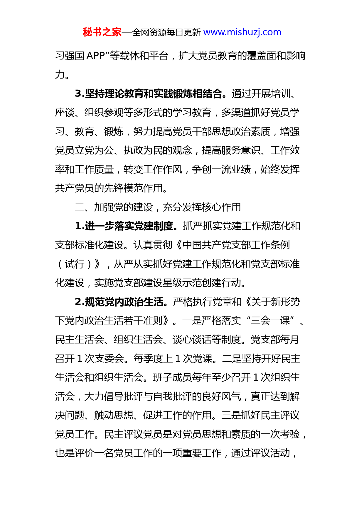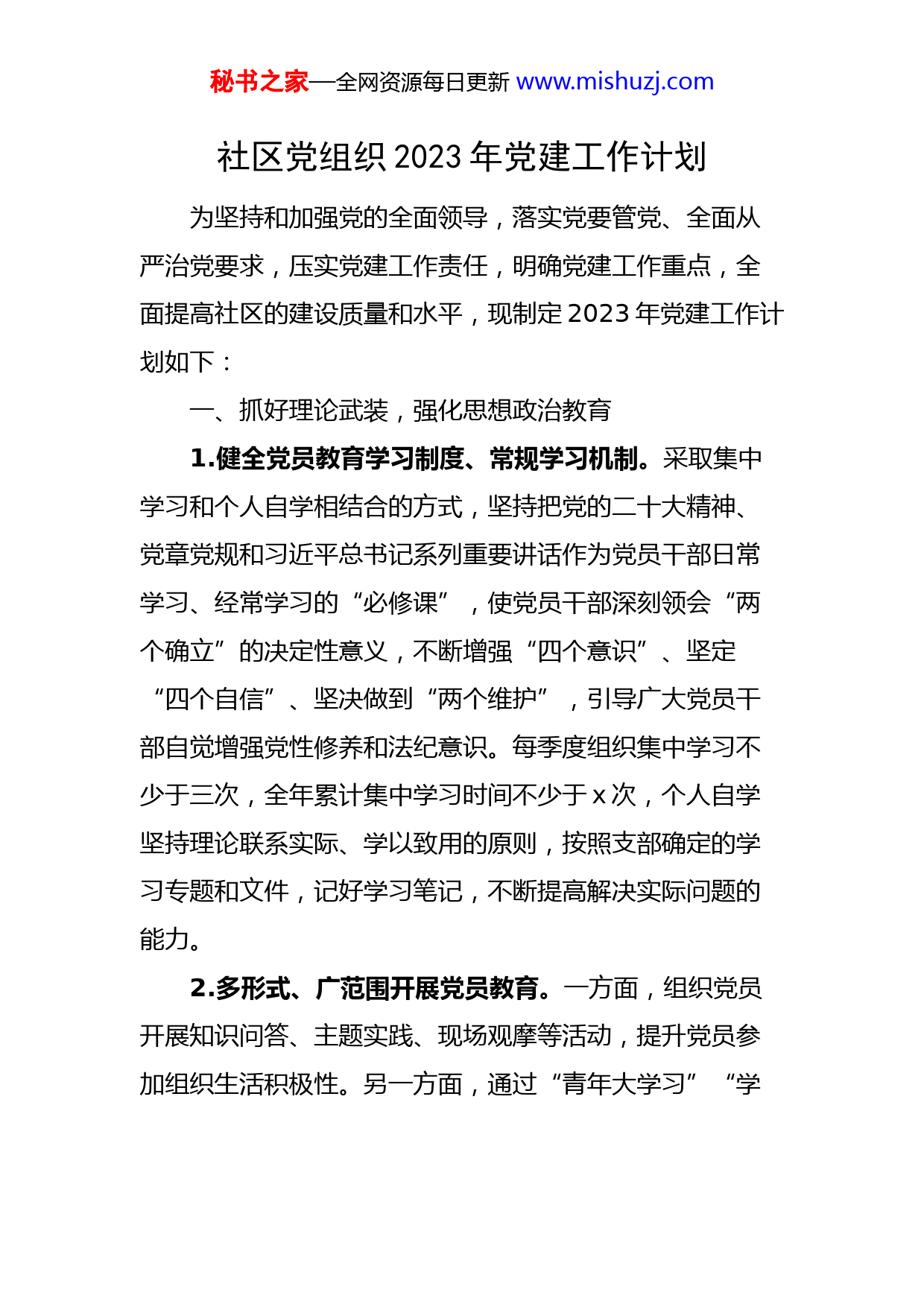 秘书之家—全网资源每日更新www.mishuzj.com社区党组织2023年党建工作计划为坚持和加强党的全面领导,落实党要管党、全面从严治党要求,压实党建工作责任,明确党建工作重点,全面提高社区的建设质量和水平,现制定2023年党建工作计划如下:一、抓好理论武装,强化思想政治教育1.健全党员教育学习制度、常规学习机制。采取集中学习和个人自学相结合的方式,坚持把党的二十大精神、党章党规和习近平总书记系列重要讲话作为党员干部日常学习、经常学习的“必修课”,使党员干部深刻领会“两个确立”的决定性意义,不断增强“四个意识”、坚定“四个自信”、坚决做到“两个维护”,引导广大党员干部自觉增强党性修养和法纪意识。每季度组织集中学习不少于三次,全年累计集中学习时间不少于x次,个人自学坚持理论联系实际、学以致用的原则,按照支部确定的学习专题和文件,记好学习笔记,不断提高解决实际问题的能力。2.多形式、广范围开展党员教育。一方面,组织党员开展知识问答、主题实践、现场观摩等活动,提升党员参加组织生活积极性。另一方面,通过“青年大学习”“学秘书之家—全网资源每日更新www.mishuzj.com习强国APP”等载体和平台,扩大党员教育的覆盖面和影响力。3.坚持理论教育和实践锻炼相结合。通过开展培训、座谈、组织参观等多形式的学习教育,多渠道抓好党员学习、教育、锻炼,努力提高党员干部思想政治素质,增强党员立党为公、执政为民的观念,提高服务意识、工作效率和工作质量,转变工作作风,争创一流业绩,始终发挥共产党员的先锋模范作用。二、加强党的建设,充分发挥核心作用1.进一步落实党建制度。抓严抓实党建工作规范化和支部标准化建设。认真贯彻《中国共产党支部工作条例(试行)》,从严从实抓好党建工作规范化和党支部标准化建设,实施党支部建设星级示范创建行动。2.规范党内政治生活。严格执行党章和《关于新形势下党内政治生活若干准则》。一是严格落实“三会一课”、民主生活会、组织生活会、谈心谈话等制度。党支部每月召开1次支委会。每季度上1次党课。二是坚持开好民主生活会和组织生活会。班子成员每年至少召开1次组织生活会,大力倡导批评与自我批评的良好风气,真正达到解决问题、触动思想、促进工作的作用。三是抓好民主评议党员工作。民主评议党员是对党员思想和素质的一次考验,也是评价一名党员工作的一项重要工作,通过评议活动,秘书之家—全网资源每日更新www.mishuzj.com明确自身优缺点,对照自己,制定整改措施,为党务工作又好又快发展打下基础。3.强化理论学习中心组的表率示范作用。落实中心组学习制度,压实党组织书记抓理论中心组学习责任,健全落实学习制度,注重改进学习方式方法,进一步明确学习内容,丰富学习形式,增强理论学习的针对性和实效性,及时解决学习中存在的问题。4.加强党员队伍管理,提升凝聚力和战斗力。一是严格按照组织程序、规范管理党员。严肃党员组织关系接转,加强流动党员教育管理,确保每名党员能够及时参加党内组织生活和各项活动,进一步增强党组织的凝聚力。二是实施党员思想汇报及分析制度。各党员全年向支部汇报思想一次,详细汇报个人的学习、工作、生活、廉政等各方面情况。支部每半年进行一次党员干部思想研判报告,了解党员的真实想法,把握党员的思想动态,增强思想道德教育的针对性和实效性。5.做好发展党员工作。认真贯彻“坚持标准,保证质量,改善结构,慎重发展”的方针,重点突出,措施到位。党支部每年至少研究1次党员发展工作,分析入党积极分子队伍的状况,有针对性地做好培养工作。发展新党员做到材料手续齐全,符合发展程序,并实行票决制、公示制,2023年计划争取发展1名入党积极分子。秘书之家—全网资源每日更新www.mishuzj.com6.严格党费收缴管理。明确专人负责党费收缴工作,严格执行党费收缴管理规定,实行月缴纳党费制度,开具党费收据。7.加强党务政务公开工作。建立并落实党务公开、政务公开制度,积极推进党务公开,拓宽党员意见表达渠道,切实保障和落实党员的知情权、参与权、选举权、表达权和监督权。及时公示广大党员和职工关心的事项,经常性地征求和听取党内外人士的意见,为党内监督和民主管理创造良好的机制和氛围。三、强化工作作风和党风廉政建设1.全面落实党风廉政建设责任制。坚持加强作风建设。认真落实党风廉政建设和反腐败工作责任制,建立完善党风廉政建设责任体系。制定党风廉政建设年度计划、工作目标和具体措施。2.强化监督执纪问责。进一步落实廉政教育制度、党内决策监督机制和领导干部个人事项报告制度,实行廉政风险分析报告制度,构建积极防范、有效监督、严格管理相结合的廉政风险防控体系;重视社会监督,畅通信访和举报渠道,发挥政风行风监督、新闻媒体和社会群众的监督作用。3.深入开展反腐倡廉和党风党纪教育。组织全体党员干部进一步学习《中国共产党章程》《中国共产党廉洁自秘书之家—全网资源每日更新www.mishuzj.com律准则》《中国共产党纪律处分条例》《习近平关于党风廉政建设和反腐败斗争论述摘编》等章程、条例、论述。全年组织一次党员干部职工到廉政教育基地开展现场警示教育,进一步筑牢党员领