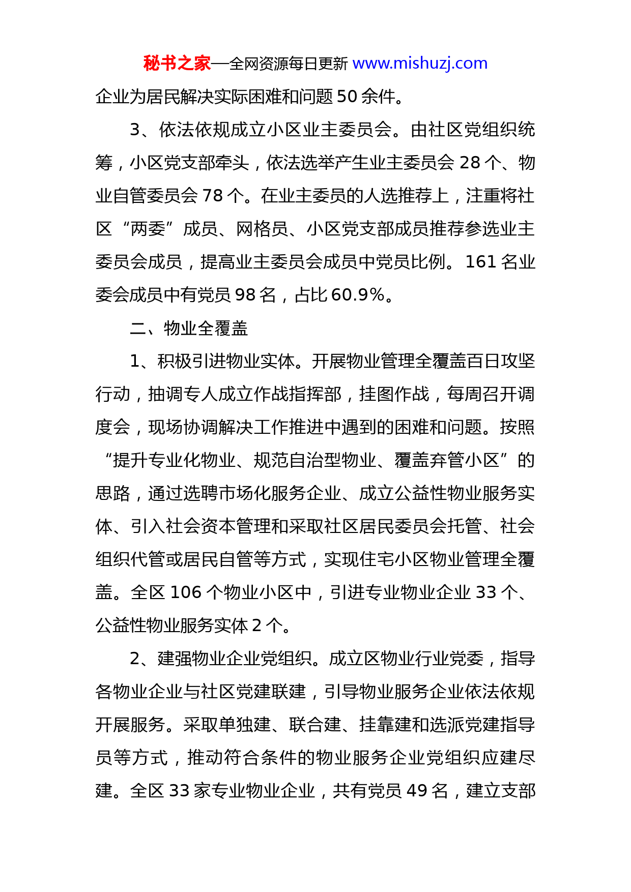 秘书之家—全网资源每日更新www.mishuzj.com社区物业党建联建材料去年以来,xx市xx区将社区物业党建联建作为答好基层治理“必答题”的重要内容,注重将社会治理工作与疫情防控、文明创建、信访维稳等工作相结合,为居民创造一个温馨、和谐的家园,用服务群众成效检验党建工作质效。一、组织全覆盖1、健全社区党组织体系。构建“社区‘大党委’、物业小区(网格)党支部、楼栋党小组、党员中心户”四级组织架构,将党的组织延伸到社区的角角落落。成立7个社区“大党委”,结合村(社区)“两委”换届,选优配强党组织书记。按照全覆盖、边界清、无死角、易管理的原则,根据有利于加强管理、有利于服务居民群众、规模适度,合并零星、脱管、遗漏区域,优化设置物业小区(小网格)106个,成立106个物业小区(网格)党支部、765个楼栋党小组,推选634名党员中心户。2、全覆盖成立社区环境和物业管理委员会。由民政部门牵头,指导各社区成立环境和物业管理委员会,明确工作职责,建立工作运行制度,以提升物业的服务水平为重点,以“问题、需求、项目”为导向,开展物业管理服务专题培训20余场次,培训600余人次,协调、督促物业秘书之家—全网资源每日更新www.mishuzj.com企业为居民解决实际困难和问题50余件。3、依法依规成立小区业主委员会。由社区党组织统筹,小区党支部牵头,依法选举产生业主委员会28个、物业自管委员会78个。在业主委员的人选推荐上,注重将社区“两委”成员、网格员、小区党支部成员推荐参选业主委员会成员,提高业主委员会成员中党员比例。161名业委会成员中有党员98名,占比60.9%。二、物业全覆盖1、积极引进物业实体。开展物业管理全覆盖百日攻坚行动,抽调专人成立作战指挥部,挂图作战,每周召开调度会,现场协调解决工作推进中遇到的困难和问题。按照“提升专业化物业、规范自治型物业、覆盖弃管小区”的思路,通过选聘市场化服务企业、成立公益性物业服务实体、引入社会资本管理和采取社区居民委员会托管、社会组织代管或居民自管等方式,实现住宅小区物业管理全覆盖。全区106个物业小区中,引进专业物业企业33个、公益性物业服务实体2个。2、建强物业企业党组织。成立区物业行业党委,指导各物业企业与社区党建联建,引导物业服务企业依法依规开展服务。采取单独建、联合建、挂靠建和选派党建指导员等方式,推动符合条件的物业服务企业党组织应建尽建。全区33家专业物业企业,共有党员49名,建立支部秘书之家—全网资源每日更新www.mishuzj.com16个,选派党建指导员7名。3、强化物业企业管理。将党建工作纳入物业企业考评体系,将物业企业建立党组织、发挥党组织作用、居民满意度等作为物业企业信用评级、物业项目招投标的重要依据。建立物业企业“红黑榜”制度,定期考评,长期公示,通过开展“流动红旗”“十佳红色物业企业”评比等活动,营造物业企业比学赶超的良好氛围。三、服务全覆盖1、夯实社区治理工作力量。结合疫情防控、文明创建,为每个楼栋配强1名党员楼栋长、1名志愿者、1名物业服务人员,形成以“社区党员(支部书记)、警员(辅警、治调主任)、网格员+联防队长、楼栋长、中心户长”为主要力量的“三员三长”社区治理队伍体系。2、健全为民服务工作机制。将党员干部常态化下沉工作与“我为群众办实事”实践活动有机结合起来,推动包联单位党组织为社区办实事、解难事,帮助解决群众急难愁盼问题。健全完善党员承诺、志愿服务、平战结合、考核激励等制度,4403名机关在职党员干部职工到居住地报到,组建71支联系社区工作队、24支党员应急突击队,参与常态化疫情防控、文明创建、安全隐患排查、信访维稳、物业管理全覆盖、抢险救灾等工作,为群众办理民生实事120余件,解决实际困难和问题1600余项。秘书之家—全网资源每日更新www.mishuzj.com3、营造物业党建联建良好氛围。发挥社区党组织、小区党组织、物业服务企业党组织等“前沿阵地”作用,开展物业管理政策宣讲进小区、进家庭,激发居民群众主人翁意识,主动挖掘和培育先进典型,强化宣传推介,营造了人人参与、人人支持物业管理的良好氛围。四、保障全覆盖1、阵地保障。各社区党建专员挂帅,组成由城管执法、公安、自规、环保、住建、市场监管等部门参加的联合工作专班,对小区物业服务用房、社区用房、居民活动用房及公共服务设施、公共配套设施进行清理移交,实现小区党支部、业委会全部有办公场所。坚持“一盘棋”统筹,按照“一个阵地、部门联合、资源共享、集约服务”要求,建设60个“党建+邻里中心”,切实把“党建+邻里中心”建成党建引领基层治理的“桥头堡”、近距离联系服务凝聚党员群众的主载体,打造成党员群众“愿意来、喜欢来、还想来”的温馨家园。2、资金保障。有效整合各类资源力量,采取上级补一点、物业出一点、业主筹一点等方式,保障“党建+邻里中心”建设。按照“党建+邻里中心”建设计划,对每个拟建邻里中心的小区补助5000元,建成验收合格后,再给予5000元奖励。目前,全区已投入资金130余万元,建成“党建+邻里中心”24个。秘书之家—全网资源每日更新www.mishuzj.com3、机制保障。做实社区党组织领导下的居委会、业主委员会、物业服务企业“三方联动”机