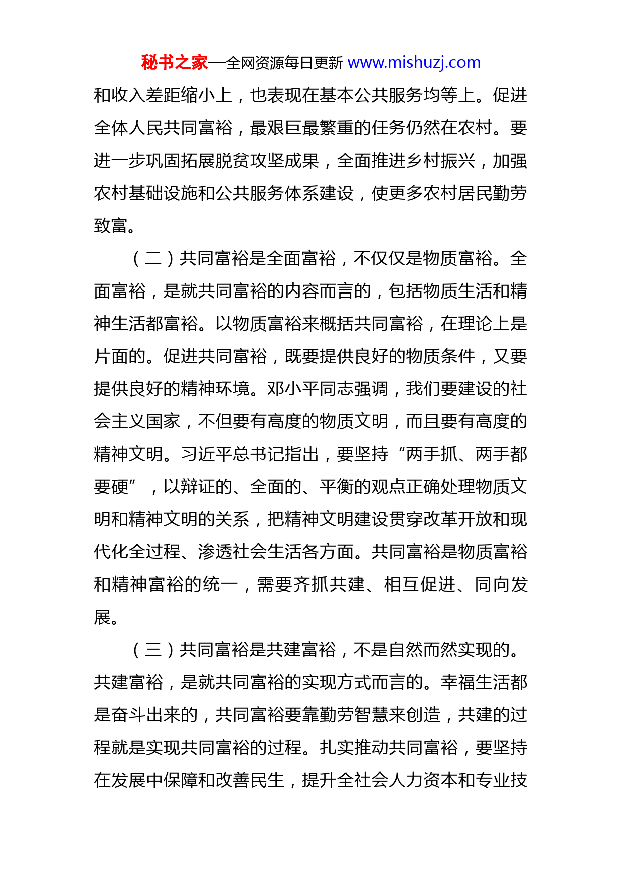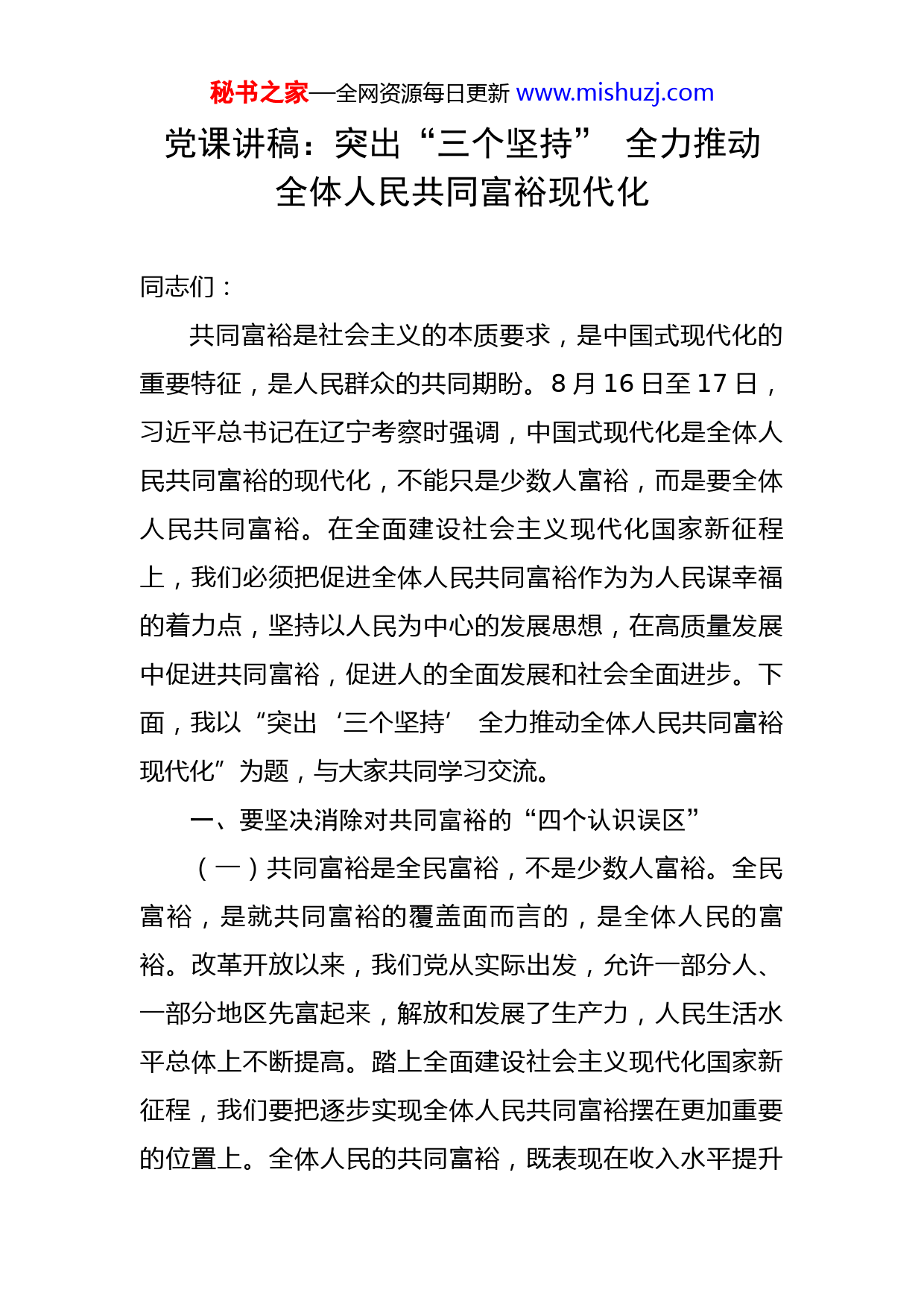 秘书之家—全网资源每日更新www.mishuzj.com党课讲稿:突出“三个坚持”全力推动全体人民共同富裕现代化同志们:共同富裕是社会主义的本质要求,是中国式现代化的重要特征,是人民群众的共同期盼。8月16日至17日,习近平总书记在辽宁考察时强调,中国式现代化是全体人民共同富裕的现代化,不能只是少数人富裕,而是要全体人民共同富裕。在全面建设社会主义现代化国家新征程上,我们必须把促进全体人民共同富裕作为为人民谋幸福的着力点,坚持以人民为中心的发展思想,在高质量发展中促进共同富裕,促进人的全面发展和社会全面进步。下面,我以“突出‘三个坚持’全力推动全体人民共同富裕现代化”为题,与大家共同学习交流。一、要坚决消除对共同富裕的“四个认识误区”(一)共同富裕是全民富裕,不是少数人富裕。全民富裕,是就共同富裕的覆盖面而言的,是全体人民的富裕。改革开放以来,我们党从实际出发,允许一部分人、一部分地区先富起来,解放和发展了生产力,人民生活水平总体上不断提高。踏上全面建设社会主义现代化国家新征程,我们要把逐步实现全体人民共同富裕摆在更加重要的位置上。全体人民的共同富裕,既表现在收入水平提升秘书之家—全网资源每日更新www.mishuzj.com和收入差距缩小上,也表现在基本公共服务均等上。促进全体人民共同富裕,最艰巨最繁重的任务仍然在农村。要进一步巩固拓展脱贫攻坚成果,全面推进乡村振兴,加强农村基础设施和公共服务体系建设,使更多农村居民勤劳致富。(二)共同富裕是全面富裕,不仅仅是物质富裕。全面富裕,是就共同富裕的内容而言的,包括物质生活和精神生活都富裕。以物质富裕来概括共同富裕,在理论上是片面的。促进共同富裕,既要提供良好的物质条件,又要提供良好的精神环境。邓小平同志强调,我们要建设的社会主义国家,不但要有高度的物质文明,而且要有高度的精神文明。习近平总书记指出,要坚持“两手抓、两手都要硬”,以辩证的、全面的、平衡的观点正确处理物质文明和精神文明的关系,把精神文明建设贯穿改革开放和现代化全过程、渗透社会生活各方面。共同富裕是物质富裕和精神富裕的统一,需要齐抓共建、相互促进、同向发展。(三)共同富裕是共建富裕,不是自然而然实现的。共建富裕,是就共同富裕的实现方式而言的。幸福生活都是奋斗出来的,共同富裕要靠勤劳智慧来创造,共建的过程就是实现共同富裕的过程。扎实推动共同富裕,要坚持在发展中保障和改善民生,提升全社会人力资本和专业技秘书之家—全网资源每日更新www.mishuzj.com能,提高就业创业能力,增强致富本领,形成人人参与、人人尽力、人人都有成就感的生动局面。共同富裕不是“养懒人”,不能“等靠要”,“躺平”只会离共同富裕越来越远。惟有奋斗和辛勤劳动,不断积累社会财富并创造有利条件,才能实现共同富裕。(四)共同富裕是渐进富裕,不是同步同等富裕。渐进富裕,是就共同富裕的推进进程而言的。要看到,各地在推进共同富裕的进程上会有差异,不可能完全同步;不同人群实现富裕的程度有高有低,时间上也会有先有后,不可能齐头并进。这就需要立足国情、立足经济社会发展水平推动共同富裕,既不要裹足不前、该做的工作也不尽力,也不要吊高胃口、好高骛远,要坚持循序渐进,对其长期性、艰巨性、复杂性有充分估计,鼓励各地因地制宜探索有效路径,实打实地一件事一件事办好,提高实效性。二、要充分认识扎实推进共同富裕的“四个有利于”(一)扎实推进共同富裕,有利于彰显公平正义的政治价值。实现社会公平正义是由多种因素决定的,其中最主要的条件是提高经济社会发展水平,最关键的选择是推进共同富裕。新时代推进共同富裕与追求公平正义的政治价值两者间具有恰当的结合点。既突出整体富裕,又兼顾个体富裕,彰显了公平正义在对象上的普惠性;既注重物秘书之家—全网资源每日更新www.mishuzj.com质富裕,又强调精神富裕,展示了公平正义在内容上的全面性;既坚持共同奋斗,又践行共享理念,体现了公平正义在权责上的对等性;既着力做大蛋糕,又坚持在完善初次分配再分配和三次分配有机衔接的制度安排中分好蛋糕,凸显了公平正义在过程上的合理性。如果说推进共同富裕是实现公平正义政治价值的可靠途径,那么对公平正义政治价值的追求则是共同富裕顺利实现的价值引领。推动共同富裕助力公平正义的实现,不仅使中国特色社会主义事业持续焕发出强大生机与无限活力,而且为人类建设更加美好的世界提供了全新选项与成功经验。(二)扎实推进共同富裕,有利于凝聚广泛深厚的政治共识。在全面建设社会主义现代化国家新征程上,只有扎实推进共同富裕,使区域、城乡、阶层之间的收入分配差距控制在一个合理的限度和范围之内,使广大人民群众过上幸福美好的生活,才能不断增强全社会的紧密团结,凝聚起更加广泛的政治共识。习近平总书记指出:“我们决不能允许贫富差距越来越大、穷者愈穷富者愈富,决不能在富的人和穷的人之间出现一道不可逾越的鸿沟。”从本质上说,社会主义社会各阶层与群体之间在根本利益上是一致的,这是社会主义社会能够形成政治共识的根本所在。但要在各阶层与群体之间最大限度消除思想分歧,真正实现并保持政治共识,还是