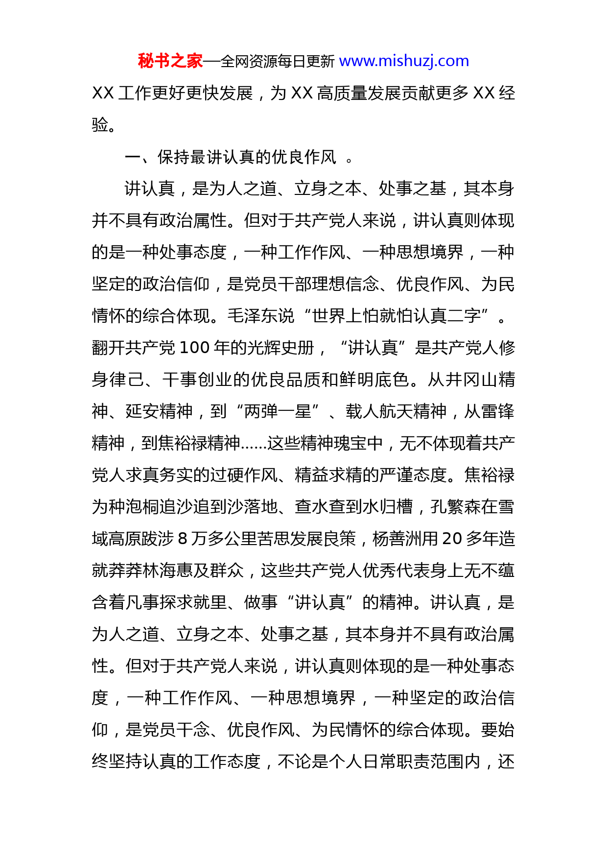 秘书之家—全网资源每日更新www.mishuzj.com党课:立足新起点展现新作为以实际行动迎接党的二十大胜利召开同志们:在二十大即将召开之时,今天按照市直机关工委要求,由我来为大家上一堂专题党课,党课的主题是:立足新起点展现新作为以实际行动迎接党的二十大胜利召开。“一心中国梦,万古下泉诗。”实现中华民族伟大复兴,是近代以来中华民族最伟大的梦想。中国共产党植根于中国的大地与人民,为中国人民谋幸福、为中华民族谋复兴,是中国共产党人矢志为之奋斗的初心和使命,这个初心和使命是深刻理解习近平新时代中国特色社会主义思想的一把金钥匙,是深刻理解中国共产党百年奋斗历史的一把敲门砖,是激励中国共产党人不断前进的动力源泉。我们常说,作风就是力量,作风决定成败,只有驰而不息抓好作风建设,才能推动各项工作开好局起好步、实现高质量发展,才能全面担当起新时代赋予我们的伟大使命。党的十八大以来,习近平总书记围绕加强作风能力建设发表了一系列重要讲话、作出了一系列重要指示,是我们抓好作风能力建设的根本遵循。今年将召开党的二十大,是政治大年,也是局党组确定的“作风效能提升年”。我们要进一步提振精气神、汇聚执行力,推动全市秘书之家—全网资源每日更新www.mishuzj.comXX工作更好更快发展,为XX高质量发展贡献更多XX经验。一、保持最讲认真的优良作风。讲认真,是为人之道、立身之本、处事之基,其本身并不具有政治属性。但对于共产党人来说,讲认真则体现的是一种处事态度,一种工作作风、一种思想境界,一种坚定的政治信仰,是党员干部理想信念、优良作风、为民情怀的综合体现。毛泽东说“世界上怕就怕认真二字”。翻开共产党100年的光辉史册,“讲认真”是共产党人修身律己、干事创业的优良品质和鲜明底色。从井冈山精神、延安精神,到“两弹一星”、载人航天精神,从雷锋精神,到焦裕禄精神……这些精神瑰宝中,无不体现着共产党人求真务实的过硬作风、精益求精的严谨态度。焦裕禄为种泡桐追沙追到沙落地、查水查到水归槽,孔繁森在雪域高原跋涉8万多公里苦思发展良策,杨善洲用20多年造就莽莽林海惠及群众,这些共产党人优秀代表身上无不蕴含着凡事探求就里、做事“讲认真”的精神。讲认真,是为人之道、立身之本、处事之基,其本身并不具有政治属性。但对于共产党人来说,讲认真则体现的是一种处事态度,一种工作作风、一种思想境界,一种坚定的政治信仰,是党员干念、优良作风、为民情怀的综合体现。要始终坚持认真的工作态度,不论是个人日常职责范围内,还秘书之家—全网资源每日更新www.mishuzj.com是上级交办的临时性工作,首先都要不折不扣、愉快地去接受,认真去完成,做到不推不拖。要有坚持较真的工作精神,用心工作,发扬“钉钉子”的精神和“安钻迷”精神,做到高标准、严要求,不达目标、不完成任务誓不罢休。要从大处着眼,小处着手,从一点一滴小事做起,从细节做起,以踏石留印、抓铁有痕的作风把每项工作做实、做到位。二、保持狠抓落实的劲头。党和国家的事业不是喊出来的,而是干出来的。一切工作,说一千道一万,都必须要秉承“一身汗、两脚泥”的拼搏与奉献精神。抓落实是党员干部干事创业必备的基本功,是对党和人民的事业负责任的重要表现。抓好落实是对党员干部工作作风、政绩观念、群众感情、责任意识、宗旨初心的考验。正如习近平总书记在党的十九大报告中所强调的:“增强狠抓落实本领,坚持说实话、谋实事、出实招、求实效,把雷厉风行和久久为功有机结合起来,勇于攻坚克难,以钉钉子精神做实做细做好各项工作。”加强作风建设不是装点门面,更不是“做样子”“做表演”,而是要动真碰硬地锤炼党员干部的好作风,提振党员干部的精气神,汇聚抓落实、促进发展的强大力量。作为党员领导干部,要深刻理解、切实践行,不断增强狠抓落实的本领和能力,不折不扣地把中央各项决策部署落秘书之家—全网资源每日更新www.mishuzj.com到实处。要强化执行意识、效率意识,强力推进各项工作的落实,绝不能松松垮垮,绝不能慢慢腾腾,绝不能拖拖拉拉。要做到“真查”“真改”“真转”。以敢于自我革命的勇气深入检视思想认识、能力水平、改革创新、责任担当等方面的问题,实实在在对作风之弊、行为之垢进行“大扫除”;以“挂图作战,销号管理”的模式对查找出的问题限时整改、销号管理;以狠抓落实的劲头根治作风顽疾,高质量完成党组织交办的各项工作任务。要多些“现场办公”,少些“遥控指挥”;要少当“二传手”,多当“投球手”;要多开解决问题的会,少开议而不决的会;要多看工作最终效果,少听工作过程汇报。三、坚持不懈勇于担当作为。疾风知劲草,烈火见真金。中心任务、大战大考从来都是广大干部践行初心使命的试金石和磨刀石。坚守为中国人民谋幸福的初心、担负为中华民族谋复兴的使命,需要广大党员担当作为,党员干部要作勇于担当作为的表率。大事难事看担当,逆境顺境看襟度。什么是“敢于担当”?简单地说,就是勇于接受急难险重的任务,敢于承担重大的责任。党员干部担当作为既是政治品格,也是从政本分,要以对党忠诚、为党分忧、为党尽职、为民造福的政治担当,满怀激情地投入到新时代中国