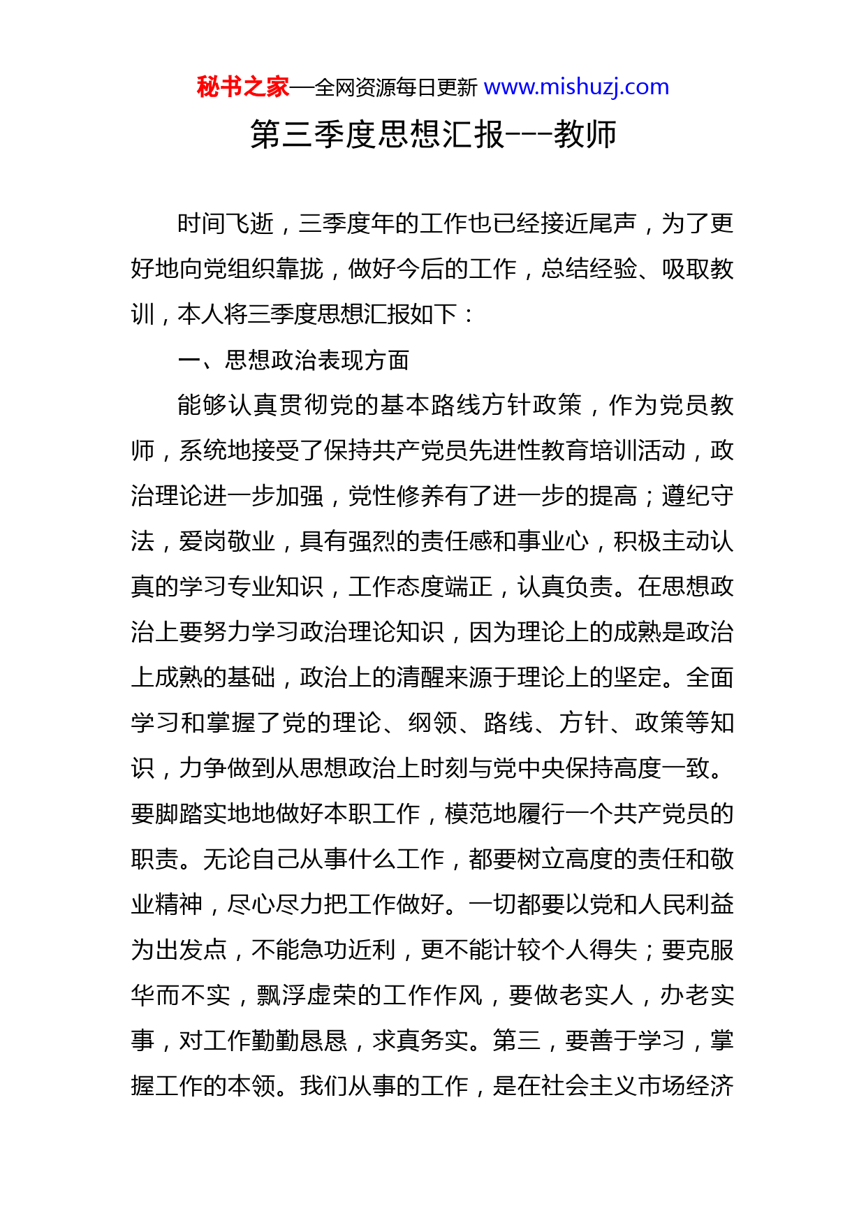秘书之家—全网资源每日更新www.mishuzj.com第三季度思想汇报---教师时间飞逝,三季度年的工作也已经接近尾声,为了更好地向党组织靠拢,做好今后的工作,总结经验、吸取教训,本人将三季度思想汇报如下:一、思想政治表现方面能够认真贯彻党的基本路线方针政策,作为党员教师,系统地接受了保持共产党员先进性教育培训活动,政治理论进一步加强,党性修养有了进一步的提高;遵纪守法,爱岗敬业,具有强烈的责任感和事业心,积极主动认真的学习专业知识,工作态度端正,认真负责。在思想政治上要努力学习政治理论知识,因为理论上的成熟是政治上成熟的基础,政治上的清醒来源于理论上的坚定。全面学习和掌握了党的理论、纲领、路线、方针、政策等知识,力争做到从思想政治上时刻与党中央保持高度一致。要脚踏实地地做好本职工作,模范地履行一个共产党员的职责。无论自己从事什么工作,都要树立高度的责任和敬业精神,尽心尽力把工作做好。一切都要以党和人民利益为出发点,不能急功近利,更不能计较个人得失;要克服华而不实,飘浮虚荣的工作作风,要做老实人,办老实事,对工作勤勤恳恳,求真务实。第三,要善于学习,掌握工作的本领。我们从事的工作,是在社会主义市场经济秘书之家—全网资源每日更新www.mishuzj.com条件下,面临许多新问题,新矛盾,新内容,没有雄厚的文化知识,管理知识,现代科技知识,尽管有再好的愿望,也只能是事倍功半。在任何时候都必须不断地更新知识,丰富自己的工作技能和实践本领,善于在工作中开拓创新,提出新的思路和见解,这样才能把良好的愿望和实际工作效果结合起来,实现动机与效果的统一。二、专业知识、工作能力方面和刚走上工作单位时相比,自己在教育教学能力方面有了进一步的提升。作为第二班主任,自己能够协助第一班主任参与班级管理。关心班级班风、学风的建设,关心每一个学生的发展,班级工作无小事,就是在每天繁琐的日常工作中自己不断的积累工作经验。在教学方面,本人自始至终以认真、严谨的治学态度,勤恳、坚持不懈的精神从事教学工作。认真按照学校教学常规的要求做,认真参加备课组的集体备课活动,以积极的态度上好每堂课,在实践中探讨、落实新课程教学理念。自己能认真执行青蓝工程,认真参加学校的学习培训和校内校外的教学观摩活动。在教学之余,自己也进行一些教学研究,把平时在教学过程中的所感所想及时总结成文字形式,这不仅是一次经验的凝练,也是对教学的再思考,对自己教学理论水平的一次提升。三、工作态度和勤奋敬业方面秘书之家—全网资源每日更新www.mishuzj.com在季度中自己担任一个班级的第二班主任,执教xxxx班级的思想品德,一星期10节课,工作认真负责,积极参加学校、学科的各项会议、活动,没有缺席和病假。一是能够虚心向领导和同事们学习业务知识,不断充实提高自己,为更好地做好工作夯实基础。二是能够认真配合各部门,一丝不苟地完成了各项任务,得到了领导和同志们的肯定。三是能够吃苦在前。在工作中,本人能够服从工作需要和领导安排,只要工作需要,本人都能坚持工作,任劳任怨。四是能够服从工作安排,在完成本职工作任务的同时,认真做好领导交办的其他各项工作。四、工作质量成绩、效益和贡献。在过去三个月中,自己撰写的教育案例《罪与罚》被选录进入学校的德育丛书;《你快乐所以我快乐》在名师之路大型教育科研活动征文评选中获三等奖;2022年7月7日在初中新课程研讨活动中向市教研员开设了一堂汇报课;在XXX市20xx20xx年度走进新课程教学研究活动中执教公开课《礼仪展风采》一节。回顾这季度的工作,学校提供了各种让自己快速锻炼成长的平台,学校领导给予自己很多工作上的关心,老教师给自己提供了很多宝贵的经验和帮助,这一切让自己在各方面都取得不同程度的进步,当然,自己也存在着许多需要改进的地方。在今后的工作中,我将继续以务实的工作态度,一如既往地认真学秘书之家—全网资源每日更新www.mishuzj.com习工作,争取工作水平的更大提高。以上是我这个季度的思想汇报,希望党组织及时给于我批评指导,我会虚心接受意见,不断改正缺点和不足,争取早日加入中国共产党。请党组织在实践中考验我!此致敬礼!汇报人:XX时间:2022年X月X日