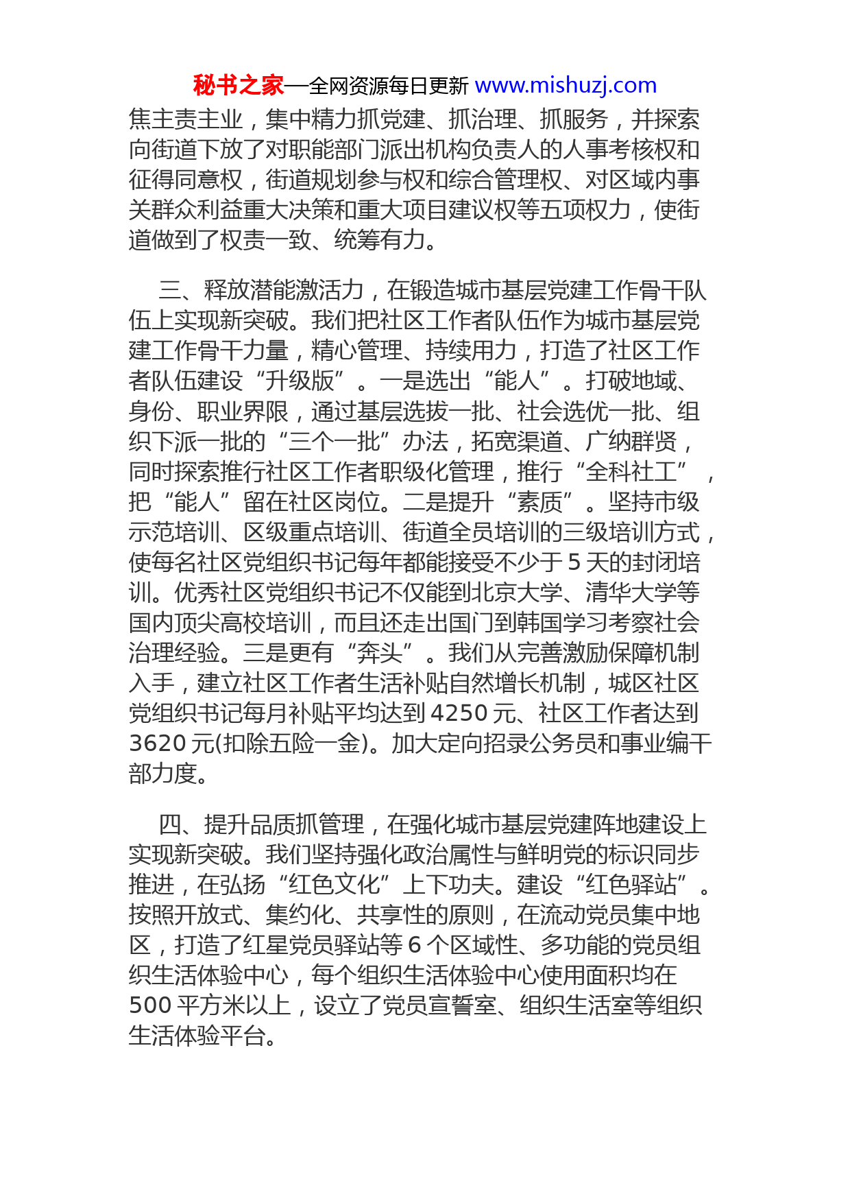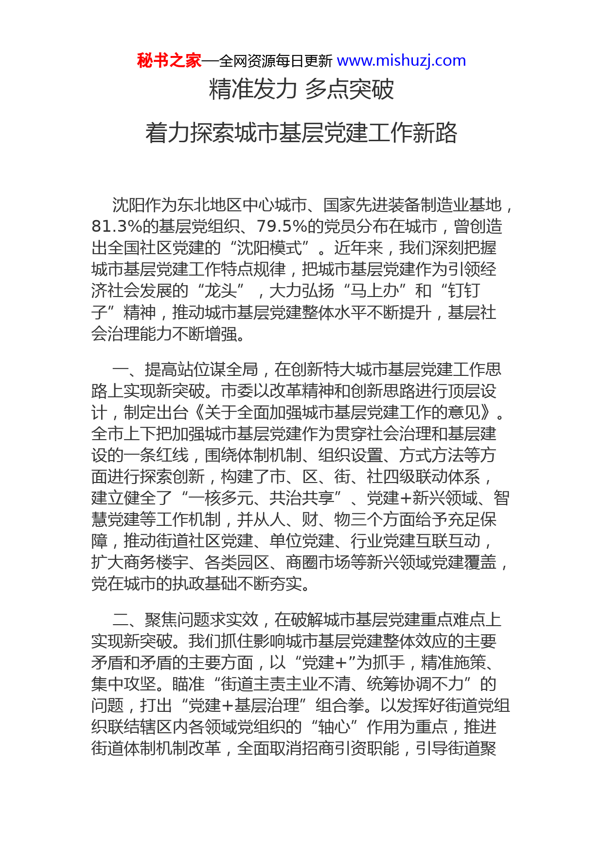 秘书之家—全网资源每日更新www.mishuzj.com精准发力多点突破着力探索城市基层党建工作新路沈阳作为东北地区中心城市、国家先进装备制造业基地,81.3%的基层党组织、79.5%的党员分布在城市,曾创造出全国社区党建的“沈阳模式”。近年来,我们深刻把握城市基层党建工作特点规律,把城市基层党建作为引领经济社会发展的“龙头”,大力弘扬“马上办”和“钉钉子”精神,推动城市基层党建整体水平不断提升,基层社会治理能力不断增强。一、提高站位谋全局,在创新特大城市基层党建工作思路上实现新突破。市委以改革精神和创新思路进行顶层设计,制定出台《关于全面加强城市基层党建工作的意见》。全市上下把加强城市基层党建作为贯穿社会治理和基层建设的一条红线,围绕体制机制、组织设置、方式方法等方面进行探索创新,构建了市、区、街、社四级联动体系,建立健全了“一核多元、共治共享”、党建+新兴领域、智慧党建等工作机制,并从人、财、物三个方面给予充足保障,推动街道社区党建、单位党建、行业党建互联互动,扩大商务楼宇、各类园区、商圈市场等新兴领域党建覆盖,党在城市的执政基础不断夯实。二、聚焦问题求实效,在破解城市基层党建重点难点上实现新突破。我们抓住影响城市基层党建整体效应的主要矛盾和矛盾的主要方面,以“党建+”为抓手,精准施策、集中攻坚。瞄准“街道主责主业不清、统筹协调不力”的问题,打出“党建+基层治理”组合拳。以发挥好街道党组织联结辖区内各领域党组织的“轴心”作用为重点,推进街道体制机制改革,全面取消招商引资职能,引导街道聚秘书之家—全网资源每日更新www.mishuzj.com焦主责主业,集中精力抓党建、抓治理、抓服务,并探索向街道下放了对职能部门派出机构负责人的人事考核权和征得同意权,街道规划参与权和综合管理权、对区域内事关群众利益重大决策和重大项目建议权等五项权力,使街道做到了权责一致、统筹有力。三、释放潜能激活力,在锻造城市基层党建工作骨干队伍上实现新突破。我们把社区工作者队伍作为城市基层党建工作骨干力量,精心管理、持续用力,打造了社区工作者队伍建设“升级版”。一是选出“能人”。打破地域、身份、职业界限,通过基层选拔一批、社会选优一批、组织下派一批的“三个一批”办法,拓宽渠道、广纳群贤,同时探索推行社区工作者职级化管理,推行“全科社工”,把“能人”留在社区岗位。二是提升“素质”。坚持市级示范培训、区级重点培训、街道全员培训的三级培训方式,使每名社区党组织书记每年都能接受不少于5天的封闭培训。优秀社区党组织书记不仅能到北京大学、清华大学等国内顶尖高校培训,而且还走出国门到韩国学习考察社会治理经验。三是更有“奔头”。我们从完善激励保障机制入手,建立社区工作者生活补贴自然增长机制,城区社区党组织书记每月补贴平均达到4250元、社区工作者达到3620元(扣除五险一金)。加大定向招录公务员和事业编干部力度。四、提升品质抓管理,在强化城市基层党建阵地建设上实现新突破。我们坚持强化政治属性与鲜明党的标识同步推进,在弘扬“红色文化”上下功夫。建设“红色驿站”。按照开放式、集约化、共享性的原则,在流动党员集中地区,打造了红星党员驿站等6个区域性、多功能的党员组织生活体验中心,每个组织生活体验中心使用面积均在500平方米以上,设立了党员宣誓室、组织生活室等组织生活体验平台。秘书之家—全网资源每日更新www.mishuzj.com
