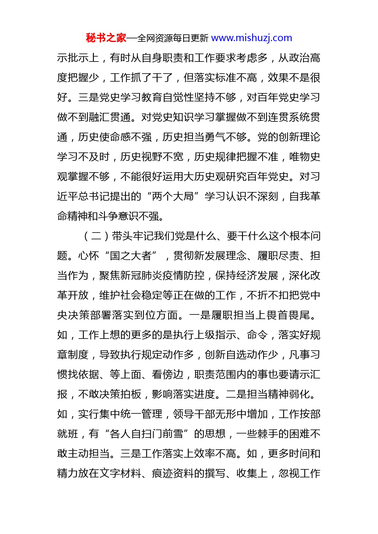 秘书之家—全网资源每日更新www.mishuzj.com纪委书记党史学习教育五个带头专题民主生活会对照检查材料按照党史学习教育领导小组的要求,聚焦“大力弘扬伟大建党精神,坚持和发展党的百年奋斗历史经验,坚定历史自信,践行时代使命,厚植为民情怀,勇于担当作为,团结带领人民群众走好新的赶考之路”主题,按照《通知》规定的学习内容深化学习,广泛征求意见,深入开展谈心谈话,围绕7个方面深入对照检查。现作如下发言,请批评指正!一、存在的突出问题(一)带头深刻感悟“两个确立”的决定性意义。深刻感悟党坚持把马克思主义同中国具体实际相结合、同中华优秀传统文化相结合的非凡历程,全面贯彻习近平新时代中国特色社会主义思想,树立正确党史观,坚定信仰信念信心,增强“四个意识”,坚定“四个自信”,做到“两个维护”方面。一是学习的系统性和深入性不够。对习近平新时代中国特色社会主义思想的新理论、新观点、新战略研究不够深入,理解不够透彻,学习更多停留于掌握知识层面,理论指导实践能力弱,在学懂弄通做实要求上有差距,思维方式、工作方法与新时代要求有差距。二是对标看齐没能做到高标准、严要求。如,在执行重要指秘书之家—全网资源每日更新www.mishuzj.com示批示上,有时从自身职责和工作要求考虑多,从政治高度把握少,工作抓了干了,但落实标准不高,效果不是很好。三是党史学习教育自觉性坚持不够,对百年党史学习做不到融汇贯通。对党史知识学习掌握做不到连贯系统贯通,历史使命感不强,历史担当勇气不够。党的创新理论学习不及时,历史视野不宽,历史规律把握不准,唯物史观掌握不够,不能很好运用大历史观研究百年党史。对习近平总书记提出的“两个大局”学习认识不深刻,自我革命精神和斗争意识不强。(二)带头牢记我们党是什么、要干什么这个根本问题。心怀“国之大者”,贯彻新发展理念、履职尽责、担当作为,聚焦新冠肺炎疫情防控,保持经济发展,深化改革开放,维护社会稳定等正在做的工作,不折不扣把党中央决策部署落实到位方面。一是履职担当上畏首畏尾。如,工作上想的更多的是执行上级指示、命令,落实好规章制度,导致执行规定动作多,创新自选动作少,凡事习惯找依据、等上面、看傍边,职责范围内的事也要请示汇报,不敢决策拍板,影响落实进度。二是担当精神弱化。如,实行集中统一管理,领导干部无形中增加,工作按部就班,有“各人自扫门前雪”的思想,一些棘手的困难不敢主动担当。三是工作落实上效率不高。如,更多时间和精力放在文字材料、痕迹资料的撰写、收集上,忽视工作秘书之家—全网资源每日更新www.mishuzj.com的实质性推进,本末倒置。(三)带头践行以人民为中心的发展思想。尊重群众意愿,为群众办实事解难题,有效保障改善民生,增强人民群众获得感幸福感安全感,确保党永远保持同人民群众的血肉联系方面。一是基层调研不深入,与师生沟通交流不细致,对学校管理工作深层次问题考虑不深,分析不透。如,对青年教师特别是临时聘用教师的关注、关心少,缺乏沟通引导,使青年教师对学校缺少归宿感,工作责任心、积极性调动不起来。二是为民解忧能力不强。三是破解难题的办法不多。对一些事项仅满足于安排了、推动了,缺乏步步为营、环环相扣的招数。(四)带头学习适用党在不同历史时期成功应对风险挑战的丰富经验,增强忧患意识,保持战略定力,提高能力本领,敢于斗争、善于斗争,不断取得新的胜利和荣光方面。一是应对风险挑战存在盲目乐观思想。如,工作中存在的矛盾问题、风险挑战,开始高度重视重视,时间一长就习以为常、见怪不怪,认为随着时间的推移,矛盾问题总会得到解决,对矛盾问题出现的反复性、解决矛盾问题的艰巨性考虑不够多。二是创新发展理念不足。如,校企合作、产教融合研究不多,与大企业的合作打不开局面,毕业生就业质量不高,缺乏开放意识、合作共蠃意识。三是攻坚克难锐气不足。如,工作中缺少迎难而上的秘书之家—全网资源每日更新www.mishuzj.com担当精神,求稳有余,闯劲不足,在发展思路、发展目标、发展措施上缺少思考。(五)带头深刻汲取党史中正反两方面经验。履行全面从严治党责任,旗帜鲜明讲政治,严守党的政治纪律和政治规矩,落实中央八项规定及其实施细则精神,持续用力“纠四风”,树新风,坚决反对形式主义官僚主义,加强对“一把手”监督和领导班子监督,坚决同一切违规违纪违法现象作斗争方面。一是落实党建工作责任制标准不高,对照新时代全面从严治党要求,落实管党治党责任仍有欠缺。二是对权力运行的监督和制约不到位,对重点领域的整治还缺乏有针对性的部署推动,廉政风险管控措施还不够有力。如,招生就业工作中存在的有偿招生现象依然存在,但是研究解决的措施办法不够多、不够硬。三是勤俭节约要求不严。如,偶尔有私款相互请吃现象。(六)落实全面从严治党责任情况和意识形态工作情况方面。一是对意识形态工作是党的一项极端重要的工作重视不够。如,自己把意识形态工作片面理解为普通宣传工作,平时学习少、思考少、安排少,没有与旗帜、道路、制度、信仰等重大政治问题联系起来,淡化了意识形态工作的重要性。二是对意识形态工作敏锐性不够强,存在“行动合格就是政治合格的思