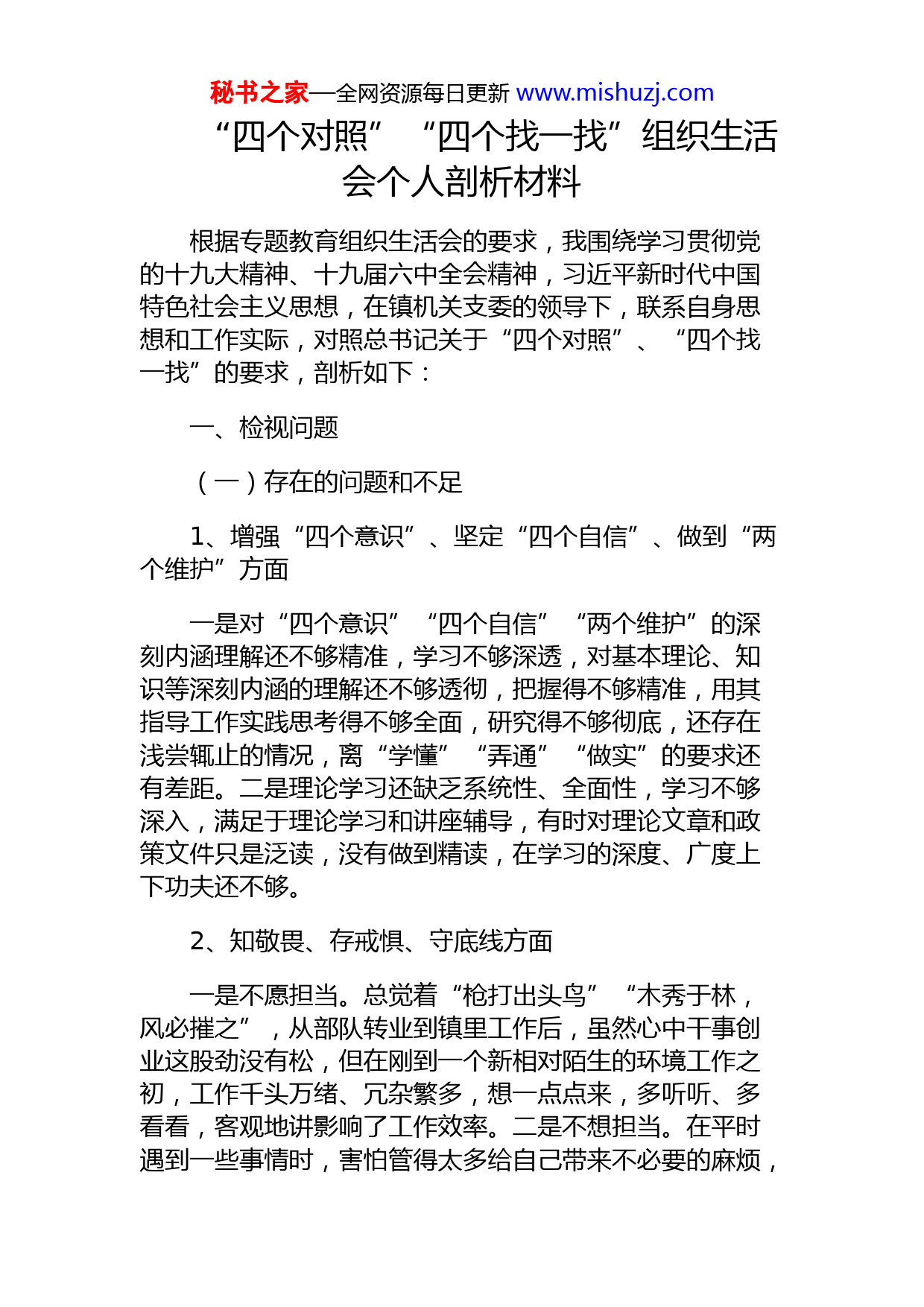秘书之家—全网资源每日更新www.mishuzj.com“四个对照”“四个找一找”组织生活会个人剖析材料根据专题教育组织生活会的要求,我围绕学习贯彻党的十九大精神、十九届六中全会精神,习近平新时代中国特色社会主义思想,在镇机关支委的领导下,联系自身思想和工作实际,对照总书记关于“四个对照”、“四个找一找”的要求,剖析如下:一、检视问题(一)存在的问题和不足1、增强“四个意识”、坚定“四个自信”、做到“两个维护”方面一是对“四个意识”“四个自信”“两个维护”的深刻内涵理解还不够精准,学习不够深透,对基本理论、知识等深刻内涵的理解还不够透彻,把握得不够精准,用其指导工作实践思考得不够全面,研究得不够彻底,还存在浅尝辄止的情况,离“学懂”“弄通”“做实”的要求还有差距。二是理论学习还缺乏系统性、全面性,学习不够深入,满足于理论学习和讲座辅导,有时对理论文章和政策文件只是泛读,没有做到精读,在学习的深度、广度上下功夫还不够。2、知敬畏、存戒惧、守底线方面一是不愿担当。总觉着“枪打出头鸟”“木秀于林,风必摧之”,从部队转业到镇里工作后,虽然心中干事创业这股劲没有松,但在刚到一个新相对陌生的环境工作之初,工作千头万绪、冗杂繁多,想一点点来,多听听、多看看,客观地讲影响了工作效率。二是不想担当。在平时遇到一些事情时,害怕管得太多给自己带来不必要的麻烦,秘书之家—全网资源每日更新www.mishuzj.com有了“遇到困难绕着走,棘手矛盾向上交”的“太极拳”,有时甚至把事情能推出去作为一种资本和经验,引以为荣、引以为傲。三是不敢担当。面对新形势、新任务有了“本领恐慌”心理,担当作为的主动性和积极性不足,害怕承诺了的工作、答应了的事情如果办不好别人会笑话,害怕别人质疑和低估自己的能力,还不如四平八稳、按部就班,这样别人也摸不着自己的深浅,有了“宁可不干、也要不犯”的错误心理,缺少了攻坚克难的勇气。3、群众观点、群众立场、群众感情、服务群众方面一是宗旨意识、服务意识淡化。考虑工作对上级负责多、对群众担当少,宗旨意识嘴里喊得响,思想深处和具体行动却有所欠缺,疏远了与群众的情感。对做好新形势下的群众工作存在“老办法不管用、新办法不会用”的本领恐慌和能力危机。二是在工作上还存在以会议贯彻会议、以文件落实文件的官僚主义和形式主义现象。4、思想觉悟、能力素质、道德修养、作风形象方面一是对上级要求的文件,存在应付了事,以文件落实文件,没有真正将各项工作落到实处。二是服务群众的意识有待进一步加强。三是对上级布置的学习任务,应付了事,没有学深一层、学先一步。(二)需要说明的问题一是上级党组织在巡视巡察、干部考察、工作考核中所反馈的问题和所指出的意见方面,本人不存在这方面的问题。二是对照党章党规查找出来的问题方面。查找出来的问题全部列入检视问题中。秘书之家—全网资源每日更新www.mishuzj.com三是党员领导干部对是否存在利用名贵特产特殊资源谋取私利问题方面,本人不存在利用名贵特产特殊资源谋取私利的情况。四是对主题教育专项整治中“黄赌毒和黑恶势力听之任之、失职失责甚至包庇纵容、充当保护伞”专项整治方面,本人不存在黄赌毒和黑恶势力听之任之、失职失责甚至包庇纵容、充当保护伞的情况。五是对主题教育专项整治中领导干部配偶、子女及其配偶经商办企业情况方面,本人配偶、子女不存在经商办企业情况。六是本人重大事项报告方面。。七是巡视反馈问题方面,今年以来,本人不存在巡视反馈的问题。八是组织约谈函询等问题方面,今年以来,本人未收到上级组织的约谈函询。二、原因剖析一是理论学习放松。只把学习当成一项任务,没有真正当成一种习惯。主观上对加强理论学习的紧迫感认识不足,自认为自己工作经验丰富,知道具体工作实践足够了,忽视了对政治理论学习的重视。二是党性修养放松。对照总书记在“不忘初心、牢记使命”工作座谈会上对全体党员干部的要求,我认真反思自身工作这么多年来做人、做事的行为准则,虽然自己能够保持清廉的从政操守,在大是大非面前能够坚定立场,在各式各样的诱惑下能够经受得住考验,但是随着时间的推移,习惯于以工作代替党性锻炼,实际上自己的党性还秘书之家—全网资源每日更新www.mishuzj.com远远未达标,导致自身“抵抗力”有所下降,对自己的要求不严、标准不高,自身党性修养有所放松。三是理想信念弱化。随着工作性质和岗位的变化,大多时间在办公室“昏天黑地”,与群众直接接触的机会越来越少,与群众的距离逐渐拉大,对群众感情越来越淡。对自身世界观、人生观、价值观的认识和改造还不到位,对比党章规定和党员标准,自己还是有不小的差距,在思想上、工作中有了懈怠、放松,存在“只要自己做好本职工作、不去触碰党纪国法的红线就可以”的错误认识,导致自己的行为没有达到标准要求,对群众反映强烈问题没有做到马上办理。三、整改措施一是做强化理论学习的表率。认真学习《习近平新时代中国特色社会主义思想学习纲要》和党章党规党纪,深入研究上级相关精神,树立终身学习的理念,把学习当成一种自觉、一种境界、一种追求和一种习惯,养成科