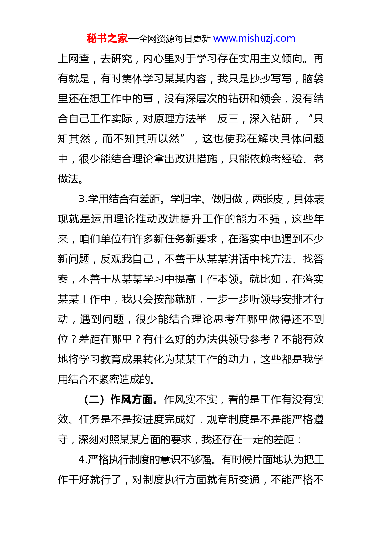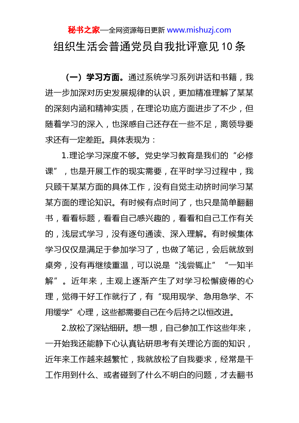 秘书之家—全网资源每日更新www.mishuzj.com组织生活会普通党员自我批评意见10条(一)学习方面。通过系统学习系列讲话和书籍,我进一步加深对历史发展规律的认识,更加精准理解了某某的深刻内涵和精神实质,在理论功底方面进步了不少,但随着学习的深入,也深感自己还存在一些不足,离领导要求还有一定差距。具体表现为:1.理论学习深度不够。党史学习教育是我们的“必修课”,也是开展工作的现实需要,在平时学习过程中,我只顾干某某方面的具体工作,没有自觉主动挤时间学习某某方面的理论知识。有时候有点时间了,也只是简单翻翻书,看看标题,看看自己感兴趣的,看看和自己工作有关的,浅层式学习,没有逐句通读、深入理解。有时候集体学习仅仅是满足于参加学习了,也做了笔记,会后就放到桌旁,没有再继续重温,可以说是“浅尝辄止”“一知半解”。近年来,主观上逐渐产生了对学习松懈疲倦的心理,觉得干好工作就行了,有“现用现学、急用急学、不用缓学”心理,这些都需要自己在今后持之以恒改进。2.放松了深钻细研。想一想,自己参加工作这些年来,一开始我还能静下心认真钻研思考有关理论方面的知识,近年来工作越来越繁忙,我就放松了自我要求,经常是干工作用到什么、或者碰到了什么不明白的问题,才去翻书秘书之家—全网资源每日更新www.mishuzj.com上网查,去研究,内心里对于学习存在实用主义倾向。再有就是,有时集体学习某某内容,我只是抄抄写写,脑袋里还在想工作中的事,没有深层次的钻研和领会,没有结合自己工作实际,对原理方法举一反三,深入钻研,“只知其然,而不知其所以然”,这也使我在解决具体问题中,很少能结合理论拿出改进措施,只能依赖老经验、老做法。3.学用结合有差距。学归学、做归做,两张皮,具体表现就是运用理论推动改进提升工作的能力不强,这些年来,咱们单位有许多新任务新要求,在落实中也遇到不少新问题,反观我自己,不善于从某某讲话中找方法、找答案,不善于从某某学习中提高工作本领。就比如,在落实某某工作中,我只会按部就班,一步一步听领导安排才行动,遇到问题,很少能结合理论思考在哪里做得还不到位?差距在哪里?有什么好的办法供领导参考?不能有效地将学习教育成果转化为某某工作的动力,这些都是我学用结合不紧密造成的。(二)作风方面。作风实不实,看的是工作有没有实效、任务是不是按进度完成好,规章制度是不是能严格遵守,深刻对照某某方面的要求,我还存在一定的差距:4.严格执行制度的意识不够强。有时候片面地认为把工作干好就行了,对制度执行方面就有所变通,不能严格不秘书之家—全网资源每日更新www.mishuzj.com差分毫执行。比如,在写一些着急的材料,或者落实领导交办的一些紧要工作时,习惯把精力放在具体内容、具体工作上,有时没有严格按流程逐级汇报审核把关。有时加班、工作很忙的时候,在考勤等制度方面便放松了,不能一以贯之抓好日常作风养成。这个方面,我今后必须注意,不管干什么,必须严格执行制度,按流程办事,从内心里认识制度的重要性。5.职责落实不够严格。具体表现为怕担风险、怕惹麻烦,怕出事情,总是习惯了领导怎么说,自己就怎么干,习惯了等领导安排后再行动,很少结合实际主动研究怎么落实工作,满足于不出错就好,放松了对工作标准的要求。比如:在某某工作中,出现过因为不严谨导致数据不一致的问题,我只是及时自己纠正就完事了,没有从思想方面、从作风方面认真剖析出现问题的原因,没有高标准严要求落实好本职工作。6.自身还是不够硬。参加工作XX多年,我始终注意言行,管住自己,但是也会参加一些人情世故,自觉抵制各种关系的拉拉扯扯这方面做得不到位,没有完全意识到这不仅是影响自身形象的表现,这点还需要各位领导、大家的批评监督。再有一点就是,过去工资低,对享乐没有多少感受,但这些年,我也能感觉到一些不良习气影响了我,回头想想,再对照无数革命先辈艰苦奋斗的精神,我秘书之家—全网资源每日更新www.mishuzj.com在这方面确实还需要防微杜渐,时刻警醒。(三)能力方面:这些年,我无论顺境还是逆境,都能够牢记职责使命,保持工作劲头,加强自身某某锻炼,但是深刻反思,我在思想认识、思维方式和能力素养方面还存在不足,具体表现为:7.一抓到底的锐气不足。平常想事情、处理问题的系统性、前瞻性不足,排除障碍的魄力、锐气不够。面对某某工作出现的困难和问题,自身视野不高,找客观原因多,从自身工作思路、担当作为方面深刻剖析少,在履行某某职责方面,还存在成效不明显的现象。工作习惯于用常规的思维落实,手脚放不开,步子迈不大,有时还有畏难思想。比如,前段时间某某工作,我过多依靠地依靠某(领导职务)指示指点,小事也请示汇报,自身作用发挥得不充分,缺少一种敢于迎难而上的锐气。当然,内心里也是怕自己的想法不一定正确,或者影响了领导的整体安排,下一步必须要坚决克服,请大家监督提醒我。8.创新的能力不够强。工作追求四平八稳、按部就班,这可能与自己的性格有关,也可能与多年的某某工作经历有关,自己虽然能够把握职责任务,但只讲究稳妥有序把工作落实好就行了,遇到问题也是不自觉习惯从过去惯例中找解决办法,不善于探索实践,提炼经验。这些年,咱们某某工作有了新要求,既要完成