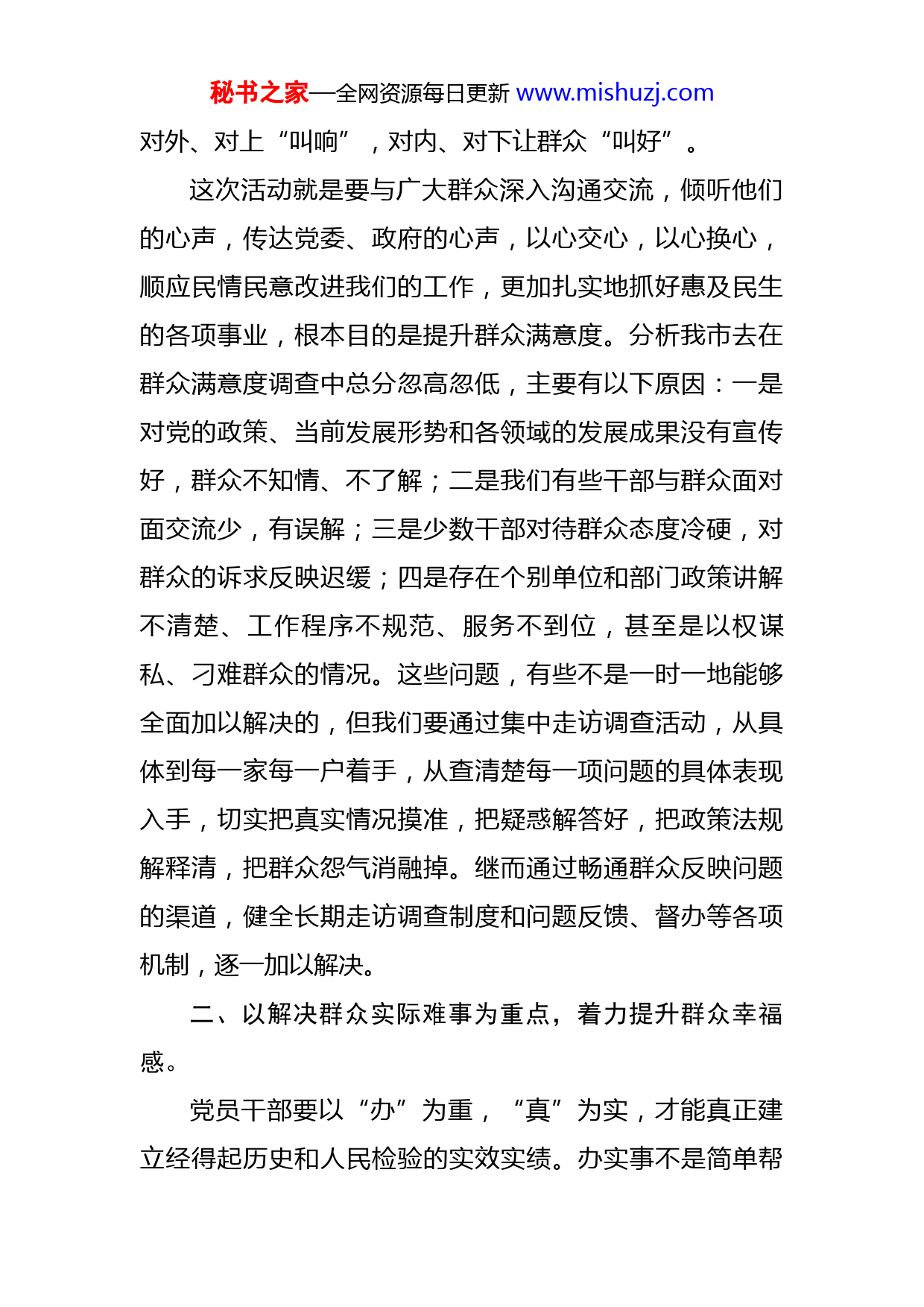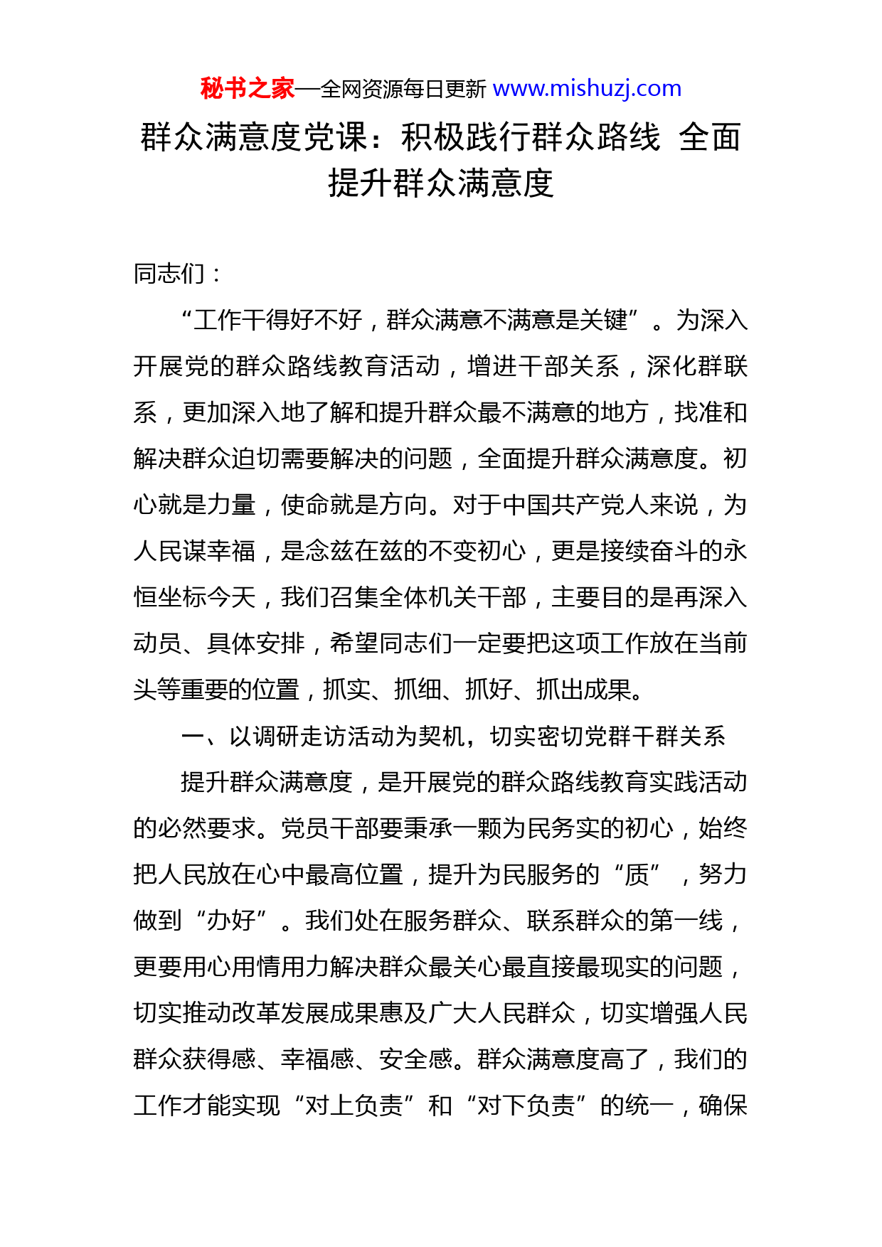 秘书之家—全网资源每日更新www.mishuzj.com群众满意度党课:积极践行群众路线全面提升群众满意度同志们:“工作干得好不好,群众满意不满意是关键”。为深入开展党的群众路线教育活动,增进干部关系,深化群联系,更加深入地了解和提升群众最不满意的地方,找准和解决群众迫切需要解决的问题,全面提升群众满意度。初心就是力量,使命就是方向。对于中国共产党人来说,为人民谋幸福,是念兹在兹的不变初心,更是接续奋斗的永恒坐标今天,我们召集全体机关干部,主要目的是再深入动员、具体安排,希望同志们一定要把这项工作放在当前头等重要的位置,抓实、抓细、抓好、抓出成果。一、以调研走访活动为契机,切实密切党群干群关系提升群众满意度,是开展党的群众路线教育实践活动的必然要求。党员干部要秉承一颗为民务实的初心,始终把人民放在心中最高位置,提升为民服务的“质”,努力做到“办好”。我们处在服务群众、联系群众的第一线,更要用心用情用力解决群众最关心最直接最现实的问题,切实推动改革发展成果惠及广大人民群众,切实增强人民群众获得感、幸福感、安全感。群众满意度高了,我们的工作才能实现“对上负责”和“对下负责”的统一,确保秘书之家—全网资源每日更新www.mishuzj.com对外、对上“叫响”,对内、对下让群众“叫好”。这次活动就是要与广大群众深入沟通交流,倾听他们的心声,传达党委、政府的心声,以心交心,以心换心,顺应民情民意改进我们的工作,更加扎实地抓好惠及民生的各项事业,根本目的是提升群众满意度。分析我市去在群众满意度调查中总分忽高忽低,主要有以下原因:一是对党的政策、当前发展形势和各领域的发展成果没有宣传好,群众不知情、不了解;二是我们有些干部与群众面对面交流少,有误解;三是少数干部对待群众态度冷硬,对群众的诉求反映迟缓;四是存在个别单位和部门政策讲解不清楚、工作程序不规范、服务不到位,甚至是以权谋私、刁难群众的情况。这些问题,有些不是一时一地能够全面加以解决的,但我们要通过集中走访调查活动,从具体到每一家每一户着手,从查清楚每一项问题的具体表现入手,切实把真实情况摸准,把疑惑解答好,把政策法规解释清,把群众怨气消融掉。继而通过畅通群众反映问题的渠道,健全长期走访调查制度和问题反馈、督办等各项机制,逐一加以解决。二、以解决群众实际难事为重点,着力提升群众幸福感。党员干部要以“办”为重,“真”为实,才能真正建立经得起历史和人民检验的实效实绩。办实事不是简单帮秘书之家—全网资源每日更新www.mishuzj.com钱帮物、搞花架子、堆几个盆景,而是要精准抓住“急难愁盼”具体问题,找准办的方向,为“质”奠基。深入开展走访活动,表明了党委政府着力搜集意见、弥补短板、解决问题的态度。说明我们用心倾听群众的呼声,充分尊重每一位群众的意见。今天与会的同志,都是参与走访活动的主体,是我们龙阳镇党员干部的代表,在走访中当好什么角色、做好什么工作,是对党委政府态度的展示、意愿的落实。大家要做到身入、心入,用心把握好以下几点:一要当好宣传员。这些年来,党和国家的强农惠农政策不断出台,各级民生投入持续加大,众多适应形势变化、合民心、符民意的好政策不断出台,我们也按照上级政策要求扎扎实实地抓好了相关工作,实实在在的惠及了民生,让群众普遍得到了实惠。大家要在入户走访中做好宣传,让更多的群众真切认识到各级党委政府始终是系民生于心,在坚持不懈地惠民生增民利由于大家所处部门不同,对各项具体政策的了解不一,走访中遇群众有疑难咨询,自己清楚的一定要讲明白,不清楚的要立即咨询相关业务部门的同志,一定要给予详尽的解答。二要当好办事员。入户走访,了解群众的困难、解决他们遇到的问题是非常重要的一方面。一些群众对想办、要办的一些事情,特别是需要到政府部门和相关业务单位秘书之家—全网资源每日更新www.mishuzj.com办理的事情,可能不知道该找谁,不了解程序,不知道该怎么办。在我们看来,往往这些事情都不大,但在群众眼里,都是关系切身利益的大事。走访中,我们要注意收集这方面的情况,能够代办的,要主动代群众跑腿,尽快办好后回复;有要求必须本人前往的,要与业务部门提前联系,问清所需手续,办理的时间,给群众交代交待清楚。同时,群众遇到的有些疑难问题可能是一个部门、一个单位不好解决的,走访组要发挥自己的优势,主动协调相关部门予以办理。有些一时不能解决或暂时没有条件解决的问题,要向群众说明白原因。三要当好消解阀。走访中,我们难免遇到一些群众因为自己想要办的事受阻或不顺利,甚至是因为个人要办的这些事情与相关法律规定的要求不符而不能办,对有些部门有怨气,甚至牢骚满腹。对此,我们不要怕群众把怨气撒在自己身上,要甘当群众的出气筒,耐心做好疏导。不但要说理,讲清政策,更要讲情,消解怨气。要做到放下架子,平心静气,主动做好解释说明。真正把这一次走访作为消解矛盾、和谐关系的重大契机。四要当好通讯员。每一位走访人员,都是党委政府与群众间的连心桥。不仅要对群众满意的地方做好解释说明,对群众遇到的困难和问题抓好协调办理,还要起到好上传下达的作用。一是要把我市取得的