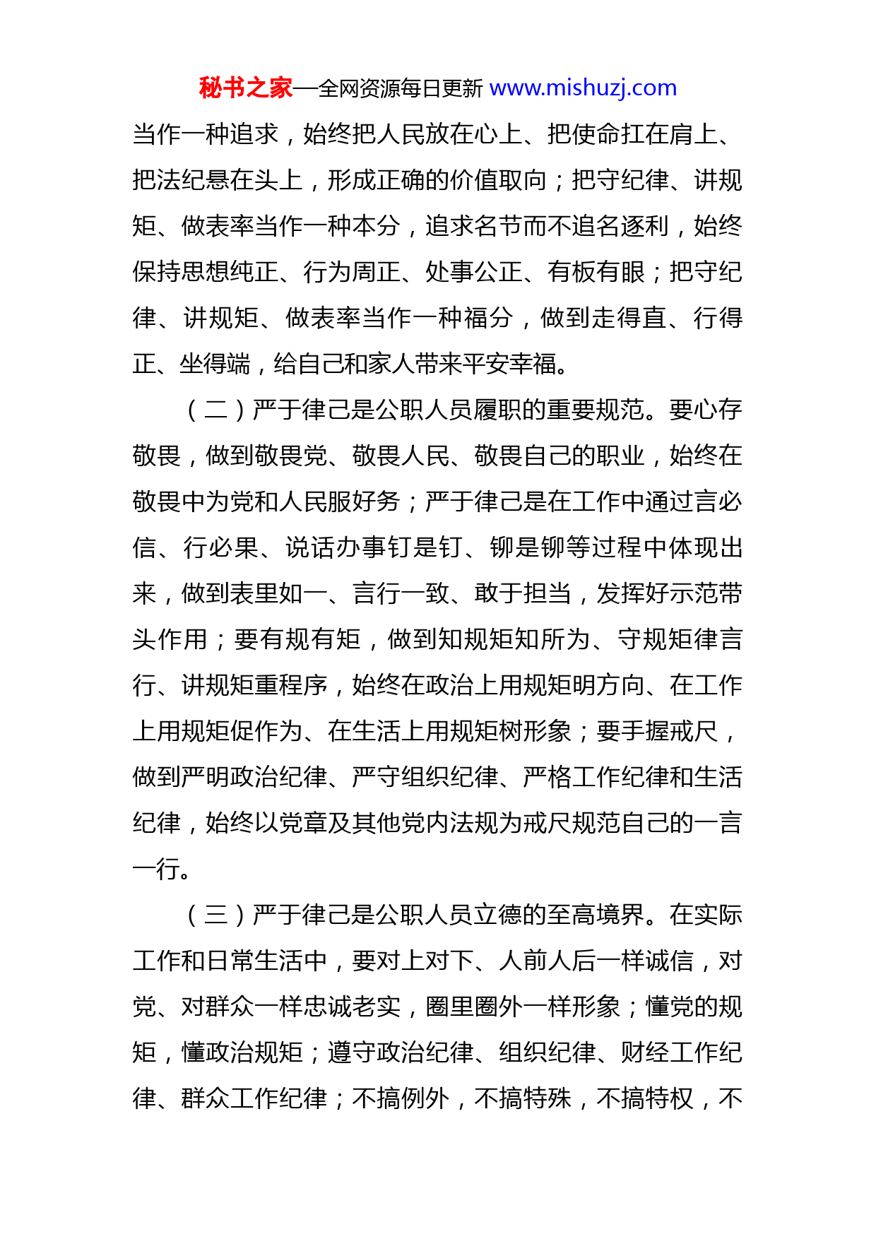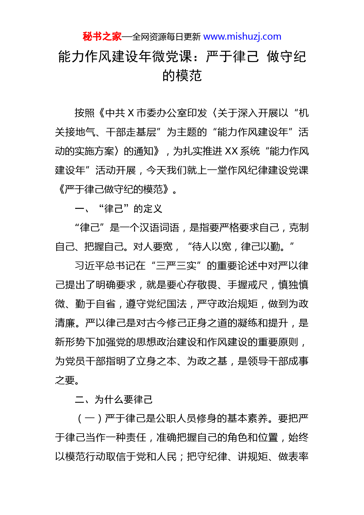秘书之家—全网资源每日更新www.mishuzj.com能力作风建设年微党课:严于律己做守纪的模范按照《中共X市委办公室印发〈关于深入开展以“机关接地气、干部走基层”为主题的“能力作风建设年”活动的实施方案〉的通知》,为扎实推进XX系统“能力作风建设年”活动开展,今天我们就上一堂作风纪律建设党课《严于律己做守纪的模范》。一、“律己”的定义“律己”是一个汉语词语,是指要严格要求自己,克制自己、把握自己。对人要宽,“待人以宽,律己以勤。”习近平总书记在“三严三实”的重要论述中对严以律己提出了明确要求,就是要心存敬畏、手握戒尺,慎独慎微、勤于自省,遵守党纪国法,严守政治规矩,做到为政清廉。严以律己是对古今修己正身之道的凝练和提升,是新形势下加强党的思想政治建设和作风建设的重要原则,为党员干部指明了立身之本、为政之基,是领导干部成事之要。二、为什么要律己(一)严于律己是公职人员修身的基本素养。要把严于律己当作一种责任,准确把握自己的角色和位置,始终以模范行动取信于党和人民;把守纪律、讲规矩、做表率秘书之家—全网资源每日更新www.mishuzj.com当作一种追求,始终把人民放在心上、把使命扛在肩上、把法纪悬在头上,形成正确的价值取向;把守纪律、讲规矩、做表率当作一种本分,追求名节而不追名逐利,始终保持思想纯正、行为周正、处事公正、有板有眼;把守纪律、讲规矩、做表率当作一种福分,做到走得直、行得正、坐得端,给自己和家人带来平安幸福。(二)严于律己是公职人员履职的重要规范。要心存敬畏,做到敬畏党、敬畏人民、敬畏自己的职业,始终在敬畏中为党和人民服好务;严于律己是在工作中通过言必信、行必果、说话办事钉是钉、铆是铆等过程中体现出来,做到表里如一、言行一致、敢于担当,发挥好示范带头作用;要有规有矩,做到知规矩知所为、守规矩律言行、讲规矩重程序,始终在政治上用规矩明方向、在工作上用规矩促作为、在生活上用规矩树形象;要手握戒尺,做到严明政治纪律、严守组织纪律、严格工作纪律和生活纪律,始终以党章及其他党内法规为戒尺规范自己的一言一行。(三)严于律己是公职人员立德的至高境界。在实际工作和日常生活中,要对上对下、人前人后一样诚信,对党、对群众一样忠诚老实,圈里圈外一样形象;懂党的规矩,懂政治规矩;遵守政治纪律、组织纪律、财经工作纪律、群众工作纪律;不搞例外,不搞特殊,不搞特权,不秘书之家—全网资源每日更新www.mishuzj.com搞潜规则。要和群众紧紧地连在一起,这样才能为群众服务好,为群众办好事、办实事,得到群众的认可。三、怎样律己打铁还需自身硬。严以律己,才能做人立世,也才能干事创业。这就要求党员干部政治上讲忠诚,组织上讲纪律,行动上讲规矩。慎初、慎微、慎行,方可确保忠诚、干净、担当;常怀律己之心、常思贪欲之害、常修为政之德,才能筑牢思想防线,恪守法纪底线。(一)严以律己,贵在防微杜渐。“物必先腐而后虫生”,不守纪律不讲规矩,往往是一切腐败现象的源头。党员干部要从小事、小节做起,从点滴抓起。小事忽视不得、含糊不得、放任不得。小节不保,大节难守。无论在“工作圈”、“生活圈”、“社交圈”,无论是在八小时以内,还是八小时以外,都要时刻检点自己、自觉约束自己、不断反省自己。(二)严以律己,重在知行合一。领导干部应言行一致,表里如一,决不能像川剧中的“变脸”,说一套,做一套,想一套,干一套。倘若只把“律己”当做口号、流于形式,难免出现台上台下“两个样”,所言所行“两张皮”的现象。因此,必须要把党的纪律和规矩内化于心、外化于行,贯彻于大小决策部署中,言必行行必果。(三)严以律己,自律是基础,他律是保障。在强化秘书之家—全网资源每日更新www.mishuzj.com党员干部自律意识的同时,要不断筑牢法治防火墙,扎紧制度的“篱笆”,把权力“关进笼子里”。“举头三尺有纲纪”,始终对党纪国法心存敬畏,做到有权不“任性”。要习惯于在法律约束下作决策,在制度笼子里办事情,严格按照法定职责、法定权限、法定程序,公开透明地履行职责。X系统全体党员干部要紧紧围绕全市“三明三强”大会和市第十四次党代会各项部署,理清思路、查找问题、明确方向,自觉投身“能力作风建设年”活动,大力营造担当作为、锐意进取、狠抓落实的浓厚氛围,真正严起来、紧起来、实起来,动起来、快起来、跑起来,XX工作各项重点任务快见实效、大见成效。