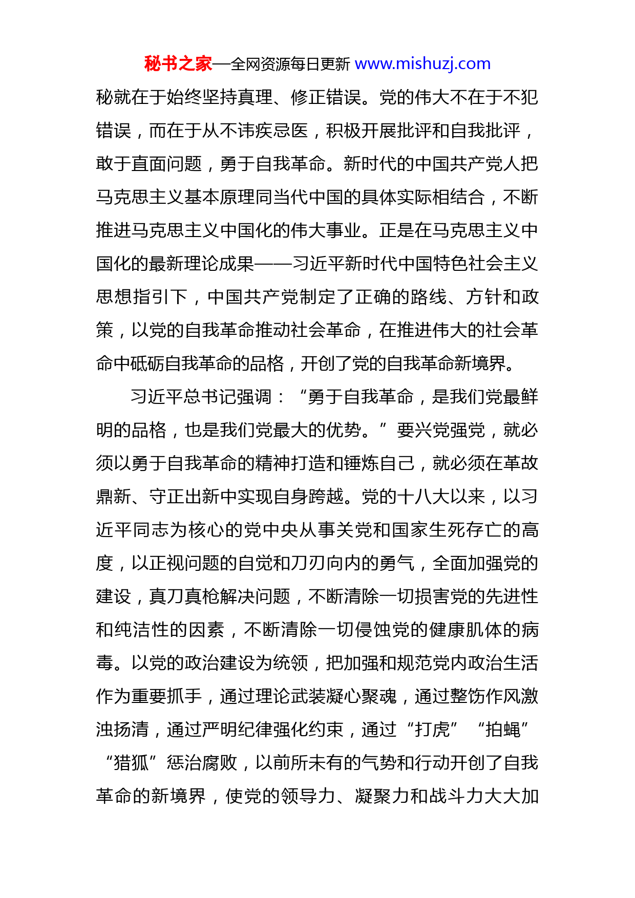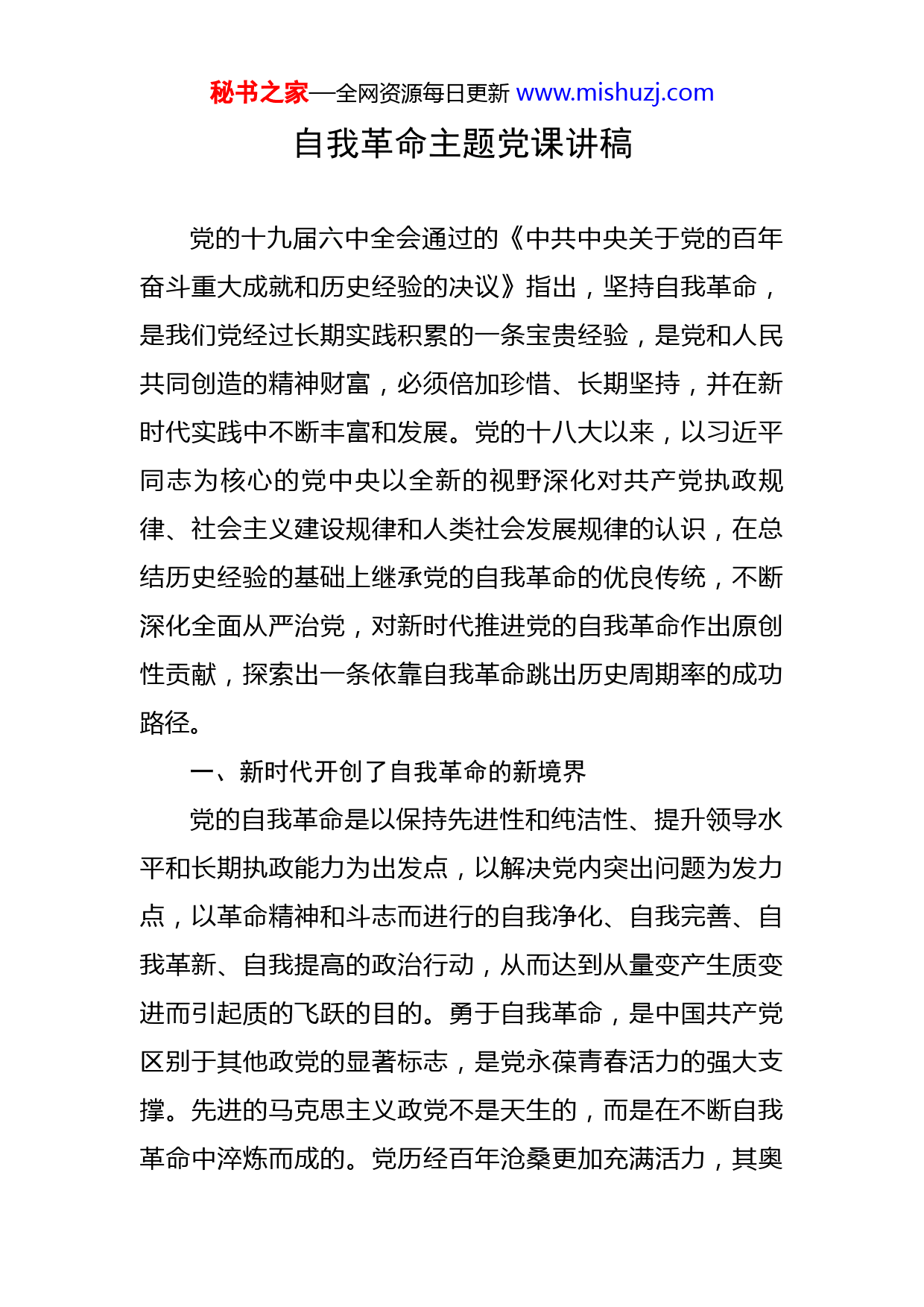 秘书之家—全网资源每日更新www.mishuzj.com自我革命主题党课讲稿党的十九届六中全会通过的《中共中央关于党的百年奋斗重大成就和历史经验的决议》指出,坚持自我革命,是我们党经过长期实践积累的一条宝贵经验,是党和人民共同创造的精神财富,必须倍加珍惜、长期坚持,并在新时代实践中不断丰富和发展。党的十八大以来,以习近平同志为核心的党中央以全新的视野深化对共产党执政规律、社会主义建设规律和人类社会发展规律的认识,在总结历史经验的基础上继承党的自我革命的优良传统,不断深化全面从严治党,对新时代推进党的自我革命作出原创性贡献,探索出一条依靠自我革命跳出历史周期率的成功路径。一、新时代开创了自我革命的新境界党的自我革命是以保持先进性和纯洁性、提升领导水平和长期执政能力为出发点,以解决党内突出问题为发力点,以革命精神和斗志而进行的自我净化、自我完善、自我革新、自我提高的政治行动,从而达到从量变产生质变进而引起质的飞跃的目的。勇于自我革命,是中国共产党区别于其他政党的显著标志,是党永葆青春活力的强大支撑。先进的马克思主义政党不是天生的,而是在不断自我革命中淬炼而成的。党历经百年沧桑更加充满活力,其奥秘书之家—全网资源每日更新www.mishuzj.com秘就在于始终坚持真理、修正错误。党的伟大不在于不犯错误,而在于从不讳疾忌医,积极开展批评和自我批评,敢于直面问题,勇于自我革命。新时代的中国共产党人把马克思主义基本原理同当代中国的具体实际相结合,不断推进马克思主义中国化的伟大事业。正是在马克思主义中国化的最新理论成果——习近平新时代中国特色社会主义思想指引下,中国共产党制定了正确的路线、方针和政策,以党的自我革命推动社会革命,在推进伟大的社会革命中砥砺自我革命的品格,开创了党的自我革命新境界。习近平总书记强调:“勇于自我革命,是我们党最鲜明的品格,也是我们党最大的优势。”要兴党强党,就必须以勇于自我革命的精神打造和锤炼自己,就必须在革故鼎新、守正出新中实现自身跨越。党的十八大以来,以习近平同志为核心的党中央从事关党和国家生死存亡的高度,以正视问题的自觉和刀刃向内的勇气,全面加强党的建设,真刀真枪解决问题,不断清除一切损害党的先进性和纯洁性的因素,不断清除一切侵蚀党的健康肌体的病毒。以党的政治建设为统领,把加强和规范党内政治生活作为重要抓手,通过理论武装凝心聚魂,通过整饬作风激浊扬清,通过严明纪律强化约束,通过“打虎”“拍蝇”“猎狐”惩治腐败,以前所未有的气势和行动开创了自我革命的新境界,使党的领导力、凝聚力和战斗力大大加秘书之家—全网资源每日更新www.mishuzj.com强,党风政风焕然一新,确保党不变质、不变色、不变味,确保党在新时代坚持和发展中国特色社会主义的历史进程中始终成为坚强领导核心。新时代党的自我革命和全面从严治党的生动实践,进一步强化了党的领导核心作用,增强了党的先进性和纯洁性,为顺利实施“四个全面”战略布局和“五位一体”总体布局、推进党和国家事业发生历史性变革,提供了根本保证。实践表明,没有中国共产党的坚强领导,推进中国特色社会主义事业和实现中华民族伟大复兴是不可能的;而没有党的自我革命,确保中国共产党的坚强领导地位也是不可能的。中国特色社会主义进入新的发展阶段,在以习近平同志为核心的党中央坚强领导下,中国号巨轮正承载着中国人民的伟大梦想破浪前进,胜利驶向光辉的彼岸。二、新时代积累了自我革命的新经验党的十八大以来,以习近平同志为核心的党中央以前所未有的政治勇气和战略定力推进党的自我革命,取得了开创性成就,积累了丰富经验,产生了深远影响。习近平总书记创造性地提出了一系列新理念新思想新战略,对新时代推进党的自我革命作出重要的原创性贡献,进一步明确了推进党的自我革命的时代要求和战略部署。以勇于自我革命的精神铸就保持初心使命的坚定意志。初心和使命是党的性质宗旨、理想信念、奋斗目标的秘书之家—全网资源每日更新www.mishuzj.com集中体现。习近平总书记指出:“做到不忘初心、牢记使命,并不是一件容易的事情,必须有强烈的自我革命精神。”党的十八大以来,我们党正是始终坚持为中国人民谋幸福、为中华民族谋复兴,坚持立党为公、执政为民,坚持权为民所用、利为民所谋、情为民所系,不断检视自己、反省自己,不断纠正自己的失误和过错,不断同弱化党的先进性和纯洁性的现象和行为作斗争,才做到了“任凭风浪打,稳坐钓鱼台”,以“金刚不坏之身”立于不败之地。事实证明,做到不忘初心、牢记使命,必须有强烈的自我革命精神,以革命的斗争性和彻底性把党的自我净化、自我完善、自我革新、自我提高推向深入,确保把党建设成为始终走在时代前列、人民衷心拥护、勇于自我革命、经得起各种风浪考验、朝气蓬勃的马克思主义执政党。以永葆党的先进性和纯洁性为自我革命的根本目的,确保党永远不变质、不本色、不变味。习近平总书记指出:“先进性和纯洁性是马克思主义政党的本质属性,我们加强党的建设,就是要同一切弱化先进性、损害纯洁性的问题作斗争,祛病疗伤,激浊扬清。”党的自我革命是保
