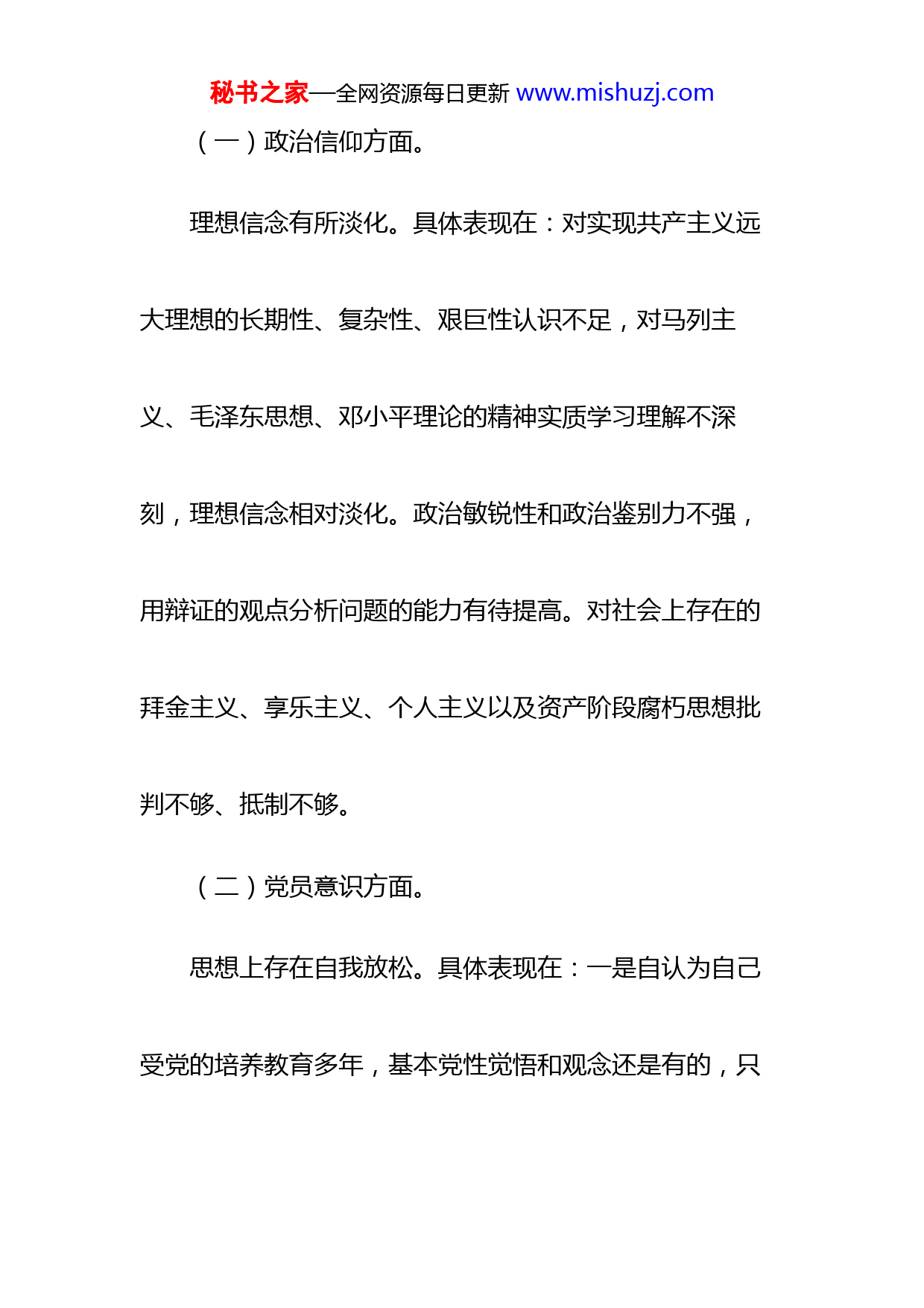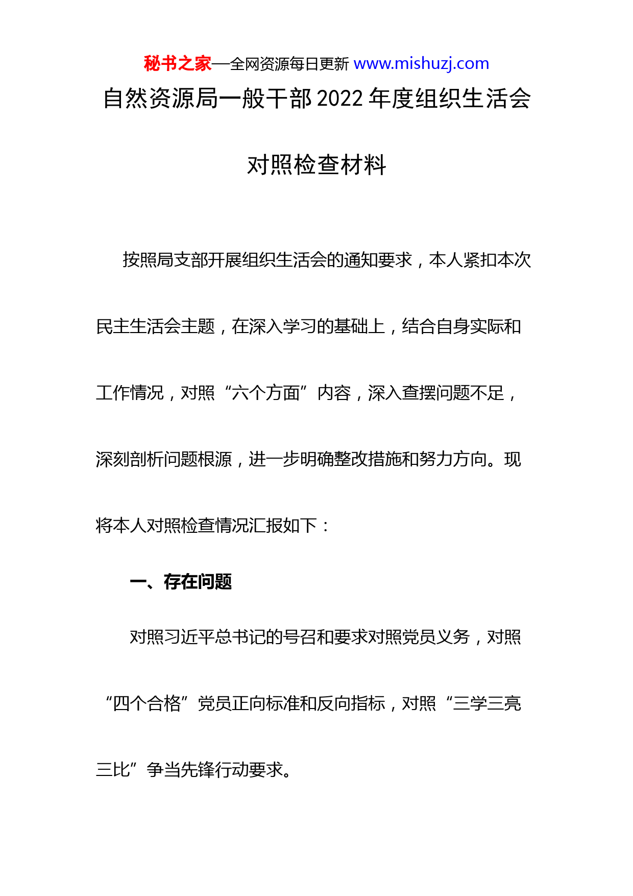 秘书之家—全网资源每日更新www.mishuzj.com自然资源局一般干部2022年度组织生活会对照检查材料按照局支部开展组织生活会的通知要求,本人紧扣本次民主生活会主题,在深入学习的基础上,结合自身实际和工作情况,对照“六个方面”内容,深入查摆问题不足,深刻剖析问题根源,进一步明确整改措施和努力方向。现将本人对照检查情况汇报如下:一、存在问题对照习近平总书记的号召和要求对照党员义务,对照“四个合格”党员正向标准和反向指标,对照“三学三亮三比”争当先锋行动要求。秘书之家—全网资源每日更新www.mishuzj.com(一)政治信仰方面。理想信念有所淡化。具体表现在:对实现共产主义远大理想的长期性、复杂性、艰巨性认识不足,对马列主义、毛泽东思想、邓小平理论的精神实质学习理解不深刻,理想信念相对淡化。政治敏锐性和政治鉴别力不强,用辩证的观点分析问题的能力有待提高。对社会上存在的拜金主义、享乐主义、个人主义以及资产阶段腐朽思想批判不够、抵制不够。(二)党员意识方面。思想上存在自我放松。具体表现在:一是自认为自己受党的培养教育多年,基本党性觉悟和观念还是有的,只秘书之家—全网资源每日更新www.mishuzj.com要按照上级的指示走,不犯原则性的错误,就会平稳度过。二是认为自己有一定的工作经验,也具备一定的政策理论水平,做好一般性工作的能力也是有的,没必要再化大力气去拼命干工作的态度。(三)理论学习方面。理论学习不够深入。具体表现在:对习近平新时代中国特色社会主义思想理论武装头脑的紧迫性认识不足,理论学习不够重视,学习自觉性、积极性和主动性不足,学习专题不突出,针对性不强,不分层次,一般通读多,重点精读少,做读书笔记更少。对理论的钻研不深入,对理论学习浅尝辄止,不求甚解。理论联系实际不够,学用脱秘书之家—全网资源每日更新www.mishuzj.com节,运用理论指导实践的意识不强,没有充分把理论和实践紧密地联系起来,运用马克思主义的立场、观点、方法来分析和解决问题、指导工作、提高工作水平。(四)能力本领方面。工作方法跟不上时代要求。具体表现在:一是仍然满足于办公室工作是上传下达的陈旧工作方法和思路,对如何做好新时代自然资源工作思路不够清晰;二是组织能力欠缺,组织开展各项活动时缺乏与人沟通,使局里干部对活动参与的积极性不够主动,导致工作往往达不到预期的效果。三是工作协调能力有待改善,对一些牵涉到其他部门的工作未能主动协调办理。四是工作的方式方法过于简秘书之家—全网资源每日更新www.mishuzj.com单,部分工作开展后效果不明显,有时处理事情不够冷静,显得不够成熟。(五)作用发挥方面。在保持和发挥先进性方面意识不足。具体表现在:在日常工作生活中,对时时处处保持先进性这根“弦”绷得不够紧,有时也存在对自己的要求降低标准,降低对自己的严格要求,满足于过得去、差不多,只求过得去,不求过得硬,大毛病没有,贡献也说得过去就行了,这种淡化标准的思想在实际工作中影响了党员带头的形象,没能从时时刻刻起到党员干部的带头作用,不能从尽善尽美、时时处处争一流的标准上去把握;以工作忙为借口,很少下秘书之家—全网资源每日更新www.mishuzj.com沉企业、很少了解开发区企业情况,导致工作作风不扎实,不深入,工作的指导性、针对性不强,大胆性差,创新性不够,不适应新时期人大工作的新要求。(六)纪律作风方面。在遵守开局内各项制度不是很严格,存在随大流现象。具体表现在:部分工作言行不一,存在着口头上重视,行动上忽视或漠视的现象。甚至还思想深处认为,当前有些工作管的有些过头了,潜意识中存在一定程度的抵触情绪和怠惰心态。二、原因剖析(一)政治理论学习不够深入。一是思想上对党的政治理论学习重视程度不够,没有真正实现从要我学到我要秘书之家—全网资源每日更新www.mishuzj.com学的转变。二是理论与实践隔离,忽视了理论与实践的辨证唯物关系,对政治理论的学习只满足于记住几条重要论断和几句讲话,缺乏系统性、经常性的深入学习,造成实际工作中运用马列主义、毛泽东思想、邓小平理论来解决实际问题的能力欠缺。(二)宗旨意识有所淡化。一是对党的群众路线认识不深,对坚持改造自己的世界观、人生观和价值观的重要性认识不足,还没有真正在思想上、行动上树立起全心全意为人民服务的公仆意识。二是没有真正从思想深处想清楚“我是谁、依靠谁、为了谁”的问题,没有把企业、群秘书之家—全网资源每日更新www.mishuzj.com众的冷暖放在心上,缺乏全心全意为人民服务的责任感和使命感。(三)思想上自我放松。放松了对自身建设的要求,没有持续不断地加强政治修养、道德修养,放松了党性锻炼和保持党员干部纯洁性的追求,直接影响了自己思想的进步和工作的推进。(四)党性意识有所淡化。一是忽视了工作的积极性、主动性、创造性,在解放思想,更新观念,创新工作方法和手段方面有所欠缺。二是工作忙于应付多、主动落实少,研究情况多、解决问题少,缺乏创造性开展工作,改革意识有待加强。秘书之家—全网资源每日更新www.mishuzj.com三、整改措施下一步,我将以此次民主生活会问题整改为抓手,结合分析中查找出来的差距和不足,进一步完善整改措施,逐一整改,确保落
