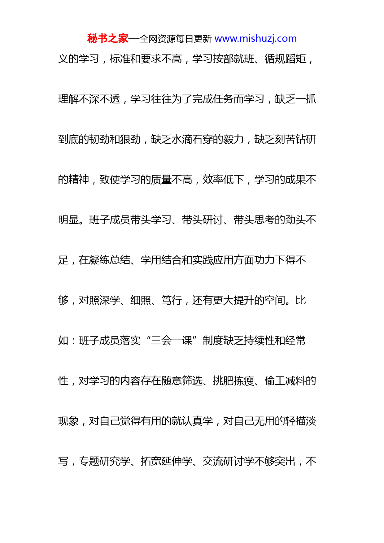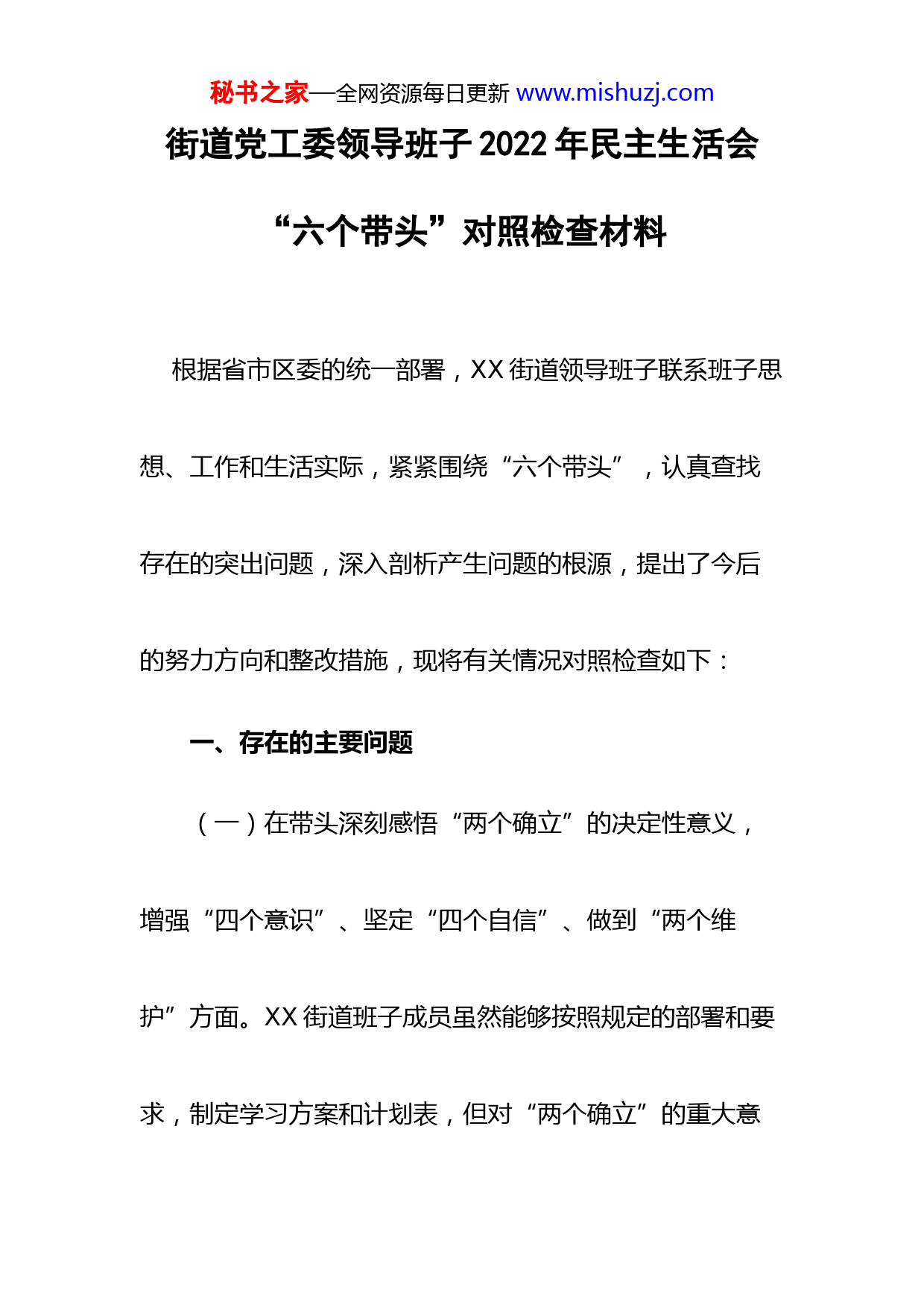 秘书之家—全网资源每日更新www.mishuzj.com街道党工委领导班子2022年民主生活会“六个带头”对照检查材料根据省市区委的统一部署,XX街道领导班子联系班子思想、工作和生活实际,紧紧围绕“六个带头”,认真查找存在的突出问题,深入剖析产生问题的根源,提出了今后的努力方向和整改措施,现将有关情况对照检查如下:一、存在的主要问题(一)在带头深刻感悟“两个确立”的决定性意义,增强“四个意识”、坚定“四个自信”、做到“两个维护”方面。XX街道班子成员虽然能够按照规定的部署和要求,制定学习方案和计划表,但对“两个确立”的重大意秘书之家—全网资源每日更新www.mishuzj.com义的学习,标准和要求不高,学习按部就班、循规蹈矩,理解不深不透,学习往往为了完成任务而学习,缺乏一抓到底的韧劲和狠劲,缺乏水滴石穿的毅力,缺乏刻苦钻研的精神,致使学习的质量不高,效率低下,学习的成果不明显。班子成员带头学习、带头研讨、带头思考的劲头不足,在凝练总结、学用结合和实践应用方面功力下得不够,对照深学、细照、笃行,还有更大提升的空间。比如:班子成员落实“三会一课”制度缺乏持续性和经常性,对学习的内容存在随意筛选、挑肥拣瘦、偷工减料的现象,对自己觉得有用的就认真学,对自己无用的轻描淡写,专题研究学、拓宽延伸学、交流研讨学不够突出,不秘书之家—全网资源每日更新www.mishuzj.com够深入。个别班子成员对“两个确立”、“四个意识”“四个自信”、“两个维护”等应知应会还掌握的不够,深入思考不全,规律把握不准,理解和感悟没有达到预期的效果,距离学懂、弄通、做实还有一定的差距。(二)在用习近平新时代中国特色社会主义思想凝心铸魂方面。一是思想认识有待于进一步提高。街道班子成员由于文化程度、阅历经验、思维禀赋的差异,对习近平新时代中国特色社会主义思想的精神实质,理解和感悟的层次、维度和境界不同,水平存在差异化。面对新常态新形势,如何践行习近平新时代中国特色社会主义思想,思想觉悟不高,精神境界不宽,感悟能量不强,没有上升到秘书之家—全网资源每日更新www.mishuzj.com灵魂觉醒、凝心铸魂、提升境界的功效。二是学习的质量有待于进一步提高。班子成员虽然能够积极参加街道组织的集中学习,按部就班地学习习近平新时代中国特色社会主义思想,对制定的材料、学习的篇目进行了通读,但学习的状态不佳、学习的劲头不足、学习的方法不活,学习的理论知识支离破碎,出现“断层”和“皱褶”,不能很好地运用习近平新时代中国特色社会主义思想指导疫情防控、综合治理、生态治理、民生保障、基层党建等工作,理论与实际的融合和贯通存在一定的差距。(三)在带头坚持和加强党的全面领导方面。虽然能够始终不渝地坚持和加强党的全面领导,但对新时期如何秘书之家—全网资源每日更新www.mishuzj.com全面从严治党、加强党风廉政建设和反腐败斗争,缺乏统筹的思路、奏效的办法、给力的措施。在面对一些涉及切身利益的难点问题,措施办法不实,跟进问效不足,专项整治不强。围绕履行党建工作责任制,虽然健全了一系列长效化机制,但运行过程中,出现制度落实脱离实际等问题,缺乏有效的监管制约手段,致使“四风”问题仍然有反弹回潮的的趋势。同时,XX班子存在管理松懈、参加组织生活不经常,“三会一课”不规范不严肃等问题,党员的先锋模范意识淡化,缺乏饱满的工作热情,一定程度上存在重经济轻党建、重眼前轻长远、重局部轻轻整体的问题。秘书之家—全网资源每日更新www.mishuzj.com(四)在带头坚持以人民为中心的发展思想方面。以人民为中心的发展思想在心底没有扎牢,“一切依靠群众,一切为了群众”的观念没有真正贯彻到街道各项工作中。在疫情防控、生态治理、民生保障、大气污染防治、基层社会治理工作中,班子成员想问题、办事情、做决策,习惯于呆在办公室闭门造车,遥控指挥。对上级的安排重视一些,忽视了对群众的关心,对新常态新形势下,如何及时掌握群众的所急所盼,努力破解群众关心的热点、难点和堵点问题,思考谋划少,与群众沟通交流少,有时还存在对待群众态度冷漠、喜欢打官腔,有种沾沾自喜的自豪感和荣耀感。不能真正沉下身子,察民情、解民秘书之家—全网资源每日更新www.mishuzj.com意、纾民怨,街道党员干部与群众的雨水关系没有真正建立起来。个别班子成员公仆意识逐渐淡化,服务群众的意识逐渐褪色,在健全为民服务机制、强化为民服务功能、夯实服务基础方面,缺乏行之有效的措施,办法不多,思路不活,措施不力,服务群众工作在一定程度上打了折扣缩了水。(五)在带头发扬斗争精神方面。街道班子成员,虽然能够带头发扬斗争精神,承担自己分管的职责任务,履行工作职责,但精神的传承力量不足,渐渐出现了飘移。面对复杂多变的形势,思想变得保守,做事谨慎小心,工作的思路不活、办法不多,喜欢按部就班地抓好各项工秘书之家—全网资源每日更新www.mishuzj.com作。风险意识和抗压意识减弱。面对一个又一个困难和挑战,缺乏从容的态度、沉着的心态,斗争的意志,特别是在处理和对待急难险重问题时,喜欢走捷径,躲一躲、拖一拖,退一退,缺乏勇于挑战、勇于创新、勇于担当的精神。比如:面对情况复杂、难度较大的征