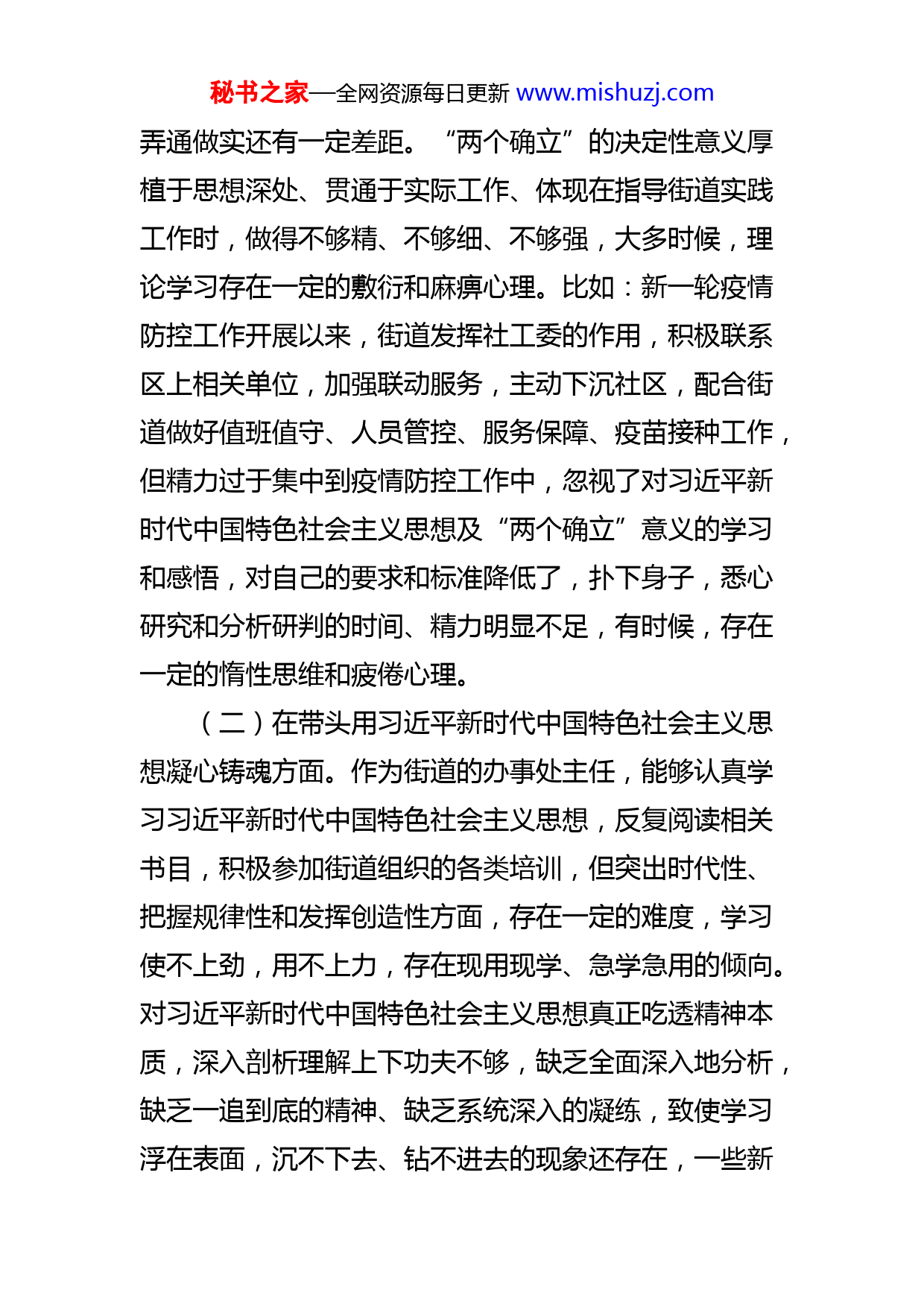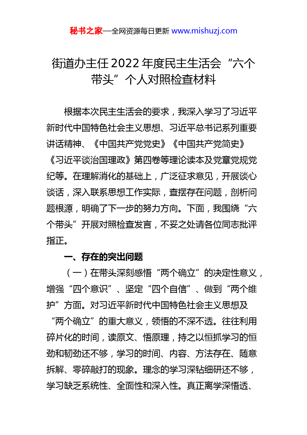 秘书之家—全网资源每日更新www.mishuzj.com街道办主任2022年度民主生活会“六个带头”个人对照检查材料根据本次民主生活会的要求,我深入学习了习近平新时代中国特色社会主义思想、习近平总书记系列重要讲话精神、《中国共产党党史》《中国共产党简史》《习近平谈治国理政》第四卷等理论读本及党章党规党纪等。在理解消化的基础上,广泛征求意见,开展谈心谈话,深入联系思想工作实际,查摆存在问题,剖析问题根源,明确了下一步的努力方向。下面,我围绕“六个带头”开展对照检查发言,不妥之处请各位同志批评指正。一、存在的突出问题(一)在带头深刻感悟“两个确立”的决定性意义,增强“四个意识”、坚定“四个自信”、做到“两个维护”方面。对习近平新时代中国特色社会主义思想及“两个确立”的重大意义,领悟的不深不透。往往利用碎片化的时间,读原文、悟原理,持之以恒抓学习的恒劲和韧劲还不够,学习的时间、内容、方法存在、随意拆解、零碎敲打的现象。理念的学习深钻细研还不够,学习缺乏系统性、全面性和深入性。真正离学深悟透、秘书之家—全网资源每日更新www.mishuzj.com弄通做实还有一定差距。“两个确立”的决定性意义厚植于思想深处、贯通于实际工作、体现在指导街道实践工作时,做得不够精、不够细、不够强,大多时候,理论学习存在一定的敷衍和麻痹心理。比如:新一轮疫情防控工作开展以来,街道发挥社工委的作用,积极联系区上相关单位,加强联动服务,主动下沉社区,配合街道做好值班值守、人员管控、服务保障、疫苗接种工作,但精力过于集中到疫情防控工作中,忽视了对习近平新时代中国特色社会主义思想及“两个确立”意义的学习和感悟,对自己的要求和标准降低了,扑下身子,悉心研究和分析研判的时间、精力明显不足,有时候,存在一定的惰性思维和疲倦心理。(二)在带头用习近平新时代中国特色社会主义思想凝心铸魂方面。作为街道的办事处主任,能够认真学习习近平新时代中国特色社会主义思想,反复阅读相关书目,积极参加街道组织的各类培训,但突出时代性、把握规律性和发挥创造性方面,存在一定的难度,学习使不上劲,用不上力,存在现用现学、急学急用的倾向。对习近平新时代中国特色社会主义思想真正吃透精神本质,深入剖析理解上下功夫不够,缺乏全面深入地分析,缺乏一追到底的精神、缺乏系统深入的凝练,致使学习浮在表面,沉不下去、钻不进去的现象还存在,一些新秘书之家—全网资源每日更新www.mishuzj.com政策和新理论的运用,不接地气,牵强附会,理论和实践的融合度不高,不能有效地转化为促进街道各项事业发展、破解群众急难愁盼问题动能,在提升境界、凝心铸魂方面还存在一定的薄弱环节。(三)在带头坚持和加强党的全面领导方面。虽然自己能够意识到带头坚持和加强党的全面领导的重要性,认真落实省市区委的各项决策部署,但通过对标对表、自我反省,深入查找,还存在一定的薄弱环节。在落实新时代党的组织路线方面,“三会一课”抓得不够实不够严,相关的台账资料不健全、不完善,整理归档不够规范严谨。党员大会、党支部会议,形式大于内容,以传达学习代替工作研究,突出政治学习和党性锻炼方面存在短板。支部标准化建设,缺乏未雨绸缪的统筹规划,执行操作时,局限于传达文件,参加支部学习和主题党日活动缺乏主动性和积极性,支部主题党日活动流于形式,一定程度上存在喊口号、打游击、装门面的现象。(四)在带头学习坚持以人民为中心的发展思想,推动改革发展稳定方面。随着年龄的增长、职务的提升,思想上逐渐产生了安逸的思想,“人民至上”的理念淡漠淡化,逐渐有了“船到码头车到站”的思想,对新常态下如何抓好街道的各项工作,切实为辖区居民办点实事,研究思考的少了,深入辖区群众了解群众疾苦少了,秘书之家—全网资源每日更新www.mishuzj.com致使居民群众急需要解决的问题,一拖再拖,甚至石沉大海。比如:在危房拆迁、棚户区改造工作中,从群众的角度和立场分析问题少了,服务群众缺乏统筹的谋划、长效的机制、有效的对策。想办法、做决策、办事情一味地听从上级领导的命令,忽略群众的感受,具体执行上,制定的措施方案,操作性和实用性不强,致使工作开展中与群众之间产生了种种误会和摩擦,导致工作局面迟迟打不开。(五)在带头发扬斗争精神方面。作为街道办事处主任,对街道全局的工作虽然熟稔于心,讲得头头是道,但工作的整体谋划不够科学合理,提前谋划、有效撬动、攻坚克难方面做得还不够到位,面对新的挑战和压力,缺乏风险意识和抗压意识,遇到难以摆布和解决的老大难问题,缺乏对上沟通,对下交流的意识,往往自以为是,不能虚心听取分管领导的意见建议,工作方法粗放、斗志精神弱化、创新意识不足。比如,在“我为群众办实事”实践活动中,统筹规划的思路不宽,服务的长效机制不全,服务的效力不强,破解瓶颈难题时,缺乏勇往直前的斗争精神,缺乏应对风险挑战和处理急难险重问题的能力,导致为民服务工作出现了纰漏和瑕疵。(六)在带头落实全面从严治党政治责任方面。自认为自己能够严格虽然能够严格遵守政治纪律,保持秘书之家—全网资源每日更新www.mishuzj.com“两袖清风,一身正气”。在工作、学习和生活中,能够守