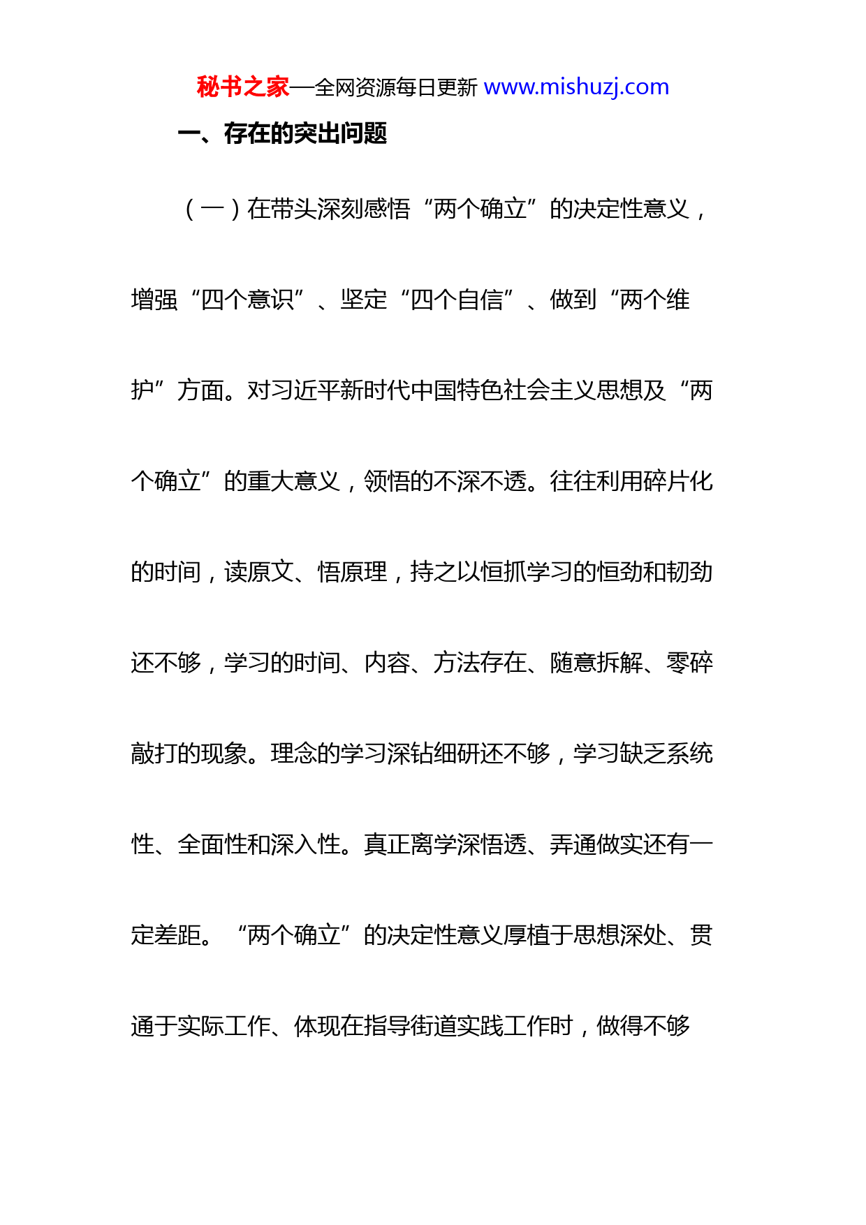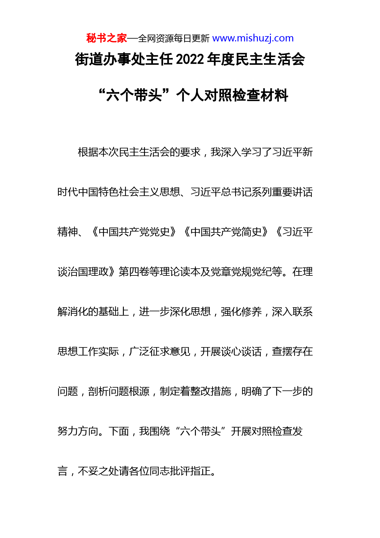 秘书之家—全网资源每日更新www.mishuzj.com街道办事处主任2022年度民主生活会“六个带头”个人对照检查材料根据本次民主生活会的要求,我深入学习了习近平新时代中国特色社会主义思想、习近平总书记系列重要讲话精神、《中国共产党党史》《中国共产党简史》《习近平谈治国理政》第四卷等理论读本及党章党规党纪等。在理解消化的基础上,进一步深化思想,强化修养,深入联系思想工作实际,广泛征求意见,开展谈心谈话,查摆存在问题,剖析问题根源,制定着整改措施,明确了下一步的努力方向。下面,我围绕“六个带头”开展对照检查发言,不妥之处请各位同志批评指正。秘书之家—全网资源每日更新www.mishuzj.com一、存在的突出问题(一)在带头深刻感悟“两个确立”的决定性意义,增强“四个意识”、坚定“四个自信”、做到“两个维护”方面。对习近平新时代中国特色社会主义思想及“两个确立”的重大意义,领悟的不深不透。往往利用碎片化的时间,读原文、悟原理,持之以恒抓学习的恒劲和韧劲还不够,学习的时间、内容、方法存在、随意拆解、零碎敲打的现象。理念的学习深钻细研还不够,学习缺乏系统性、全面性和深入性。真正离学深悟透、弄通做实还有一定差距。“两个确立”的决定性意义厚植于思想深处、贯通于实际工作、体现在指导街道实践工作时,做得不够秘书之家—全网资源每日更新www.mishuzj.com精、不够细、不够强,大多时候,理论学习存在一定的敷衍和麻痹心理。比如:新一轮疫情防控工作开展以来,街道发挥社工委的作用,积极联系区上相关单位,加强联动服务,主动下沉社区,配合街道做好值班值守、人员管控、服务保障、疫苗接种工作,但精力过于集中到疫情防控工作中,忽视了对习近平新时代中国特色社会主义思想及“两个确立”意义的学习和感悟,对自己的要求和标准降低了,扑下身子,悉心研究和分析研判的时间、精力明显不足,有时候,存在一定的惰性思维和疲倦心理。(二)在带头用习近平新时代中国特色社会主义思想凝心铸魂方面。作为街道的办事处主任,能够认真学习习秘书之家—全网资源每日更新www.mishuzj.com近平新时代中国特色社会主义思想,反复阅读相关书目,积极参加街道组织的各类培训,但突出时代性、把握规律性和发挥创造性方面,存在一定的难度,学习使不上劲,用不上力,存在现用现学、急学急用的倾向。对习近平新时代中国特色社会主义思想真正吃透精神本质,深入剖析理解上下功夫不够,缺乏全面深入地分析,缺乏一追到底的精神、缺乏系统深入的凝练,致使学习浮在表面,沉不下去、钻不进去的现象还存在,一些新政策和新理论的运用,不接地气,牵强附会,理论和实践的融合度不高,不能有效地转化为促进街道各项事业发展、破解群众急难愁秘书之家—全网资源每日更新www.mishuzj.com盼问题动能,在提升境界、凝心铸魂方面还存在一定的薄弱环节。(三)在带头坚持和加强党的全面领导方面。虽然自己能够意识到带头坚持和加强党的全面领导的重要性,认真落实省市区委的各项决策部署,但通过对标对表、自我反省,深入查找,还存在一定的薄弱环节。在落实新时代党的组织路线方面,“三会一课”抓得不够实不够严,相关的台账资料不健全、不完善,整理归档不够规范严谨。党员大会、党支部会议,形式大于内容,以传达学习代替工作研究,突出政治学习和党性锻炼方面存在短板。支部标准化建设,缺乏未雨绸缪的统筹规划,执行操作时,局秘书之家—全网资源每日更新www.mishuzj.com限于传达文件,参加支部学习和主题党日活动缺乏主动性和积极性,支部主题党日活动流于形式,一定程度上存在喊口号、打游击、装门面的现象。(四)在带头学习坚持以人民为中心的发展思想,推动改革发展稳定方面。随着年龄的增长、职务的提升,思想上逐渐产生了安逸的思想,“人民至上”的理念淡漠淡化,逐渐有了“船到码头车到站”的思想,对新常态下如何抓好街道的各项工作,切实为辖区居民办点实事,研究思考的少了,深入辖区群众了解群众疾苦少了,致使居民群众急需要解决的问题,一拖再拖,甚至石沉大海。比如:在危房拆迁、棚户区改造工作中,从群众的角度和立秘书之家—全网资源每日更新www.mishuzj.com场分析问题少了,服务群众缺乏统筹的谋划、长效的机制、有效的对策。想办法、做决策、办事情一味地听从上级领导的命令,忽略群众的感受,具体执行上,制定的措施方案,操作性和实用性不强,致使工作开展中与群众之间产生了种种误会和摩擦,导致工作局面迟迟打不开。(五)在带头发扬斗争精神方面。作为街道办事处主任,对街道全局的工作虽然熟稔于心,讲得头头是道,但工作的整体谋划不够科学合理,提前谋划、有效撬动、攻坚克难方面做得还不够到位,面对新的挑战和压力,缺乏风险意识和抗压意识,遇到难以摆布和解决的老大难问题,缺乏对上沟通,对下交流的意识,往往自以为是,不秘书之家—全网资源每日更新www.mishuzj.com能虚心听取分管领导的意见建议,工作方法粗放、斗志精神弱化、创新意识不足。比如,在“我为群众办实事”实践活动中,统筹规划的思路不宽,服务的长效机制不全,服务的效力不强,破解瓶颈难题时,缺乏勇往直前的斗争精神,缺乏应对风险挑战和处理急难险重问题的能力,导致为民服务工作出现