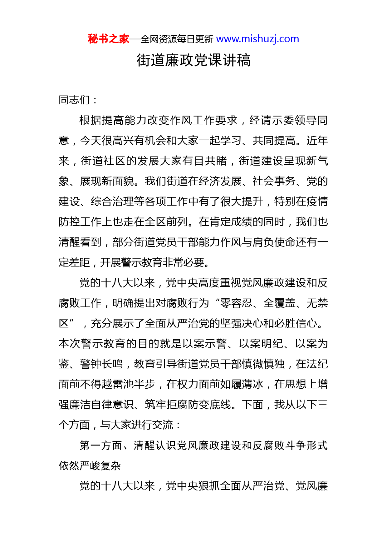 秘书之家—全网资源每日更新www.mishuzj.com街道廉政党课讲稿同志们:根据提高能力改变作风工作要求,经请示委领导同意,今天很高兴有机会和大家一起学习、共同提高。近年来,街道社区的发展大家有目共睹,街道建设呈现新气象、展现新面貌。我们街道在经济发展、社会事务、党的建设、综合治理等各项工作中有了很大提升,特别在疫情防控工作上也走在全区前列。在肯定成绩的同时,我们也清醒看到,部分街道党员干部能力作风与肩负使命还有一定差距,开展警示教育非常必要。党的十八大以来,党中央高度重视党风廉政建设和反腐败工作,明确提出对腐败行为“零容忍、全覆盖、无禁区”,充分展示了全面从严治党的坚强决心和必胜信心。本次警示教育的目的就是以案示警、以案明纪、以案为鉴、警钟长鸣,教育引导街道党员干部慎微慎独,在法纪面前不得越雷池半步,在权力面前如履薄冰,在思想上增强廉洁自律意识、筑牢拒腐防变底线。下面,我从以下三个方面,与大家进行交流:第一方面、清醒认识党风廉政建设和反腐败斗争形式依然严峻复杂党的十八大以来,党中央狠抓全面从严治党、党风廉秘书之家—全网资源每日更新www.mishuzj.com政建设和反腐败工作,始终保持力度不减、决心不改。全面从严治党取得新的战略性成果,反腐败斗争压倒性胜利不断巩固拓展。近几年,大家在新闻媒体上能看到很多反腐败的成果,上致中央领导、省部级干部、厅级干部下至科级干部都纷纷落马,我们区从每年处理党员几个人到现在每年处理上百人,据统计,自2019年至今,区纪委监委共批评教育帮助和处理街道干部×人,这些数据充分表明,我们所说的不论什么人,不论其职务大小,只要触犯了党纪国法,都要受到严肃追究和严厉惩处,决不是一句空话。习近平总书记在十九届中央纪委六次全会上强调指出,“全面从严治党首先要从政治上看,不断提高政治判断力、政治领悟力、政治执行力”。我们必须深刻认识和把握全面从严治党的政治要求,助推新时代街道社区工作高质量发展。一要坚定党风廉政建设和反腐败斗争信念。党的十八大以来,以习近平同志为核心的党中央始终坚持“老虎苍蝇”一起打,坚决将反腐败斗争坚持到底。习近平总书记曾多次强调“党风廉政建设永远在路上,反腐败斗争永远在路上”,党的十九大提出的“反腐败斗争压倒性态势已经形成并巩固发展”,从党中央对反腐败斗争形势的分析和研判,我们可以看出全面从严治党取得了重大成就,但秘书之家—全网资源每日更新www.mishuzj.com反腐败斗争形式在这一历史阶段仍然严峻复杂。中国共产党走过了百年历史,管党治党工作始终作为重要工作来抓,在党的建设方面取得了举世瞩目的成就,反腐倡廉深得民心,特别是十八大以后,始终保持反腐败斗争高压态势,政治生态不断好转,人民满意度不断提高。反腐败斗争胜利成果的取得来之不易,需要全体党员干部共同保持和呵护。二要清醒认识党风廉政建设和反腐败斗争严峻形势。十九届中央纪委六次全会上提出“尽管党风廉政建设和反腐败斗争取得了历史性成就,但形势依然严峻复杂。”现阶段我们还必须清醒认识到,腐败问题的严峻性、顽固性、隐蔽性、长期性。党的执政靠人来完成,人生观、价值观、世界观的弱化和缺失会直接或间接导致腐败问题的发生。政治问题和经济问题交织、传统腐败和新型腐败交织、腐败问题和不正之风交织的一系列案件警示我们,腐蚀和反腐蚀斗争仍然长期存在。当前取得的压倒性胜利并不是彻底胜利,全面从严治党永远在路上。腐败仍然是党面临的最大风险、最大威胁、最大挑战,腐败问题随着反腐败斗争工作的开展,不断隐形变异,发现和查处的难度不断加大,尤其是面对政治问题和经济问题交织,风险挑战和腐败问题关联,传统领域腐败和新兴领域腐败叠加,党员干部时刻面临被“围猎”、被腐蚀的风险。秘书之家—全网资源每日更新www.mishuzj.com三要深刻领会开展基层党风廉政建设的重要意义。加强基层党风廉政建设是贯彻习近平总书记重要讲话、重要指示批示精神以及党中央和省市区委决策部署的现实需要。目前综合整治三年行动、优化营商环境专项治理、煤矿领域“打非治违”等重点工作作为检验干部能力作风建设的“练兵场”和“主战场”,对于促进基层党员干部改进工作作风、提高执行政策的意识和能力,增强基层党组织的创造力、凝聚力和战斗力,推动基层经济又好又快的发展,具有十分重要的意义。街道干部作为联系党和群众的纽带,是基层组织的中坚力量,是党和府政的‘代言人’,更要不断提高对党风廉政建设重要性的认识,把党风廉政放在心上,把廉洁从政体现在行动上,做遵规守矩、遵纪守法的表率。第二方面、以案为鉴,深刻吸取基层违纪违法案件惨痛教训近年来,纪检监察机关不断加大整治群众身边腐败问题力度,一些基层的“害群之马”纷纷被揪了出来,受到党纪国法的严惩,在这里我给大家介绍几个街道发生的案例,希望大家吸取教训、引以为戒。案例1:2020年8月,我区某街道工作人员蒋某在征兵期间向应征对象家长索要1.5万元,有索贿的行为,属于受贿罪中的承诺行为,未达成受贿的结果,不构成受贿秘书之家—全网资源每日更新www.mishuzj.com罪,但构成违纪。2020年10月,蒋某受到党内警告