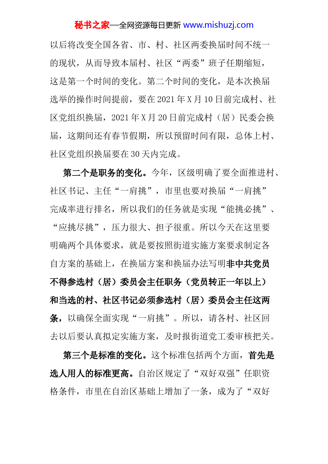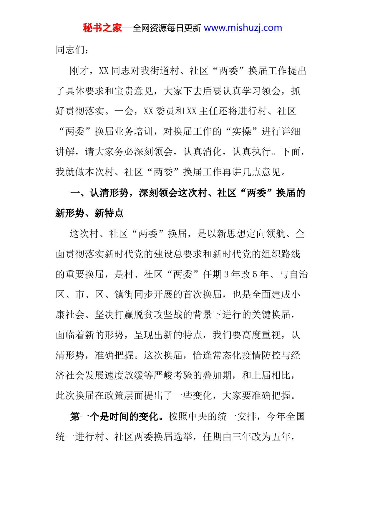 秘书之家—全网资源每日更新www.mishuzj.com同志们:刚才,XX同志对我街道村、社区“两委”换届工作提出了具体要求和宝贵意见,大家下去后要认真学习领会,抓好贯彻落实。一会,XX委员和XX主任还将进行村、社区“两委”换届业务培训,对换届工作的“实操”进行详细讲解,请大家务必深刻领会,认真消化,认真执行。下面,我就做本次村、社区“两委”换届工作再讲几点意见。一、认清形势,深刻领会这次村、社区“两委”换届的新形势、新特点这次村、社区“两委”换届,是以新思想定向领航、全面贯彻落实新时代党的建设总要求和新时代党的组织路线的重要换届,是村、社区“两委”任期3年改5年、与自治区、市、区、镇街同步开展的首次换届,也是全面建成小康社会、坚决打赢脱贫攻坚战的背景下进行的关键换届,面临着新的形势,呈现出新的特点,我们要高度重视,认清形势,准确把握。这次换届,恰逢常态化疫情防控与经济社会发展速度放缓等严峻考验的叠加期,和上届相比,此次换届在政策层面提出了一些变化,大家要准确把握。第一个是时间的变化。按照中央的统一安排,今年全国统一进行村、社区两委换届选举,任期由三年改为五年,秘书之家—全网资源每日更新www.mishuzj.com以后将改变全国各省、市、村、社区两委换届时间不统一的现状,从而导致本届村、社区“两委”班子任期缩短,这是第一个时间的变化。第二个时间的变化,是本次换届选举的操作时间提前,要在2021年X月10日前完成村、社区党组织换届,2021年X月20日前完成村(居)民委会换届,这期间还有春节假期,所以预留时间有限,总体上村、社区党组织换届要在30天内完成。第二个是职务的变化。今年,区级明确了要全面推进村、社区书记、主任“一肩挑”,市里也要对换届“一肩挑”完成率进行排名,所以我们的任务就是实现“能挑必挑”、“应挑尽挑”,压力很大、担子很重。所以今天在这里要明确两个具体要求,就是要按照街道实施方案要求制定各自方案的基础上,在换届方案和换届办法写明非中共党员不得参选村(居)委员会主任职务(党员转正一年以上)和当选的村、社区书记必须参选村(居)委员会主任这两条,以确保全面实现“一肩挑”。所以,请各村、社区回去以后要认真拟定实施方案,及时报街道党工委审核把关。第三个是标准的变化。这个标准包括两个方面,首先是选人用人的标准更高。自治区规定了“双好双强”任职资格条件,市里在自治区基础上增加了一条,成为了“双好秘书之家—全网资源每日更新www.mishuzj.com双强”和“十七个不能”标准,指向非常明确,规定非常具体。同时上三级方案规定了新选入村、社区党组织书记要在55周岁以下,具有大专以上学历。除村、社区党组织书记外,年龄超过60周岁的其他两位成员一般不在留任。再有就是“两委”班子中至少要有1名35周岁以下年轻干部,并且要实行亲属回避制度。其次是操作程序步骤标准更高。自治区印发的《换届指导手册》就是本次换届选举在操作层面上的具体遵循,书中按照换届程序步骤、操作顺序提供了X个制式模板,这就意味着本次换届将要有X个步骤需要完成,程序多、任务重。所以,接下来的工作中,大家要强化“首战即决战”的意识和“首战必首胜”的担当,对照标准、遵循步骤、保质保量的完成换届选举工作,切实把风险矛盾提前化解到位、人选精准选配到位、程序要求落实到位、换届纪律执行到位,不要“百虑输一忘”,耽误了换届进度,影响了工作效率,拉低了街道排名。二、认真抓好村、社区“两委”换届工作这次换届节奏非常紧凑,具体怎么抓、怎么操作,街道制定的方案说的很详细,在这里我再强调几个重点。一是要做好前期准备工作。本次换届,街道成立了领导小组、下派了指导小组,设置了综合协调、信访舆情、正风肃纪秘书之家—全网资源每日更新www.mishuzj.com等机构,各村、社区也要成立相应机构,街道各包片领导和各村、社区班子成员要全面开展一次调查摸底,建立选情台账,要做到“心中有数”。即:对基本情况和党员思想状况要心中有数;对后备人选情况要心中有数;对可能影响换届的不利因素要心中有数;对容易出问题的村、社区和应对办法要心中有数;对维稳形势复杂、集中整治重点村、社区要心中有数。二是要树立选人导向。任期从3年到5年,不是单纯的数字变化,而是对干部素质、基层治理、党的领导提出了更高要求。这次村、社区党组织换届最重要的任务就是选优配强党组织班子,一个重要的前提,就是要对党组织成员人选条件确定一个高标准,明确选什么样的人、不选什么样的人,并在换届工作中严格执行到位。根据上级要求,这次换届提出了村、社区党组织成员人选的基本条件,“双好双强”、“十七不能”等要求,都是硬性指标。各村、社区可在坚持上述条件的基础上,根据有关法律法规和章程条例,结合实际进一步细化人选条件,将“选什么样的人”这把标尺立起来,大力引导退伍军人、外出务工经商返乡人员、农村致富带头人进“班子”,倡导“能人”回村竞选干部,积极发动“经济能人”“社会达人”回乡“治村”。三是要优化班子结构。要抓住村、社区“两委”换届的有利契机,采取切实有效措施,进一秘书之家—全网资源每日更新www.mishuzj.com步优化班子整体结构。这次