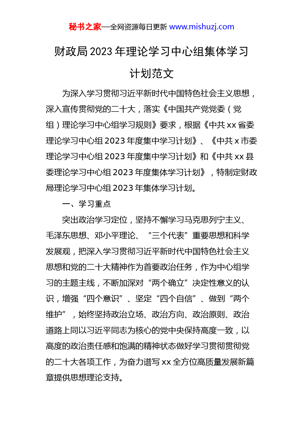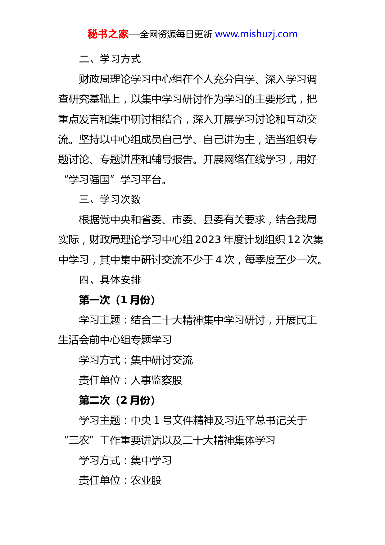 秘书之家—全网资源每日更新www.mishuzj.com财政局2023年理论学习中心组集体学习计划范文为深入学习贯彻习近平新时代中国特色社会主义思想,深入宣传贯彻党的二十大,落实《中国共产党党委(党组)理论学习中心组学习规则》要求,根据《中共xx省委理论学习中心组2023年度集中学习计划》、《中共x市委理论学习中心组2023年度集中学习计划》和《中共xx县委理论学习中心组2023年度集体学习计划》,特制定财政局理论学习中心组2023年集体学习计划。一、学习重点突出政治学习定位,坚持不懈学习马克思列宁主义、毛泽东思想、邓小平理论、“三个代表”重要思想和科学发展观,把深入学习贯彻习近平新时代中国特色社会主义思想和党的二十大精神作为首要政治任务,作为中心组学习的主题主线,不断加深对“两个确立”决定性意义的认识,增强“四个意识”、坚定“四个自信”、做到“两个维护”,始终坚持政治立场、政治方向、政治原则、政治道路上同以习近平同志为核心的党中央保持高度一致,以高度的政治责任感和饱满的精神状态做好学习贯彻贯彻党的二十大各项工作,为奋力谱写xx全方位高质量发展新篇章提供思想理论支持。秘书之家—全网资源每日更新www.mishuzj.com二、学习方式财政局理论学习中心组在个人充分自学、深入学习调查研究基础上,以集中学习研讨作为学习的主要形式,把重点发言和集中研讨相结合,深入开展学习讨论和互动交流。坚持以中心组成员自己学、自己讲为主,适当组织专题讨论、专题讲座和辅导报告。开展网络在线学习,用好“学习强国”学习平台。三、学习次数根据党中央和省委、市委、县委有关要求,结合我局实际,财政局理论学习中心组2023年度计划组织12次集中学习,其中集中研讨交流不少于4次,每季度至少一次。四、具体安排第一次(1月份)学习主题:结合二十大精神集中学习研讨,开展民主生活会前中心组专题学习学习方式:集中研讨交流责任单位:人事监察股第二次(2月份)学习主题:中央1号文件精神及习近平总书记关于“三农”工作重要讲话以及二十大精神集体学习学习方式:集中学习责任单位:农业股秘书之家—全网资源每日更新www.mishuzj.com第三次(3月份)学习主题:全国“两会”精神学习学习方式:集中学习责任单位:人事监察股第四次(4月份)学习主题:结合二十大精神,学习习近平总书记关于安全生产、消防和防灾减灾的重要论述、重要指示和批示精神及《安全生产法》学习方式:集中学习责任单位:经济建设股第五次(5月份)学习主题:结合二十大精神,习近平总书记关于加强和改进新时代统一战线工作的重要思想及《xx省实施<中国共产党统一战线工作条例>办法》学习方式:集中学习责任单位:行政政法股第六次(6月份)学习主题:结合《习近平谈治国理政》第一、二、三卷,深入学习《习近平谈治国理政》第四卷学习方式:集中学习研讨责任单位:办公室第七次(7月份)秘书之家—全网资源每日更新www.mishuzj.com学习主题:结合二十大精神,学习省xx届x次全会精神学习方式:集中研讨交流责任单位:人事监察股第八次(8月份)学习主题:结合二十大精神,学习贯彻全国宗教工作会议精神,引导宗教与社会主义社会相适应学习方式:集中学习责任单位:行政政法股第九次(宣教月期间)学习主题:学习二十大关于全面从严治党要求,开展党规党纪、监察法规学习和警示教育学习方式:观察视频资料、集中研讨交流责任单位:人事监察股第十次(10月份)学习主题:习近平法治思想学习方式:专题辅导主讲人:高校教授责任单位:人事监察股第十一次(11月份)学习主题:巩固脱贫攻坚成果与乡村振兴有效衔接学习方式:集中学习秘书之家—全网资源每日更新www.mishuzj.com责任单位:农业股第十二次(12月份)学习主题:党的二十大精神学习总结学习方式:宣讲报告会、集中研讨交流责任单位:人事监察股以上安排,可根据上级有关要求和我局工作实际情况作适当调整。五、学习要求1、严格学习制度。局党组要进一步完善中心组理论学习制度,进一步落实“三会一课”、主题党日活动等制度,着力规范学习行为、优化学习风气、提升学习质量。局机关、中心组学习每月至少一次,全年学习不少于12次,其中集中研讨交流不少于4次,每季度至少一次。2、丰富学习形式。要把集中学习、交流研讨作为局党组学习的主要形式,将个人自学思考与集体学习研讨相结合、把常规学习与在线学习相结合,努力做到全面学习。结合财政工作实际与需要,适当组织读书会、专家讲座、辅导报告等形式多样的学习活动,切实提升学习质效。3、理论联系实际。要切实认识理论与实践关系的重要性,坚持知行合一、学以致用,推动学习成果转化,真正把学习成果转化研究解决财政工作中突出问题的良剂,转秘书之家—全网资源每日更新www.mishuzj.com化为形成指导工作的思路和良策,为推动财政事业发展起到强大推动作用。