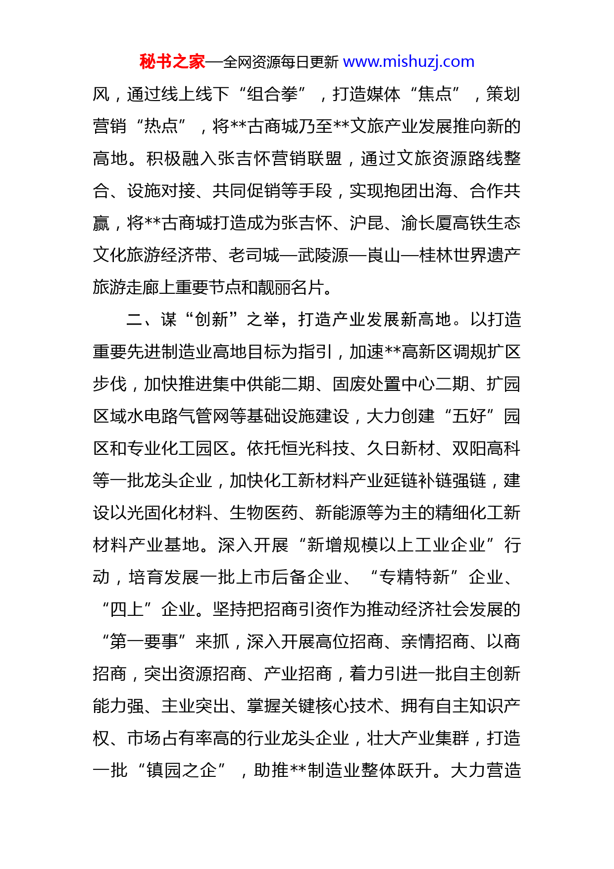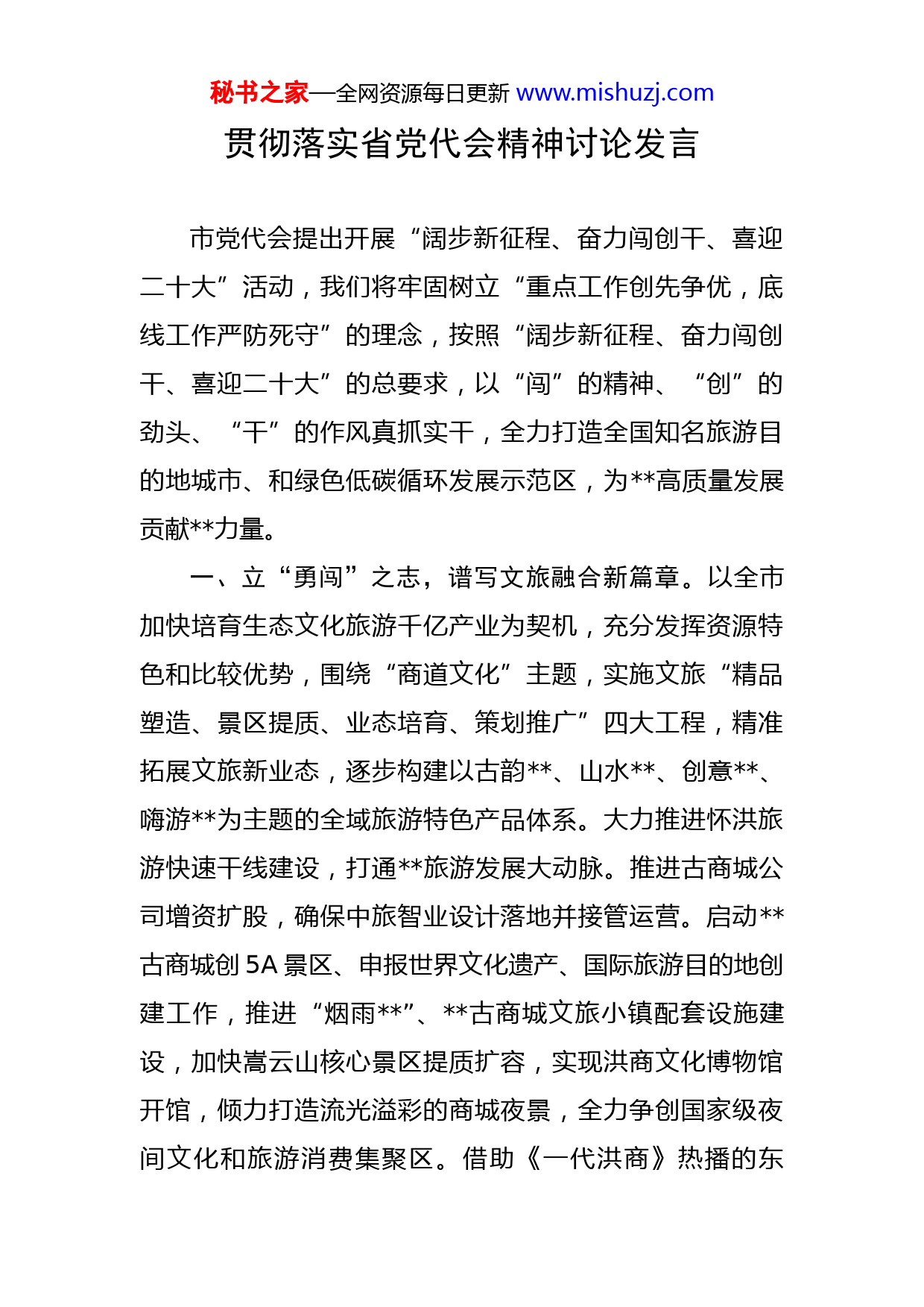 秘书之家—全网资源每日更新www.mishuzj.com贯彻落实省党代会精神讨论发言市党代会提出开展“阔步新征程、奋力闯创干、喜迎二十大”活动,我们将牢固树立“重点工作创先争优,底线工作严防死守”的理念,按照“阔步新征程、奋力闯创干、喜迎二十大”的总要求,以“闯”的精神、“创”的劲头、“干”的作风真抓实干,全力打造全国知名旅游目的地城市、和绿色低碳循环发展示范区,为高质量发展贡献力量。一、立“勇闯”之志,谱写文旅融合新篇章。以全市加快培育生态文化旅游千亿产业为契机,充分发挥资源特色和比较优势,围绕“商道文化”主题,实施文旅“精品塑造、景区提质、业态培育、策划推广”四大工程,精准拓展文旅新业态,逐步构建以古韵、山水、创意、嗨游为主题的全域旅游特色产品体系。大力推进怀洪旅游快速干线建设,打通旅游发展大动脉。推进古商城公司增资扩股,确保中旅智业设计落地并接管运营。启动古商城创5A景区、申报世界文化遗产、国际旅游目的地创建工作,推进“烟雨”、古商城文旅小镇配套设施建设,加快嵩云山核心景区提质扩容,实现洪商文化博物馆开馆,倾力打造流光溢彩的商城夜景,全力争创国家级夜间文化和旅游消费集聚区。借助《一代洪商》热播的东秘书之家—全网资源每日更新www.mishuzj.com风,通过线上线下“组合拳”,打造媒体“焦点”,策划营销“热点”,将古商城乃至文旅产业发展推向新的高地。积极融入张吉怀营销联盟,通过文旅资源路线整合、设施对接、共同促销等手段,实现抱团出海、合作共赢,将古商城打造成为张吉怀、沪昆、渝长厦高铁生态文化旅游经济带、老司城—武陵源—崀山—桂林世界遗产旅游走廊上重要节点和靓丽名片。二、谋“创新”之举,打造产业发展新高地。以打造重要先进制造业高地目标为指引,加速高新区调规扩区步伐,加快推进集中供能二期、固废处置中心二期、扩园区域水电路气管网等基础设施建设,大力创建“五好”园区和专业化工园区。依托恒光科技、久日新材、双阳高科等一批龙头企业,加快化工新材料产业延链补链强链,建设以光固化材料、生物医药、新能源等为主的精细化工新材料产业基地。深入开展“新增规模以上工业企业”行动,培育发展一批上市后备企业、“专精特新”企业、“四上”企业。坚持把招商引资作为推动经济社会发展的“第一要事”来抓,深入开展高位招商、亲情招商、以商招商,突出资源招商、产业招商,着力引进一批自主创新能力强、主业突出、掌握关键核心技术、拥有自主知识产权、市场占有率高的行业龙头企业,壮大产业集群,打造一批“镇园之企”,助推制造业整体跃升。大力营造秘书之家—全网资源每日更新www.mishuzj.com“重商、亲商、安商、扶商”理念,进一步做实做细“一件事一次办”“三集中三到位”等改革,更好激发和保护市场主体活力,让一流的营造环境成为区的“金字招牌”和靓丽名片。三、兴“实干”之风,绘就乡村振兴新画卷。持续巩固拓展脱贫攻坚成果,坚决防止发生规模性返贫。坚决遏制耕地“非农化”、防止“非粮化”,持续推进高标准农田建设,牢牢守住1.4万亩耕地红线。大力推进精细化种植、养殖业发展,做好“一竹一鸡”文章,创建特色农业产业园、农村产业融合发展示范园和农业科技园区,打造优质农副产品及绿色食品供应基地,推动一二三产业融合发展。落实落细各类农民工稳岗就业政策,不断拓宽就业渠道,让广大农民的口袋鼓起来、富起来。扎实开展乡村建设行动,进一步推动水、电、路、气、讯、广电、物流等公共基础设施和基本公共服务向村覆盖、向户延伸。在斩获2022年第一季度全市农村人居环境整治提升“打擂台”红旗单位的基础上,进一步抓紧抓实抓好农村人居环境整治提升行动,高水平打造一批村容村貌美、服务设施美、生态环境美、富民产业美、社会和谐美的“五美”村庄,奋力打造新时代乡村振兴的“样板”。