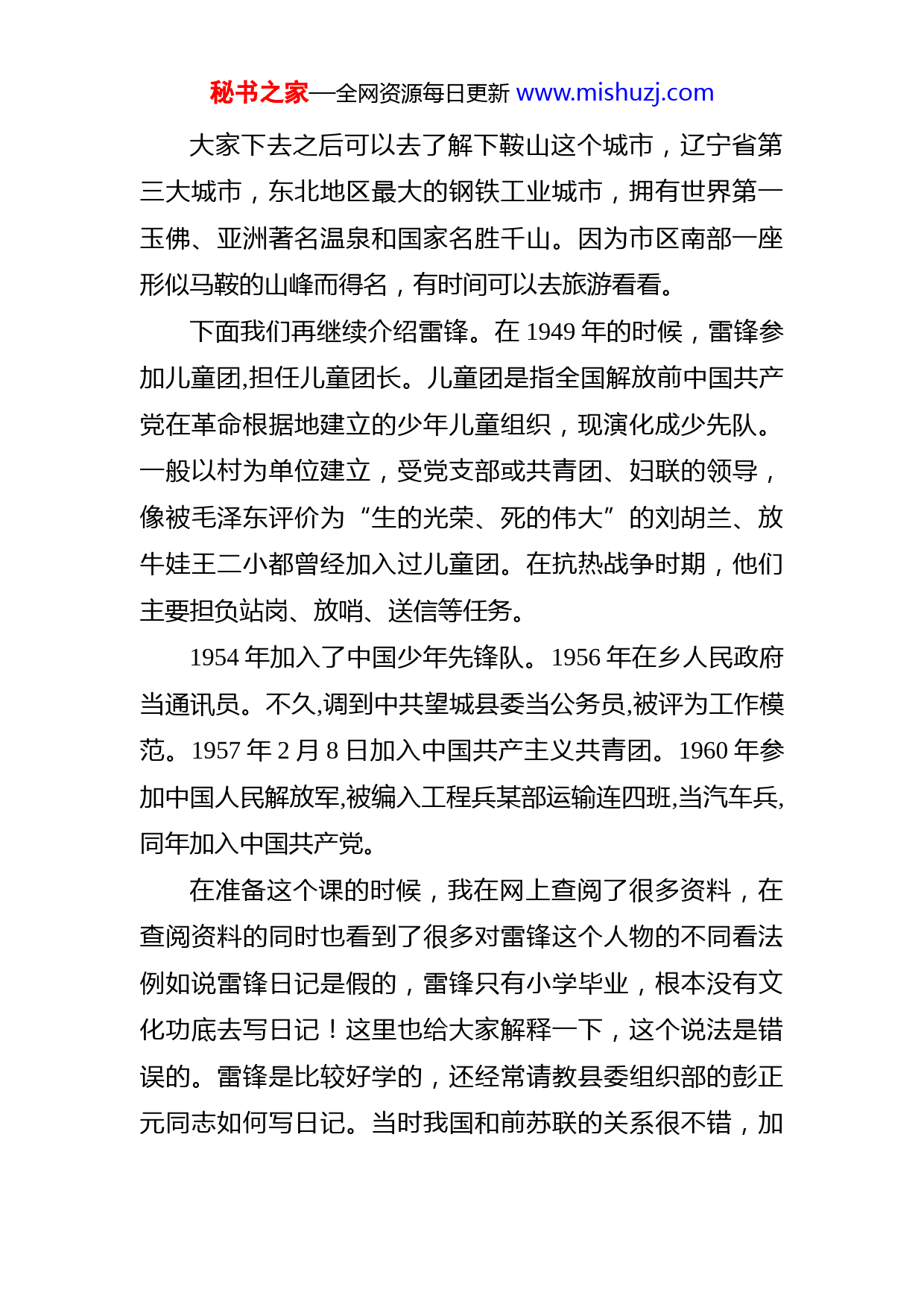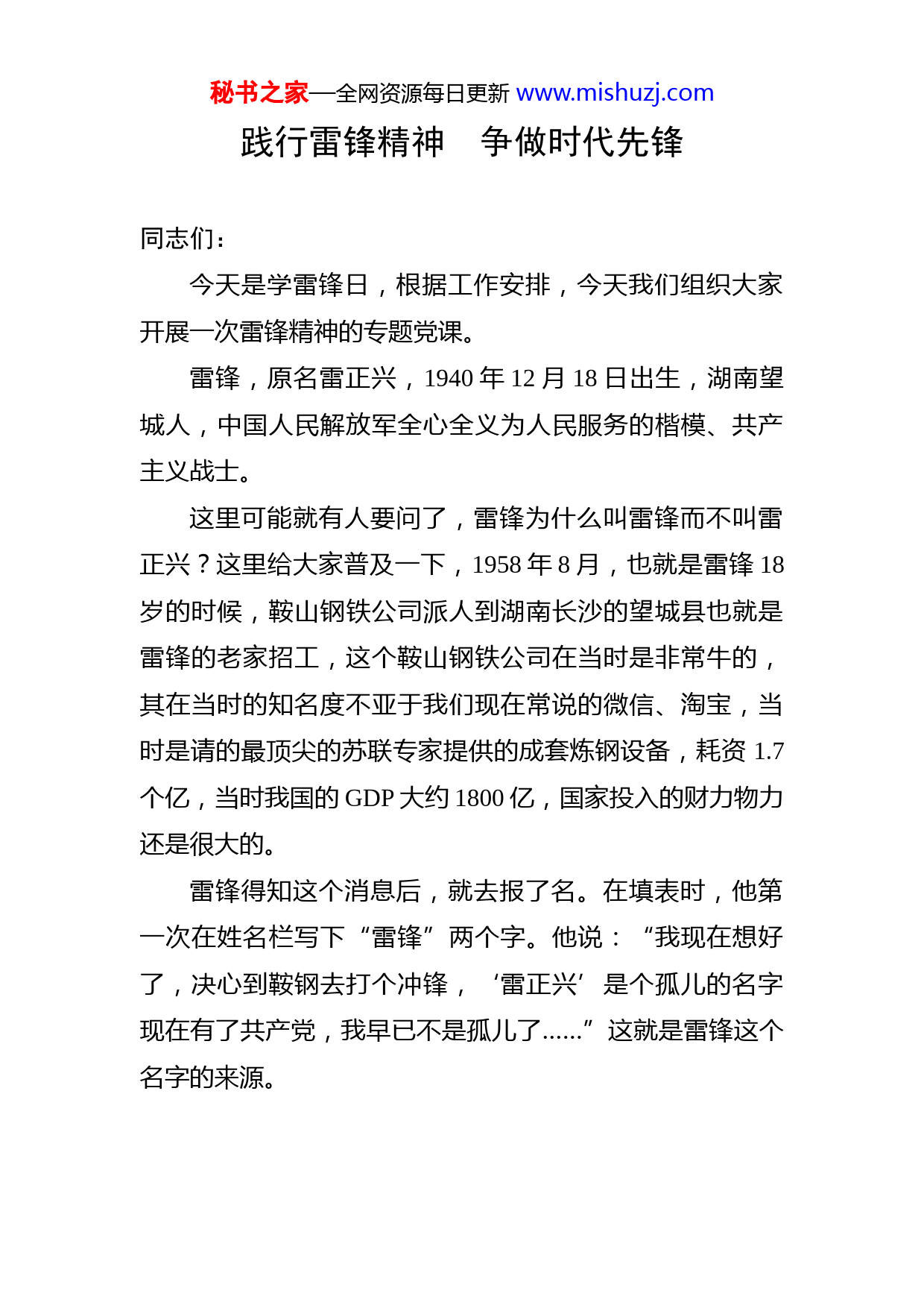 秘书之家—全网资源每日更新www.mishuzj.com践行雷锋精神争做时代先锋同志们:今天是学雷锋日,根据工作安排,今天我们组织大家开展一次雷锋精神的专题党课。雷锋,原名雷正兴,1940年12月18日出生,湖南望城人,中国人民解放军全心全义为人民服务的楷模、共产主义战士。这里可能就有人要问了,雷锋为什么叫雷锋而不叫雷正兴?这里给大家普及一下,1958年8月,也就是雷锋18岁的时候,鞍山钢铁公司派人到湖南长沙的望城县也就是雷锋的老家招工,这个鞍山钢铁公司在当时是非常牛的,其在当时的知名度不亚于我们现在常说的微信、淘宝,当时是请的最顶尖的苏联专家提供的成套炼钢设备,耗资1.7个亿,当时我国的GDP大约1800亿,国家投入的财力物力还是很大的。雷锋得知这个消息后,就去报了名。在填表时,他第一次在姓名栏写下“雷锋”两个字。他说:“我现在想好了,决心到鞍钢去打个冲锋,‘雷正兴’是个孤儿的名字现在有了共产党,我早已不是孤儿了……”这就是雷锋这个名字的来源。秘书之家—全网资源每日更新www.mishuzj.com大家下去之后可以去了解下鞍山这个城市,辽宁省第三大城市,东北地区最大的钢铁工业城市,拥有世界第一玉佛、亚洲著名温泉和国家名胜千山。因为市区南部一座形似马鞍的山峰而得名,有时间可以去旅游看看。下面我们再继续介绍雷锋。在1949年的时候,雷锋参加儿童团,担任儿童团长。儿童团是指全国解放前中国共产党在革命根据地建立的少年儿童组织,现演化成少先队。一般以村为单位建立,受党支部或共青团、妇联的领导,像被毛泽东评价为“生的光荣、死的伟大”的刘胡兰、放牛娃王二小都曾经加入过儿童团。在抗热战争时期,他们主要担负站岗、放哨、送信等任务。1954年加入了中国少年先锋队。1956年在乡人民政府当通讯员。不久,调到中共望城县委当公务员,被评为工作模范。1957年2月8日加入中国共产主义共青团。1960年参加中国人民解放军,被编入工程兵某部运输连四班,当汽车兵,同年加入中国共产党。在准备这个课的时候,我在网上查阅了很多资料,在查阅资料的同时也看到了很多对雷锋这个人物的不同看法例如说雷锋日记是假的,雷锋只有小学毕业,根本没有文化功底去写日记!这里也给大家解释一下,这个说法是错误的。雷锋是比较好学的,还经常请教县委组织部的彭正元同志如何写日记。当时我国和前苏联的关系很不错,加秘书之家—全网资源每日更新www.mishuzj.com上前苏联各方面都比我们先进,中国从上到下都是学习前苏联,包括文学方面也是一样的,前苏联的文学著作在中国也是特别受欢迎的,像《钢铁是怎样炼成的》就是雷锋特别喜欢的一本书,《雷锋日记》里的语言风格与《钢铁》这本书中保尔的语言风格就有许多相似之处。所以说《雷锋日记》的真伪还是一目了然的。现在网上也是经常有一些负面炒作诋毁我们的革命先烈,大家多多少少应该都听到过一些:比如董存瑞炸碉堡是被连长骗去的呀,还有邱少云被火烧的故事违背生理学还有毕福剑在饭桌上唱评《智取威虎山》诋毁毛主席等等为什么会出现这种现象?一方面是商家炒作,迎合某些人的阴暗心理,赚取点击率,另一方面就是一些反对势力的恶意诋毁,黑化我们的革命先烈,企图颠覆我们的国家,所以说大家平时浏览网页的时候要学会区分新闻的真假,不要盲目相信。下面我们继续说雷锋,在入伍不到三年的时间里,雷锋荣立二等功一次、三等功两次,被评为节约标兵,荣获模范共青团员称号,出席过沈阳部队共青团代表会议,可以说是荣光无限。1961年升为班长,被选为抚顺市人民代表。1962年8月15日因公殉职,死于车祸意外,有兴趣的可以在网上听听雷锋的战友乔安山的讲述。1963年1月7日国防部命名他生前所在的班为“雷锋班”。同年3月5日毛泽东亲笔题词“向雷锋同志学习”。秘书之家—全网资源每日更新www.mishuzj.com这就是为什么是三月学雷锋,而不是其他的月份学雷锋,大家可以了记一下。周恩来题词“向雷锋同志学习:爱憎分明的阶级立场,言行一致的革命精神,公而忘私的共产主义风格,奋不顾身的无产阶级斗志”。朱德题词“学习雷锋,做毛主席的好战士”。全国上下都掀起了一股学雷锋的热潮。一、雷锋精神内涵以上是雷锋的生平事迹,下面我们来讲将雷锋精神的内涵,雷锋精神主要包括4个人方面的内涵:(一)全心全意为人民服务。“全心全意为人民服务”是贯穿雷锋精神的主线,雷锋在他的一生中自觉地实践了全心全意为人民服务的思想。他说:“自己是一个共产党员,共产党员的全部任务就是全心全意为人民服务。”(1961年4月23日日记)“人的生命是有限的,可是,为人民服务是无限的,我要把有限的生命,投入到无限的为人民服务’之中去。”(1961年10月20日日记)(二)“钉子”精神。雷锋对待工作总是干一行、爱一行、钻一行,立足本职,尽职尽责,努力以钉子的“挤”劲和“钻”劲,使自己成为工作的内行。“钉子”精神和我们现在说的工匠精神类似。有没有人知道工匠精神的来源?2016年3月5日,李克强总理作政府工作报告时首次正式提出“工匠精神”,“工匠精神”第一次被写入政府工作报告,入选2016年十大流行语。秘书之家—全网资源每日更新www.mishuzj.com(三)“螺丝钉”精神。雷锋谦虚待人,甘于平凡,从点滴做起,从小事做起,服从革命的需要和