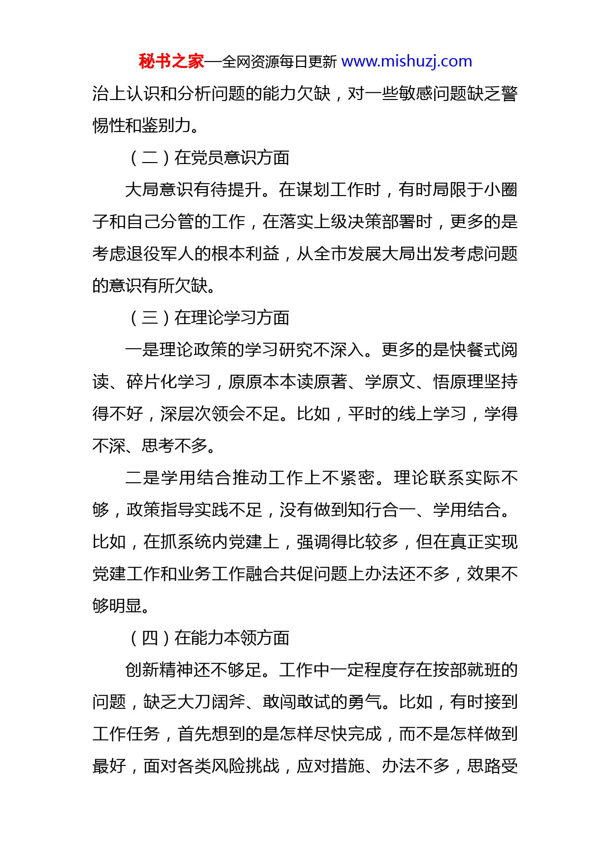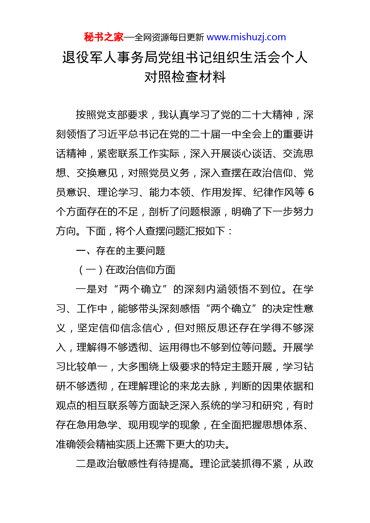 秘书之家—全网资源每日更新www.mishuzj.com退役军人事务局党组书记组织生活会个人对照检查材料按照党支部要求,我认真学习了党的二十大精神,深刻领悟了习近平总书记在党的二十届一中全会上的重要讲话精神,紧密联系工作实际,深入开展谈心谈话、交流思想、交换意见,对照党员义务,深入查摆在政治信仰、党员意识、理论学习、能力本领、作用发挥、纪律作风等6个方面存在的不足,剖析了问题根源,明确了下一步努力方向。下面,将个人查摆问题汇报如下:一、存在的主要问题(一)在政治信仰方面一是对“两个确立”的深刻内涵领悟不到位。在学习、工作中,能够带头深刻感悟“两个确立”的决定性意义,坚定信仰信念信心,但对照反思还存在学得不够深入,理解得不够透彻、运用得也不够到位等问题。开展学习比较单一,大多围绕上级要求的特定主题开展,学习钻研不够透彻,在理解理论的来龙去脉,判断的因果依据和观点的相互联系等方面缺乏深入系统的学习和研究,有时存在急用急学、现用现学的现象,在全面把握思想体系、准确领会精袖实质上还需下更大的功夫。二是政治敏感性有待提高。理论武装抓得不紧,从政秘书之家—全网资源每日更新www.mishuzj.com治上认识和分析问题的能力欠缺,对一些敏感问题缺乏警惕性和鉴别力。(二)在党员意识方面大局意识有待提升。在谋划工作时,有时局限于小圈子和自己分管的工作,在落实上级决策部署时,更多的是考虑退役军人的根本利益,从全市发展大局出发考虑问题的意识有所欠缺。(三)在理论学习方面一是理论政策的学习研究不深入。更多的是快餐式阅读、碎片化学习,原原本本读原著、学原文、悟原理坚持得不好,深层次领会不足。比如,平时的线上学习,学得不深、思考不多。二是学用结合推动工作上不紧密。理论联系实际不够,政策指导实践不足,没有做到知行合一、学用结合。比如,在抓系统内党建上,强调得比较多,但在真正实现党建工作和业务工作融合共促问题上办法还不多,效果不够明显。(四)在能力本领方面创新精神还不够足。工作中一定程度存在按部就班的问题,缺乏大刀阔斧、敢闯敢试的勇气。比如,有时接到工作任务,首先想到的是怎样尽快完成,而不是怎样做到最好,面对各类风险挑战,应对措施、办法不多,思路受秘书之家—全网资源每日更新www.mishuzj.com限,推进的力度不够。(五)在作用发挥方面一是抓班子带队伍仍有不足。在抓班子带队伍过程中存在韧劲不足,狠劲不够,教育管理工作办法不多的问题,有的方式方法未能与时俱进。二是示范带头作用仍有欠缺。能够耐心地将个人经验传授给年轻党员,但在个别工作总结由于创新意识不足,导致示范带头作用发挥不明显。(六)在纪律作风方面一是管党治党责任没有落实落细。作为党组书记,能认真履行“一岗双责”,但在管党治党中,还存在对党建工作责任压得不死、督导指导不到位问题。比如,在工作中,满足于开个会、讲个话,认为这样就履行了责任,压力传导不够、指导督促不够。二是抓党风廉政建设力度还不够。比如,工作中存在抓业务偏多,抓党风廉政建设偏少的问题,很多时候只是传达学习上级精神、组织观看警示教育片,提一些政策性、原则性的要求,缺少有针对性强的内容和举措。三是警示教育的力度还不足。比如,在工作中抓正面典型示范作用多,抓反面典型警示教育少,对于个别存在苗头性、倾向性问题的同志,有时碍于情面,谈话提醒多,直面问题指正批评的偏少,压力传导不够到位。秘书之家—全网资源每日更新www.mishuzj.com二、问题产生原因(一)在思想方面。政治理论学习还不够经常、不够深入,自主学习、创新学习不够系统、不够主动、不够深入,没有把理论学习当成一种工作习惯,没有真正做到学以致用、学懂弄通。(二)在政治方面。政治意识、大局意识、核心意识、看齐意识已经成为自觉意识,但在实际工作中体现得还不够细微和自觉,存在学用脱节和机械生硬的问题。对上级决策部署理解的还不深不透、有时浅尝辄止。(三)在能力方面。平时主要把精力放在退役军人工作上,无意中弱化了抓基层党建工作的力度,对落实支部“三会一课”等组织生活制度要求不够严格,督促指导不到位。(四)在作风方面。履行党风廉政建设第一责任人职责和“一岗双责”还不到位,认为只要自己在大是大非问题上能坚守原则,主动当好表率,干部就会跟着学。同时,在严明责任、严肃纪律和严格自律上降低标准,还需要在主体责任强化、制度机制建设、思想根源深挖上狠下功夫。三、今后努力方向和整改措施(一)旗帜鲜明讲政治,坚决做到“两个维护”。全面认真学习习近平新时代中国特色社会主义思想,学习贯秘书之家—全网资源每日更新www.mishuzj.com彻党的二十大精神,努力提升理论水平和分析问题、解决问题的能力。充分发挥示范带头作用,准确把握新理念,进一步深学细研,更好地用习近平新时代中国特色社会主义思想武装头脑、指导实践、推动工作。(二)持之以恒抓学习,持续强化理论武装。坚持把学习作为一种政治责任,不断丰富自己的思想内涵和精神境界。坚持把学习贯彻习近平新时代中国特色社会主义思想作为首要政治任务,推动学习不断往深里走、往实里走、往心里走,力求做到理论与实践相统一,切实把学习的成效