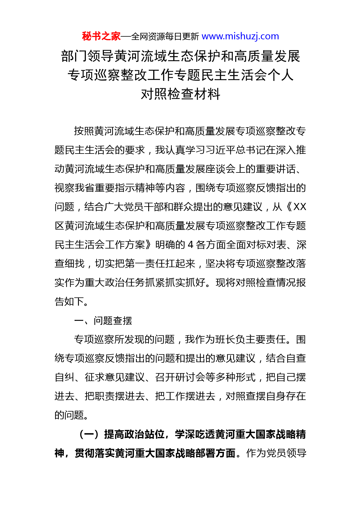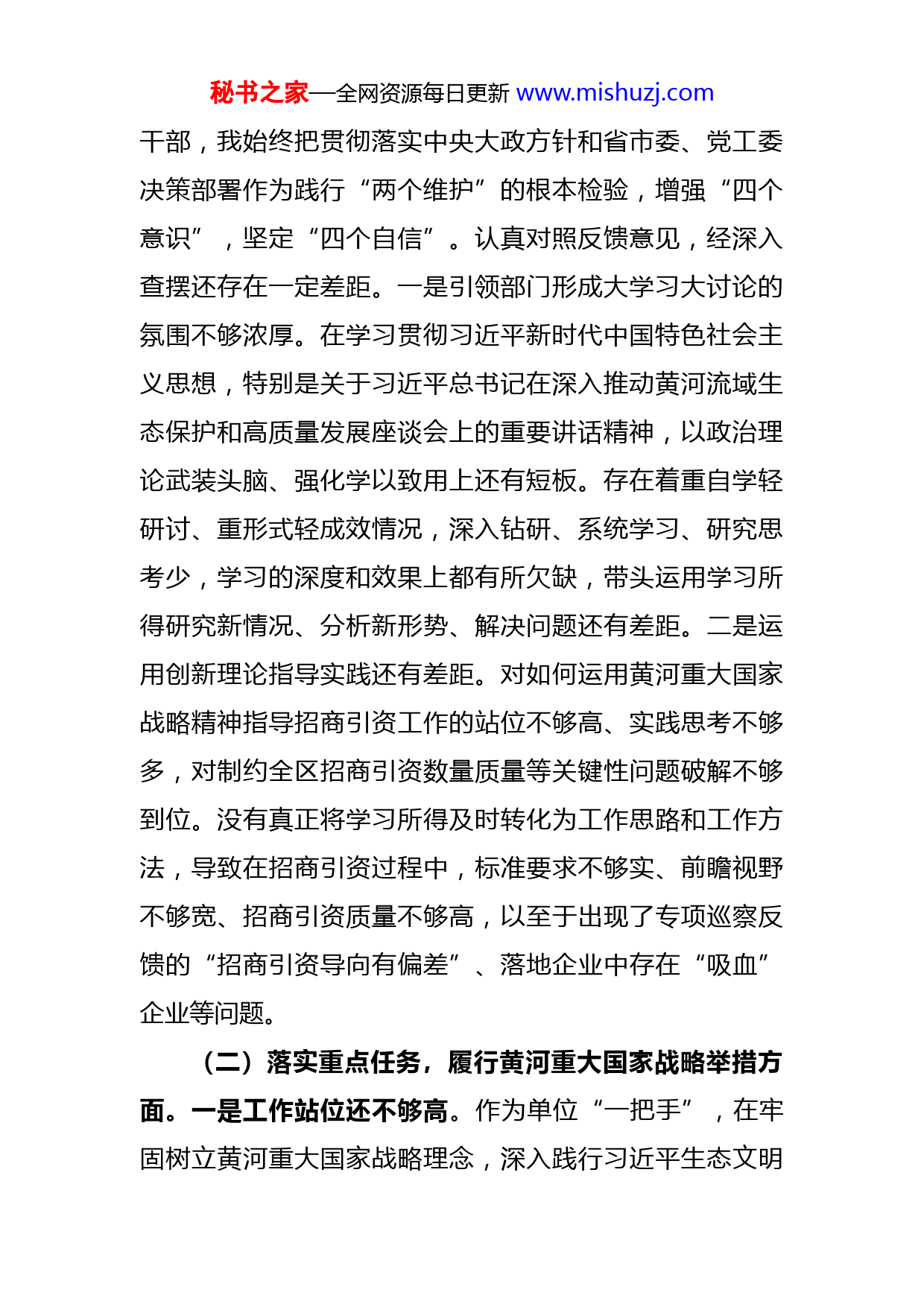 秘书之家—全网资源每日更新www.mishuzj.com部门领导黄河流域生态保护和高质量发展专项巡察整改工作专题民主生活会个人对照检查材料按照黄河流域生态保护和高质量发展专项巡察整改专题民主生活会的要求,我认真学习习近平总书记在深入推动黄河流域生态保护和高质量发展座谈会上的重要讲话、视察我省重要指示精神等内容,围绕专项巡察反馈指出的问题,结合广大党员干部和群众提出的意见建议,从《XX区黄河流域生态保护和高质量发展专项巡察整改工作专题民主生活会工作方案》明确的4各方面全面对标对表、深查细找,切实把第一责任扛起来,坚决将专项巡察整改落实作为重大政治任务抓紧抓实抓好。现将对照检查情况报告如下。一、问题查摆专项巡察所发现的问题,我作为班长负主要责任。围绕专项巡察反馈指出的问题和提出的意见建议,结合自查自纠、征求意见建议、召开研讨会等多种形式,把自己摆进去、把职责摆进去、把工作摆进去,对照查摆自身存在的问题。(一)提高政治站位,学深吃透黄河重大国家战略精神,贯彻落实黄河重大国家战略部署方面。作为党员领导秘书之家—全网资源每日更新www.mishuzj.com干部,我始终把贯彻落实中央大政方针和省市委、党工委决策部署作为践行“两个维护”的根本检验,增强“四个意识”,坚定“四个自信”。认真对照反馈意见,经深入查摆还存在一定差距。一是引领部门形成大学习大讨论的氛围不够浓厚。在学习贯彻习近平新时代中国特色社会主义思想,特别是关于习近平总书记在深入推动黄河流域生态保护和高质量发展座谈会上的重要讲话精神,以政治理论武装头脑、强化学以致用上还有短板。存在着重自学轻研讨、重形式轻成效情况,深入钻研、系统学习、研究思考少,学习的深度和效果上都有所欠缺,带头运用学习所得研究新情况、分析新形势、解决问题还有差距。二是运用创新理论指导实践还有差距。对如何运用黄河重大国家战略精神指导招商引资工作的站位不够高、实践思考不够多,对制约全区招商引资数量质量等关键性问题破解不够到位。没有真正将学习所得及时转化为工作思路和工作方法,导致在招商引资过程中,标准要求不够实、前瞻视野不够宽、招商引资质量不够高,以至于出现了专项巡察反馈的“招商引资导向有偏差”、落地企业中存在“吸血”企业等问题。(二)落实重点任务,履行黄河重大国家战略举措方面。一是工作站位还不够高。作为单位“一把手”,在牢固树立黄河重大国家战略理念,深入践行习近平生态文明秘书之家—全网资源每日更新www.mishuzj.com思想和习近平总书记在深入推动黄河流域生态保护和高质量发展座谈会上的重要讲话精神,完整、准确、全面贯彻新发展理念,推动招商引资等各项工作服务XX区高质量转型发展上仍然做得不到位,紧迫感和责任感有所淡化,所以在工作上一定程度上放宽了工作要求和责任落实,导致一些招商引资的“硬指标”在工作中变成了可以妥协退让的“软指标”,从而影响了落地企业的质量。二是服务高质量发展的能力水平还有差距。自己深知新发展理念是指挥棒、红绿灯,是服务高质量发展的发展思路、方向、着力点的集中体现,是管全局、管根本、管长远的导向。但实际工作中,完整、准确、全面贯彻的能力素质和决心力度还有不足。例如,作为党员领导干部,立足服务XX区发展的新形势、新情况、新特点,高站位的探索研究,主动担当作为的能力需进一步提升,特别是对如何服务壮大全区四大产业,尤其是高端装备、医养健康、信息技术这三大产业方面还缺乏实在管用的招法和清晰有效的思路。(三)统筹整体谋划,扎实开展打基础利长远的基础工作,切实提高招商引资落地企业质量方面。一是系统思维还有所欠缺。在实现工作中习惯了用“代入法”去化解工作的问题、困难和矛盾,但进行全方位思考、统筹整体谋划、长远规划还不够。例如,在招商引资工作中虽然也始终强调招商引资要坚决贯彻新发展理念,但有过多的注秘书之家—全网资源每日更新www.mishuzj.com重眼前的考核、达标等任务影响,对招商引资工作中个别不适应不符合新发展理念的做法,坚决制止、纠正和摒弃的还是不够及时和彻底,从而在工作中出现了专项巡察反馈的“招商引资项目质量不高,企业享受政策多,缴纳税收少”“高新技术企业的数量占总落地企业比例较低,招商引资导向有偏差”等问题。二是工作作风还有差距。始终对招商引资工作在服务保障XX区高质量发展的重要性有清醒的认识,但在工作落实中,一抓到底、严格要求的“钉钉子”精神还不强,一定程度上存在重部署、轻落实,重安排、轻问效的问题,对于提高招商引资企业质量工作抓得不紧不实,没有一竿子插到底、一把尺子量到底,缺乏持之以恒、一抓到底的恒心和韧劲。(四)增强履职意识,强化黄河国家战略重点项目规范管理,推动整改工作真改真见效方面。推进黄河流域生态保护和高质量发展,最终要落到一个个具体项目上,只有把重点项目的各项工作抓实了,黄河重大国家战略才能落到实处、见到实效。深入对照反思,特别是对照专项巡察反馈的问题,自己在推动健全完善各项制度机制上还存在差距。例如,由于我们对落地企业跟踪审查和后期监管不到位、制度不完善,导致2021年以来
