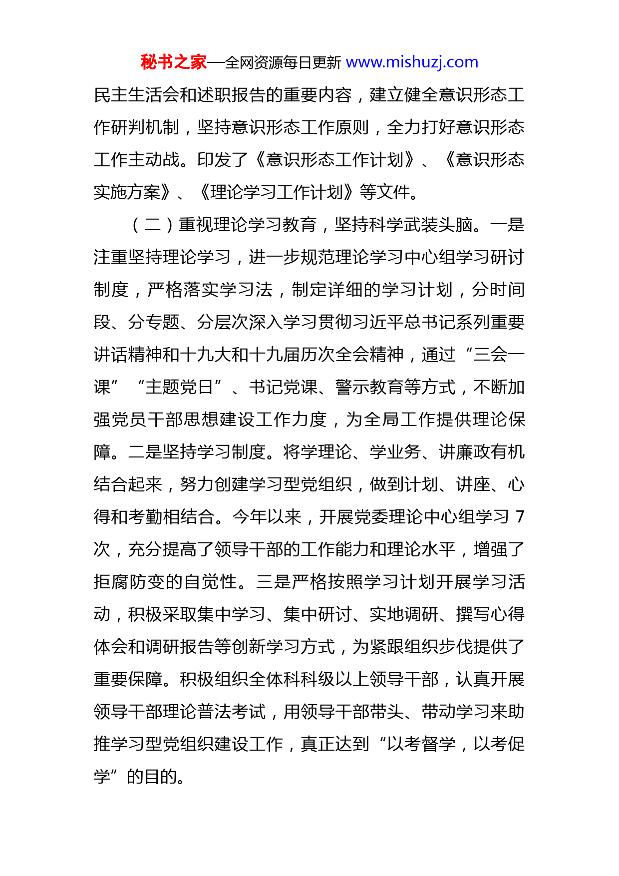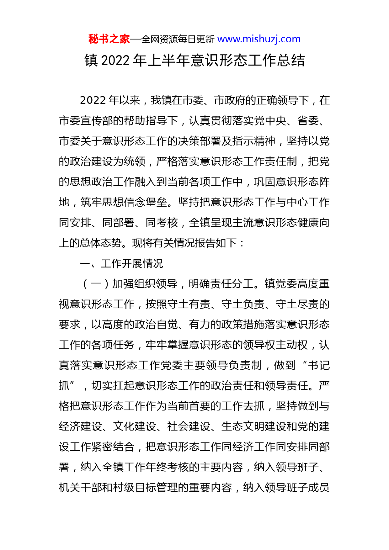 秘书之家—全网资源每日更新www.mishuzj.com镇2022年上半年意识形态工作总结2022年以来,我镇在市委、市政府的正确领导下,在市委宣传部的帮助指导下,认真贯彻落实党中央、省委、市委关于意识形态工作的决策部署及指示精神,坚持以党的政治建设为统领,严格落实意识形态工作责任制,把党的思想政治工作融入到当前各项工作中,巩固意识形态阵地,筑牢思想信念堡垒。坚持把意识形态工作与中心工作同安排、同部署、同考核,全镇呈现主流意识形态健康向上的总体态势。现将有关情况报告如下:一、工作开展情况(一)加强组织领导,明确责任分工。镇党委高度重视意识形态工作,按照守土有责、守土负责、守土尽责的要求,以高度的政治自觉、有力的政策措施落实意识形态工作的各项任务,牢牢掌握意识形态的领导权主动权,认真落实意识形态工作党委主要领导负责制,做到“书记抓”,切实扛起意识形态工作的政治责任和领导责任。严格把意识形态工作作为当前首要的工作去抓,坚持做到与经济建设、文化建设、社会建设、生态文明建设和党的建设工作紧密结合,把意识形态工作同经济工作同安排同部署,纳入全镇工作年终考核的主要内容,纳入领导班子、机关干部和村级目标管理的重要内容,纳入领导班子成员秘书之家—全网资源每日更新www.mishuzj.com民主生活会和述职报告的重要内容,建立健全意识形态工作研判机制,坚持意识形态工作原则,全力打好意识形态工作主动战。印发了《意识形态工作计划》、《意识形态实施方案》、《理论学习工作计划》等文件。(二)重视理论学习教育,坚持科学武装头脑。一是注重坚持理论学习,进一步规范理论学习中心组学习研讨制度,严格落实学习法,制定详细的学习计划,分时间段、分专题、分层次深入学习贯彻习近平总书记系列重要讲话精神和十九大和十九届历次全会精神,通过“三会一课”“主题党日”、书记党课、警示教育等方式,不断加强党员干部思想建设工作力度,为全局工作提供理论保障。二是坚持学习制度。将学理论、学业务、讲廉政有机结合起来,努力创建学习型党组织,做到计划、讲座、心得和考勤相结合。今年以来,开展党委理论中心组学习7次,充分提高了领导干部的工作能力和理论水平,增强了拒腐防变的自觉性。三是严格按照学习计划开展学习活动,积极采取集中学习、集中研讨、实地调研、撰写心得体会和调研报告等创新学习方式,为紧跟组织步伐提供了重要保障。积极组织全体科科级以上领导干部,认真开展领导干部理论普法考试,用领导干部带头、带动学习来助推学习型党组织建设工作,真正达到“以考督学,以考促学”的目的。秘书之家—全网资源每日更新www.mishuzj.com(三)提高舆论引导能力,做好宣传思想工作在舆论引导与对外宣传中,始终坚持团结稳定鼓劲,正面宣传为主,尊重舆论宣传规律,讲究舆论宣传艺术,提高舆论引导效果。牢牢掌控网络意识形态主导权,做到“一把手”亲自抓网络意识形态安全。建立党务政务公开制度,认真开展党务政务公开工作,依托党务、政务信息公开网,宣传栏等形式,及时公开本单位重大决策、重要人事任免、财务预决算等相关信息,全年党务政务公开网共更新信息100条。充分利用微信公众号、工作群,积极将、基层党建、社会主义核心价值观、法治文化建设、党风廉政建设、安全生产、防汛安全等宣传内容提上日程,强化宣传载体建设。及时做好重要节点和敏感时期的舆论监管;建立重大政策及项目的舆情风险评估机制,及时搜集、研判、处置可能引发群体性事件和社会动荡的言论。全年对外宣传管理到位,在网络、报刊报刊无负面新闻。(四)注重学以致用,践行社会主义核心价值观。大力培育和践行社会主义核心价值观。加强核心价值观宣传教育,广泛开展爱国主义教育,广泛开展“图说我们的价值观”宣传活动。广泛开展“我们的中国梦、我们的价值观”宣讲活动。深化核心价值观培育践行。积极申报推荐各级道德模范、和楷模。加强志愿服务工作,推进学雷锋志愿服务活动制度化常态化。深入开展文明单位、秘书之家—全网资源每日更新www.mishuzj.com文明村居、文明社区等群众性精神文明创建活动。加强公益广告宣传工作。深入推进公民道德建设工程。开展“俭以养德、全民节约”、遵德守礼、文明出行、文明餐桌、文明旅游等活动。加强“道德讲堂”建设,开展各种形式的讲道德、尊道德、守道德活动。加强道德领域突出问题专项治理。深入开展一些群众喜闻乐见文化活动,举办象棋、健身舞等比赛;开展文明单位、文明村(居)、文明家庭、“道德模范”、“好婆婆”、“好媳妇”评选活动,村民文明素质明显提高;开展美丽乡村、洁净乡村行动。坚持走经济发展、生活富裕、生态文明的可持续发展道路,加快农村三改以及农村环境整治。使生活居住环境的绿化、美化、亮化、净化水平逐步提高。二、存在的问题虽然我镇意识形态宣传工作虽然取得了一定的成效,但也存在一些问题:有少数领导干部因为业务繁忙,主要时间和精力用于处理事务之中,对意识形态理论学习重视不够,为应付检查而学习,学习主动性不高;在意识形态学习中针对性不强,缺乏自己的思考,与工作联系不强等;互联网、手机微信等新兴媒体的应用和引导管理需