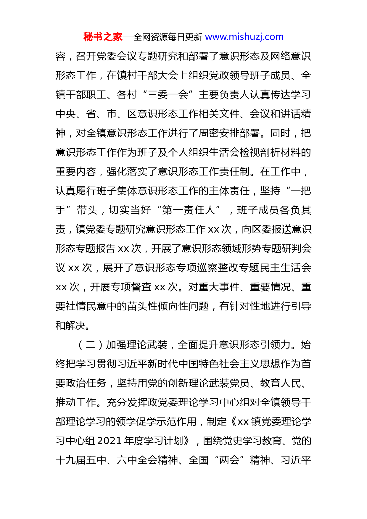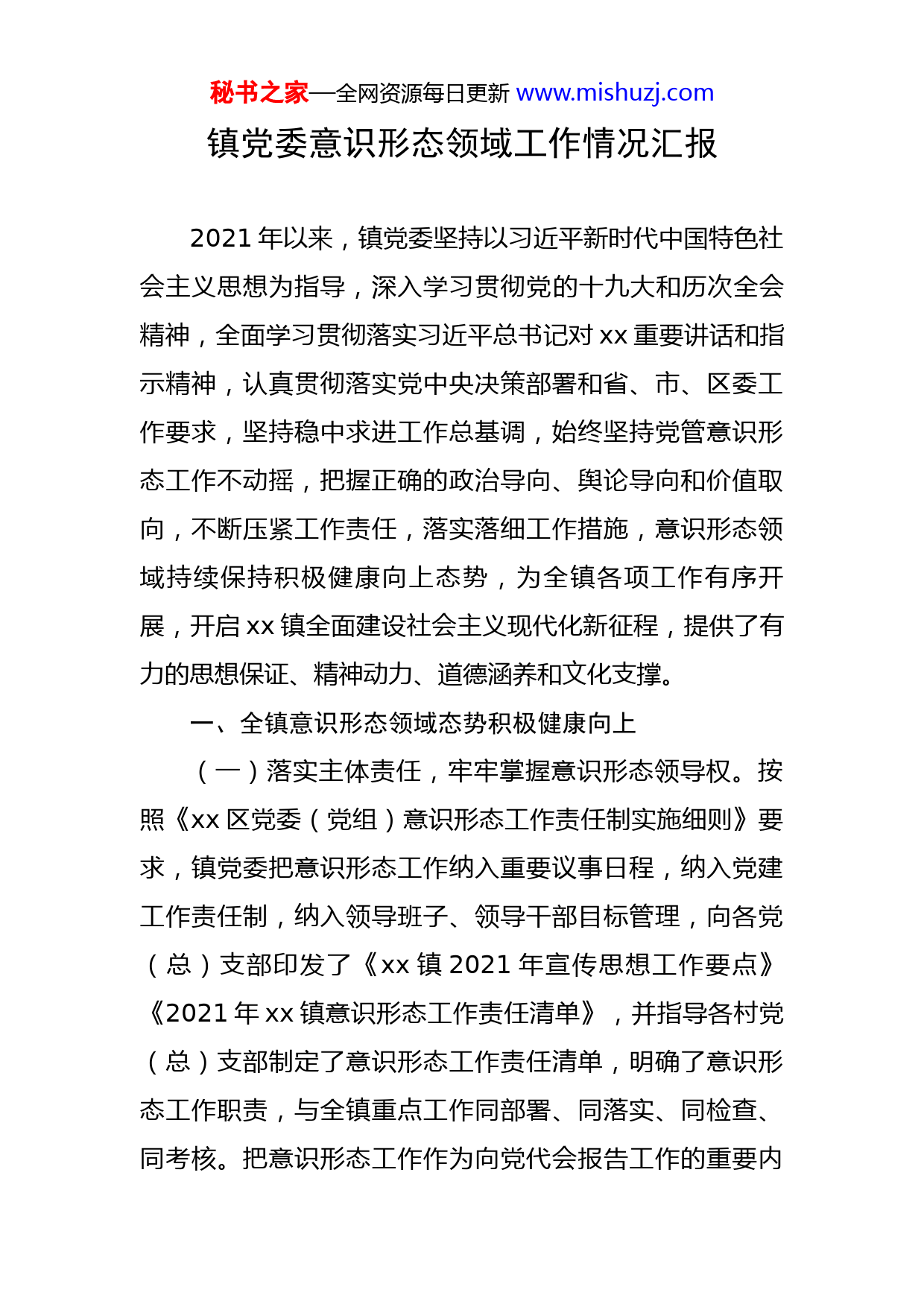 秘书之家—全网资源每日更新www.mishuzj.com镇党委意识形态领域工作情况汇报2021年以来,镇党委坚持以习近平新时代中国特色社会主义思想为指导,深入学习贯彻党的十九大和历次全会精神,全面学习贯彻落实习近平总书记对xx重要讲话和指示精神,认真贯彻落实党中央决策部署和省、市、区委工作要求,坚持稳中求进工作总基调,始终坚持党管意识形态工作不动摇,把握正确的政治导向、舆论导向和价值取向,不断压紧工作责任,落实落细工作措施,意识形态领域持续保持积极健康向上态势,为全镇各项工作有序开展,开启xx镇全面建设社会主义现代化新征程,提供了有力的思想保证、精神动力、道德涵养和文化支撑。一、全镇意识形态领域态势积极健康向上(一)落实主体责任,牢牢掌握意识形态领导权。按照《xx区党委(党组)意识形态工作责任制实施细则》要求,镇党委把意识形态工作纳入重要议事日程,纳入党建工作责任制,纳入领导班子、领导干部目标管理,向各党(总)支部印发了《xx镇2021年宣传思想工作要点》《2021年xx镇意识形态工作责任清单》,并指导各村党(总)支部制定了意识形态工作责任清单,明确了意识形态工作职责,与全镇重点工作同部署、同落实、同检查、同考核。把意识形态工作作为向党代会报告工作的重要内秘书之家—全网资源每日更新www.mishuzj.com容,召开党委会议专题研究和部署了意识形态及网络意识形态工作,在镇村干部大会上组织党政领导班子成员、全镇干部职工、各村“三委一会”主要负责人认真传达学习中央、省、市、区意识形态工作相关文件、会议和讲话精神,对全镇意识形态工作进行了周密安排部署。同时,把意识形态工作作为班子及个人组织生活会检视剖析材料的重要内容,强化落实了意识形态工作责任制。在工作中,认真履行班子集体意识形态工作的主体责任,坚持“一把手”带头,切实当好“第一责任人”,班子成员各负其责,镇党委专题研究意识形态工作xx次,向区委报送意识形态专题报告xx次,开展了意识形态领域形势专题研判会议xx次,展开了意识形态专项巡察整改专题民主生活会xx次,开展专项督查xx次。对重大事件、重要情况、重要社情民意中的苗头性倾向性问题,有针对性地进行引导和解决。(二)加强理论武装,全面提升意识形态引领力。始终把学习贯彻习近平新时代中国特色社会主义思想作为首要政治任务,坚持用党的创新理论武装党员、教育人民、推动工作。充分发挥政党委理论学习中心组对全镇领导干部理论学习的领学促学示范作用,制定《xx镇党委理论学习中心组2021年度学习计划》,围绕党史学习教育、党的十九届五中、六中全会精神、全国“两会”精神、习近平秘书之家—全网资源每日更新www.mishuzj.com总书记“七一”重要讲话精神等内容,组织召开党委理论学习中心组学习(扩大)会议xx次,制定每月理论学习计划,下发理论学习计划xx期,在集中学习的同时所有干部职工对照镇党委总体学习安排撰写学习笔记,确保了学习实效。各党(总)支部认真落实“三会一课”“主题党日”等制度,以支部为单位督促党员充分利用好“学习强国”“xx党建”等学习平台,有效将习近平新时代中国特色社会主义思想的学习宣传贯彻引向深入。结合党史学习教育和新时代文明实践工作,依托镇级理论宣讲队伍,深入村组开展习近平新时代中国特色社会主义思想和党的十九届五中、六中全会精神宣讲,有效提升了镇村干部的政治意识、大局意识、核心意识、看齐意识。截至目前,各党(总)支部开展“主题党日”活动xx余次,包村领导到村讲党课近xx余次,参学率达95%,切实深化了党员干部对习近平新时代中国特色社会主义思想的理解,确保了意识形态工作政治导向不偏差、不含糊、不动摇。(三)从严管网治网,切实维护网络意识形态安全。在《xx区xx镇微信群暂行管理办法》的基础上,进一步修订形成了《xx区xx镇工作学习交流网络群管理办法》,将QQ、微信、钉钉、“学习强国”等工作学习交流网络群纳入管理办法。严格执行信息“三审”程序,规范运行了“魅力新xx”微信公众号、xx个村级公众号和xx余秘书之家—全网资源每日更新www.mishuzj.com个工作学习网络交流群,建成了集宣传发布、信息资讯、工作交流为一体的媒体平台,对疫情防控、创建全国文明城市、脱贫攻坚、乡村振兴、新时代文明实践等重点工作内容进行积极宣传。今年以来,“魅力新xx”微信公众号共发布、转发信息xxx条。健全了日常镇村舆情动态管控机制,完善了重大决策及项目的舆情风险评估制度,及时搜集、研判、处置可能引发群体性事件和社会动荡的言论,为网络舆论引导工作的开展提供了坚强的组织保障。严格履行党管意识形态责任,守牢管好意识形态阵地。严格按照中共xx区委宣传部《关于进一步加强意识形态阵地管理的通知》(区委宣发〔xxx〕xxx号)文件相关规定,认真落实讲座、报告会、文化活动等报备管理制度。按要求将xxx个村级微信公众号向区委网信办备案,严格微信公众号的审核运行管理,进一步加强网评员队伍建设,按照中央、省、市、区委网信办的安排部署,积极开展网上舆论引导和舆论斗争,积极发挥传播正能量和正面跟帖引导作用。对上网计算机保密安全进行了认真自查,全镇干部职工签订了保密承诺书,进一步强化了涉密信息