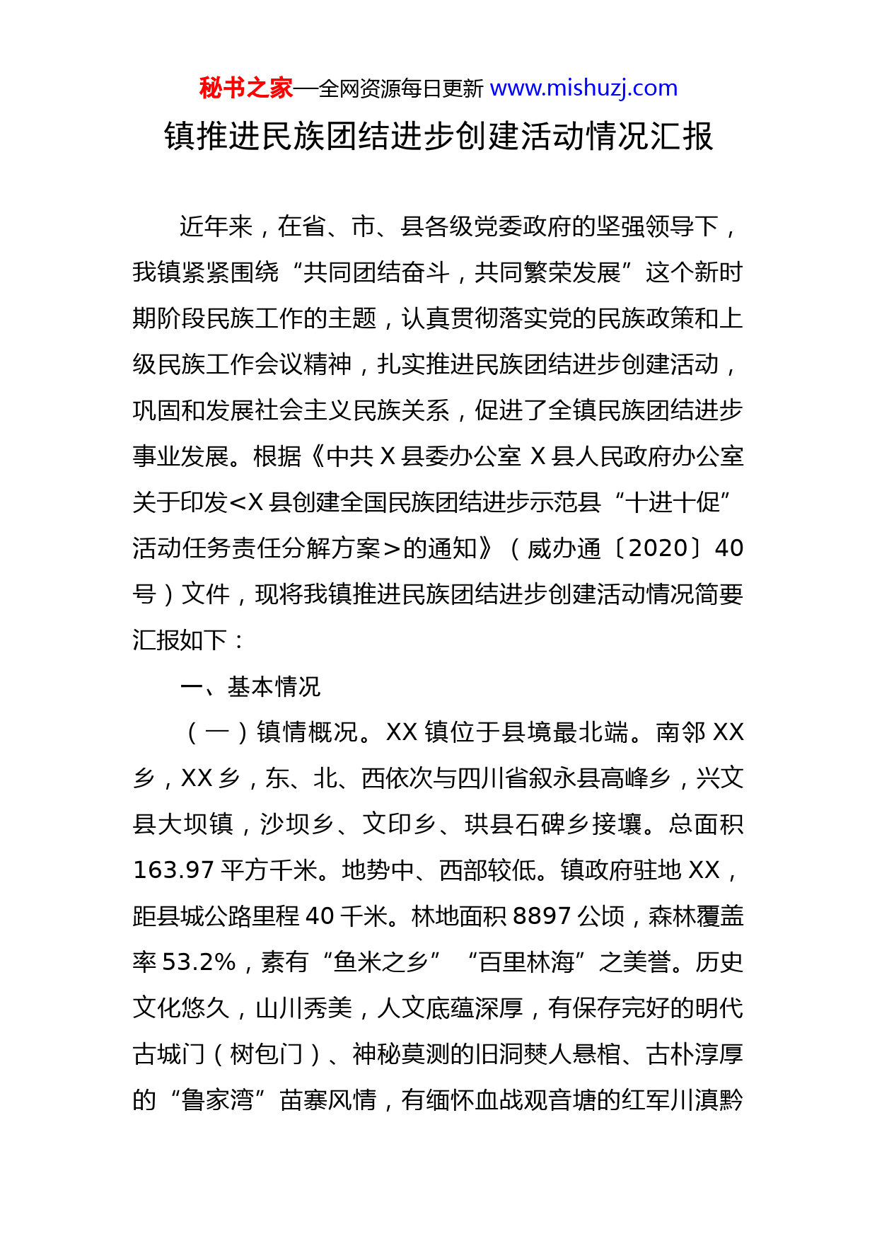 秘书之家—全网资源每日更新www.mishuzj.com镇推进民族团结进步创建活动情况汇报近年来,在省、市、县各级党委政府的坚强领导下,我镇紧紧围绕“共同团结奋斗,共同繁荣发展”这个新时期阶段民族工作的主题,认真贯彻落实党的民族政策和上级民族工作会议精神,扎实推进民族团结进步创建活动,巩固和发展社会主义民族关系,促进了全镇民族团结进步事业发展。根据《中共X县委办公室X县人民政府办公室关于印发的通知》(威办通〔2020〕40号)文件,现将我镇推进民族团结进步创建活动情况简要汇报如下:一、基本情况(一)镇情概况。XX镇位于县境最北端。南邻XX乡,XX乡,东、北、西依次与四川省叙永县高峰乡,兴文县大坝镇,沙坝乡、文印乡、珙县石碑乡接壤。总面积163.97平方千米。地势中、西部较低。镇政府驻地XX,距县城公路里程40千米。林地面积8897公顷,森林覆盖率53.2%,素有“鱼米之乡”“百里林海”之美誉。历史文化悠久,山川秀美,人文底蕴深厚,有保存完好的明代古城门(树包门)、神秘莫测的旧洞僰人悬棺、古朴淳厚的“鲁家湾”苗寨风情,有缅怀血战观音塘的红军川滇黔秘书之家—全网资源每日更新www.mishuzj.com游击纵队的“长官司红军烈士纪念碑”,有清朝修建的刑台,有省级文明示范建设单位的“观音寺”寺庙。全镇辖7个村(社区),144个村(居)民小组。总户数9762户,总人口31844人。其中,非农业人7644人,女性人口14892人。(二)少数民族人口及分布情况。XX镇是一个苗族、汉族杂居的地方,全镇少数民族共5353人,占全镇总人口的17%,全镇有1个民族村,其余各村均有少数民族,少数民族群众以大杂居、小聚居分布在全镇7个村委会、144个村民小组。少数民族人口比例占50%以上的村民小组有22个,其中少数民族人口比例占90%以上的村民小组有6个。二、多措并举扎实推进民族团结进步创建活动(一)高度重视民族工作1.加强领导。镇党委、政府高度重视民族团结进步创建工作,始终把处理好民族关系和做好民族工作作为事关全镇稳定发展的大事来抓。一是加强对马克思主义民族观、党和国家的民族理论政策法规的学习,不断提高认识和处理民族问题的能力。二是深化民族团结宣传教育活动,营造良好的创建氛围。通过设置法治宣传栏、发放宣传资料、播放乡村大喇叭、转发微信公众号、微信朋友圈等多种方式全方位、多角度的向群众宣传党和国家的民族理论秘书之家—全网资源每日更新www.mishuzj.com政策法规和民族基本常识,进一步树立中华民族共同体意识。三是统筹抓好少数民族干部的培养使用,建立少数民族后备干部培养机制,使少数民族后备干部队伍在数量上和质量上得到有效保障。截止目前,全镇有少数民族公务员、事业单位干部5名,其中少数民族正科级领导干部1名,少数民族副科级领导干部3名。全镇有少数民族村干部8名,少数民族村民小组长22名,全镇782名党员中,少数民族党员达101人,占党员总数的12.92%。2.健全机制。一是成立了民族团结进步创建活动领导小组,由镇党委书记、镇人民政府镇长担任双组长,党政班子成员任副组长,镇直站所负责人、各村(社区)总支书记为领导小组成员,及时协调解决民族团结进步创建活动中的问题和困难,为开展创建活动提供了有力的组织保障。二是精心部署民族团结进步创建活动,保障人员和经费,推进民族团结进步创建进乡镇、进企业、进社区、进学校、进易迁安置点、进宗教场所、进医院。3.培养典型。加强示范创建,发挥示范创建引领作用。指导少数民族村寨依法制定具有民族特色的村规民约,推进民主化、生态化和法制化进程,积极推动唐家湾、鲁家湾等民族团结进步模范村组建设,(二)促进乡村经济社会事业发展1.科学发展。一是紧紧围绕坚决打赢脱贫攻坚战的目标秘书之家—全网资源每日更新www.mishuzj.com任务,加快基础设施建设,注重补齐发展短板,推进基本公共服务均等化。通过认真贯彻落实上级脱贫攻坚的决策和部署,按照“六个精准”要求,采取“五个一批”脱贫路径,实施各项扶贫政策。全镇7个贫困行政村、1272户贫困户、5111贫困人口如期脱贫摘帽出列,贫困发生率降到0.016%。全镇7个村(社区)均通公路、通电、通自来水,广播电视覆盖率100%。截止目前,全镇完成农村水池建设22个,水窖121个,解决农村人畜饮水安全问题;连户路已完成硬化37.64千米,已完成98个村民小组村组公路硬化;全镇共完成垃圾池建设216个,公厕3座;创建了特色示范型村庄2个(松林半坡、回龙麻园);集镇污水处理厂正在建设中,覆盖集镇周边2个村8个村民小组。二是发挥地区资源优势,发展特色优势产业。XX镇有得天独厚的自然资源,拥有丰富的水资源、林业资源、竹业资源和页岩气能源资源。水资源的丰富使我镇建成了5座中小型水电站,装机容量合计达18000KW,年均产值约1681万元;林业年均伐木约16824方,产值约1345万元;竹业采伐年均2400吨,产值约864万元;成贵铁路贯穿XX镇文兴村,并设置了预备站;国家重点项目页岩气工程坐落于XX镇,项目建设覆盖6个村委会7个作业面,现开采平台已发展到8个,其中有4个已投入生产,日均产气30万立方,同时X昆威秘书之家—全网资源每日更新www.mishuzj.com燃气有限责任公司进入XX建设了一个日产30万立方天然气液化站(LNG)。我镇结合实际,产业发展重点向种养殖业倾斜,建成8个生猪代养场;在现年均种植