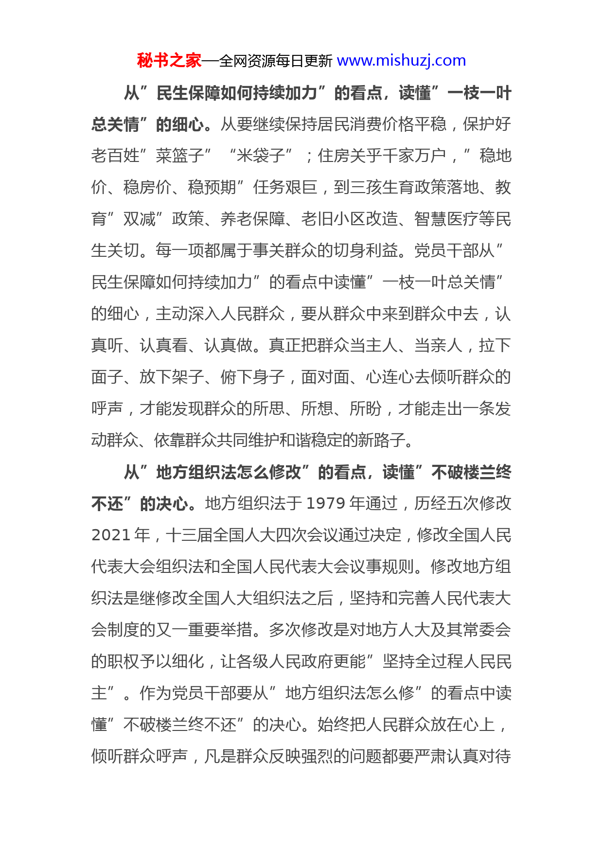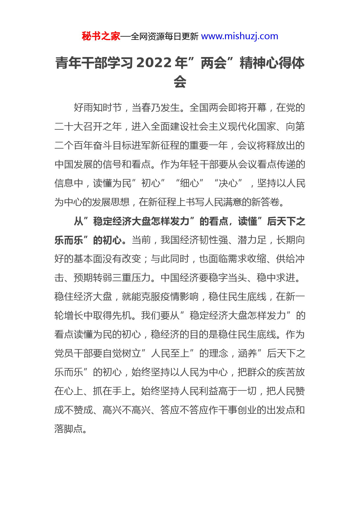 秘书之家—全网资源每日更新www.mishuzj.com青年干部学习2022年”两会”精神心得体会好雨知时节,当春乃发生。全国两会即将开幕,在党的二十大召开之年,进入全面建设社会主义现代化国家、向第二个百年奋斗目标进军新征程的重要一年,会议将释放出的中国发展的信号和看点。作为年轻干部要从会议看点传递的信息中,读懂为民”初心”“细心”“决心”,坚持以人民为中心的发展思想,在新征程上书写人民满意的新答卷。从”稳定经济大盘怎样发力”的看点,读懂”后天下之乐而乐”的初心。当前,我国经济韧性强、潜力足,长期向好的基本面没有改变;与此同时,也面临需求收缩、供给冲击、预期转弱三重压力。中国经济要稳字当头、稳中求进。稳住经济大盘,就能克服疫情影响,稳住民生底线,在新一轮增长中取得先机。我们要从”稳定经济大盘怎样发力”的看点读懂为民的初心,稳经济的目的是稳住民生底线。作为党员干部要自觉树立”人民至上”的理念,涵养”后天下之乐而乐”的初心,始终坚持以人民为中心,把群众的疾苦放在心上、抓在手上。始终坚持人民利益高于一切,把人民赞成不赞成、高兴不高兴、答应不答应作干事创业的出发点和落脚点。秘书之家—全网资源每日更新www.mishuzj.com从”民生保障如何持续加力”的看点,读懂”一枝一叶总关情”的细心。从要继续保持居民消费价格平稳,保护好老百姓”菜篮子”“米袋子”;住房关乎千家万户,”稳地价、稳房价、稳预期”任务艰巨,到三孩生育政策落地、教育”双减”政策、养老保障、老旧小区改造、智慧医疗等民生关切。每一项都属于事关群众的切身利益。党员干部从”民生保障如何持续加力”的看点中读懂”一枝一叶总关情”的细心,主动深入人民群众,要从群众中来到群众中去,认真听、认真看、认真做。真正把群众当主人、当亲人,拉下面子、放下架子、俯下身子,面对面、心连心去倾听群众的呼声,才能发现群众的所思、所想、所盼,才能走出一条发动群众、依靠群众共同维护和谐稳定的新路子。从”地方组织法怎么修改”的看点,读懂”不破楼兰终不还”的决心。地方组织法于1979年通过,历经五次修改2021年,十三届全国人大四次会议通过决定,修改全国人民代表大会组织法和全国人民代表大会议事规则。修改地方组织法是继修改全国人大组织法之后,坚持和完善人民代表大会制度的又一重要举措。多次修改是对地方人大及其常委会的职权予以细化,让各级人民政府更能”坚持全过程人民民主”。作为党员干部要从”地方组织法怎么修”的看点中读懂”不破楼兰终不还”的决心。始终把人民群众放在心上,倾听群众呼声,凡是群众反映强烈的问题都要严肃认真对待秘书之家—全网资源每日更新www.mishuzj.com凡是损害群众利益的行为都要坚决纠正,切实维护好人民群众合法权益。牢记为人民谋幸福只有起点,没有终点。