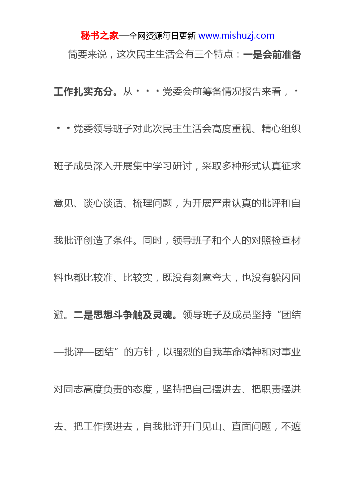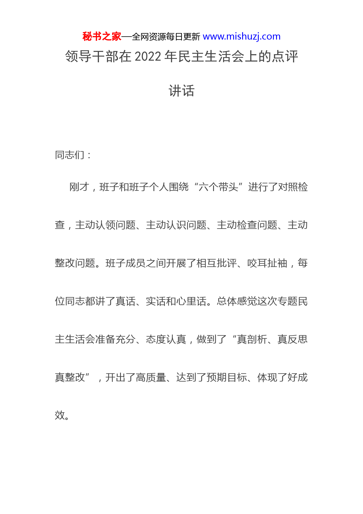 秘书之家—全网资源每日更新www.mishuzj.com领导干部在2022年民主生活会上的点评讲话同志们:刚才,班子和班子个人围绕“六个带头”进行了对照检查,主动认领问题、主动认识问题、主动检查问题、主动整改问题。班子成员之间开展了相互批评、咬耳扯袖,每位同志都讲了真话、实话和心里话。总体感觉这次专题民主生活会准备充分、态度认真,做到了“真剖析、真反思真整改”,开出了高质量、达到了预期目标、体现了好成效。秘书之家—全网资源每日更新www.mishuzj.com简要来说,这次民主生活会有三个特点:一是会前准备工作扎实充分。从﹡﹡﹡党委会前筹备情况报告来看,﹡﹡﹡党委领导班子对此次民主生活会高度重视、精心组织班子成员深入开展集中学习研讨,采取多种形式认真征求意见、谈心谈话、梳理问题,为开展严肃认真的批评和自我批评创造了条件。同时,领导班子和个人的对照检查材料也都比较准、比较实,既没有刻意夸大,也没有躲闪回避。二是思想斗争触及灵魂。领导班子及成员坚持“团结—批评—团结”的方针,以强烈的自我革命精神和对事业对同志高度负责的态度,坚持把自己摆进去、把职责摆进去、把工作摆进去,自我批评开门见山、直面问题,不遮秘书之家—全网资源每日更新www.mishuzj.com遮掩掩、避重就轻。相互批评真点问题、点真问题,落细落小、见人见事,都是从促进班子更好发展出发,没有刻意上纲上线,也没有有意避实就虚,既有严肃认真查摆问题的“辣味”,又有同志之间相互帮助的“真情”,进一步增强了班子的凝聚力、战斗力和向心力。三是整改措施务实有效。每位同志都能针对查找出的问题,从实际出发提出了整改措施,措施既有理论学习方面的,也有工作业务方面的,大部分同志能主动坚持把问题整改和全﹡﹡﹡“四新”“四化”发展大局贯通融会、一体化提出整改工作方案,既治己病、又促发展,既改当前突出问题,又着眼治本抓体制机制整改,措施具体、方向明确,很有针对秘书之家—全网资源每日更新www.mishuzj.com性、操作性、实效性,体现了边查边改、立行立改的良好氛围。总的看,这次民主生活会取得了良好效果。但对照中央、省委要求,以更高的标准来衡量,也有需要改进和加强地方。一是查摆问题不够深入。有的同志从政治上查摆问题、剖析原因还不够,与个人思想实际结合不紧密,刀刃向内的主动性不强。比如:部分同志剖析问题中还存在不少的“有差距、仍需加强、需进一步提升”等词句,指出问题存在个别“穿衣戴帽”等环节。二是相关事项报告有缺漏。有的同志没有严格按照对照检查材料撰写要求,逐一详细回应相关情况,存在“漏项”。比如:有的同志对个人有秘书之家—全网资源每日更新www.mishuzj.com关情况报告未对房产情况作出说明,仅只是说明“与上年无变化”。三是制定措施没有一一对应。部分同志虽结合﹡﹡﹡工作实际,制定了整改措施,也明确了整改时限,但是措施没有与查摆出来的问题一一对应。比如,有的同志围绕“五个带头”方面进行对照剖析,整改措施却只有四个方面,措施制定的覆盖面不广。以上这些问题,都需要各位同志加以重视、加以整改、加以巩固。同志们,这次﹡﹡﹡,既是对﹡﹡﹡党委政治建设的再加强,更是对开启“四新”“四化”新征程的再鼓劲。下一步,要按照中央、省委、州委和﹡﹡﹡的工作部署和要求,进一步巩固和扩大民主生活会成果,把成果放在﹡﹡秘书之家—全网资源每日更新www.mishuzj.com﹡经济社会发展中、为民办好事实事行动中、全面从严治党向基层延伸的实践中去检验,持续推动经济社会高质量发展。下面,结合工作实际,再讲几点意见,与大家共勉。第一、提高政治站位,衷心拥护“两个确立”、忠诚践行“两个维护”。坚持以这次民主生活会为契机,持续用力,深入学习贯彻习近平新时代中国特色社会主义思想和党的二十大精神,以坚定的理想信念,砥砺对党的赤诚忠心,确保﹡﹡﹡各项事业始终沿着正确的政治方向前进。要牢固树立正确党史观,理直气壮弘扬伟大建党精神,弘扬党史的浩然正气和英雄之气,坚决反对历史虚无主义,秘书之家—全网资源每日更新www.mishuzj.com坚决同一切违背“两个维护”的行为作斗争。要旗帜鲜明讲政治,切实把“两个确立”转化为“两个维护”的政治自觉、思想自觉、行动自觉,真正做到信念过硬、政治过硬、责任过硬、能力过硬、作风过硬,始终在思想上政治上行动上同以习近平同志为核心的党中央保持高度一致。第二、强化宗旨意识,扎实办好群众身边的民生实事。要一以贯之推进“我为群众办实事”实践活动,坚持尽力而为、量力而行,在教育、医疗、住房、养老、就业等人民群众最关心的领域,提高保障水平,持续推动基本公共服务均等化。要坚持以高质量发展统揽全局,围绕“四新”主攻“四化”,有力有序推动项目精准落地。同时,秘书之家—全网资源每日更新www.mishuzj.com春节将至,要高度警惕疫情防控中的麻痹思想、厌战情绪侥幸心理和松劲心态,做细做实疫情防控各项工作,坚决守住来之不易的疫情防控成果。要深入开展安全生产专项整治行动,强化企业主体责任落实,坚决防止交通、消防建筑施工、食品药品等领域重特大安全事故发生。要妥善安排好群众生产生活,关心和保障困难群众的基
