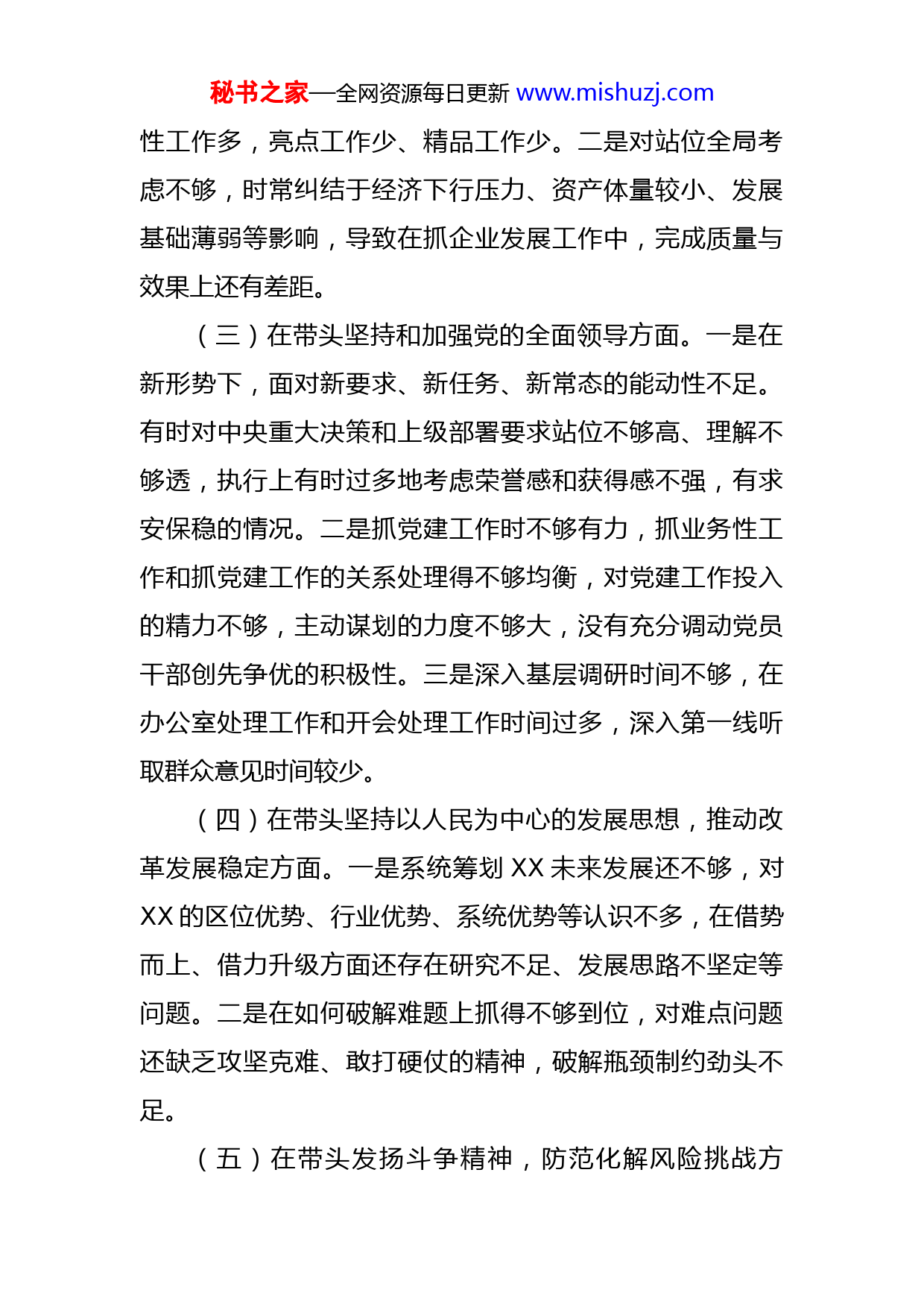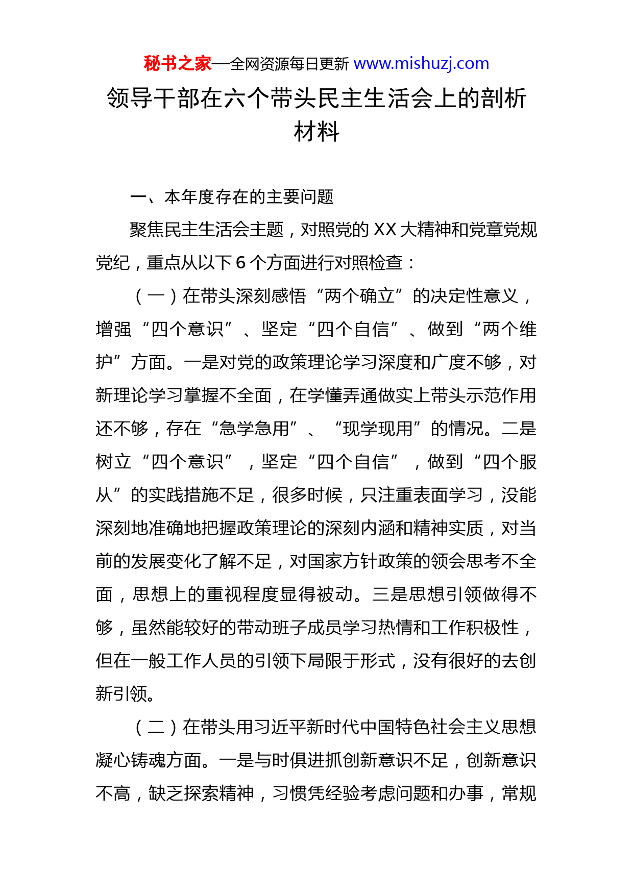 秘书之家—全网资源每日更新www.mishuzj.com领导干部在六个带头民主生活会上的剖析材料一、本年度存在的主要问题聚焦民主生活会主题,对照党的XX大精神和党章党规党纪,重点从以下6个方面进行对照检查:(一)在带头深刻感悟“两个确立”的决定性意义,增强“四个意识”、坚定“四个自信”、做到“两个维护”方面。一是对党的政策理论学习深度和广度不够,对新理论学习掌握不全面,在学懂弄通做实上带头示范作用还不够,存在“急学急用”、“现学现用”的情况。二是树立“四个意识”,坚定“四个自信”,做到“四个服从”的实践措施不足,很多时候,只注重表面学习,没能深刻地准确地把握政策理论的深刻内涵和精神实质,对当前的发展变化了解不足,对国家方针政策的领会思考不全面,思想上的重视程度显得被动。三是思想引领做得不够,虽然能较好的带动班子成员学习热情和工作积极性,但在一般工作人员的引领下局限于形式,没有很好的去创新引领。(二)在带头用习近平新时代中国特色社会主义思想凝心铸魂方面。一是与时俱进抓创新意识不足,创新意识不高,缺乏探索精神,习惯凭经验考虑问题和办事,常规秘书之家—全网资源每日更新www.mishuzj.com性工作多,亮点工作少、精品工作少。二是对站位全局考虑不够,时常纠结于经济下行压力、资产体量较小、发展基础薄弱等影响,导致在抓企业发展工作中,完成质量与效果上还有差距。(三)在带头坚持和加强党的全面领导方面。一是在新形势下,面对新要求、新任务、新常态的能动性不足。有时对中央重大决策和上级部署要求站位不够高、理解不够透,执行上有时过多地考虑荣誉感和获得感不强,有求安保稳的情况。二是抓党建工作时不够有力,抓业务性工作和抓党建工作的关系处理得不够均衡,对党建工作投入的精力不够,主动谋划的力度不够大,没有充分调动党员干部创先争优的积极性。三是深入基层调研时间不够,在办公室处理工作和开会处理工作时间过多,深入第一线听取群众意见时间较少。(四)在带头坚持以人民为中心的发展思想,推动改革发展稳定方面。一是系统筹划XX未来发展还不够,对XX的区位优势、行业优势、系统优势等认识不多,在借势而上、借力升级方面还存在研究不足、发展思路不坚定等问题。二是在如何破解难题上抓得不够到位,对难点问题还缺乏攻坚克难、敢打硬仗的精神,破解瓶颈制约劲头不足。(五)在带头发扬斗争精神,防范化解风险挑战方秘书之家—全网资源每日更新www.mishuzj.com面。一是在工作中拼劲不足,没有顶格设定工作标准,在保障基本民生、帮扶企业和招商引资等方面,工作思路不宽,措施不多,还停留在走访了解,抓产业发展、项目扶持的经验不足、力度不够。二是存在老好人思想,虽然能够做到旗帜鲜明讲政治,敢于同错误思想作斗争,但在很多时候存在以提醒替代批评的情况,存在顾面子、讲人情思维,没有真正做到拉下面子、硬起手腕,没有达到“红脸出汗”的效果。(六)在带头落实全面从严治党政治责任方面。一是压实“一岗双责”力度不够,推动全面从严治党向基层延伸的力度还不够,有时考虑到一些客观因素,工作上有报喜多报忧少甚至报喜不报忧倾向,向上级汇报工作时,说成绩、说亮点多一些,讲问题、讲缺点少一些,敢于揭短亮丑的勇气还不够。二是表率作用还不够,对落实全面从严治党的严峻性、复杂性、艰巨性认识不够深刻到位,“啄木鸟”作用发挥不到位,缺乏较真碰硬的狠劲。二、剖析问题根源(一)新理论学习没有经常化。在日常工作中,我对新理论学习的重要性认识不够,尤其是对习近平新时代中国特色社会主义思想的学习紧迫感不强,新理论新精神的学习经常被开会检查等事务性工作所中断;单位学习制度没有很好的坚持,对新理论学习不透彻,掌握不具体,存秘书之家—全网资源每日更新www.mishuzj.com在“现学现用”和“学用结合”不紧密的问题;参加集体组织学习多,个人自学少,对新理论新政策的学习抓得不紧不实,没有完全学深悟透。(二)宗旨意识有所弱化。对企业嘘寒问暖的时间少,站在企业的立场上想问题不够,决策过程和工作落实上考虑企业意愿不够,更多的精力放在了完成任务上,考虑工作本身成效比考虑企业的利益多一些,为人民服务的宗旨意识有所弱化。对待工作有求稳守成的心理,开拓创新意识减弱,把服务企业说得多,落实到行动上少,究其原因就在于宗旨意识有所淡化。(三)提升政治自觉的主动性不够强。到XX工作以来,工作领域、特点都与原来有所不同,自己虽然在主观上认真学习,迅速适应、调整,但截止目前对XX实际情况的掌握还没有达到非常熟悉、认识尚不够深刻,工作创新不足。自觉主动性还不够,对干部职工在严明责任、严肃纪律和严格管理上降低了标杆,对工作纪律和制度的落实情况,缺乏硬性的督促检查和考评,在干部管理方面存在失之于宽、失之于软。三、下一步改进措施(一)加强理论学习,坚定政治立场。树牢“四个意识”,坚定“四个自信”,坚决做到“两个维护”,严守党的政治纪律和政治规矩,保持政治信仰不变、政治立场秘书之家—全网资源每日更新www.mishuzj.com不移、政治方向不偏,在大是大非面前,在关系和决定党和国家前途命运的关键问题和关键时节,始终保持清醒的政治头脑,始终保持政治上的