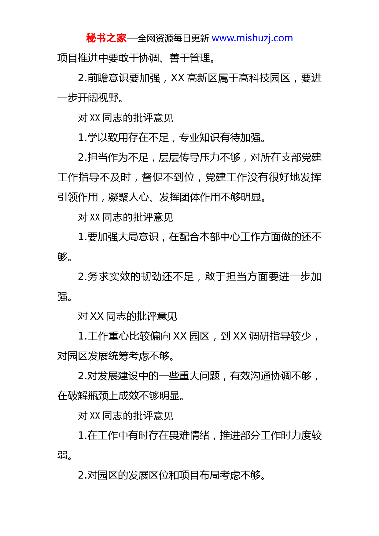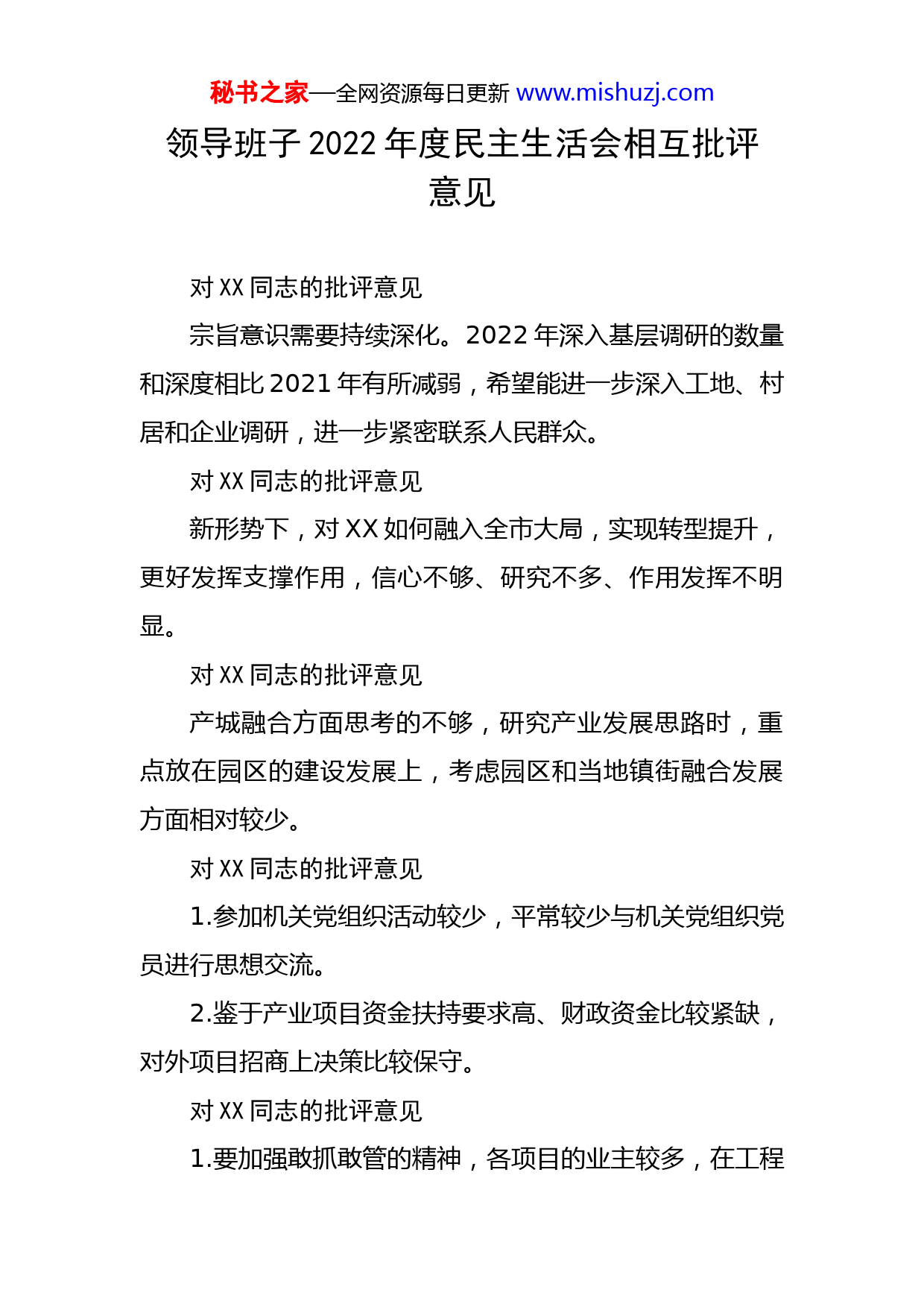 秘书之家—全网资源每日更新www.mishuzj.com领导班子2022年度民主生活会相互批评意见对XX同志的批评意见宗旨意识需要持续深化。2022年深入基层调研的数量和深度相比2021年有所减弱,希望能进一步深入工地、村居和企业调研,进一步紧密联系人民群众。对XX同志的批评意见新形势下,对XX如何融入全市大局,实现转型提升,更好发挥支撑作用,信心不够、研究不多、作用发挥不明显。对XX同志的批评意见产城融合方面思考的不够,研究产业发展思路时,重点放在园区的建设发展上,考虑园区和当地镇街融合发展方面相对较少。对XX同志的批评意见1.参加机关党组织活动较少,平常较少与机关党组织党员进行思想交流。2.鉴于产业项目资金扶持要求高、财政资金比较紧缺,对外项目招商上决策比较保守。对XX同志的批评意见1.要加强敢抓敢管的精神,各项目的业主较多,在工程秘书之家—全网资源每日更新www.mishuzj.com项目推进中要敢于协调、善于管理。2.前瞻意识要加强,XX高新区属于高科技园区,要进一步开阔视野。对XX同志的批评意见1.学以致用存在不足,专业知识有待加强。2.担当作为不足,层层传导压力不够,对所在支部党建工作指导不及时,督促不到位,党建工作没有很好地发挥引领作用,凝聚人心、发挥团体作用不够明显。对XX同志的批评意见1.要加强大局意识,在配合本部中心工作方面做的还不够。2.务求实效的韧劲还不足,敢于担当方面要进一步加强。对XX同志的批评意见1.工作重心比较偏向XX园区,到XX调研指导较少,对园区发展统筹考虑不够。2.对发展建设中的一些重大问题,有效沟通协调不够,在破解瓶颈上成效不够明显。对XX同志的批评意见1.在工作中有时存在畏难情绪,推进部分工作时力度较弱。2.对园区的发展区位和项目布局考虑不够。秘书之家—全网资源每日更新www.mishuzj.com对XX同志的批评意见1.对园区第一手材料掌握得不全面,调查研究不深入不具体。对XX同志的批评意见落实意识形态工作责任制不到位,平时对意识形态工作研究思考少,对分管部门意识形态工作责任制动态情况掌握不全面、不及时。面对新形势新挑战,谋划工作、解决问题仍旧习惯于依赖老思维、老经验、老办法,对如何更好地创新作为、如何创造性开展工作研究不够深入。对XX同志的批评意见在政策宣教落实上还不够重视,运用新媒体等新时期宣教形式不够熟练,仍有个别群众不理解、不支持,政策作用发挥不充分、不彻底。对一些项目持续推进的力度不够,有时会出现松劲思想,没有时刻以“赶考”的心态严格要求自己,比如管委会成立之初,事务性工作千头万绪,牵扯了许多心思精力,深入一线推进项目的时间明显减少。对XX同志的批评意见意识形态工作责任制落实不够到位,对社会上、干部间传播的牢骚笑话、官场秘闻未能坚决抵制。刚入行,新手上路,对XX知识掌握不够全面,对行业秘书之家—全网资源每日更新www.mishuzj.com了解不够深入。对XX同志的批评意见理论学习还不够深入,忽视理论对实践工作的指导作用。学习主动性不足,应当加强与管委会工作开展密切相关的业务知识的学习,如项目建设、发展规划、金融知识等方面知识的学习。在执行政治纪律、政治规矩上表率作用发挥不充分,对下属的教育管理态度不够坚决,不够严厉,原则性还不强。对XX同志的批评意见主动学习劲头不足,开展学习的方式还是主要依赖组织安排的集体学习或培训活动,平时主动开展自主学习较少,局限于完成学习任务、学习时限要求,学习成效有待提升。抓工作督促不严格,布置工作任务停留在会议、文件层面,对后续工作是否落实、落实是否到位、落实效果如何重视程度不够。对XX同志的批评意见表率作用不够明显。比如,下乡调研、现场办公时,出于解决问题的考虑,习惯多叫上几个部门的领导,轻车简从落实的不够到位,模范意识树得不牢。有些工作以会议、文件部署推动的多,深入一线、深秘书之家—全网资源每日更新www.mishuzj.com入现场协调解决问题的少,比如,管委会分解市委任务后,只是开会布置、发文通知,更多依靠书面反馈、开会听汇报掌握工作进展,深入园区实地检查执行落实的次数还不够多。