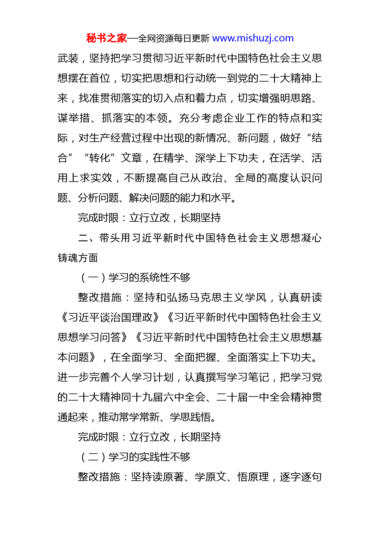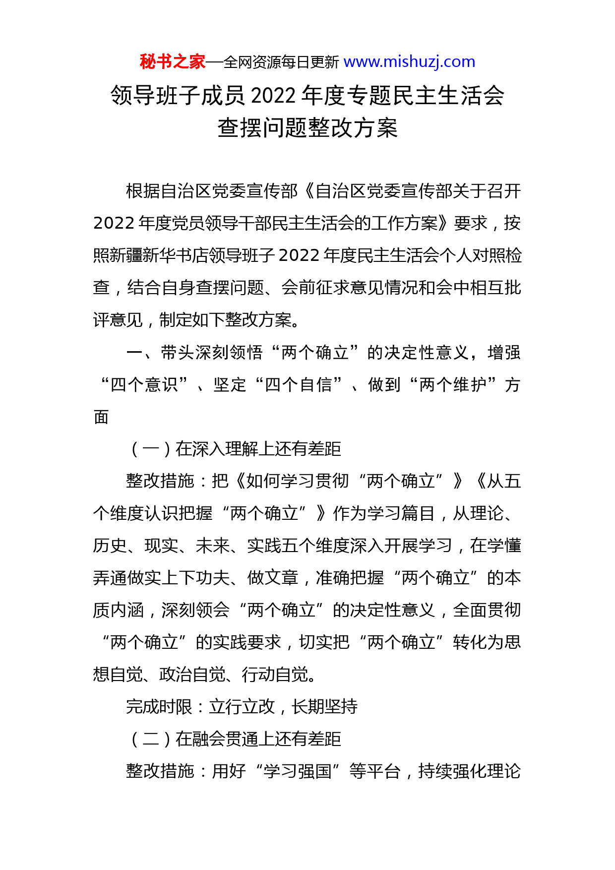 秘书之家—全网资源每日更新www.mishuzj.com领导班子成员2022年度专题民主生活会查摆问题整改方案根据自治区党委宣传部《自治区党委宣传部关于召开2022年度党员领导干部民主生活会的工作方案》要求,按照新疆新华书店领导班子2022年度民主生活会个人对照检查,结合自身查摆问题、会前征求意见情况和会中相互批评意见,制定如下整改方案。一、带头深刻领悟“两个确立”的决定性意义,增强“四个意识”、坚定“四个自信”、做到“两个维护”方面(一)在深入理解上还有差距整改措施:把《如何学习贯彻“两个确立”》《从五个维度认识把握“两个确立”》作为学习篇目,从理论、历史、现实、未来、实践五个维度深入开展学习,在学懂弄通做实上下功夫、做文章,准确把握“两个确立”的本质内涵,深刻领会“两个确立”的决定性意义,全面贯彻“两个确立”的实践要求,切实把“两个确立”转化为思想自觉、政治自觉、行动自觉。完成时限:立行立改,长期坚持(二)在融会贯通上还有差距整改措施:用好“学习强国”等平台,持续强化理论秘书之家—全网资源每日更新www.mishuzj.com武装,坚持把学习贯彻习近平新时代中国特色社会主义思想摆在首位,切实把思想和行动统一到党的二十大精神上来,找准贯彻落实的切入点和着力点,切实增强明思路、谋举措、抓落实的本领。充分考虑企业工作的特点和实际,对生产经营过程中出现的新情况、新问题,做好“结合”“转化”文章,在精学、深学上下功夫,在活学、活用上求实效,不断提高自己从政治、全局的高度认识问题、分析问题、解决问题的能力和水平。完成时限:立行立改,长期坚持二、带头用习近平新时代中国特色社会主义思想凝心铸魂方面(一)学习的系统性不够整改措施:坚持和弘扬马克思主义学风,认真研读《习近平谈治国理政》《习近平新时代中国特色社会主义思想学习问答》《习近平新时代中国特色社会主义思想基本问题》,在全面学习、全面把握、全面落实上下功夫。进一步完善个人学习计划,认真撰写学习笔记,把学习党的二十大精神同十九届六中全会、二十届一中全会精神贯通起来,推动常学常新、学思践悟。完成时限:立行立改,长期坚持(二)学习的实践性不够整改措施:坚持读原著、学原文、悟原理,逐字逐句秘书之家—全网资源每日更新www.mishuzj.com学习党的二十大报告和新修正党章,原原本本学习,深入开展交流研讨,加强学习的主动性、自觉性。牢固树立新发展理念,深入贯彻党中央决策部署,主动融入X发展格局,围绕改革工作目标任务,强化对重点工作、重大问题的思考和研究,对党委重点工作,完整准确领会、抓好结合落实,在推动X高质量发展上下功夫、见实效。完成时限:立行立改,长期坚持三、带头坚持和加强党的全面领导方面(一)对纪检监察工作在企业加强党的全面领导如何发挥作用上的还有理解片面、认识不充分的问题整改措施:切实把纪检监察工作当成在国有企业中加强党的领导、全面从严治党、全面从严治企的高度来认识。加强国有企业纪检监察工作的学习、思考,结合X实际,坚持围绕中心、服务大局,为企业经营管理、改革发展保驾护航。把政治监督作为加强党的全面领导的重要方面抓紧抓好。完成时限:立行立改,长期坚持(二)对企业业务工作的了解掌握还不够深入、充分整改措施:加强对营销、物流、财务等重要业务环节的学习,紧紧围绕中心工作,切实肩负担当,立足长远,贴合实际,扑下身子,多到X基地、各X进行实地调研,进一步摸排基层业务工作中存在的风险点,进而提升纪检秘书之家—全网资源每日更新www.mishuzj.com监察监督水平,为党委各项工作顺利开展提供坚强纪律保障。完成时限:立行立改,长期坚持(三)对分管部门和单位党组织建设的指导还不够及时、有力整改措施:坚持党建和业务两手抓、两促进。从严从实抓好分管单位(部门)的党建和党风廉政建设工作,加大研究部署和督促指导党组织建设的力度,把党的领导贯彻到基层、覆盖到基层、扎根在基层,推动基层党组织全面进步、全面过硬。严格执行双重组织生活制度,坚持参加主题党日活动、组织生活会,带头上好党课。完成时限:立行立改,长期坚持四、带头完整准确贯彻新时代党的治疆方略方面(一)理论支撑不足整改措施:深入学习领悟习近平总书记视察X时的重要讲话精神,年内完成《X》《X》《X》等书籍的学习,深入了解X历史文化,充分认识做好意识形态工作的极端重要性,准确把握当前意识形态领域面临的形势和要求。完成时限:2023年12月前完成,并长期坚持(二)抓贯彻落实还缺乏韧劲整改措施:进一步解放思想、转变观念,积极探索新形势下做好国有企业纪检监察工作的新思路、解决群众问秘书之家—全网资源每日更新www.mishuzj.com题的新方法和破解发展难题的新途径。以钉钉子精神做实做细做好各项工作,平时工作要勇于担“责”,关键时刻要善于解“难”,重要节点要敢于碰“硬”,推动形成发现问题、分析问题、解决问题的工作闭环。完成时限:立行立改,长期坚持五、带头坚持以人民为中心的发展思想,推动改革发展稳定方面(一)走访群众不深入整改措施:定期深入基层,深入群众,听取各方面的意见和建议,面对面地做好群众的思想宣传工作,真正使调研过程成为坚持走群众路线、提高群众工