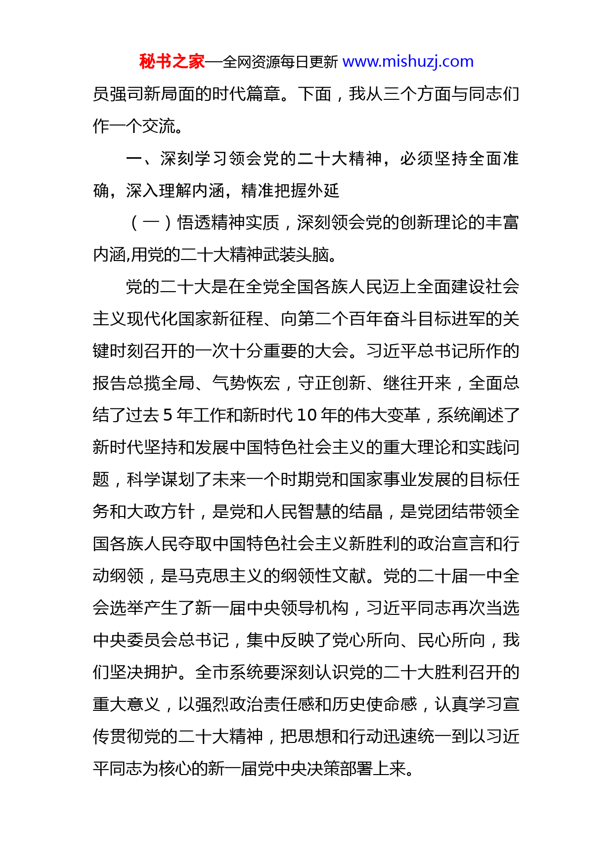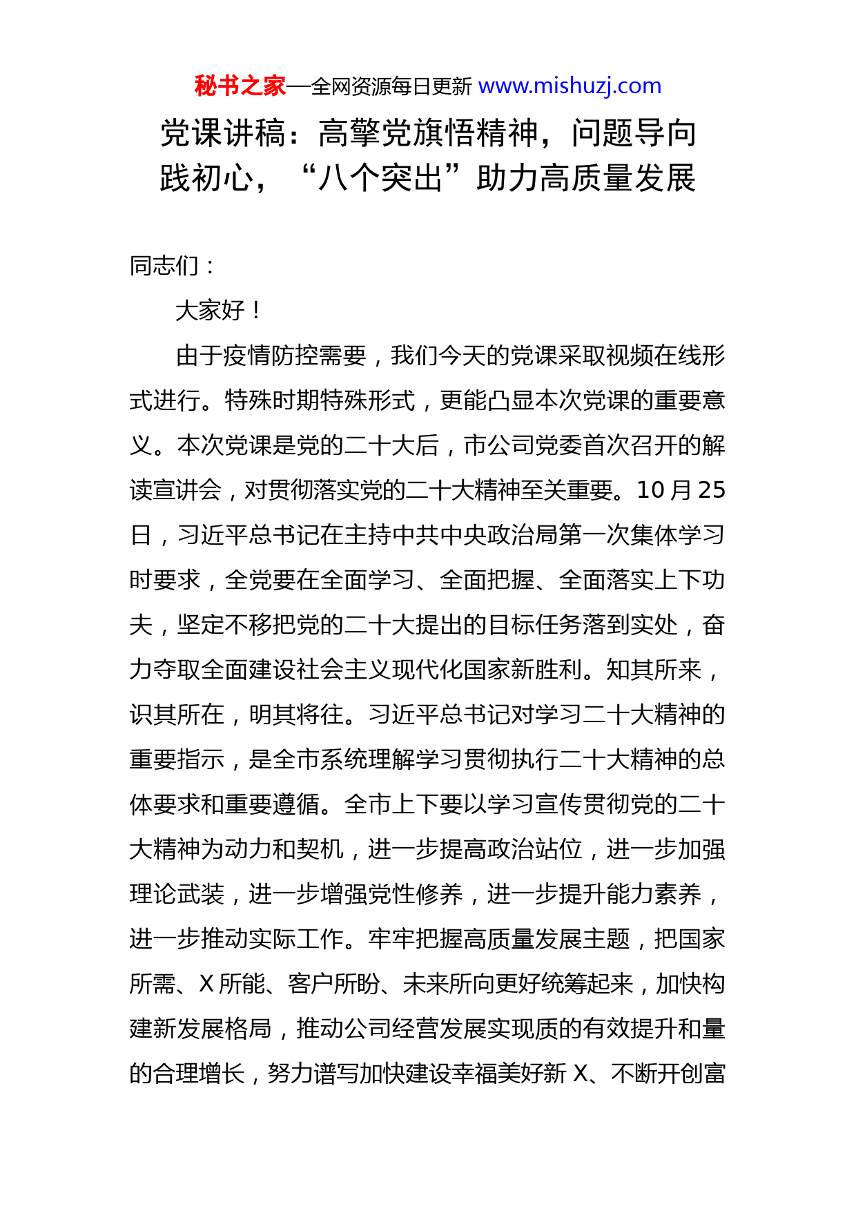 秘书之家—全网资源每日更新www.mishuzj.com党课讲稿:高擎党旗悟精神,问题导向践初心,“八个突出”助力高质量发展同志们:大家好!由于疫情防控需要,我们今天的党课采取视频在线形式进行。特殊时期特殊形式,更能凸显本次党课的重要意义。本次党课是党的二十大后,市公司党委首次召开的解读宣讲会,对贯彻落实党的二十大精神至关重要。10月25日,习近平总书记在主持中共中央政治局第一次集体学习时要求,全党要在全面学习、全面把握、全面落实上下功夫,坚定不移把党的二十大提出的目标任务落到实处,奋力夺取全面建设社会主义现代化国家新胜利。知其所来,识其所在,明其将往。习近平总书记对学习二十大精神的重要指示,是全市系统理解学习贯彻执行二十大精神的总体要求和重要遵循。全市上下要以学习宣传贯彻党的二十大精神为动力和契机,进一步提高政治站位,进一步加强理论武装,进一步增强党性修养,进一步提升能力素养,进一步推动实际工作。牢牢把握高质量发展主题,把国家所需、X所能、客户所盼、未来所向更好统筹起来,加快构建新发展格局,推动公司经营发展实现质的有效提升和量的合理增长,努力谱写加快建设幸福美好新X、不断开创富秘书之家—全网资源每日更新www.mishuzj.com员强司新局面的时代篇章。下面,我从三个方面与同志们作一个交流。一、深刻学习领会党的二十大精神,必须坚持全面准确,深入理解内涵,精准把握外延(一)悟透精神实质,深刻领会党的创新理论的丰富内涵,用党的二十大精神武装头脑。党的二十大是在全党全国各族人民迈上全面建设社会主义现代化国家新征程、向第二个百年奋斗目标进军的关键时刻召开的一次十分重要的大会。习近平总书记所作的报告总揽全局、气势恢宏,守正创新、继往开来,全面总结了过去5年工作和新时代10年的伟大变革,系统阐述了新时代坚持和发展中国特色社会主义的重大理论和实践问题,科学谋划了未来一个时期党和国家事业发展的目标任务和大政方针,是党和人民智慧的结晶,是党团结带领全国各族人民夺取中国特色社会主义新胜利的政治宣言和行动纲领,是马克思主义的纲领性文献。党的二十届一中全会选举产生了新一届中央领导机构,习近平同志再次当选中央委员会总书记,集中反映了党心所向、民心所向,我们坚决拥护。全市系统要深刻认识党的二十大胜利召开的重大意义,以强烈政治责任感和历史使命感,认真学习宣传贯彻党的二十大精神,把思想和行动迅速统一到以习近平同志为核心的新一届党中央决策部署上来。秘书之家—全网资源每日更新www.mishuzj.com(二)把握核心要义,从政治高度深刻领悟“两个确立”的决定性意义和历史必然性。过去5年和新时代以来的10年,在党和国家发展进程中极不寻常、极不平凡。以习近平同志为核心的党中央团结带领全党全军全国各族人民义无反顾进行具有许多新的历史特点的伟大斗争,采取一系列战略性举措,推进一系列变革性实践,实现一系列突破性进展,取得一系列标志性成果,经受住了各方面的风险挑战考验,党和国家事业取得历史性成就、发生历史性变革,推动我国迈上全面建设社会主义现代化国家新征程。“两个确立”反映了全党全军全国各族人民共同心愿,对新时代党和国家事业发展、对推进中华民族伟大复兴历史进程具有决定性意义。全市系统要增强“四个意识”、坚定“四个自信”、做到“两个维护”,不断提高政治判断力、政治领悟力、政治执行力,更加自觉地维护习近平总书记党中央的核心、全党的核心地位,更加自觉地维护以习近平同志为核心的党中央权威和集中统一领导,坚定不移在思想上政治上行动上同以习近平同志为核心的党中央保持高度一致。(三)坚持学用结合,把党的二十大精神切实转化为做好各项公司工作的强大动力。党的二十大提出“六个必须坚持”的新时代中国特色社会主义思想的世界观和方法论,明确以中国式现代化推秘书之家—全网资源每日更新www.mishuzj.com进中华民族伟大复兴这一新时代新征程中国共产党的使命任务,阐述中国式现代化的中国特色和本质要求,提出前进道路上必须牢牢把握的“五项重大原则”,对当前和今后一个时期党和国家事业发展作出全面战略部署,为全面建设社会主义现代化国家提供了根本遵循。X作为中央金融企业,必须坚持以习近平新时代中国特色社会主义思想为指导,把党的创新理论贯彻落实到公司改革发展各方面全过程。必须牢牢把握发展是党执政兴国的第一要务,完整、准确、全面贯彻新发展理念,构建新发展格局,推动高质量发展,更加积极主动将公司自身发展融入党和国家事业发展全局、融入中国式现代化的历史进程,充分发挥金融X综合优势,全力支持现代化经济体系和现代化产业体系建设,全面推进乡村振兴,积极促进区域协调发展,服务高水平对外开放,守牢不发生系统性金融风险底线。必须坚持以增进民生福祉、提高人民生活品质为己任,更加坚持金融工作的政治性、人民性,提升专业性,把健康养老作为战略性业务,把牢人民最关心最直接最现实的利益问题,积极探索创新,切实发挥金融X民生保障安全网、经济运行减震器、社会发展稳定器的作用。必须持之以恒推进全面从严治党,牢记全面从严治党永远在路上,党的自我革命永远在路