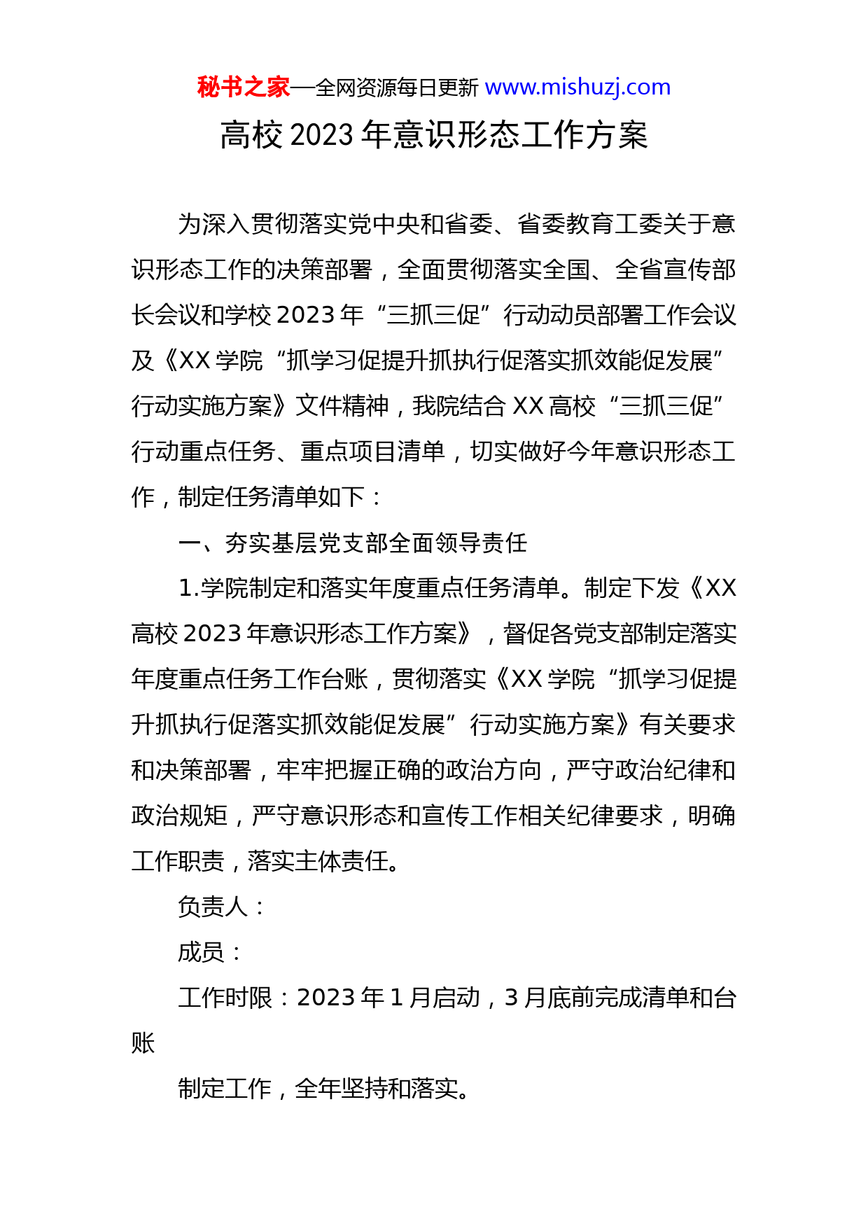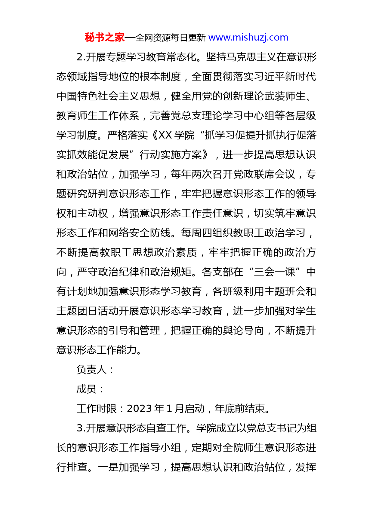 秘书之家—全网资源每日更新www.mishuzj.com高校2023年意识形态工作方案为深入贯彻落实党中央和省委、省委教育工委关于意识形态工作的决策部署,全面贯彻落实全国、全省宣传部长会议和学校2023年“三抓三促”行动动员部署工作会议及《XX学院“抓学习促提升抓执行促落实抓效能促发展”行动实施方案》文件精神,我院结合XX高校“三抓三促”行动重点任务、重点项目清单,切实做好今年意识形态工作,制定任务清单如下:一、夯实基层党支部全面领导责任1.学院制定和落实年度重点任务清单。制定下发《XX高校2023年意识形态工作方案》,督促各党支部制定落实年度重点任务工作台账,贯彻落实《XX学院“抓学习促提升抓执行促落实抓效能促发展”行动实施方案》有关要求和决策部署,牢牢把握正确的政治方向,严守政治纪律和政治规矩,严守意识形态和宣传工作相关纪律要求,明确工作职责,落实主体责任。负责人:成员:工作时限:2023年1月启动,3月底前完成清单和台账制定工作,全年坚持和落实。秘书之家—全网资源每日更新www.mishuzj.com2.开展专题学习教育常态化。坚持马克思主义在意识形态领域指导地位的根本制度,全面贯彻落实习近平新时代中国特色社会主义思想,健全用党的创新理论武装师生、教育师生工作体系,完善党总支理论学习中心组等各层级学习制度。严格落实《XX学院“抓学习促提升抓执行促落实抓效能促发展”行动实施方案》,进一步提高思想认识和政治站位,加强学习,每年两次召开党政联席会议,专题研究研判意识形态工作,牢牢把握意识形态工作的领导权和主动权,增强意识形态工作责任意识,切实筑牢意识形态工作和网络安全防线。每周四组织教职工政治学习,不断提高教职工思想政治素质,牢牢把握正确的政治方向,严守政治纪律和政治规矩。各支部在“三会一课”中有计划地加强意识形态学习教育,各班级利用主题班会和主题团日活动开展意识形态学习教育,进一步加强对学生意识形态的引导和管理,把握正确的與论导向,不断提升意识形态工作能力。负责人:成员:工作时限:2023年1月启动,年底前结束。3.开展意识形态自查工作。学院成立以党总支书记为组长的意识形态工作指导小组,定期对全院师生意识形态进行排查。一是加强学习,提高思想认识和政治站位,发挥秘书之家—全网资源每日更新www.mishuzj.com党员先锋模范作用,增强政治意识、责任意识、阵地意识,强化使命担当,不断提升意识形态工作能力。二是严格落实网络安全责任制,保障网络与信息安全。做好疫情防控期间各项工作,坚持正确舆论导向,弘扬主旋律、正能量,确保网络意识形态安全。三是按照“所有具有动员能力的平台、所有参与平合运营的师生”的“两个所有”要求,强化网络管理,落实主办主管、属地管理责任,切实规范网上信息传播秩序。四是持续推进新媒体矩阵、通稿指令、三审推送管理措施,深入开展网络意识形态安全专项治理行动。负责人:成员:工作时限:2023年1月启动,年底前结束。4.加强监督,严肃执纪。贯彻落实《XX学院“抓学习促提升抓执行促落实抓效能促发展”行动实施方案》及《XX高校“三抓三促”行动重点任务、重点项目清单》内容精神,学院组织全院师生召开意识形态警示教育会议,以反面教材为警钟,切实提升师生政治素养,不断筑牢意识形态底线思维,维护校园安全稳定。对违反意识形态工作管理规定的师生,依规依纪严肃追责问责。负责人:成员:秘书之家—全网资源每日更新www.mishuzj.com工作时限:2023年1月全面启动,全年推进落实。二、全面加强意识形态领域风险防控5.分析研判意识形态领域形势。贯彻落实中央、省委今年关于意识形态领域情况通报精神,紧扣全面贯彻党的XX大精神的开局之年这条主线,定期分析研判意识形态领域情况,每年至少召开2次意识形态工作研判会议,配合学校做好舆情监控和处置工作。负责人:成员:工作时限:2023年1月启动,全年推进落实。6.防范化解重点领城风险隐患。我院高度重视意识形态工作,及时传达学习文件精神,成立意识形态工作领导小组,召开全体职工会议安排部署意识形态责任落实工作,明确党总支班子对意识形态工作负主体责任,班子成员协助党总支书记抓好统筹协调工作,根据工作分工,按照“一岗双责”要求主抓分管系部室意识形态工作,对职责范围内的工作负领导责任,切实解决意识形态工作中存在的实际问题。在师生中开展马克思主义宗教观、党的宗教政策以及有关法律法规的宣传教育,全面贯彻党的宗教政策。坚持宗教与教育相分离的原则,禁止在学校进行传教和其他宗教活动,坚决抵御和防范境外势力利用宗教进行校园渗透,坚决防范和抵制各种邪教。充分了解和掌握民秘书之家—全网资源每日更新www.mishuzj.com主党派基层组织和成员以及无党派人士情况,加强政治领导。支持民主党派和无党派人士就国家建设、社会发展等方面重大问题考察调研、建言献策,支持民主党派、无党派人士开展社会服务活动。负责人:成员:工作时限:2023年1月启动,全年推进落实。7.及时有效处置各类问题。我院成立意识形态领域舆情快速反应处置工作领导小组和XX高校学生突发事件应急处置小组,协调小组由总支书记和院长任组长,班子其他成员和相关系部科室主任为成员。依据积极应对、快速