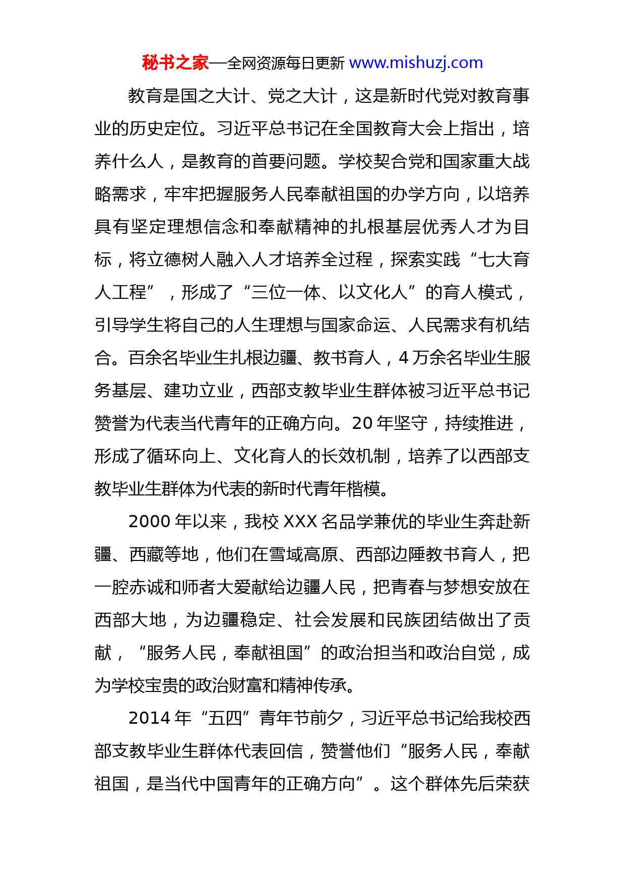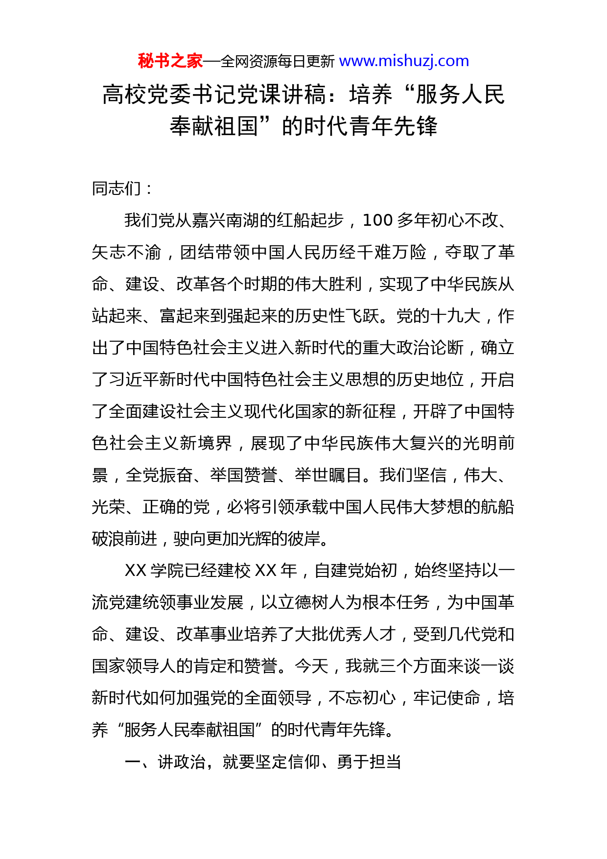 秘书之家—全网资源每日更新www.mishuzj.com高校党委书记党课讲稿:培养“服务人民奉献祖国”的时代青年先锋同志们:我们党从嘉兴南湖的红船起步,100多年初心不改、矢志不渝,团结带领中国人民历经千难万险,夺取了革命、建设、改革各个时期的伟大胜利,实现了中华民族从站起来、富起来到强起来的历史性飞跃。党的十九大,作出了中国特色社会主义进入新时代的重大政治论断,确立了习近平新时代中国特色社会主义思想的历史地位,开启了全面建设社会主义现代化国家的新征程,开辟了中国特色社会主义新境界,展现了中华民族伟大复兴的光明前景,全党振奋、举国赞誉、举世瞩目。我们坚信,伟大、光荣、正确的党,必将引领承载中国人民伟大梦想的航船破浪前进,驶向更加光辉的彼岸。XX学院已经建校XX年,自建党始初,始终坚持以一流党建统领事业发展,以立德树人为根本任务,为中国革命、建设、改革事业培养了大批优秀人才,受到几代党和国家领导人的肯定和赞誉。今天,我就三个方面来谈一谈新时代如何加强党的全面领导,不忘初心,牢记使命,培养“服务人民奉献祖国”的时代青年先锋。一、讲政治,就要坚定信仰、勇于担当秘书之家—全网资源每日更新www.mishuzj.com教育是国之大计、党之大计,这是新时代党对教育事业的历史定位。习近平总书记在全国教育大会上指出,培养什么人,是教育的首要问题。学校契合党和国家重大战略需求,牢牢把握服务人民奉献祖国的办学方向,以培养具有坚定理想信念和奉献精神的扎根基层优秀人才为目标,将立德树人融入人才培养全过程,探索实践“七大育人工程”,形成了“三位一体、以文化人”的育人模式,引导学生将自己的人生理想与国家命运、人民需求有机结合。百余名毕业生扎根边疆、教书育人,4万余名毕业生服务基层、建功立业,西部支教毕业生群体被习近平总书记赞誉为代表当代青年的正确方向。20年坚守,持续推进,形成了循环向上、文化育人的长效机制,培养了以西部支教毕业生群体为代表的新时代青年楷模。2000年以来,我校XXX名品学兼优的毕业生奔赴新疆、西藏等地,他们在雪域高原、西部边陲教书育人,把一腔赤诚和师者大爱献给边疆人民,把青春与梦想安放在西部大地,为边疆稳定、社会发展和民族团结做出了贡献,“服务人民,奉献祖国”的政治担当和政治自觉,成为学校宝贵的政治财富和精神传承。2014年“五四”青年节前夕,习近平总书记给我校西部支教毕业生群体代表回信,赞誉他们“服务人民,奉献祖国,是当代中国青年的正确方向”。这个群体先后荣获秘书之家—全网资源每日更新www.mishuzj.com“中国五四青年奖章集体”“中华儿女年度人物”“‘中国好人’敬业奉献好人群体”等荣誉称号,学校获评“全国文明单位”。5年来,人民日报、中央电视台、光明日报等国家级媒体重点报道XXX余次。时任教育部党组副书记、副部长XX同志代表教育部党组在京接见我校报告团时指出,“习近平总书记回信是对XX学院多年来毕业生就业和大学生教育方面成效的肯定,也是对全国大学生提出的要求和希望,XX学院是全国高校的一面旗帜”。光明日报评论员文章《与祖国和人民同行》指出,“近百名XX学院毕业生源源不绝奔赴西部,克服艰苦条件,数十年来扎根西部大地,参与见证了西部的改变和发展,其果敢的勇气、坚守的毅力,令人感动,堪称当代青年奋发有为的时代楷模”。教育部党组将习近平总书记的回信列入党史学习教育必学材料,习近平总书记的回信在中宣部等部门举办的“砥砺奋进的五年”大型成就展中专题展出。时代楷模XX同志参加在我校举行的“‘中国梦·赶考行’——大学生践行社会主义核心价值观座谈会”时说,“要向XX学院西部支教毕业生群体学习,到艰苦的地方去,用自己的实际行动践行社会主义核心价值观”。《中华儿女》杂志在2020年全国“两会”特刊中,以“七大育人工程激发正能量”为题对我校文化育人体系给予长篇报道。2021年3月中宣秘书之家—全网资源每日更新www.mishuzj.com部主办的《思想政治工作研究》杂志以“创新文化+育人模式”报道我校的思想政治工作经验。XX学院西部支教毕业生群体的先进代表性、群体传承性、持续辐射性引发了越来越大的社会反响。2021年10月5日,中央电视台《焦点访谈》栏目赞誉这个群体“是奋进新时代的重大典型,是榜样更是号召”。今年以来,《人民日报》《光明日报》分别在《以远大理想确立人生航向》《在爱国主义旗帜下奋斗前行》《用青春书写新时代的荣光》等多篇评论中高度赞誉西部支教毕业生群体。省委XXX书记在全省教育大会上强调要学习好XX学院西部支教群体爱国奉献的先进典型。教育部高校思想政治工作简报(2022)第二期总第147期以《XX学院深入实施“四大育人”工程构建贯彻落实习近平总书记回信精神的长效机制》为题重点推广。《XX学院西部支教毕业生群体培育体系研究与实践》荣获河北省第七届教学成果一等奖。学校上报的《XX学院深入践行习近平总书记回信精神,讲好西部地区支教故事,致力教育事业薪火相传》报告被中央办公厅采用,呈习近平总书记专报。二、讲政治,就要育人为本、立德树人习近平总书记在全国高校思想政治工作会议上的重要讲话中强调,要坚持把立德树人作为中心环节,把