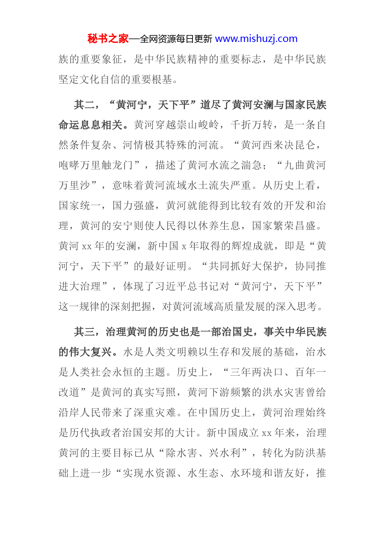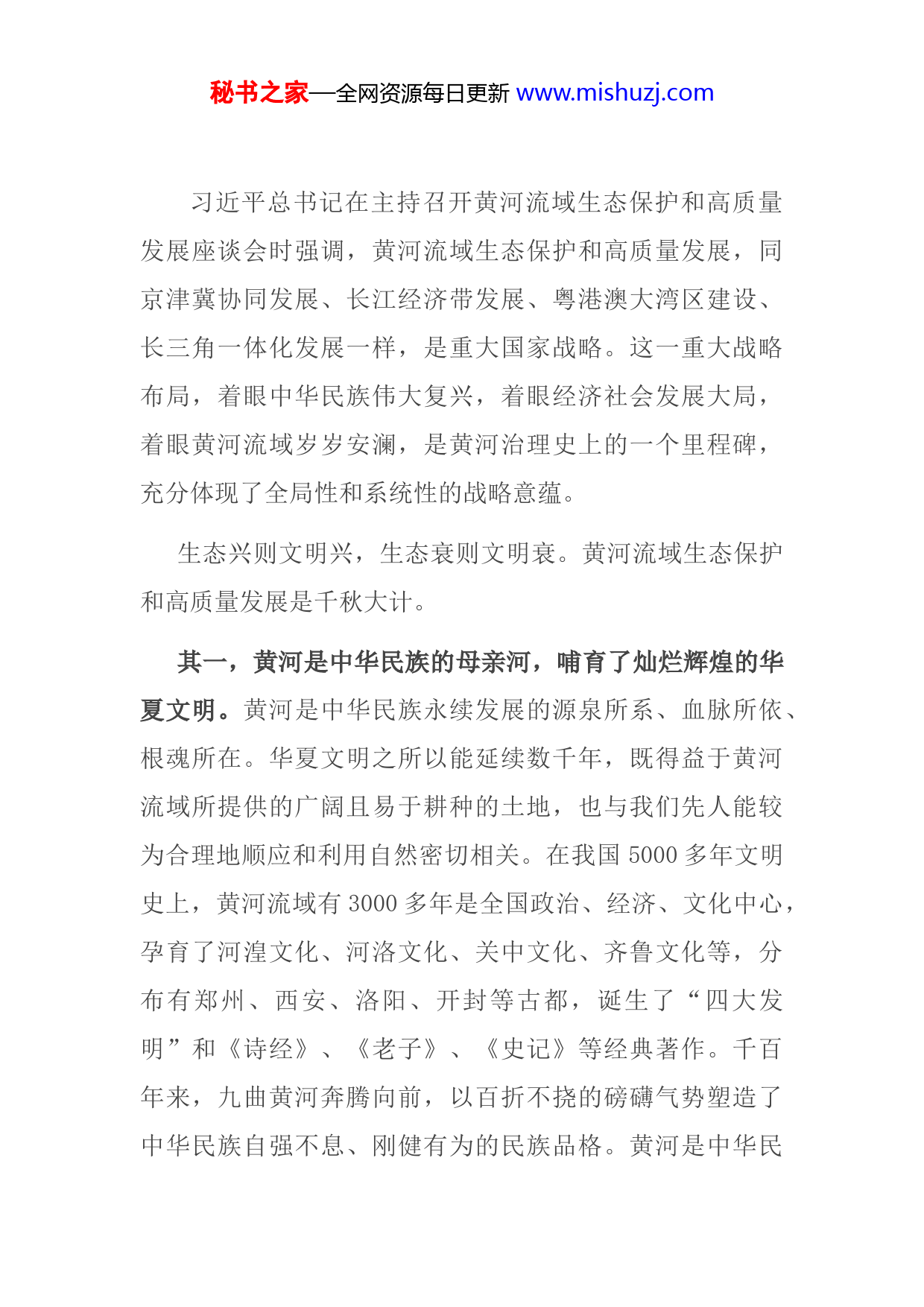 秘书之家—全网资源每日更新www.mishuzj.com习近平总书记在主持召开黄河流域生态保护和高质量发展座谈会时强调,黄河流域生态保护和高质量发展,同京津冀协同发展、长江经济带发展、粤港澳大湾区建设、长三角一体化发展一样,是重大国家战略。这一重大战略布局,着眼中华民族伟大复兴,着眼经济社会发展大局,着眼黄河流域岁岁安澜,是黄河治理史上的一个里程碑,充分体现了全局性和系统性的战略意蕴。生态兴则文明兴,生态衰则文明衰。黄河流域生态保护和高质量发展是千秋大计。其一,黄河是中华民族的母亲河,哺育了灿烂辉煌的华夏文明。黄河是中华民族永续发展的源泉所系、血脉所依、根魂所在。华夏文明之所以能延续数千年,既得益于黄河流域所提供的广阔且易于耕种的土地,也与我们先人能较为合理地顺应和利用自然密切相关。在我国5000多年文明史上,黄河流域有3000多年是全国政治、经济、文化中心,孕育了河湟文化、河洛文化、关中文化、齐鲁文化等,分布有郑州、西安、洛阳、开封等古都,诞生了“四大发明”和《诗经》、《老子》、《史记》等经典著作。千百年来,九曲黄河奔腾向前,以百折不挠的磅礴气势塑造了中华民族自强不息、刚健有为的民族品格。黄河是中华民秘书之家—全网资源每日更新www.mishuzj.com族的重要象征,是中华民族精神的重要标志,是中华民族坚定文化自信的重要根基。其二,“黄河宁,天下平”道尽了黄河安澜与国家民族命运息息相关。黄河穿越崇山峻岭,千折万转,是一条自然条件复杂、河情极其特殊的河流。“黄河西来决昆仑,咆哮万里触龙门”,描述了黄河水流之湍急;“九曲黄河万里沙”,意味着黄河流域水土流失严重。从历史上看,国家统一,国力强盛,黄河就能得到比较有效的开发和治理,黄河的安宁则使人民得以休养生息,国家繁荣昌盛。黄河xx年的安澜,新中国x年取得的辉煌成就,即是“黄河宁,天下平”的最好证明。“共同抓好大保护,协同推进大治理”,体现了习近平总书记对“黄河宁,天下平”这一规律的深刻把握,对黄河流域高质量发展的深入思考。其三,治理黄河的历史也是一部治国史,事关中华民族的伟大复兴。水是人类文明赖以生存和发展的基础,治水是人类社会永恒的主题。历史上,“三年两决口、百年一改道”是黄河的真实写照,黄河下游频繁的洪水灾害曾给沿岸人民带来了深重灾难。在中国历史上,黄河治理始终是历代执政者治国安邦的大计。新中国成立xx年来,治理黄河的主要目标已从“除水害、兴水利”,转化为防洪基础上进一步“实现水资源、水生态、水环境和谐友好,推秘书之家—全网资源每日更新www.mishuzj.com进黄河流域高质量发展”。如果说传统社会的治水关系到民族生存和国家兴亡,那么新时代黄河流域生态保护和高质量发展则关系到中华民族的伟大复兴。从全局性讲,黄河流域生态保护和高质量发展事关我国经济社会发展和生态安全。黄河流域是我国重要的生态屏障和重要的经济地带,是打赢脱贫攻坚战的重要区域,在我国经济社会发展和生态安全方面具有十分重要的地位。一是事关打造我国重要生态屏障。黄河流域是我国重要的生态屏障,是我国xx、xx地区的重要水源,从上游到下游,连通xx、xx和渤海,是一条连接了三江源、祁连山、汾渭平原、xx平原等一系列“生态高地”的巨型生态廊道,水资源和生态功能极为重要。但是,黄河一直体弱多病,水患频繁、洪水风险威胁较大、生态环境脆弱、水资源保障形势严峻、发展质量有待提高是黄河流域存在的突出问题这些问题的存在,既有先天不足的自然因素,更有后天失养的人为因素,表象在黄河,根子在流域。筑牢黄河流域生态屏障,既有利于减少水土流失、改善水源涵养、确保黄河生态安全,推进黄河流域高质量发展,更有利于为全流域人民提供清新的空气、清洁的水源、洁净的土壤、宜人的气候等诸多生态产品。秘书之家—全网资源每日更新www.mishuzj.com二是事关我国经济高质量发展。遵循经济规律,推动经济高质量发展,是实现社会主义现代化强国的必然选择。黄河流域是我国重要的粮食生产核心区、能源富集区,是化工、原材料和基础工业基地,在全国经济社会发展和生态文明建设格局中具有举足轻重的战略地位。然而,随着全球气候变化和人类活动的过度拓展,黄河流域既出现了水资源短缺、水环境污染、水资源开发利用率过高等问题,也出现了黄河流域与长江流域相比发展不平衡、黄河上中游x省区发展不充分等问题。黄河流域生态保护和高质量发展有利于促进经济发展从量的积累转向质的提升。三是事关打赢脱贫攻坚战。坚决打赢脱贫攻坚战,让贫困人口和贫困地区同全国一道进入全面小康社会是我们党的庄严承诺。由于历史、自然条件等多方面原因,黄河流域经济社会发展相对滞后,特别是上中游地区和下游滩区是我国贫困人口相对集中的区域。全国xx个集中连片特困地区有x个涉及黄河流域,且黄河流域有诸多承载生态功能的区域,这些区域与贫困人口分布高度重叠,打赢脱贫攻坚战的任务非常艰巨。黄河流域生态保护和高质量发展,既有利于解决好流域人民群众关心的防洪安全、饮水安全和生态安全等问题,也有利于贫困人口通过参与生态保护生态修复工程建设和发展生态产业,提高经济收入水平