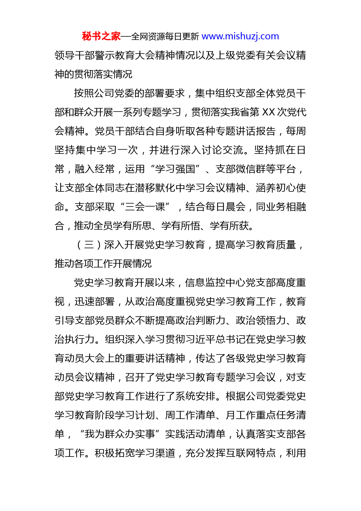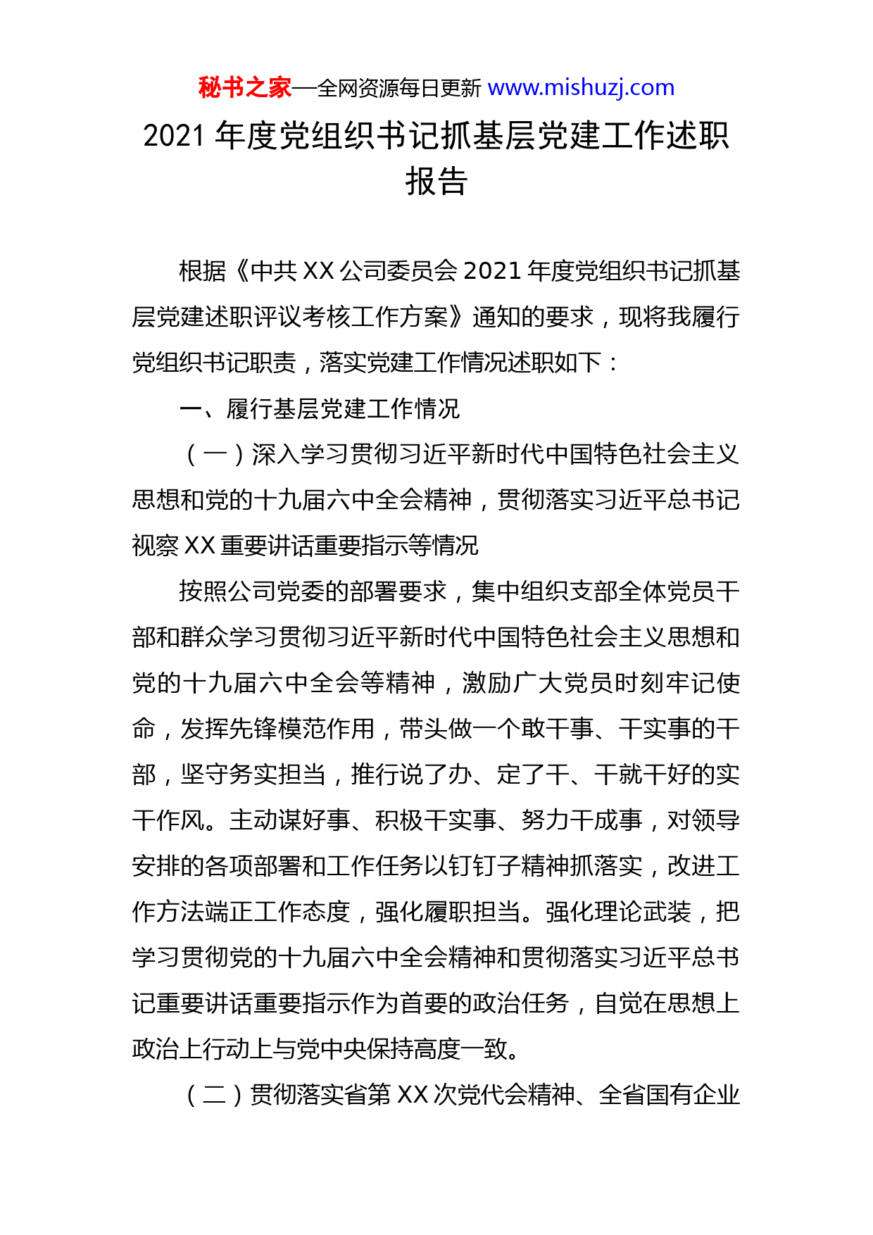秘书之家—全网资源每日更新www.mishuzj.com2021年度党组织书记抓基层党建工作述职报告根据《中共XX公司委员会2021年度党组织书记抓基层党建述职评议考核工作方案》通知的要求,现将我履行党组织书记职责,落实党建工作情况述职如下:一、履行基层党建工作情况(一)深入学习贯彻习近平新时代中国特色社会主义思想和党的十九届六中全会精神,贯彻落实习近平总书记视察XX重要讲话重要指示等情况按照公司党委的部署要求,集中组织支部全体党员干部和群众学习贯彻习近平新时代中国特色社会主义思想和党的十九届六中全会等精神,激励广大党员时刻牢记使命,发挥先锋模范作用,带头做一个敢干事、干实事的干部,坚守务实担当,推行说了办、定了干、干就干好的实干作风。主动谋好事、积极干实事、努力干成事,对领导安排的各项部署和工作任务以钉钉子精神抓落实,改进工作方法端正工作态度,强化履职担当。强化理论武装,把学习贯彻党的十九届六中全会精神和贯彻落实习近平总书记重要讲话重要指示作为首要的政治任务,自觉在思想上政治上行动上与党中央保持高度一致。(二)贯彻落实省第XX次党代会精神、全省国有企业秘书之家—全网资源每日更新www.mishuzj.com领导干部警示教育大会精神情况以及上级党委有关会议精神的贯彻落实情况按照公司党委的部署要求,集中组织支部全体党员干部和群众开展一系列专题学习,贯彻落实我省第XX次党代会精神。党员干部结合自身听取各种专题讲话报告,每周坚持集中学习一次,并进行深入讨论交流。坚持抓在日常,融入经常,运用“学习强国”、支部微信群等平台,让支部全体同志在潜移默化中学习会议精神、涵养初心使命。支部采取“三会一课”,结合每日晨会,同业务相融合,推动全员学有所思、学有所悟、学有所获。(三)深入开展党史学习教育,提高学习教育质量,推动各项工作开展情况党史学习教育开展以来,信息监控中心党支部高度重视,迅速部署,从政治高度重视党史学习教育工作,教育引导支部党员群众不断提高政治判断力、政治领悟力、政治执行力。组织深入学习贯彻习近平总书记在党史学习教育动员大会上的重要讲话精神,传达了各级党史学习教育动员会议精神,召开了党史学习教育专题学习会议,对支部党史学习教育工作进行了系统安排。根据公司党委党史学习教育阶段学习计划、周工作清单、月工作重点任务清单,“我为群众办实事”实践活动清单,认真落实支部各项工作。积极拓宽学习渠道,充分发挥互联网特点,利用秘书之家—全网资源每日更新www.mishuzj.com“学习强国”、“党史学习教育专题栏目”学习,做到应学尽学,切实加强理论学习。通过集中学习、个人自学、研讨交流、专题学习、观看视频等形式,支部共开展集中学习36次,专题学习27次,讨论交流8次,组织视频观看23次。(四)党建工作项目化开展情况XX党支部围绕公司党建项目工作要求,结合工作实际,推进党建和业务深度融合,开展创建交通事件管理系统精准填报创优班组活动。一是加强培训学习机制。三月初,全员参加了XX集团路网应急指挥中心培训学习,深度学习了XX事件管理系统精准填报工作,全面梳理了XX事件管理系统填报中出现的问题和需要改进的方面,有效解决了填报实操过程中遇到的问题。5月25日,组织开展“提升信息工作质量,助力XX安全畅通”培训,进一步加强信息报送工作力度,提升信息报送工作质量。二是严格信息填报机制。进一步明确XX事件填报的原则、信息报送的范围和内容、报送时限和程序、填报的细节注意之处,建立XX事件填报考核考评制度。三是提高学习贯彻机制。每日召开晨会,及时传达学习有关XX事件填报事项的变更要求,熟悉各项规定要求并严格落实。(五)落实公司党委决策部署,疫情防控开展情况XX党支部认真贯彻落实公司党委各项决策部署,支部秘书之家—全网资源每日更新www.mishuzj.com及时召开疫情防控工作安排部署会议,全面落实防控措施,鼓励并带领全体员工做好疫情防控工作,引导员工坚定信心,坚决做到思想上不放松,行动上与公司党委部署保持高度一致,充分发挥党员领导干部示范表率作用,主动担当作为,切实履行“第一责任人”责任。每日晨会强调全力做好疫情防控工作,各班组配发了消毒用品,每日消毒两次,认真打扫办公区域卫生,毫不放松疫情防控工作。今后将全力以赴持续抓好疫情常态化防控工作,用实际行动为防控工作的信息上传下达和道路的保畅贡献自己的力量。(六)履行党建责任职责,落实党风廉政建设、意识形态工作责任情况XX党支部坚决贯彻公司党委部署,紧紧围绕全年党建目标责任和要求,全面从严治党,坚持把党建、党风廉政建设工作同业务同研究、同部署、同落实,知责、履责、尽责,加强基层党建、党风廉政建设、意识形态工作各项任务。作为支部书记,本人将始终牢记职务即是责任,不断强化党组核心建设,切实抓好政治履职。在思想上、政治上、行动上与上级党委和公司党委保持高度统一,认真贯彻执行公司党委关于基层党建工作的决议、决定和指示,研究制定基层党建工作计划、制度和措施,安排部署年度工作任务,并组织实施。加强自身建设,在思想认识秘书之家—全网资源每日更新www.mishuzj.com提高上、工作能力提升上、解决实际问题和困难上,抓