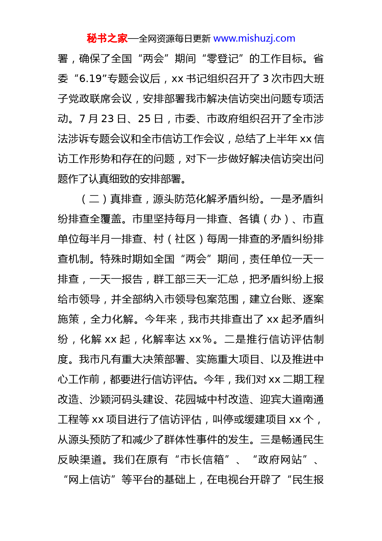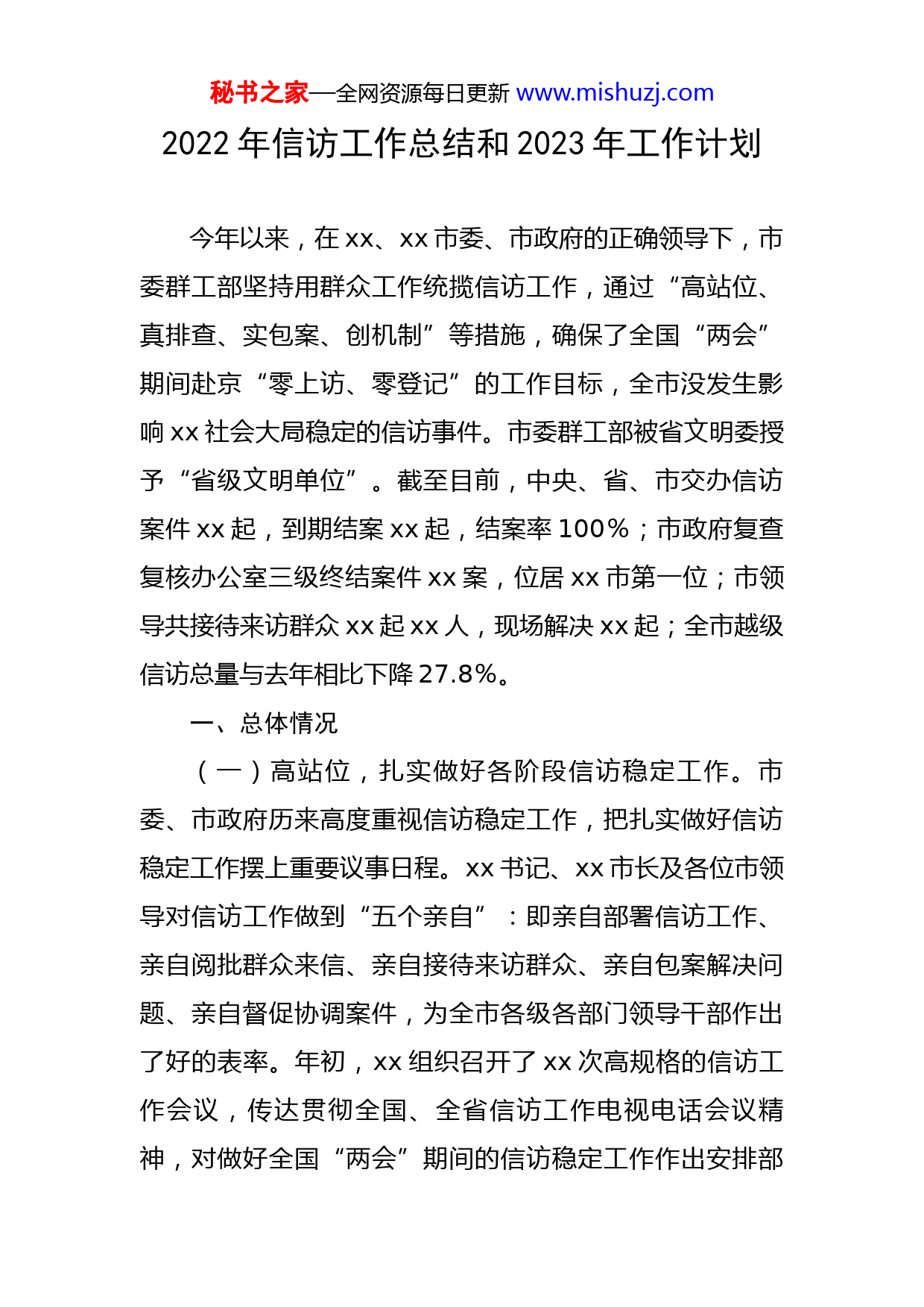 秘书之家—全网资源每日更新www.mishuzj.com2022年信访工作总结和2023年工作计划今年以来,在xx、xx市委、市政府的正确领导下,市委群工部坚持用群众工作统揽信访工作,通过“高站位、真排查、实包案、创机制”等措施,确保了全国“两会”期间赴京“零上访、零登记”的工作目标,全市没发生影响xx社会大局稳定的信访事件。市委群工部被省文明委授予“省级文明单位”。截至目前,中央、省、市交办信访案件xx起,到期结案xx起,结案率100%;市政府复查复核办公室三级终结案件xx案,位居xx市第一位;市领导共接待来访群众xx起xx人,现场解决xx起;全市越级信访总量与去年相比下降27.8%。一、总体情况(一)高站位,扎实做好各阶段信访稳定工作。市委、市政府历来高度重视信访稳定工作,把扎实做好信访稳定工作摆上重要议事日程。xx书记、xx市长及各位市领导对信访工作做到“五个亲自”:即亲自部署信访工作、亲自阅批群众来信、亲自接待来访群众、亲自包案解决问题、亲自督促协调案件,为全市各级各部门领导干部作出了好的表率。年初,xx组织召开了xx次高规格的信访工作会议,传达贯彻全国、全省信访工作电视电话会议精神,对做好全国“两会”期间的信访稳定工作作出安排部秘书之家—全网资源每日更新www.mishuzj.com署,确保了全国“两会”期间“零登记”的工作目标。省委“6.19”专题会议后,xx书记组织召开了3次市四大班子党政联席会议,安排部署我市解决信访突出问题专项活动。7月23日、25日,市委、市政府组织召开了全市涉法涉诉专题会议和全市信访工作会议,总结了上半年xx信访工作形势和存在的问题,对下一步做好解决信访突出问题作了认真细致的安排部署。(二)真排查,源头防范化解矛盾纠纷。一是矛盾纠纷排查全覆盖。市里坚持每月一排查、各镇(办)、市直单位每半月一排查、村(社区)每周一排查的矛盾纠纷排查机制。特殊时期如全国“两会”期间,责任单位一天一排查,一天一报告,群工部三天一汇总,把矛盾纠纷上报给市领导,并全部纳入市领导包案范围,建立台账、逐案施策,全力化解。今年来,我市共排查出了xx起矛盾纠纷,化解xx起,化解率达xx%。二是推行信访评估制度。我市凡有重大决策部署、实施重大项目、以及推进中心工作前,都要进行信访评估。今年,我们对xx二期工程改造、沙颖河码头建设、花园城中村改造、迎宾大道南通工程等xx项目进行了信访评估,叫停或缓建项目xx个,从源头预防了和减少了群体性事件的发生。三是畅通民生反映渠道。我们在原有“市长信箱”、“政府网站”、“网上信访”等平台的基础上,在电视台开辟了“民生报秘书之家—全网资源每日更新www.mishuzj.com道”、“电视问政”等栏目,通过新闻媒体监督解决信访难题。如今年xx月,xx书记接待xx花园小区业主办理房产证问题,长达xx年,一直无果,xx同志立即安排信访部门联合电视台,对该信访事项进行电视跟踪报道,分阶段对市级包案领导和责任单位一把手电视采访,节目播出后,不到一个月全部办好。xx月,市民反映天气炎热,自来水却多次出现停水现象。市主要领导安排有关单位联合电视台对群众反映的该问题进行面对面调查。在媒体连续报道关注下,在较短的时间内解决了群众反映的问题。同时对有关负责人的不作为、慢作为给予了相应查处,赢得了群众的好评。今年以来,“市长信箱”解决问题xx条,“网上信访”办理xx案,“民生报道”近xx起涉及民生的事件得到解决。(三)实包案,开展接访处访化解难题。xx书记、xx市长带头接访、约访、下访信访案件,xx书记接待群众xx起xx人,xx市长接待群众xx起xx人,有效化解了重点疑难信访问题。一是研判解决信访难题。3月7日、9月9日,xx书记、xx市长组织召开了xx次全市重点疑难信访案件研判会,市四个班子领导、有关镇办、市直单位负责人参加了会议,会议对全市xx起重点疑难案件逐一进行研判,逐一落实责任,明确化解时限。9月9日,xx书记亲自把30块领导包案“责任牌”发放给有关镇(办)和市直秘书之家—全网资源每日更新www.mishuzj.com单位,要求市领导和责任单位负责人切实负起责任,限期解决。其他市委、市政府领导xx召开了xx余次信访联席会议,研究解决分包的信访案件。二是加强案件督查督办。下半年,我市全力配合省督导组开展工作,对省督办xx起重点信访案件做到“四明确、一到位”即:明确领导,明确责任,明确处理意见,明确时限,处理到位。并在规定时间内,全部给予化解结案。同时,对xx个责任单位给予全市通报批评,公安部门依法刑事拘留xx人,行政拘留xx人。三是开展信访专项治理活动。我市集中开展了三项专题活动,7月为“矛盾纠纷集中排查化解月”;8月为“信访重点案件集中化解月”;9月为“信访疑难案件集中研判月”。对今年发生的越级上访案件,全部实施“五个一”机制,即:即“一名包案领导,一个工作班子,一套化解方案,一份研判纪要,一套稳控措施”。并实行了定任务、定时间、定人员、包稳定的“三定一包”责任制,包案领导一包到底,直至问题处理结束。(四)创机制,努力推动信访工作上台阶。一是落实首问责任制。市委出台了《xx年全市信访工作意见》,建立了“条块结合、以块为主”的信访管理机制,严格落实责任单位负责人首问、首办责任制,保证在第一时间、第一地点解决好群众