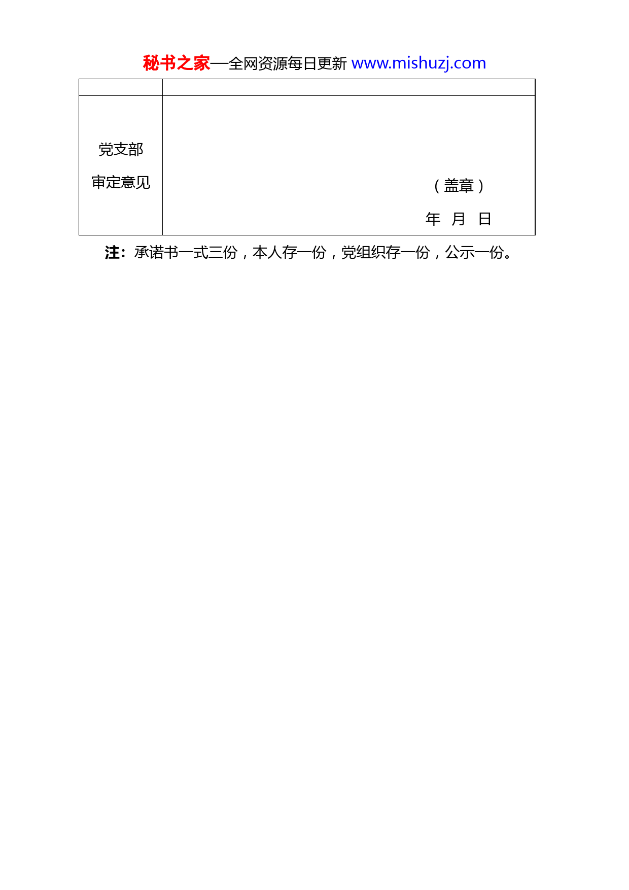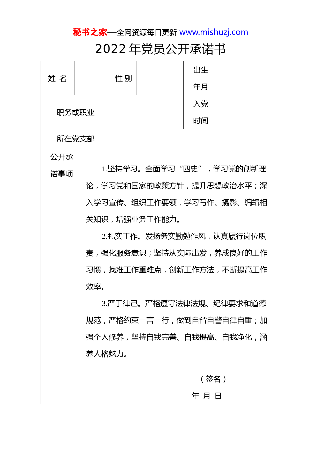 秘书之家—全网资源每日更新www.mishuzj.com2022年党员公开承诺书姓名性别出生年月职务或职业入党时间所在党支部公开承诺事项1.坚持学习。全面学习“四史”,学习党的创新理论,学习党和国家的政策方针,提升思想政治水平;深入学习宣传、组织工作要领,学习写作、摄影、编辑相关知识,增强业务工作能力。2.扎实工作。发扬务实勤勉作风,认真履行岗位职责,强化服务意识;坚持从实际出发,养成良好的工作习惯,找准工作重难点,创新工作方法,不断提高工作效率。3.严于律己。严格遵守法律法规、纪律要求和道德规范,严格约束一言一行,做到自省自警自律自重;加强个人修养,坚持自我完善、自我提高、自我净化,涵养人格魅力。(签名)年月日秘书之家—全网资源每日更新www.mishuzj.com党支部审定意见(盖章)年月日注:承诺书一式三份,本人存一份,党组织存一份,公示一份。