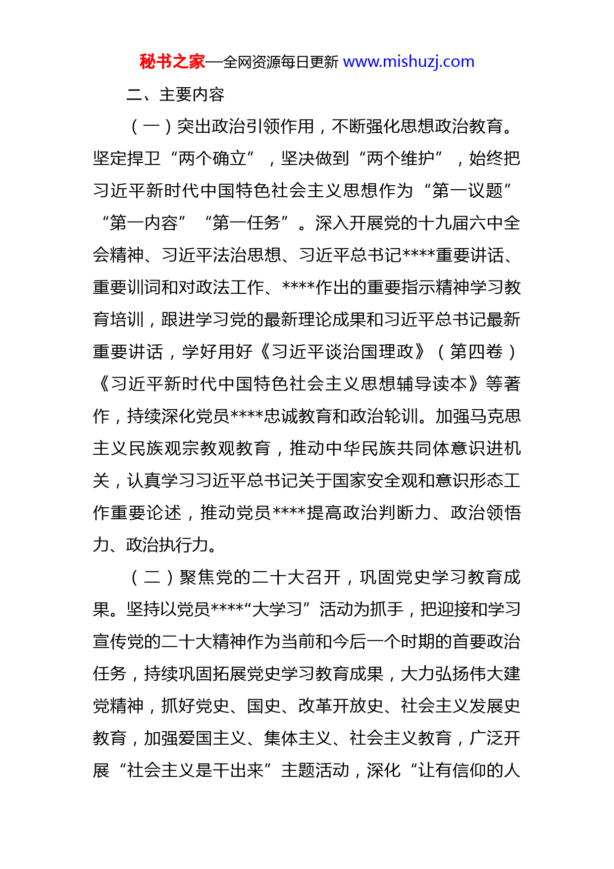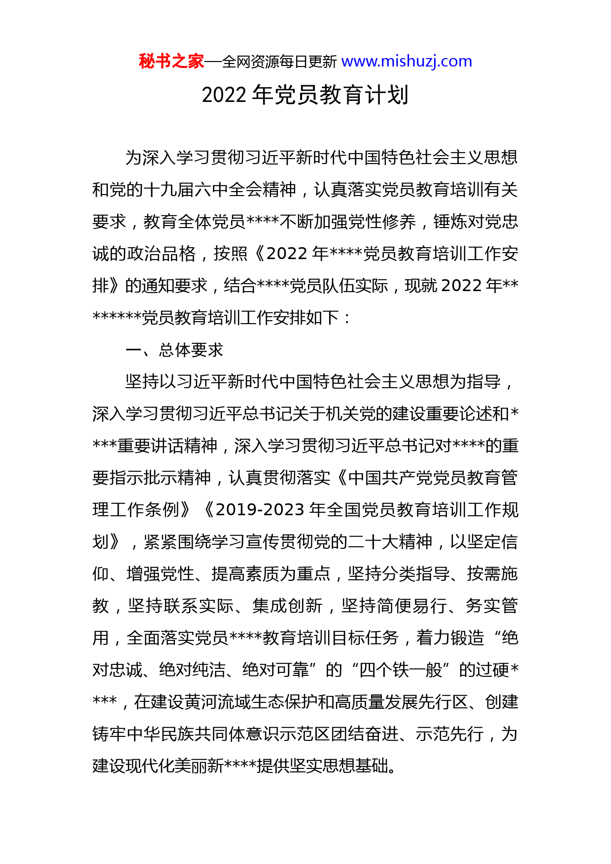 秘书之家—全网资源每日更新www.mishuzj.com2022年党员教育计划为深入学习贯彻习近平新时代中国特色社会主义思想和党的十九届六中全会精神,认真落实党员教育培训有关要求,教育全体党员不断加强党性修养,锤炼对党忠诚的政治品格,按照《2022年党员教育培训工作安排》的通知要求,结合党员队伍实际,现就2022年党员教育培训工作安排如下:一、总体要求坚持以习近平新时代中国特色社会主义思想为指导,深入学习贯彻习近平总书记关于机关党的建设重要论述和重要讲话精神,深入学习贯彻习近平总书记对的重要指示批示精神,认真贯彻落实《中国共产党党员教育管理工作条例》《2019-2023年全国党员教育培训工作规划》,紧紧围绕学习宣传贯彻党的二十大精神,以坚定信仰、增强党性、提高素质为重点,坚持分类指导、按需施教,坚持联系实际、集成创新,坚持简便易行、务实管用,全面落实党员教育培训目标任务,着力锻造“绝对忠诚、绝对纯洁、绝对可靠”的“四个铁一般”的过硬,在建设黄河流域生态保护和高质量发展先行区、创建铸牢中华民族共同体意识示范区团结奋进、示范先行,为建设现代化美丽新提供坚实思想基础。秘书之家—全网资源每日更新www.mishuzj.com二、主要内容(一)突出政治引领作用,不断强化思想政治教育。坚定捍卫“两个确立”,坚决做到“两个维护”,始终把习近平新时代中国特色社会主义思想作为“第一议题”“第一内容”“第一任务”。深入开展党的十九届六中全会精神、习近平法治思想、习近平总书记重要讲话、重要训词和对政法工作、作出的重要指示精神学习教育培训,跟进学习党的最新理论成果和习近平总书记最新重要讲话,学好用好《习近平谈治国理政》(第四卷)《习近平新时代中国特色社会主义思想辅导读本》等著作,持续深化党员忠诚教育和政治轮训。加强马克思主义民族观宗教观教育,推动中华民族共同体意识进机关,认真学习习近平总书记关于国家安全观和意识形态工作重要论述,推动党员提高政治判断力、政治领悟力、政治执行力。(二)聚焦党的二十大召开,巩固党史学习教育成果。坚持以党员“大学习”活动为抓手,把迎接和学习宣传党的二十大精神作为当前和今后一个时期的首要政治任务,持续巩固拓展党史学习教育成果,大力弘扬伟大建党精神,抓好党史、国史、改革开放史、社会主义发展史教育,加强爱国主义、集体主义、社会主义教育,广泛开展“社会主义是干出来”主题活动,深化“让有信仰的人秘书之家—全网资源每日更新www.mishuzj.com讲信仰”“我为群众办实事”活动,教育引导广大党员干部铭记党的奋斗历程,弘扬党的优良传统,传承红色基因,践行共产党人价值观,为党的二十大胜利召开奠定坚实基础。(三)围绕服务中心工作,扎实开展形势政策教育。紧紧围绕扎实开展“喜迎二十大、忠诚保平安”主题实践活动,聚焦“一个总目标”,紧扣“三条主线”,打好“六大战役”,实现“四个全面提升”等重点工作,认真贯彻落实建设黄河流域生态保护和高质量发展先行区、创建铸牢中华民族共同体意识示范区等重要决策部署,重点学习宣传贯彻自治区第十三次党代会及自治区党委十二届十四次全会、市委六届第二次全会精神和全国、全区政法工作会议和会议精神,及时传达学习自治区、市、党委和上级机关重要工作会议活动、重要文件精神,引导党员把思想和行动统一到上级党委的决策部署上来,推动各项工作落实落地。(四)着眼提升道德修养,深化核心价值观教育。深入学习《新时代爱国主义教育实施纲要》《新时代公民道德建设实施纲要》,强化社会公德、职业道德、家庭美德、个人品德教育,积极推进社会主义核心价值观进机关。深化中国特色社会主义和中国梦及中华优秀传统文化宣传教育,大力推荐评选和学习宣传“时代楷模”“道德秘书之家—全网资源每日更新www.mishuzj.com模范”“最美人物”等先进典型,鼓励广大党员干部讲好中国故事,激发党员爱岗敬业、爱党爱国热情。(五)立足提升履职能力,持续开展知识技能教育。深入学习《中国共产党章程》《中国共产党党和国家机关基层组织工作条例》《中国共产党支部工作条例(试行)》等党内法规,学习中央、区、市三级纪委全会精神和全国、全区机关党风廉政和反腐败工作会议精神,持续开展“廉政警示教育周”活动,筑牢拒腐防变的思想防线。结合“八五”普法工作,重点学习《宪法》《民法典》等法律法规,依宪依法依规履职。围绕贯彻落实“坚持人民至上”理念,严格落实“双报到双服务”,带动基层党组织和党员主动融入基层治理,切实提升基层治理能力。结合岗位职能职责和业务特点,加大全员普训、尖刀特训、岗位专训力度,做到业务过硬、本领高强。积极参加举办的“奋进新征程,建功新时代”大比武大竞赛,激励干部比能力、比作为、比奉献、比担当,在践行为民服务宗旨中当先锋做表率。三、方式方法(一)突出重点,分类施教。重点围绕学习宣传贯彻党的二十大精神、建设“让党中央放心、让人民群众满意”模范机关等重要任务,通过“请进来”和“走出去”方式,依托政治轮训班,分分部门分阶段加强基秘书之家—全网资源每日更新www.mishuzj.com层党组织书记和党务干部、发展对象、新党员、科级干部等教