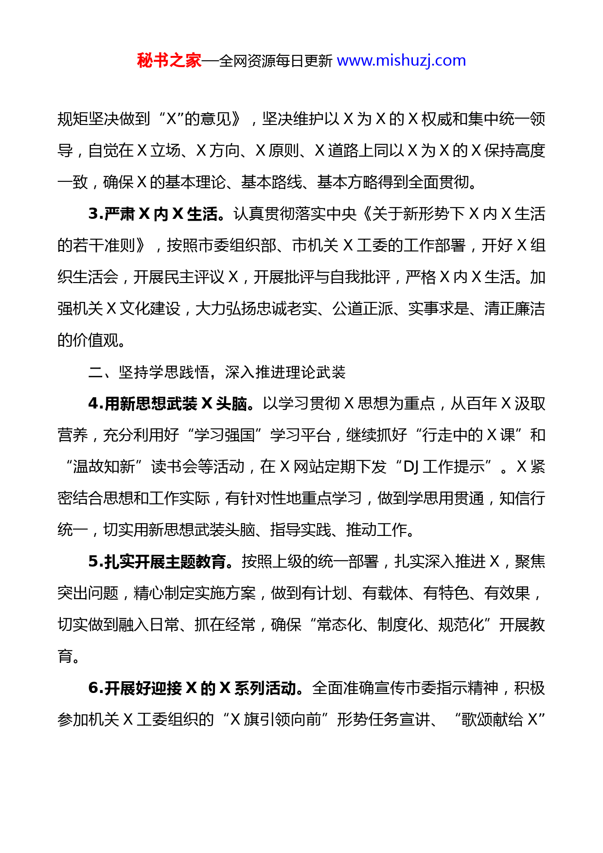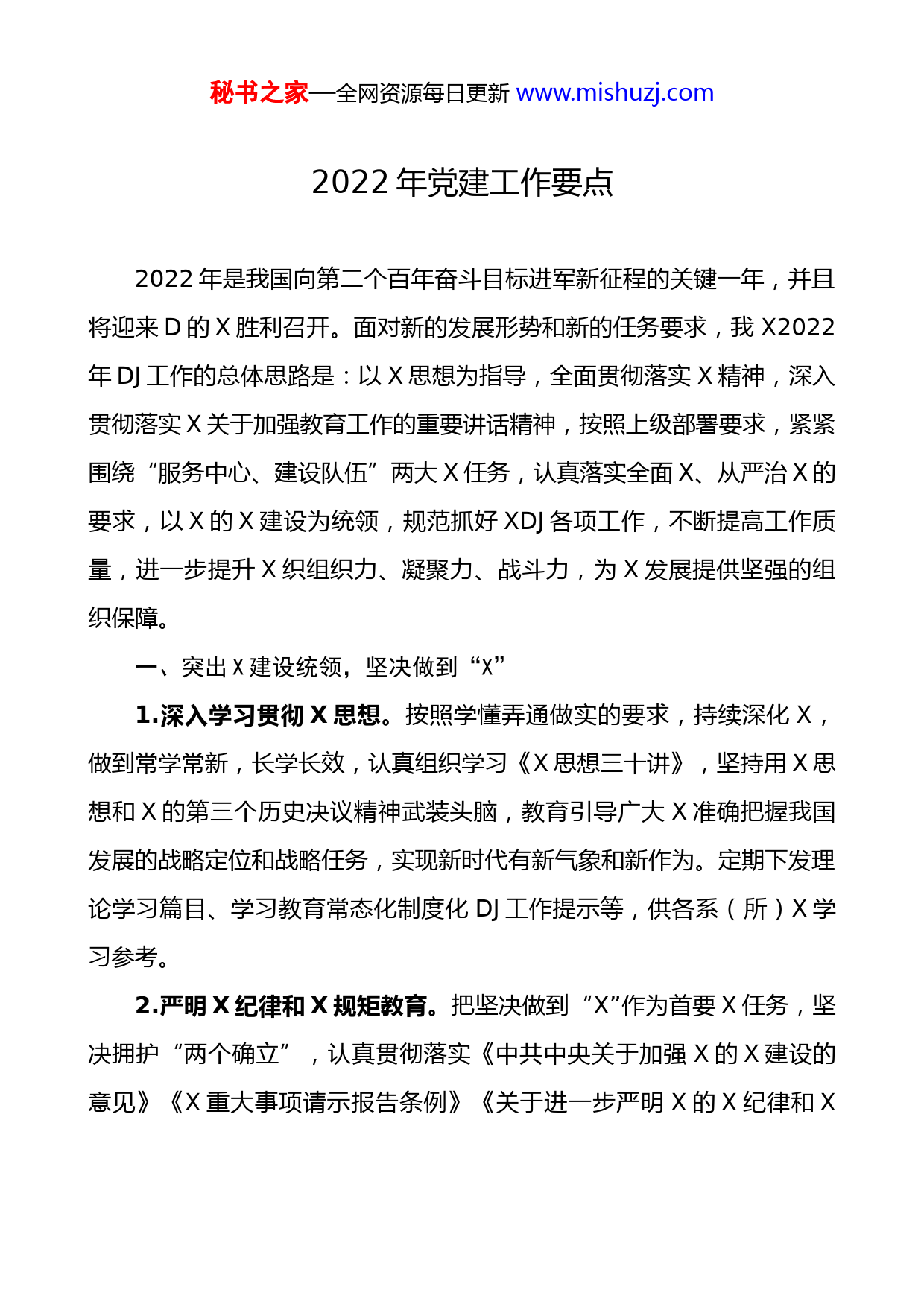 秘书之家—全网资源每日更新www.mishuzj.com2022年党建工作要点2022年是我国向第二个百年奋斗目标进军新征程的关键一年,并且将迎来D的X胜利召开。面对新的发展形势和新的任务要求,我X2022年DJ工作的总体思路是:以X思想为指导,全面贯彻落实X精神,深入贯彻落实X关于加强教育工作的重要讲话精神,按照上级部署要求,紧紧围绕“服务中心、建设队伍”两大X任务,认真落实全面X、从严治X的要求,以X的X建设为统领,规范抓好XDJ各项工作,不断提高工作质量,进一步提升X织组织力、凝聚力、战斗力,为X发展提供坚强的组织保障。一、突出X建设统领,坚决做到“X”1.深入学习贯彻X思想。按照学懂弄通做实的要求,持续深化X,做到常学常新,长学长效,认真组织学习《X思想三十讲》,坚持用X思想和X的第三个历史决议精神武装头脑,教育引导广大X准确把握我国发展的战略定位和战略任务,实现新时代有新气象和新作为。定期下发理论学习篇目、学习教育常态化制度化DJ工作提示等,供各系(所)X学习参考。2.严明X纪律和X规矩教育。把坚决做到“X”作为首要X任务,坚决拥护“两个确立”,认真贯彻落实《中共中央关于加强X的X建设的意见》《X重大事项请示报告条例》《关于进一步严明X的X纪律和X秘书之家—全网资源每日更新www.mishuzj.com规矩坚决做到“X”的意见》,坚决维护以X为X的X权威和集中统一领导,自觉在X立场、X方向、X原则、X道路上同以X为X的X保持高度一致,确保X的基本理论、基本路线、基本方略得到全面贯彻。3.严肃X内X生活。认真贯彻落实中央《关于新形势下X内X生活的若干准则》,按照市委组织部、市机关X工委的工作部署,开好X组织生活会,开展民主评议X,开展批评与自我批评,严格X内X生活。加强机关X文化建设,大力弘扬忠诚老实、公道正派、实事求是、清正廉洁的价值观。二、坚持学思践悟,深入推进理论武装4.用新思想武装X头脑。以学习贯彻X思想为重点,从百年X汲取营养,充分利用好“学习强国”学习平台,继续抓好“行走中的X课”和“温故知新”读书会等活动,在X网站定期下发“DJ工作提示”。X紧密结合思想和工作实际,有针对性地重点学习,做到学思用贯通,知信行统一,切实用新思想武装头脑、指导实践、推动工作。5.扎实开展主题教育。按照上级的统一部署,扎实深入推进X,聚焦突出问题,精心制定实施方案,做到有计划、有载体、有特色、有效果,切实做到融入日常、抓在经常,确保“常态化、制度化、规范化”开展教育。6.开展好迎接X的X系列活动。全面准确宣传市委指示精神,积极参加机关X工委组织的“X旗引领向前”形势任务宣讲、“歌颂献给X”秘书之家—全网资源每日更新www.mishuzj.com诗歌征集暨朗诵会、“成就”摄影作品征集展览、“奋斗”读书会作品征集、“话说我心中的X”座谈会等为主要内容的喜迎X的X系列活动。组织各X开展在X主题X日活动,安排参观革命教育基地,弘扬X人的首创精神、奋斗精神和奉献精神,加强对X忠诚老实教育和X性锻炼,激励广大X悟初心、守初心、践初心,筑牢理想信念根基,坚守理想信仰。三、以组织力提升为重点,不断夯实X工作基础7.继续推进X标准化规范化建设。深入学习贯彻《X工作条例》《X工作条例》,贯彻落实《关于全面提升基层X织组织力的实施意见》,制定《关于进一步加强X规范化建设实施办法》,以创建基层XDJ工作示范点为抓手,严格规范“三会一课”、主题X日、谈心谈话等制度。积极筹备成立新调整X系X成立等工作,结合科研教学团队建设,探索在团队和人数较多的X成立X小组。做实做强主题X日,落实X学习日、“1+1+1”组织生活模式、过“X生日”等制度,不断增强X内X生活的X性、时代性、原则性和战斗性。8.严格落实DJ工作责任制。强化各级X织的主责主业意识,认真落实全面X“四责协同”机制,严格执行好DJ工作定期报告制度,把DJ工作作为最大政绩的要求落到实处,确保上级重大决策部署落地。突出严和实,严格落实好X述职评议考核,并强化考核结果运用,激励X履职尽责、担当作为,推动DJ主体责任有效落实。严格X发展的过程管理和工作程序,建立条理清晰、资料完备地发展X台账,确保发展X工作的真秘书之家—全网资源每日更新www.mishuzj.com实性、严肃性和规范性。严格规范X收缴、管理和使用,保证X使用的合理规范,提高使用效益,设定每月10日为X集中缴纳日。定期检查通报《X织工作手册》等DJ资料,督促规范各X台账工作,结合评先评优落实奖惩机制。9.加强领导,推进老干部、群团工作。认真落实老干部的X待遇、生活待遇,组织老干部开展有益身心健康的文体、考察活动,做好老干部学习服务保障工作。加强X对群团组织的领导,发挥好群团组织桥梁、纽带作用,组织开展“青春正好,献礼建团”“建功新时代、巾帼心助生态”系列活动,引导全体X不断增强“四个意识”、坚定“四个自信”,真正做到不忘初心、牢记使命、接力奋斗。四、围绕服务教学,激发创新创优动力10.持续开展向X学习活动。深化岗位建功主题实践活动,大力提倡勤勉务实、踏实肯干的工作精神,大力营造昂扬向上、敢为人先的工作氛围,大力宣传岗位有建树、普遍受认同的先进典型。按照新时代X“X式的好干部”“X式的好老师”“X式的好学生”的要求和标准,加强先进典型的培树、宣传和表彰,用先进典型引领广大X争