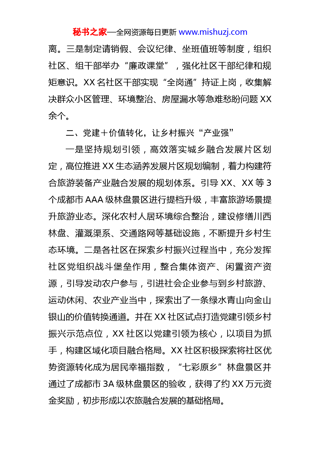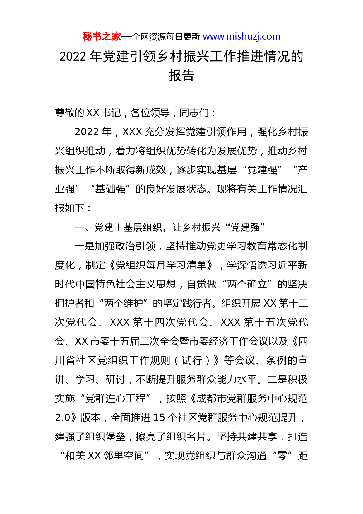 秘书之家—全网资源每日更新www.mishuzj.com2022年党建引领乡村振兴工作推进情况的报告尊敬的XX书记,各位领导,同志们:2022年,XXX充分发挥党建引领作用,强化乡村振兴组织推动,着力将组织优势转化为发展优势,推动乡村振兴工作不断取得新成效,逐步实现基层“党建强”“产业强”“基础强”的良好发展状态。现将有关工作情况汇报如下:一、党建+基层组织,让乡村振兴“党建强”一是加强政治引领,坚持推动党史学习教育常态化制度化,制定《党组织每月学习清单》,学深悟透习近平新时代中国特色社会主义思想,自觉做“两个确立”的坚决拥护者和“两个维护”的坚定践行者。组织开展XX第十二次党代会、XXX第十四次党代会、XXX第十五次党代会、XX市委十五届三次全会暨市委经济工作会议以及《四川省社区党组织工作规则(试行)》等会议、条例的宣讲、学习、研讨,不断提升服务群众能力水平。二是积极实施“党群连心工程”,按照《成都市党群服务中心规范2.0》版本,全面推进15个社区党群服务中心规范提升,建强了组织堡垒,擦亮了组织名片。坚持共建共享,打造“和美XX邻里空间”,实现党组织与群众沟通“零”距秘书之家—全网资源每日更新www.mishuzj.com离。三是制定请销假、会议纪律、坐班值班等制度,组织社区、组干部举办“廉政课堂”,强化社区干部纪律和规矩意识。XX名社区干部实现“全岗通”持证上岗,收集解决群众小区管理、环境整治、房屋漏水等急难愁盼问题XX余个。二、党建+价值转化,让乡村振兴“产业强”一是坚持规划引领,高效落实城乡融合发展片区划定,高位推进XX生态涵养发展片区规划编制,着力构建符合旅游装备产业融合发展的规划体系。引导XX、XX等3个成都市AAA级林盘景区进行提档升级,丰富旅游场景提升旅游业态。深化农村人居环境综合整治,建设修缮川西林盘、灌溉渠系、交通路网等基础设施,不断提升乡村生态环境。二是各社区在探索乡村振兴过程当中,充分发挥社区党组织战斗堡垒作用,整合集体资产、闲置资产资源,引导发动农户参与,引进社会企业参与到乡村旅游、运动休闲、农业产业当中,探索出了一条绿水青山向金山银山的价值转换通道。并在XX社区试点打造党建引领乡村振兴示范点位,XX社区以党建引领为核心,以项目为抓手,构建区域化项目融合格局。XX社区积极探索将社区优势资源转化成为居民幸福指数,“七彩原乡”林盘景区并通过了成都市3A级林盘景区的验收,获得了约XX万元资金奖励,初步形成以农旅融合发展的基础格局。秘书之家—全网资源每日更新www.mishuzj.com三、党建+乡村风貌,让乡村振兴“基础强”一是加快推进“多规合一”。积极实施“多规合一”连片编制乡村规划,划定街道4个中心社区、10个基层社区,完善以片区为单元的公共服务和基础设施布局;完成《XXX生态涵养及绿色发展片区国土空间总体规划》《XX国土空间总体规划》的资料收集、走访调研、初稿编制,为实施乡村各类开发保护建设活动及乡村振兴发展提供基本依据。二是深化文旅融合发展。全面梳理34个文旅产业,积极开展招商引资,重点推动峨山大坪、秋果酒店等域内重点文旅项目建设。积极推进文旅品牌建设,指导XX度假区、XX等提档升级,策划推出“XX最美踏青旅游路线”“诗画XX乡村摄影路线”等精品旅游线路X条,全年接待游客XX万人次,旅游综合收入XX余万元。三是强化社会综合治理。认真开展普法集中宣传活动X场,提供法律援助案件服务XX件;依托“1+3+N”专群模式,累计调解各类矛盾纠纷XXX件,化解率达100%,基本化解本级辖区内历史遗留风险问题X个。下一步,我们将按照市委统一工作部署,在市委组织部、市委农办等部门悉心指导下,聚焦产业兴民、服务惠民,在组织建设上强堡垒、在产业富民上添措施,在基层治理上出成效,把乡村振兴成果转化成为群众的幸福感、获得感。