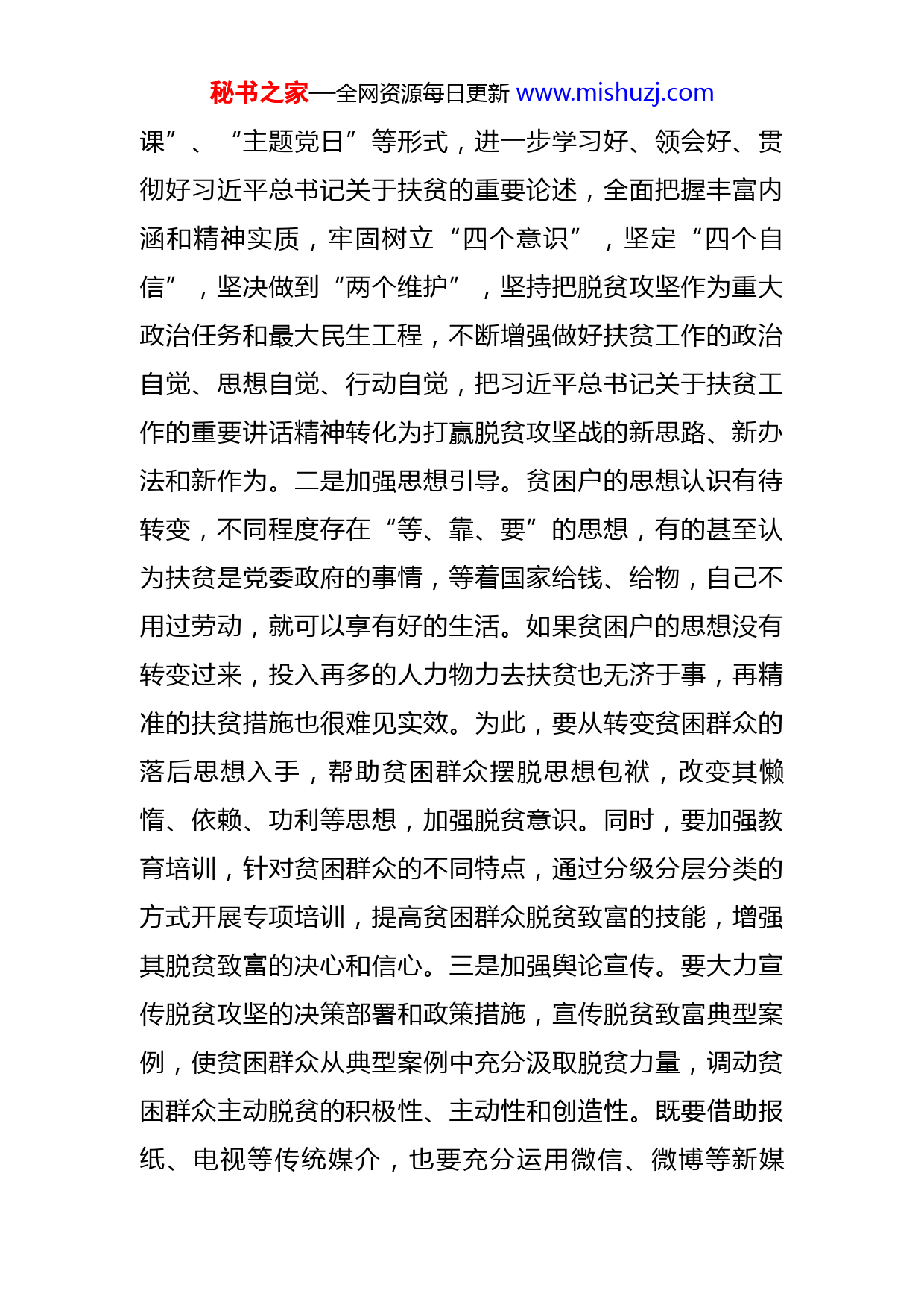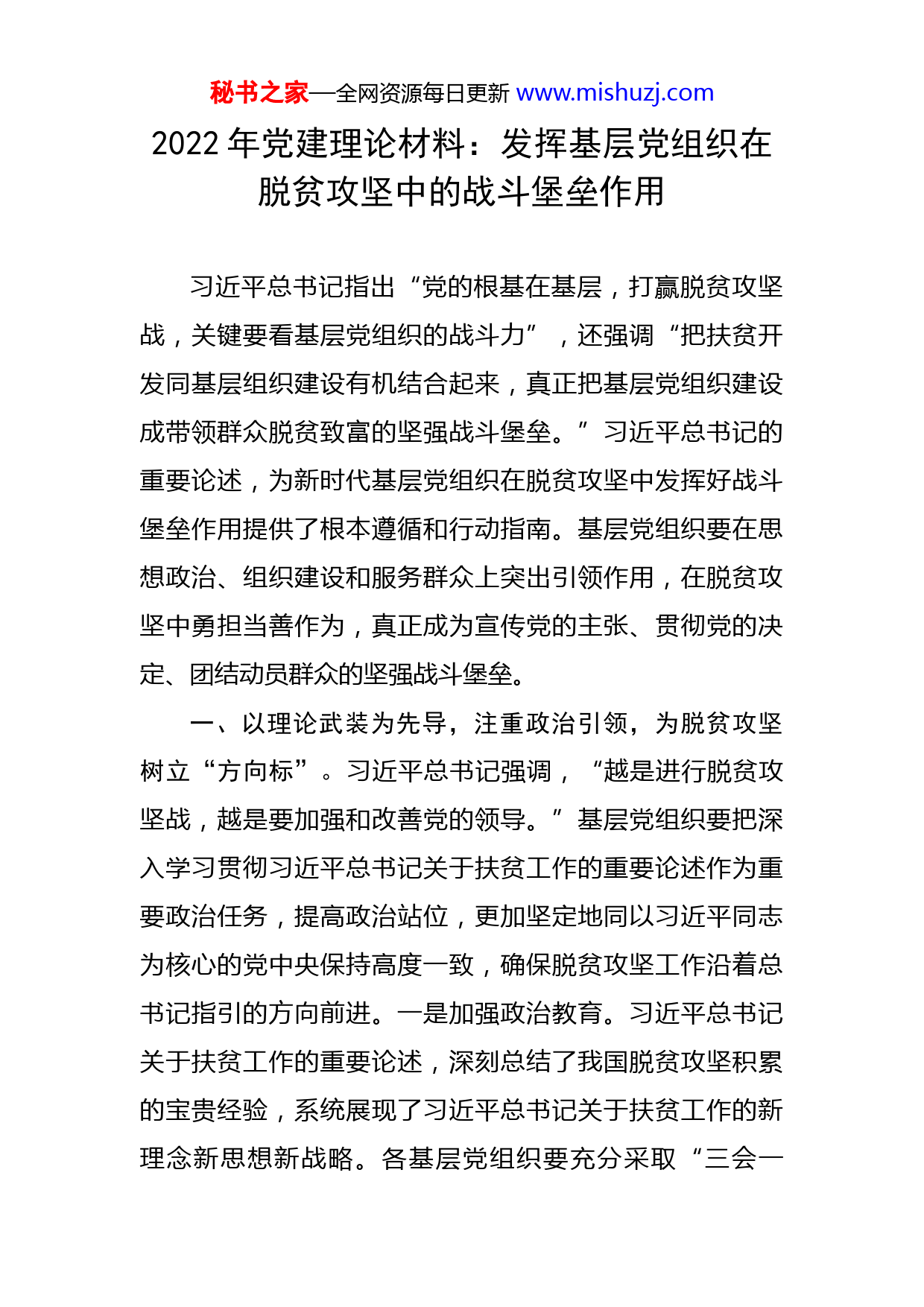 秘书之家—全网资源每日更新www.mishuzj.com2022年党建理论材料:发挥基层党组织在脱贫攻坚中的战斗堡垒作用习近平总书记指出“党的根基在基层,打赢脱贫攻坚战,关键要看基层党组织的战斗力”,还强调“把扶贫开发同基层组织建设有机结合起来,真正把基层党组织建设成带领群众脱贫致富的坚强战斗堡垒。”习近平总书记的重要论述,为新时代基层党组织在脱贫攻坚中发挥好战斗堡垒作用提供了根本遵循和行动指南。基层党组织要在思想政治、组织建设和服务群众上突出引领作用,在脱贫攻坚中勇担当善作为,真正成为宣传党的主张、贯彻党的决定、团结动员群众的坚强战斗堡垒。一、以理论武装为先导,注重政治引领,为脱贫攻坚树立“方向标”。习近平总书记强调,“越是进行脱贫攻坚战,越是要加强和改善党的领导。”基层党组织要把深入学习贯彻习近平总书记关于扶贫工作的重要论述作为重要政治任务,提高政治站位,更加坚定地同以习近平同志为核心的党中央保持高度一致,确保脱贫攻坚工作沿着总书记指引的方向前进。一是加强政治教育。习近平总书记关于扶贫工作的重要论述,深刻总结了我国脱贫攻坚积累的宝贵经验,系统展现了习近平总书记关于扶贫工作的新理念新思想新战略。各基层党组织要充分采取“三会一秘书之家—全网资源每日更新www.mishuzj.com课”、“主题党日”等形式,进一步学习好、领会好、贯彻好习近平总书记关于扶贫的重要论述,全面把握丰富内涵和精神实质,牢固树立“四个意识”,坚定“四个自信”,坚决做到“两个维护”,坚持把脱贫攻坚作为重大政治任务和最大民生工程,不断增强做好扶贫工作的政治自觉、思想自觉、行动自觉,把习近平总书记关于扶贫工作的重要讲话精神转化为打赢脱贫攻坚战的新思路、新办法和新作为。二是加强思想引导。贫困户的思想认识有待转变,不同程度存在“等、靠、要”的思想,有的甚至认为扶贫是党委政府的事情,等着国家给钱、给物,自己不用过劳动,就可以享有好的生活。如果贫困户的思想没有转变过来,投入再多的人力物力去扶贫也无济于事,再精准的扶贫措施也很难见实效。为此,要从转变贫困群众的落后思想入手,帮助贫困群众摆脱思想包袱,改变其懒惰、依赖、功利等思想,加强脱贫意识。同时,要加强教育培训,针对贫困群众的不同特点,通过分级分层分类的方式开展专项培训,提高贫困群众脱贫致富的技能,增强其脱贫致富的决心和信心。三是加强舆论宣传。要大力宣传脱贫攻坚的决策部署和政策措施,宣传脱贫致富典型案例,使贫困群众从典型案例中充分汲取脱贫力量,调动贫困群众主动脱贫的积极性、主动性和创造性。既要借助报纸、电视等传统媒介,也要充分运用微信、微博等新媒秘书之家—全网资源每日更新www.mishuzj.com体,并采取入户讲解、发放宣传资料、微宣讲等群众喜闻乐见的方式,营造人人参与扶贫的浓厚氛围。二、以组织建设为抓手,注重示范引领,为脱贫攻坚打造“生力军”。习近平总书记在中央扶贫开发工作会议上强调,“要把夯实农村基层党组织同脱贫攻坚有机结合起来,选好一把手、配强领导班子。”脱贫攻坚是一场持久战,推动基层党组织在脱贫工作中大显身手,要建好建强基层党组织,着力选拔一批政治品格好、群众威望高、带动能力强的基层组织带头人,充分发挥党员的示范效应,真正打造一支“不走的扶贫工作队”。一是建好基层党组织。农村富不富,关键看支部。要深入推进抓党建促脱贫攻坚行动,推动各级党组织聚焦薄弱环节,夯实打赢打好脱贫攻坚战的组织基础。针对农村基层党组织软弱涣散等突出问题,要大力整顿,切实提高其组织力。每个软弱涣散基层党组织可由一名党员厅级领导牵头、一名镇街主要领导包点整顿,有关部门单位给予工作支持,从而形成多方合力攻坚整顿,推动基层党组织全面加强、全面过硬,真正建设成为脱贫攻坚的坚强堡垒。二是选好配强党组织书记。俗话说:“支部强不强,全靠领头羊。”选优配强基层党组织书记,充分发挥其带领贫困群众致富奔小康的“领头羊”作用,是打赢脱贫攻坚战的重要前提。要加强对基层党组织书记的选拔工作,多渠道选好配强带头秘书之家—全网资源每日更新www.mishuzj.com人,注重从思想好、作风正、能力强的优秀企业干部、高校毕业生和复员退伍军人中选拔;要把基层党组织书记作为教育培训的重点,坚持缺什么培训什么、需要什么培训什么的原则,提高党组织书记扶贫攻坚能力,切实增强带领群众脱贫致富的本领。三是用好党员带动作用。用好共产党员,发挥共产党员的先锋模范作用,是打赢脱贫攻坚战的现实需要。党员干部要时刻牢记和践行为民服务宗旨、履职尽责,发扬冲锋在前、吃苦在先和滴水石穿的精神,保持一种如牛负重的使命感、一种时不我待的紧迫感、一种寝食难安的责任感,深入脱贫攻坚一线,带领群众一道苦干实干,助力全面建成小康社会。在脱贫攻坚工作中,党员干部要做群众的的智囊团、贴心人,带头宣传党的扶贫政策,面对面为群众解疑答惑;带头深入贫困群众中,用心用情用力办好事办实事,为贫困群众解决生产生活困难和问题。贫困党员要起到带头作用,坚持在脱贫攻坚中想在先、走在前,创新思路发展产业,率先甩掉贫困帽子,让贫困群众学有目