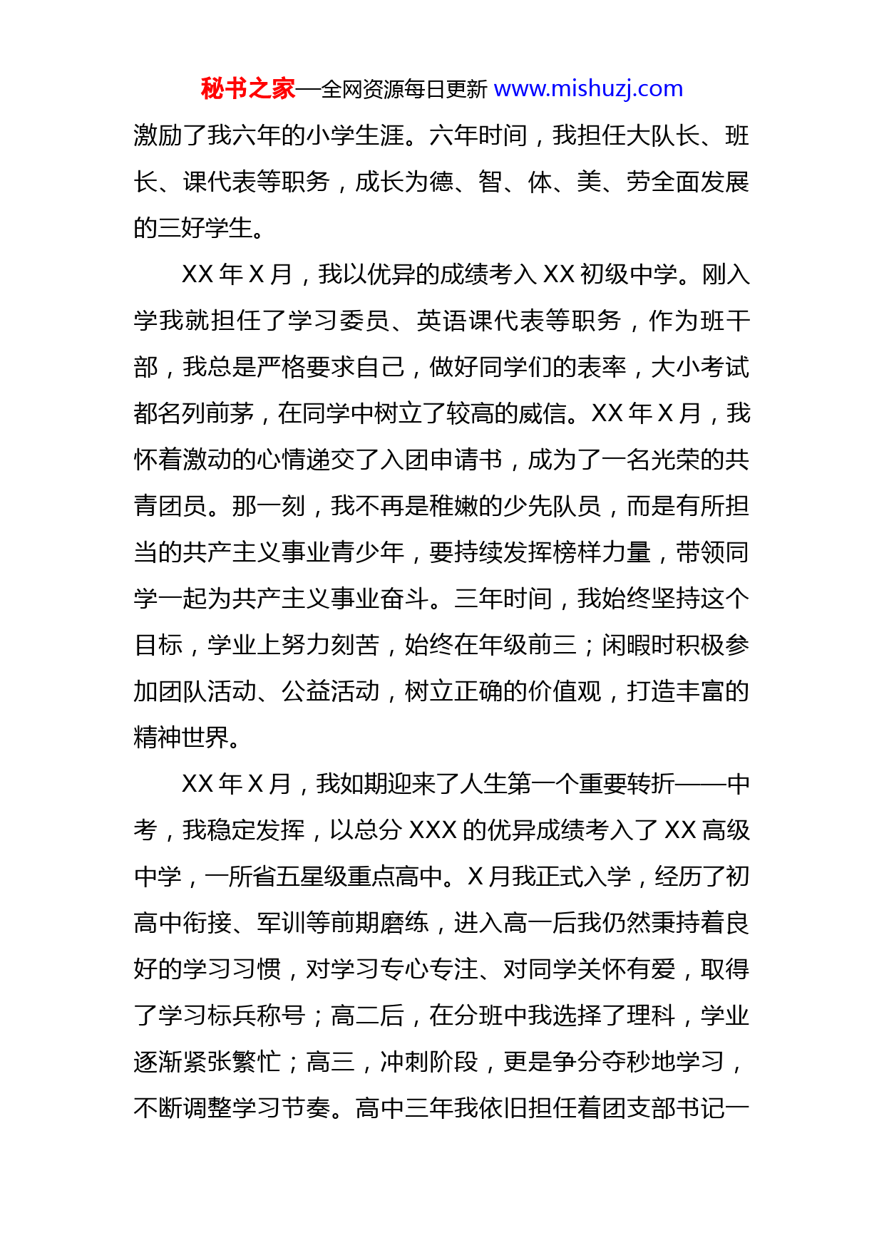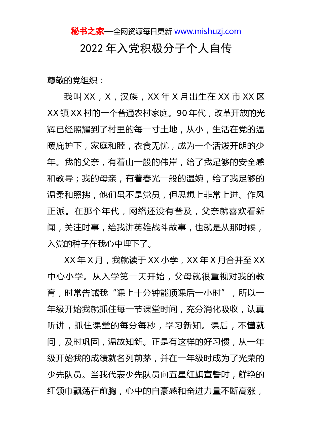 秘书之家—全网资源每日更新www.mishuzj.com2022年入党积极分子个人自传尊敬的党组织:我叫XX,X,汉族,XX年X月出生在XX市XX区XX镇XX村的一个普通农村家庭。90年代,改革开放的光辉已经照耀到了村里的每一寸土地,从小,生活在党的温暖庇护下,家庭和睦,衣食无忧,成为一个活泼开朗的少年。我的父亲,有着山一般的伟岸,给了我足够的安全感和教导;我的母亲,有着春光一般的温婉,给了我足够的温柔和照拂,他们虽不是党员,但思想上非常上进、作风正派。在那个年代,网络还没有普及,父亲就喜欢看新闻,关注时事,给我讲英雄战斗故事,也就是从那时候,入党的种子在我心中埋下了。XX年X月,我就读于XX小学,XX年X月合并至XX中心小学。从入学第一天开始,父母就很重视对我的教育,时常告诫我“课上十分钟能顶课后一小时”,所以一年级开始我就抓住每一节课堂时间,充分消化吸收,认真听讲,抓住课堂的每分每秒,学习新知。课后,不懂就问,及时巩固,温故知新。正是有这样的好习惯,从一年级开始我的成绩就名列前茅,并在一年级时成为了光荣的少先队员。当我代表少先队员向五星红旗宣誓时,鲜艳的红领巾飘荡在前胸,心中的自豪感和奋进力量不断高涨,秘书之家—全网资源每日更新www.mishuzj.com激励了我六年的小学生涯。六年时间,我担任大队长、班长、课代表等职务,成长为德、智、体、美、劳全面发展的三好学生。XX年X月,我以优异的成绩考入XX初级中学。刚入学我就担任了学习委员、英语课代表等职务,作为班干部,我总是严格要求自己,做好同学们的表率,大小考试都名列前茅,在同学中树立了较高的威信。XX年X月,我怀着激动的心情递交了入团申请书,成为了一名光荣的共青团员。那一刻,我不再是稚嫩的少先队员,而是有所担当的共产主义事业青少年,要持续发挥榜样力量,带领同学一起为共产主义事业奋斗。三年时间,我始终坚持这个目标,学业上努力刻苦,始终在年级前三;闲暇时积极参加团队活动、公益活动,树立正确的价值观,打造丰富的精神世界。XX年X月,我如期迎来了人生第一个重要转折——中考,我稳定发挥,以总分XXX的优异成绩考入了XX高级中学,一所省五星级重点高中。X月我正式入学,经历了初高中衔接、军训等前期磨练,进入高一后我仍然秉持着良好的学习习惯,对学习专心专注、对同学关怀有爱,取得了学习标兵称号;高二后,在分班中我选择了理科,学业逐渐紧张繁忙;高三,冲刺阶段,更是争分夺秒地学习,不断调整学习节奏。高中三年我依旧担任着团支部书记一秘书之家—全网资源每日更新www.mishuzj.com职,组织好班级团员活动,通过自我学习,查阅资料,观看优秀主题影视剧等形式,了解党、党史、党的基本知识,三年时间,我忙着学习,但也不忘向党组织不断靠近,憧憬着成为一名优秀党员。XX年X月,我经历了人生第一个重要抉择——高考,鏖战三年,迎来了收获时节。还记得考生们奋笔疾书,安静的考场上只听到写字的“沙沙”声,每一笔都带着无比的坚定和对未来的向往。还记得查成绩时的颤抖,填报志愿时的反复斟酌,好在,结果尽如人意,最终我被XX大学录取。X月,我怀着对大学的好奇与憧憬,带着家人的期待与祝福,步入了同济大学校门。上大学后我对自己更加严格,因为大学不比高中,自由的学术氛围、开放的学习环境,只有自律才能站稳脚跟,勇立潮头。在学习科学文化知识的同时,我并没有忘记我的信仰,在大学期间,作为团支部书记、学生会成员的我提交了入党申请书,通过了党校学习考试。那也是我第一次系统、理性、深刻的了解党,一下子拉近了我与党之间的距离,增加了我对党的认识。但我深知自身还需要不断进步,思想上也需更加精进,在递交入党申请书后,一直保持学习的姿态,提高自己的综合素养。XX年X月,我从XX大学毕业,开始参加公务员招录考试,由于准备不足,脱产考试的压力,种种因素加持,秘书之家—全网资源每日更新www.mishuzj.com未能一举上岸。在这期间,我还考取了XX教师资格证等证书。直至XX年X月,在父母的建议下,我成为了XX的一名XX老师,在教书育人的同时,我仍然没有放弃考公,因为考公可以更直接的为人民服务,也是党的核心理念。工作期间,积极参与公益活动、志愿服务,保持一颗为公、为民之心。终于在XX年X月的XX考试中,以笔试第一的成绩进入了面试。由于疫情,经历了多次面试时间的调整,在XX年X月,迎来了最终决战,我以笔试第一、面试第一的成绩,顺利通过了体检、政审等环节,成功录用,X月正式入职,向党组织又更靠近了一步。进入XX单位以来,周围的党员深深影响着我,他们身上扎实过硬的作风、艰苦奋斗的态度都不断陶冶着我,XX年XX月,我向支部提交了入党申请书,表达了我积极向党组织靠拢,自觉接受党组织教育和培养的愿望。自此,我更加自觉地联系实际,刻苦学习业务知识、党的知识,改造思想精神世界。通过党组织一段时间的考察,XX年X月,我被确定为入党积极分子。回顾这些年来的进步历程,我深知党的百年历程艰辛在何处、辉煌在何处,没有共产党就没有新中国,作为新时代青年,必须进一步树立正确的社会主义核心价值观、人生观,坚定信念信心,确立为共产主义事业奋斗终身的秘书之家—全网资源每日更新www.mishuzj.com政治信仰和为党为国家为人民无私奉献的崇高追求。今后,我将时刻从群众利益出发,克己奉公,砥砺初