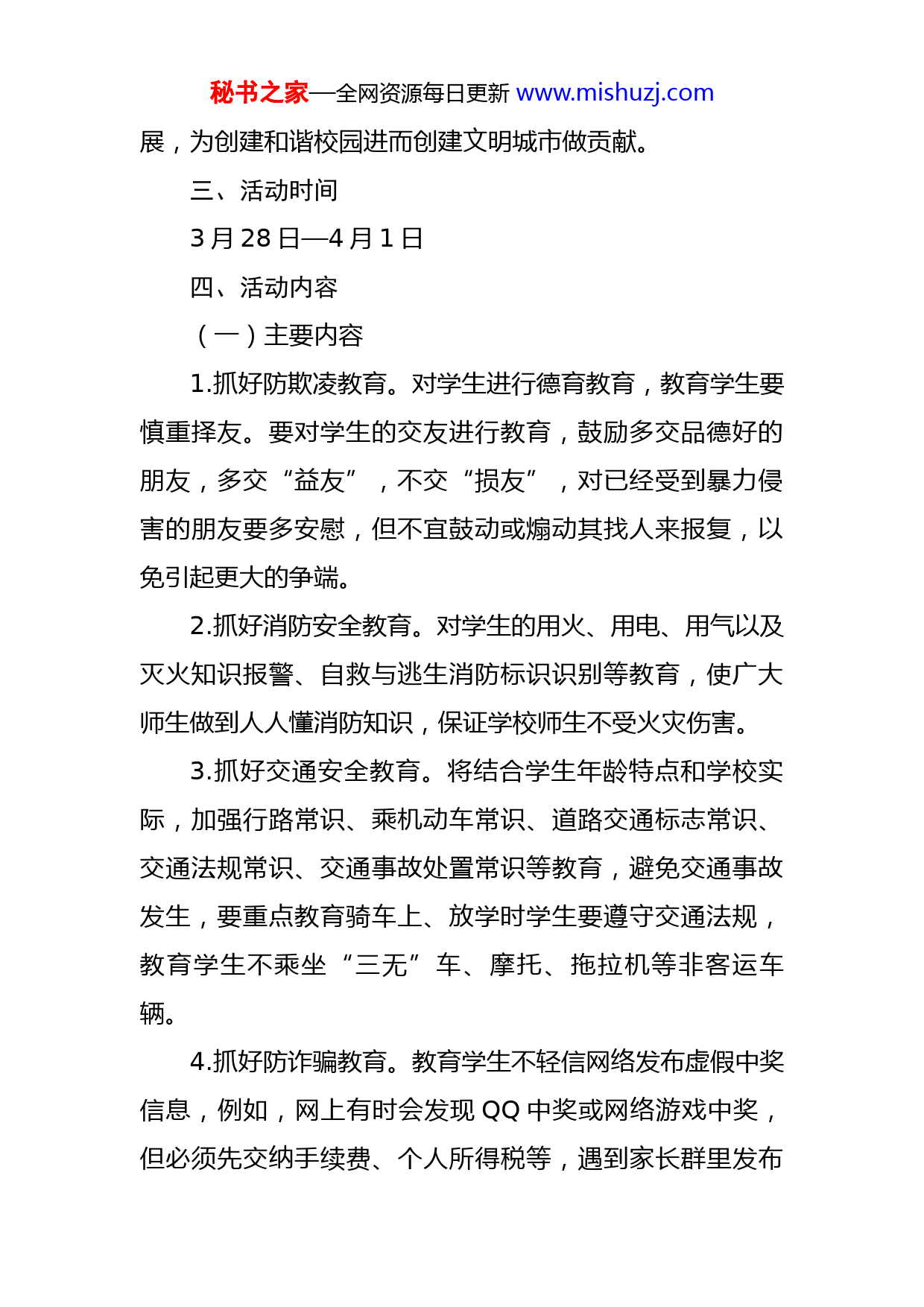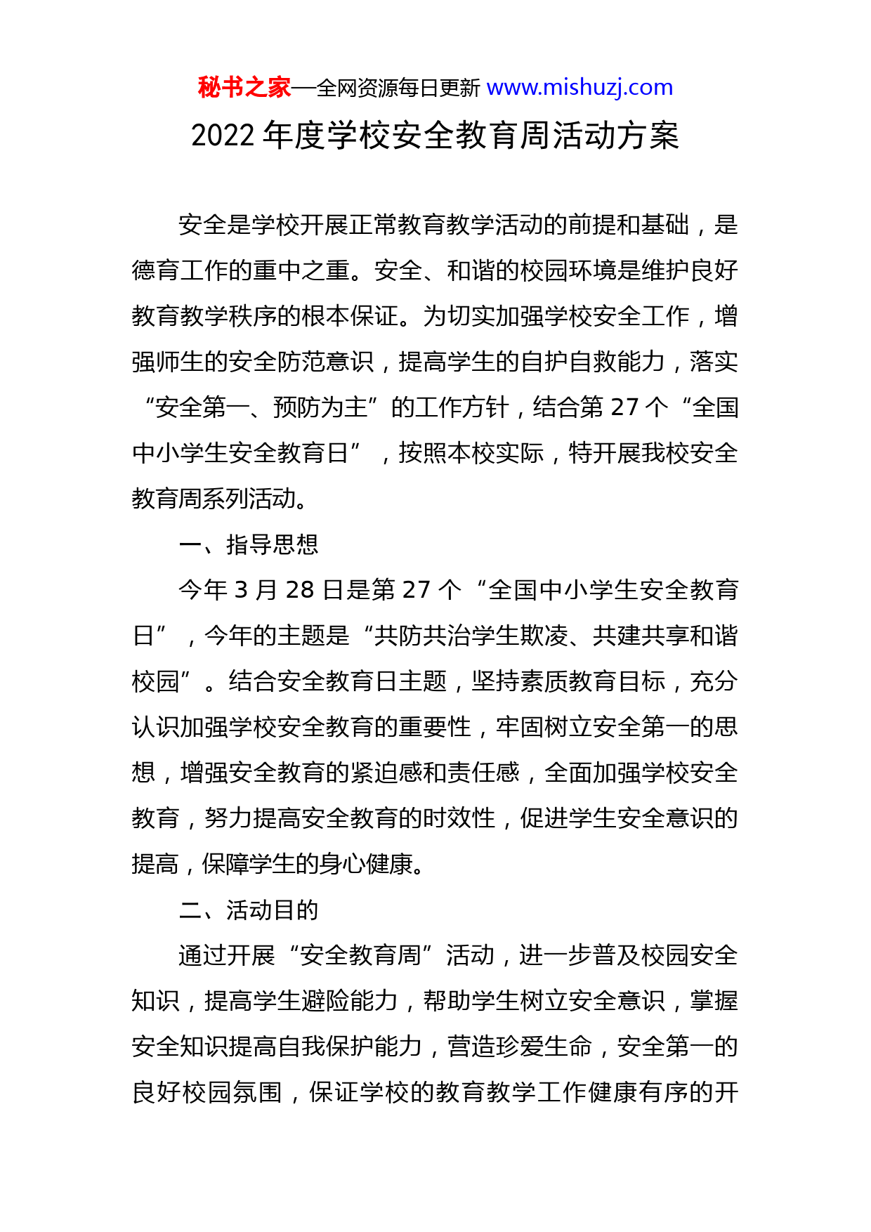 秘书之家—全网资源每日更新www.mishuzj.com2022年度学校安全教育周活动方案安全是学校开展正常教育教学活动的前提和基础,是德育工作的重中之重。安全、和谐的校园环境是维护良好教育教学秩序的根本保证。为切实加强学校安全工作,增强师生的安全防范意识,提高学生的自护自救能力,落实“安全第一、预防为主”的工作方针,结合第27个“全国中小学生安全教育日”,按照本校实际,特开展我校安全教育周系列活动。一、指导思想今年3月28日是第27个“全国中小学生安全教育日”,今年的主题是“共防共治学生欺凌、共建共享和谐校园”。结合安全教育日主题,坚持素质教育目标,充分认识加强学校安全教育的重要性,牢固树立安全第一的思想,增强安全教育的紧迫感和责任感,全面加强学校安全教育,努力提高安全教育的时效性,促进学生安全意识的提高,保障学生的身心健康。二、活动目的通过开展“安全教育周”活动,进一步普及校园安全知识,提高学生避险能力,帮助学生树立安全意识,掌握安全知识提高自我保护能力,营造珍爱生命,安全第一的良好校园氛围,保证学校的教育教学工作健康有序的开秘书之家—全网资源每日更新www.mishuzj.com展,为创建和谐校园进而创建文明城市做贡献。三、活动时间3月28日—4月1日四、活动内容(一)主要内容1.抓好防欺凌教育。对学生进行德育教育,教育学生要慎重择友。要对学生的交友进行教育,鼓励多交品德好的朋友,多交“益友”,不交“损友”,对已经受到暴力侵害的朋友要多安慰,但不宜鼓动或煽动其找人来报复,以免引起更大的争端。2.抓好消防安全教育。对学生的用火、用电、用气以及灭火知识报警、自救与逃生消防标识识别等教育,使广大师生做到人人懂消防知识,保证学校师生不受火灾伤害。3.抓好交通安全教育。将结合学生年龄特点和学校实际,加强行路常识、乘机动车常识、道路交通标志常识、交通法规常识、交通事故处置常识等教育,避免交通事故发生,要重点教育骑车上、放学时学生要遵守交通法规,教育学生不乘坐“三无”车、摩托、拖拉机等非客运车辆。4.抓好防诈骗教育。教育学生不轻信网络发布虚假中奖信息,例如,网上有时会发现QQ中奖或网络游戏中奖,但必须先交纳手续费、个人所得税等,遇到家长群里发布秘书之家—全网资源每日更新www.mishuzj.com的需要缴纳各种非正常费用时,请及时与班主任进行核实。5.抓好法治教育。教育学生不断提高学生法律意识,增强法治观念,维护法律的尊严。(二)活动安排1.政教处牵头,团委、综治办参与,共同制定安全教育宣传周活动系列方案,要加大宣传力度,营造宣传氛围,精心组织,切实落实活动方案。2.政教处拟定并发放《致学生家长一封信》,提高家长安全意识联合家长力量,配合学校切实做好安全教育工作。3.团委拟定发出“安全倡议书”,提高老师和学生家长对孩子安全的重视,呼吁全社会提高对学生安全的关注,共同来关心爱护学生。4.年级组利用升国旗时间,对全体师生进行安全教育,学校对安全教育周活动进行动员和部署。5.班主任召开一次以“共防共治学生欺凌、共建共享和谐校园”为主题的班会,同时出好一期黑板报。重点加强防欺凌、防诈骗、防交通事故及应急疏散等方面的教育。6.各年级要认真组织参与学校教育平台的安全教育日专题活动,帮助教师识别和及时处理学生欺凌事件。7.学校安全领导小组对全校设施设备进行一次安全大检秘书之家—全网资源每日更新www.mishuzj.com查,找出安全隐患,针对校园门、窗、栏杆、围栏、教室、活动室、电脑室可能存在的问题认真排查,做好记录,对发现的隐患,及时解决问题。8.学校邀请法治副校长,针对法治教育开展一次法治报告会。五、活动要求1.政教处、团委、综治办、年级组要按计划分工,认真拟定活动方案,认真组织。2.全体班主任要正确认识当前学校安全工作存在的问题和肩负的责任,充分认识做好安全教育工作的重要性,严格管理,强化安全意识,确保学校安全工作有序进行。3.各部门、各年级要切实贯彻安全工作方针政策,常抓不懈,警钟长鸣,继续深入细致、有条不紊地开展各类活动,不断完善和巩固相关安全制度,努力打造“平安校园”,为师生营造一个安全健康的育人环境。