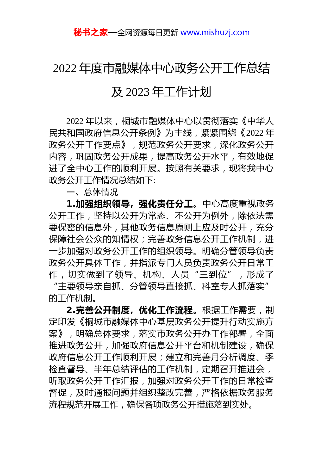 秘书之家—全网资源每日更新www.mishuzj.com2022年度市融媒体中心政务公开工作总结及2023年工作计划2022年以来,桐城市融媒体中心以贯彻落实《中华人民共和国政府信息公开条例》为主线,紧紧围绕《2022年政务公开工作要点》,规范政务公开要求,深化政务公开内容,巩固政务公开成果,提高政务公开水平,有效地促进了全中心工作的顺利开展。按照有关要求,现将我中心政务公开工作情况总结如下:一、总体情况1.加强组织领导,强化责任分工。中心高度重视政务公开工作,坚持以公开为常态、不公开为例外,除依法需要保密的信息外,其他政务信息原则上应及时公开,充分保障社会公众的知情权;完善政务信息公开工作机制,进一步加强对政务公开工作的组织领导。明确分管领导负责政务公开具体工作,并指派专门人员负责政务公开日常工作,切实做到了领导、机构、人员“三到位”,形成了“主要领导亲自抓、分管领导直接抓、科室专人抓落实”的工作机制。2.完善公开制度,优化工作流程。根据工作需要,制定印发《桐城市融媒体中心基层政务公开提升行动实施方案》,明确总体要求,落实市政务公开办工作部署,全面推进政务公开,加强政府信息公开平台和机制建设,确保政府信息公开工作顺利开展;建立和完善月分析调度、季检查督导、半年总结评估的工作机制,定期召开推进会,听取政务公开工作汇报,加强对政务公开工作的日常检查督促,及时通报问题并组织整改完善,严格依据政务服务流程规范开展工作,确保各项政务公开措施落到实处。秘书之家—全网资源每日更新www.mishuzj.com3.创新公开载体,提升服务水平。政务公开载体建设是政务公开的基础。中心在做好网上政府平台建设的同时充分发挥政务新媒体、广播电视等平台的作用,运用信息化手段做好政务公开工作,现阶段中心设有桐城新闻网、“桐城新闻”微信公众号、《桐城报道》、“出彩桐城”APP、“桐城市融媒体中心”官方抖音号、FM97.3调频广播等新闻媒介平台,拓宽政务公开渠道和方式,加大信息公开力度,做到高效、便民。4.加强审查反馈,确保信息安全。按照《信息公开指南》《信息公开保密审查制度》规定,对于发布的信息,按照谁公开谁审查、谁审查谁负责和先审查后公开的原则由相关科室严格把关,经分管领导审核后才能公开发布,明确责任,提高质量。加强信息公开保密审查制度建设,对拟公开的政府信息,依法依规做好保密审查。二、存在的问题一是政务公开队伍力量还不够强。政务公开专职人员少,未设置AB岗,公开力量待加强;二是政策解读有待提质扩面增效。政策解读以文字解读为主,形式单一,解读质量不高。三、2023年工作计划1.优化队伍建设。切实加强政务公开政务服务工作的领导和队伍建设,加大信息报送和正面宣传工作力度,及时做好工作总结,认真开展调查研究和学习交流,不断提升政务公开政务服务工作水平,务求实效。2.强化监督检查。以基层政务公开提升行动为契机,常态化对公开栏目的信息情况进行巡查整改。同时严格落实信息发布审核制度,做到“涉密信息不上网,上网信息不涉密”。3.创新方式方法。坚持以公开促服务、促落实、促规范,借鉴外地先进经验,注重在公开内容、公开形式、公开平台等方面积极探索。丰富政策解读形式,多采取图片秘书之家—全网资源每日更新www.mishuzj.com视频、发布会等新颖化、形象化解读形式,增加解读关注度。