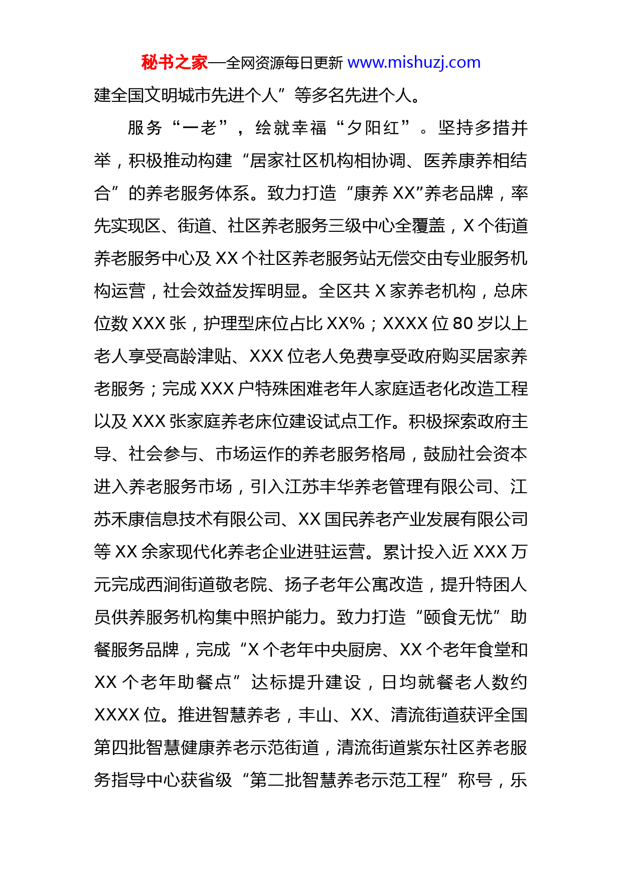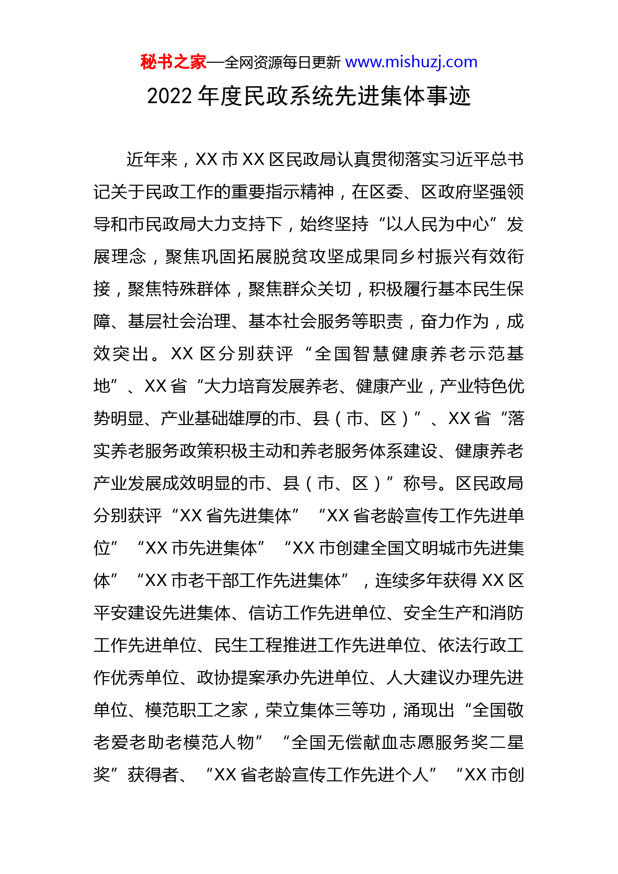 秘书之家—全网资源每日更新www.mishuzj.com2022年度民政系统先进集体事迹近年来,XX市XX区民政局认真贯彻落实习近平总书记关于民政工作的重要指示精神,在区委、区政府坚强领导和市民政局大力支持下,始终坚持“以人民为中心”发展理念,聚焦巩固拓展脱贫攻坚成果同乡村振兴有效衔接,聚焦特殊群体,聚焦群众关切,积极履行基本民生保障、基层社会治理、基本社会服务等职责,奋力作为,成效突出。XX区分别获评“全国智慧健康养老示范基地”、XX省“大力培育发展养老、健康产业,产业特色优势明显、产业基础雄厚的市、县(市、区)”、XX省“落实养老服务政策积极主动和养老服务体系建设、健康养老产业发展成效明显的市、县(市、区)”称号。区民政局分别获评“XX省先进集体”“XX省老龄宣传工作先进单位”“XX市先进集体”“XX市创建全国文明城市先进集体”“XX市老干部工作先进集体”,连续多年获得XX区平安建设先进集体、信访工作先进单位、安全生产和消防工作先进单位、民生工程推进工作先进单位、依法行政工作优秀单位、政协提案承办先进单位、人大建议办理先进单位、模范职工之家,荣立集体三等功,涌现出“全国敬老爱老助老模范人物”“全国无偿献血志愿服务奖二星奖”获得者、“XX省老龄宣传工作先进个人”“XX市创秘书之家—全网资源每日更新www.mishuzj.com建全国文明城市先进个人”等多名先进个人。服务“一老”,绘就幸福“夕阳红”。坚持多措并举,积极推动构建“居家社区机构相协调、医养康养相结合”的养老服务体系。致力打造“康养XX”养老品牌,率先实现区、街道、社区养老服务三级中心全覆盖,X个街道养老服务中心及XX个社区养老服务站无偿交由专业服务机构运营,社会效益发挥明显。全区共X家养老机构,总床位数XXX张,护理型床位占比XX%;XXXX位80岁以上老人享受高龄津贴、XXX位老人免费享受政府购买居家养老服务;完成XXX户特殊困难老年人家庭适老化改造工程以及XXX张家庭养老床位建设试点工作。积极探索政府主导、社会参与、市场运作的养老服务格局,鼓励社会资本进入养老服务市场,引入江苏丰华养老管理有限公司、江苏禾康信息技术有限公司、XX国民养老产业发展有限公司等XX余家现代化养老企业进驻运营。累计投入近XXX万元完成西涧街道敬老院、扬子老年公寓改造,提升特困人员供养服务机构集中照护能力。致力打造“颐食无忧”助餐服务品牌,完成“X个老年中央厨房、XX个老年食堂和XX个老年助餐点”达标提升建设,日均就餐老人数约XXXX位。推进智慧养老,丰山、XX、清流街道获评全国第四批智慧健康养老示范街道,清流街道紫东社区养老服务指导中心获省级“第二批智慧养老示范工程”称号,乐秘书之家—全网资源每日更新www.mishuzj.com康老年护理中心获评XX省医养结合示范项目机构。2022年7月,以“智慧健康养老”为切入点,获批“十四五”省级服务业改革创新试点;11月,被确定为省级“居家和社区养老服务示范县(市、区)”试点。关爱“一小”,撑起未成年人“保护伞”。率先建设“六大保护”于一体的区级未保指导中心;通过政府购买服务模式实现X个街道未成年人保护工作站全覆盖;建立《XX区未成年人保护个案会商制度》《XX区未成年人保护信息通报制度》等机制;打造XX区“未爱童行”未成年人关爱保护志愿服务品牌;创新开发“未保走访”小程序;联合多部门通过主动结对的方式开展农村留守儿童、困境儿童牵手行动,精准帮扶农村留守儿童、困境儿童及其监护人XXX余名;开展未成年人保护个案会商,成功解决多名困境儿童住房、就医、入学等问题;面向全区社会组织、城乡社区举办未成年人关爱保护项目大赛,营造全社会关心关爱未成年人的良好氛围;制作防溺水MG动漫视频、广泛开展防溺水宣传,留守儿童、困境儿童走访实现两轮全覆盖,筑牢未成年人防溺水安全屏障。积极争创“全国未成年人保护示范县(区)”,未保工作经验做法被省未保办简报选发。夯实基础,托起社区服务“大民生”。通过村改社区、社区合并等方式将XX个社区、XX个村优化整合为XX秘书之家—全网资源每日更新www.mishuzj.com个社区、X个村。高质量完成村(居)委会换届选举,村(居)委会书记、主任“一肩挑”比例100%,村(居)“两委”班子学历、年龄、结构等进一步优化,超额完成“三项制度”改革试点。建强社区服务阵地,实现城市社区每百户居民拥有综合服务设施XX平方米,农村社区拥有综合服务设施XX平方米。公开招聘82名社区专职工作者、村级专干,实现每万名城镇常住人口拥有社区工作者XX人。开展党建引领智慧社区建设,建成X个省级、X个市级“智慧社区”,依托“智慧社区”平台,开设“文明创建”“智慧协商”等模块,实现从“社区治理”到“社区服务”的功能升级,打通服务群众的最后一公里,相关经验做法陆续被《中国民政》《中国社会报》《中国社区报》宣传报道。全面推广基层协商议事制度,XX个村(社区)协商议事场所、组织、制度全覆盖,建成X个省级协商示范街道,X个省级协商示范社区,打造XX“云上e事厅”、XX、XX网格议事厅等协商议事场所,实现线上线下协商议事相结合。近年来,X个街道、X个社区被确认为省级“智慧社区”试点,通过科技赋能加强基层治理智慧化水平。X个社区获评“全国