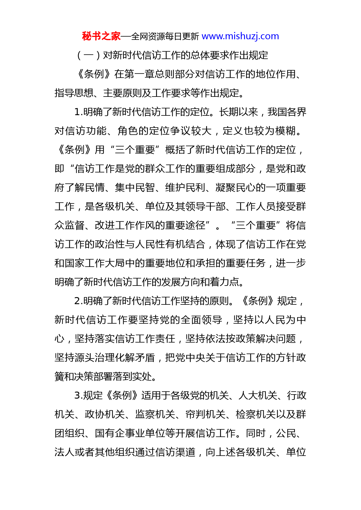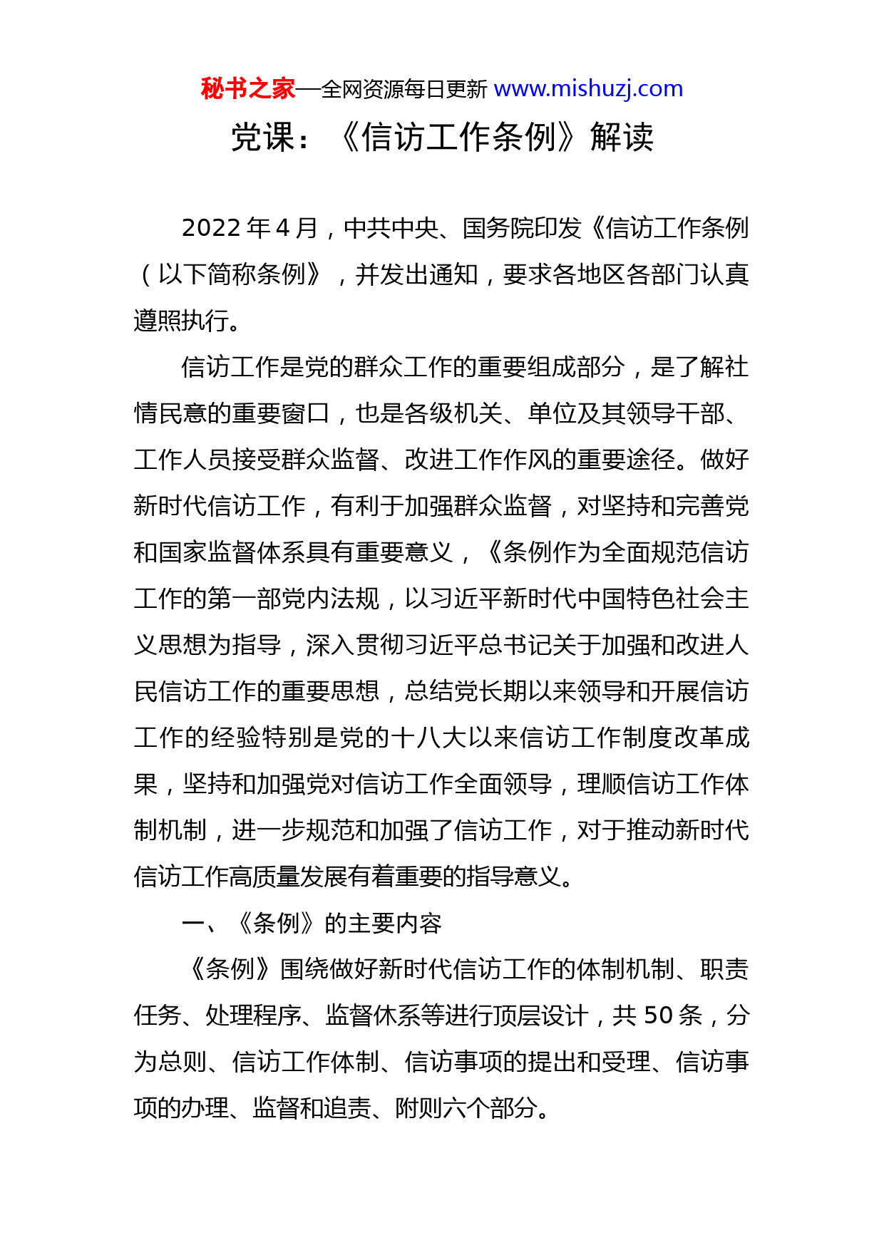 秘书之家—全网资源每日更新www.mishuzj.com党课:《信访工作条例》解读2022年4月,中共中央、国务院印发《信访工作条例(以下简称条例》,并发出通知,要求各地区各部门认真遵照执行。信访工作是党的群众工作的重要组成部分,是了解社情民意的重要窗口,也是各级机关、单位及其领导干部、工作人员接受群众监督、改进工作作风的重要途径。做好新时代信访工作,有利于加强群众监督,对坚持和完善党和国家监督体系具有重要意义,《条例作为全面规范信访工作的第一部党内法规,以习近平新时代中国特色社会主义思想为指导,深入贯彻习近平总书记关于加强和改进人民信访工作的重要思想,总结党长期以来领导和开展信访工作的经验特别是党的十八大以来信访工作制度改革成果,坚持和加强党对信访工作全面领导,理顺信访工作体制机制,进一步规范和加强了信访工作,对于推动新时代信访工作高质量发展有着重要的指导意义。一、《条例》的主要内容《条例》围绕做好新时代信访工作的体制机制、职责任务、处理程序、监督休系等进行顶层设计,共50条,分为总则、信访工作体制、信访事项的提出和受理、信访事项的办理、监督和追责、附则六个部分。秘书之家—全网资源每日更新www.mishuzj.com(一)对新时代信访工作的总体要求作出规定《条例》在第一章总则部分对信访工作的地位作用、指导思想、主要原则及工作要求等作出规定。1.明确了新时代信访工作的定位。长期以来,我国各界对信访功能、角色的定位争议较大,定义也较为模糊。《条例》用“三个重要”概括了新时代信访工作的定位,即“信访工作是党的群众工作的重要组成部分,是党和政府了解民情、集中民智、维护民利、凝聚民心的一项重要工作,是各级机关、单位及其领导干部、工作人员接受群众监督、改进工作作风的重要途径”。“三个重要”将信访工作的政治性与人民性有机结合,体现了信访工作在党和国家工作大局中的重要地位和承担的重要任务,进一步明确了新时代信访工作的发展方向和着力点。2.明确了新时代信访工作坚持的原则。《条例》规定,新时代信访工作要坚持党的全面领导,坚持以人民为中心,坚持落实信访工作责任,坚持依法按政策解决问题,坚持源头治理化解矛盾,把党中央关于信访工作的方针政簧和决策部署落到实处。3.规定《条例》适用于各级党的机关、人大机关、行政机关、政协机关、监察机关、帘判机关、检察机关以及群团组织、国有企事业单位等开展信访工作。同时,公民、法人或者其他组织通过信访渠道,向上述各级机关、单位秘书之家—全网资源每日更新www.mishuzj.com反映情况,提出建议意见或者投诉请求,应当符合《条例》规定要求。过去由国务院颁布的《信访条例》,只能调整和规范行政部门受理、处理信访事项的行为,而新出台的《条例》,系统集纳了近年来信访工作的创新实践,从程序上可以将更多受理、处理信访事项的相关部门纳入,扩大了信访工作的覆盖面。(二)明确了信访工作体制和工作格局《条例》确立了党领导下的信访工作体制和格局,明确党委、政府、信访工作联席会议、信访部门以及各方力量在信访工作中的定位和职责,同时明确了信访工作保障措施。1,在信访工作体制上,确立了“大信访”的工作格局、《条例》明确构建党委统一领导、政府组织落实、信访工作联席会议协调、信访部门推动、各方齐抓共管的信访工作格局。2.明确各主体在信访工作中承扭的职责任务。处理信访事项的主体包括各级党的机关、人大机关、行政机关、政协机关、监察机关、审判机关、检察机关以及群团组织、国有企事业单位等,需要明确各主体的权力、职责、边界等。《条例明确党中央通过强化政治引领、制定信访工作方针等,加强对信访工作的集中统一领导。规定地方党委要领导本地区信访工作,贯彻落实党中央决策部署,执行秘书之家—全网资源每日更新www.mishuzj.com上级党组织部署要求,统筹信访工作责任体系构建,支持和督促下级党组织做好信访工作。规定各级政府要贯彻落实上级党委和政府以及本级党委部署要求,履行组织各方力量及时妥善处理信访事项,研究解决政策性、群体性信访突出问题和疑难复杂信访问题等职责。规定中央信访工作联席会议统筹协调、整体推进、督促落实全国信访工作,同时进一步规范地方信访工作联席会议的设置和运行。规定各级党委和政府信访部门是开展信访工作的专门机构,通过履行受理、转送、交办信访事项等相关职责来开展工作。此外,还规定了各级党委和政府信访部门以外的其他机关、单位的职责。3.明确信访人的权利和义务。在信访人享有的权利方面,《条例》规定信访人可以采用信息网络、书信、电话、传真、走访等形式,向各级机关、单位反映情况,提出建议、意见或者投诉请求,以此充分保障了信访人权利的有效行使。在信访人履行的义务层面,条例提出了三个方面的要求。一是信访人一般应当采用书面形式提出信访事项,提出信访事项应当客观真实。同时,对信访事项已经受理或者正在办理的,信访人在规定期限内向受理、办理机关、单位的上级机关、单位又提出同一信访事项等情形,作出了相关规定。二是信访人采用走访形式提出信访事项的,应当到有权处理的本级或